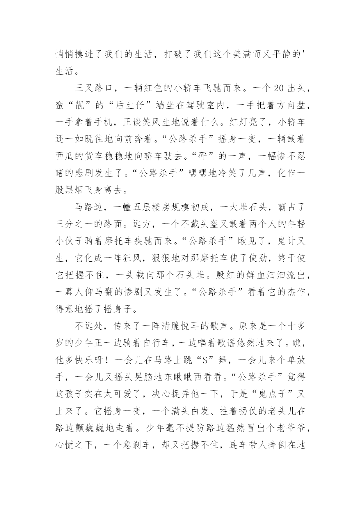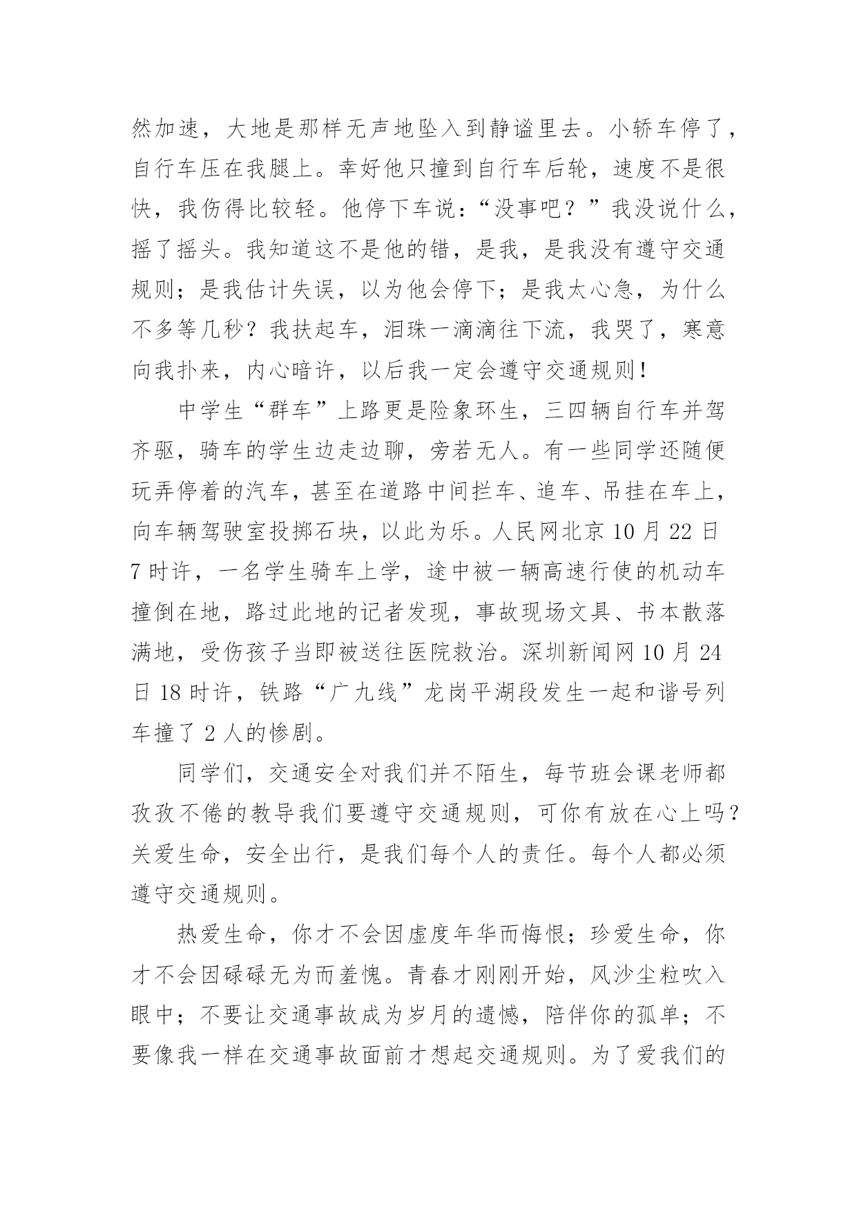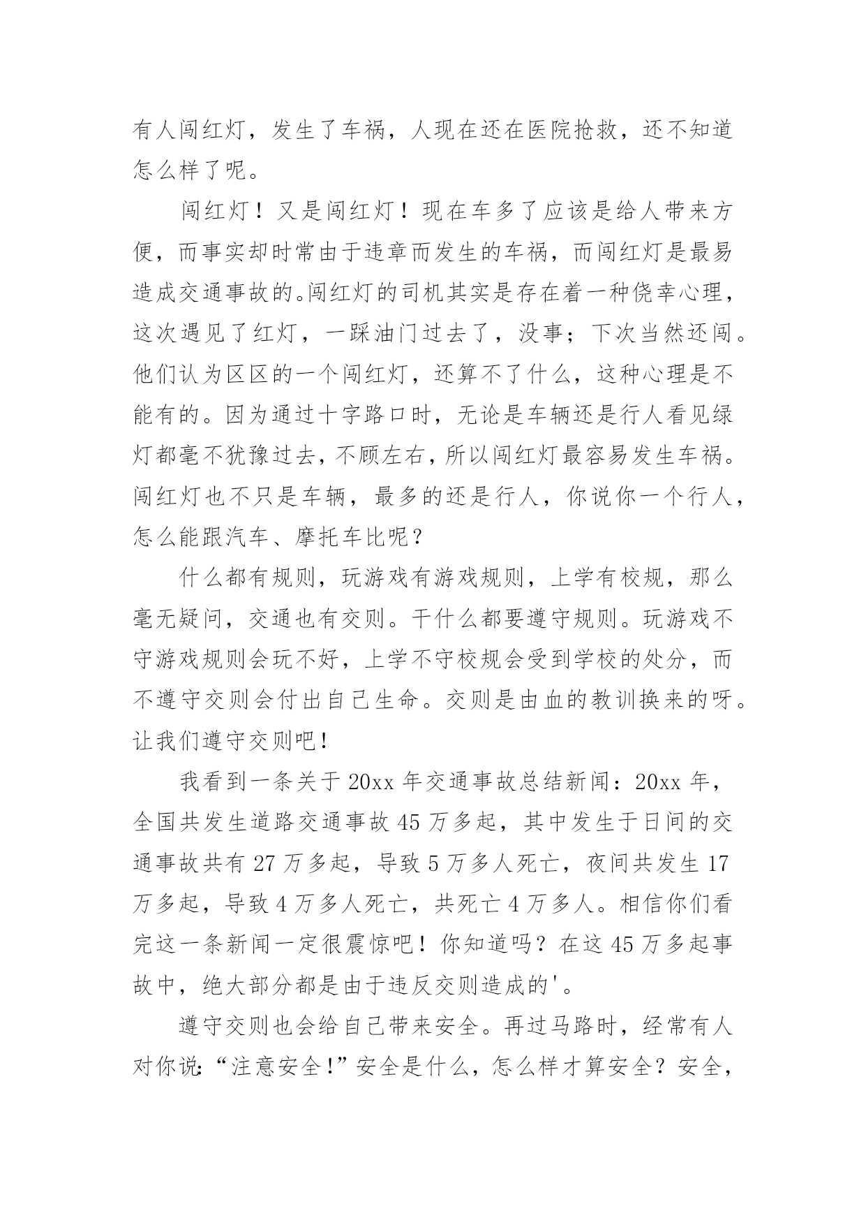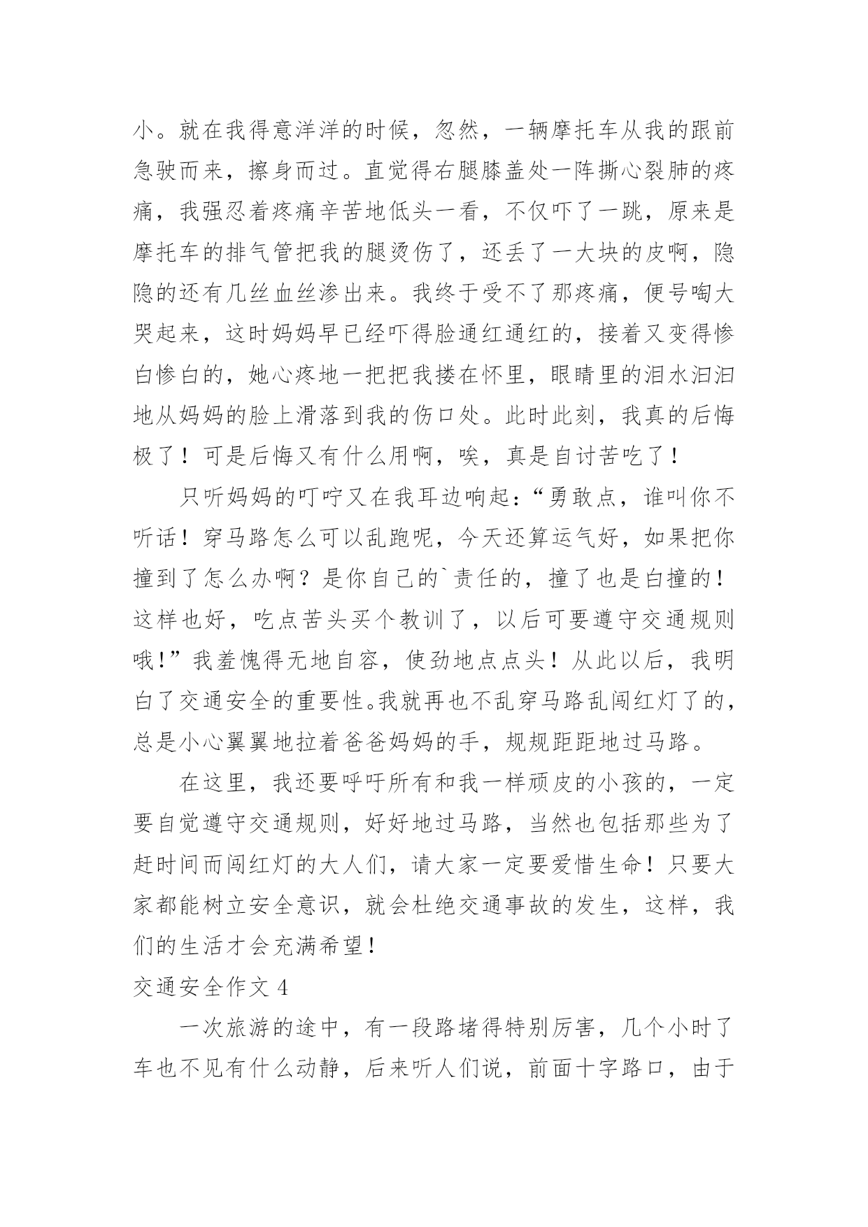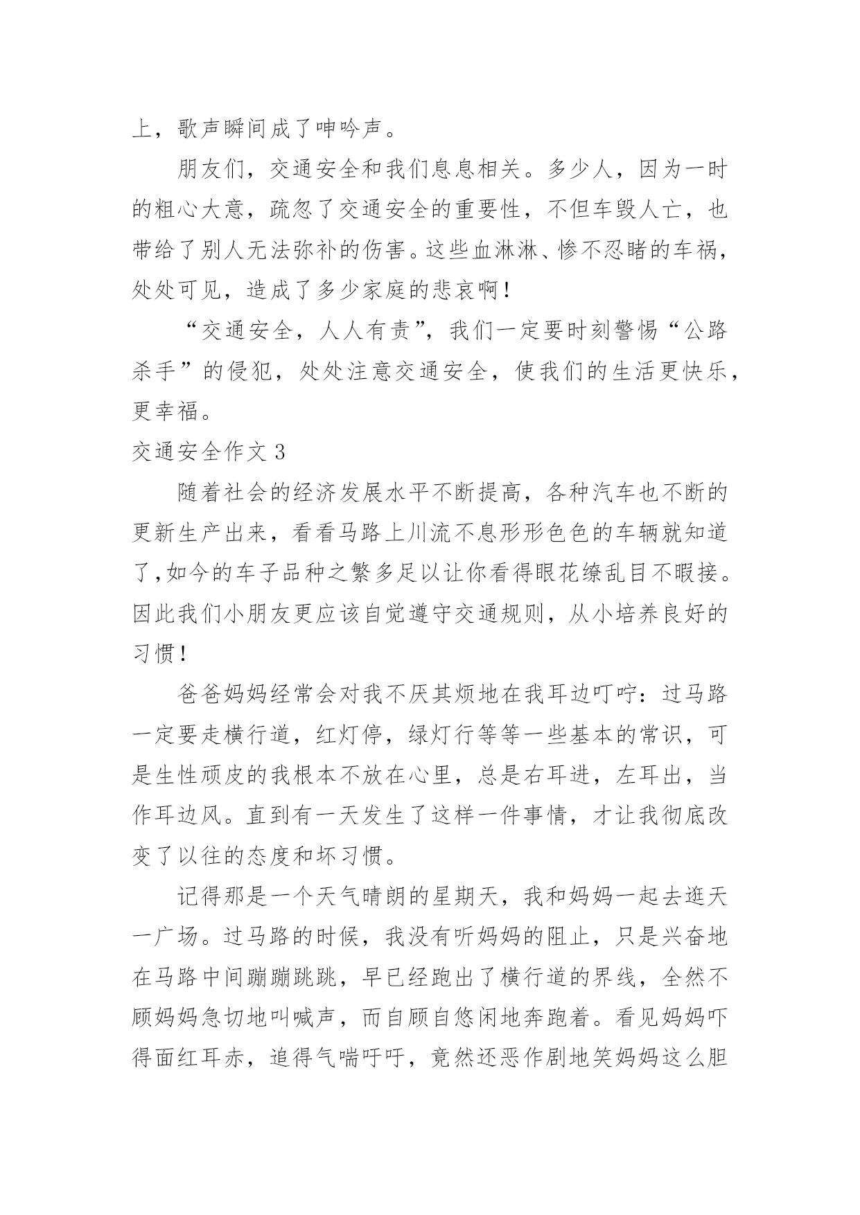 交通安全作文交通安全作文15篇【优秀】在平时的学习、工作或生活中,大家一定都接触过作文吧,借助作文可以提高我们的语言组织能力。那么问题来了,到底应如何写一篇优秀的作文呢?下面是小编帮大家整理的交通安全作文,供大家参考借鉴,希望可以帮助到有需要的朋友。交通安全作文1说到交通安全知识,大家都很熟悉,可是大家没记在心上。随着社会不断的发展,科技发达,汽车成了人们主要的交通工具,它给我们带来了方便、快捷,同时也给我们带来了灾难,一个个活生生的生命消失在车轮之下,让人悲痛万分。所以我们要遵守交通规则。交通事故像一颗威力十足的炸弹,一时不在意,它就会爆炸,让家庭碎裂、让人心痛。最近,我在报纸上看到了惊心动魄的一幕:在男孩的面前是一位美丽、善良的小女孩,她穿着白纱裙,笑容满面。正当绿灯转变成红灯时,男孩立刻止住脚步,想等红灯变成绿灯再行走。而女孩呢?却不知“红灯停,绿灯行”这句话,盲目的擅闯红灯,当她在宽阔的人行横道奔跑时,一辆汽车飞快的驶来,还没等司机来得及刹车,一个鲜活的生命消失了,一切都沉浸于死寂之中,小女孩的妈妈闻声而来,伤心地说:“女儿,醒醒吧!”说着擦了擦眼泪,“女儿,你别吓我呀!”说着就晕倒了。哎!交通事故是多么可怕,就一刹那,一个春光灿烂的生命就消失了,我真心痛。走红绿灯时要做好以下三点“红灯停、黄灯等、绿灯行”。不能像小女孩那样闯红灯,使自己丢失了生命。这不是开车司机的错,是小女孩自己的错,因为她没有遵守交通规则,闯红灯,而人行横道红灯的时候,就是车辆行驶的时间。上帝只给每个人一次生命,我们应该珍惜自己的.生命。未来的交通安全如下:1.走路不能横冲直撞,得慢行。2.汽车得等行人先通过再行驶。3.车与车之间要互相谦让、讲文明,以免发生相撞。我们既要保护别人,也要保护自己,文明、谦让无处不在,这样就不会发生意外。“交通安全,平安出行”是很重要的,涉及到了我们的生命安全。我们要把这句话牢牢记在心上,把安全放在首位,让事故发生的可能性越来越少。我们还可以在班级的宣传栏或校园展览栏上,多贴一些遵守交通,平安出行之类的警告语,让同学们更好的明白交通安全的重要性。把交通事故降到最低。让我们在安全的包围下成长、快乐,建设自己美丽的家园。交通安全作文2热闹的街道,川流不息的汽车,构成了一幅美丽的画卷。交通安全,人人有责,但是交通事故却像一个“公路杀手”,悄悄摸进了我们的生活,打破了我们这个美满而又平静的'生活。三叉路口,一辆红色的小轿车飞驰而来。一个20出头,蛮“靓”的“后生仔”端坐在驾驶室内,一手把着方向盘,一手拿着手机,正谈笑风生地说着什么。红灯亮了,小轿车还一如既往地向前奔着。“公路杀手”摇身一变,一辆载着西瓜的货车稳稳地向轿车驶去。“砰”的一声,一幅惨不忍睹的悲剧发生了。“公路杀手”嘿嘿地冷笑了几声,化作一股黑烟飞身离去。马路边,一幢五层楼房规模初成,一大堆石头,霸占了三分之一的路面。远方,一个不戴头盔又载着两个人的年轻小伙子骑着摩托车疾驰而来。“公路杀手”瞅见了,鬼计又生,它化成一阵狂风,狠狠地对那摩托车使了使劲,终于使它把握不住,一头栽向那个石头堆。殷红的鲜血汩汩流出,一幕人仰马翻的惨剧又发生了。“公路杀手”看着它的杰作,得意地摇了摇身子。不远处,传来了一阵清脆悦耳的歌声。原来是一个十多岁的少年正一边骑着自行车,一边唱着歌谣悠然地来了。瞧,他多快乐呀!一会儿在马路上跳“S”舞,一会儿来个单放手,一会儿又摇头晃脑地东瞅瞅西看看。“公路杀手”觉得这孩子实在太可爱了,决心捉弄他一下,于是“鬼点子”又上来了。它摇身一变,一个满头白发、拄着拐仗的老头儿在路边颤巍巍地走着。少年毫不提防路边猛然冒出个老爷爷,心慌之下,一个急刹车,却又把握不住,连车带人摔倒在地上,歌声瞬间成了呻吟声。朋友们,交通安全和我们息息相关。多少人,因为一时的粗心大意,疏忽了交通安全的重要性,不但车毁人亡,也带给了别人无法弥补的伤害。这些血淋淋、惨不忍睹的车祸,处处可见,造成了多少家庭的悲哀啊!“交通安全,人人有责”,我们一定要时刻警惕“公路杀手”的侵犯,处处注意交通安全,使我们的生活更快乐,更幸福。交通安全作文3随着社会的经济发展水平不断提高,各种汽车也不断的更新生产出来,看看马路上川流不息形形色色的车辆就知道了,如今的车子品种之繁多足以让你看得眼花缭乱目不暇接。因此我们小朋友更应该自觉遵守交通规则,从小培养良好的习惯!爸爸妈妈经常会对我不厌其烦地在我耳边叮咛:过马路一定要走横行道,红灯停,绿灯行等等一些基本的常识,可是生性顽皮的我根本不放在心里,总是右耳进,左耳出,当作耳边风。直到有一天发生了这样一件事情,才让我彻底改变了以往的态度和坏习惯。记得那是一个天气晴朗的星期天,我和妈妈一起去逛天一广场。过马路的时候,我没有听妈妈的阻止,只是兴奋地在马路中间蹦蹦跳跳,早
