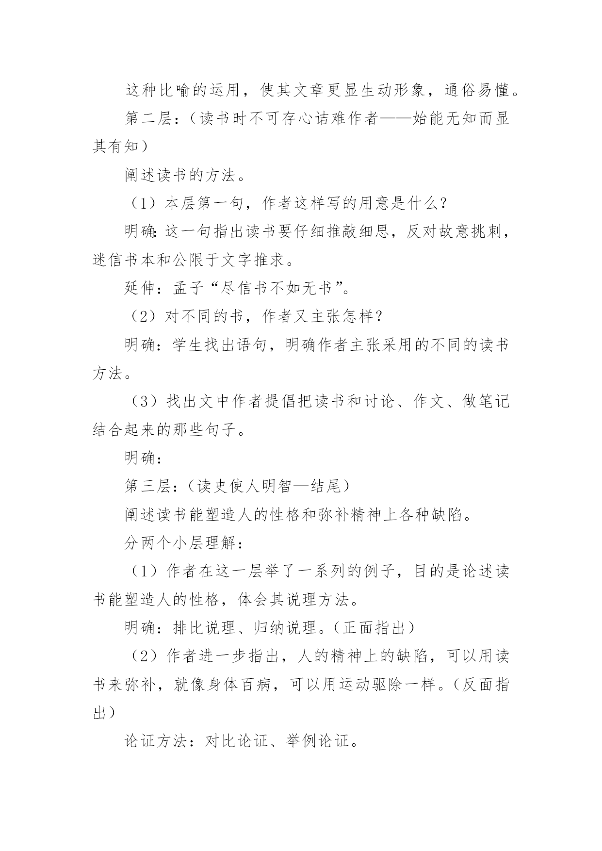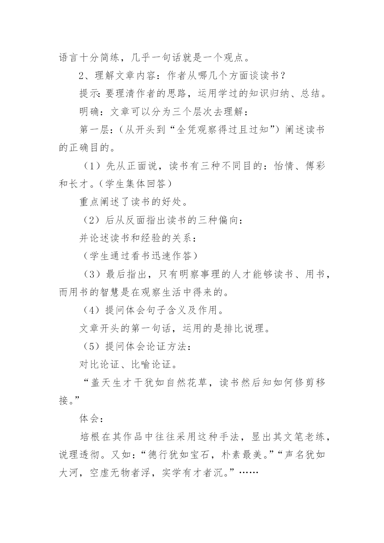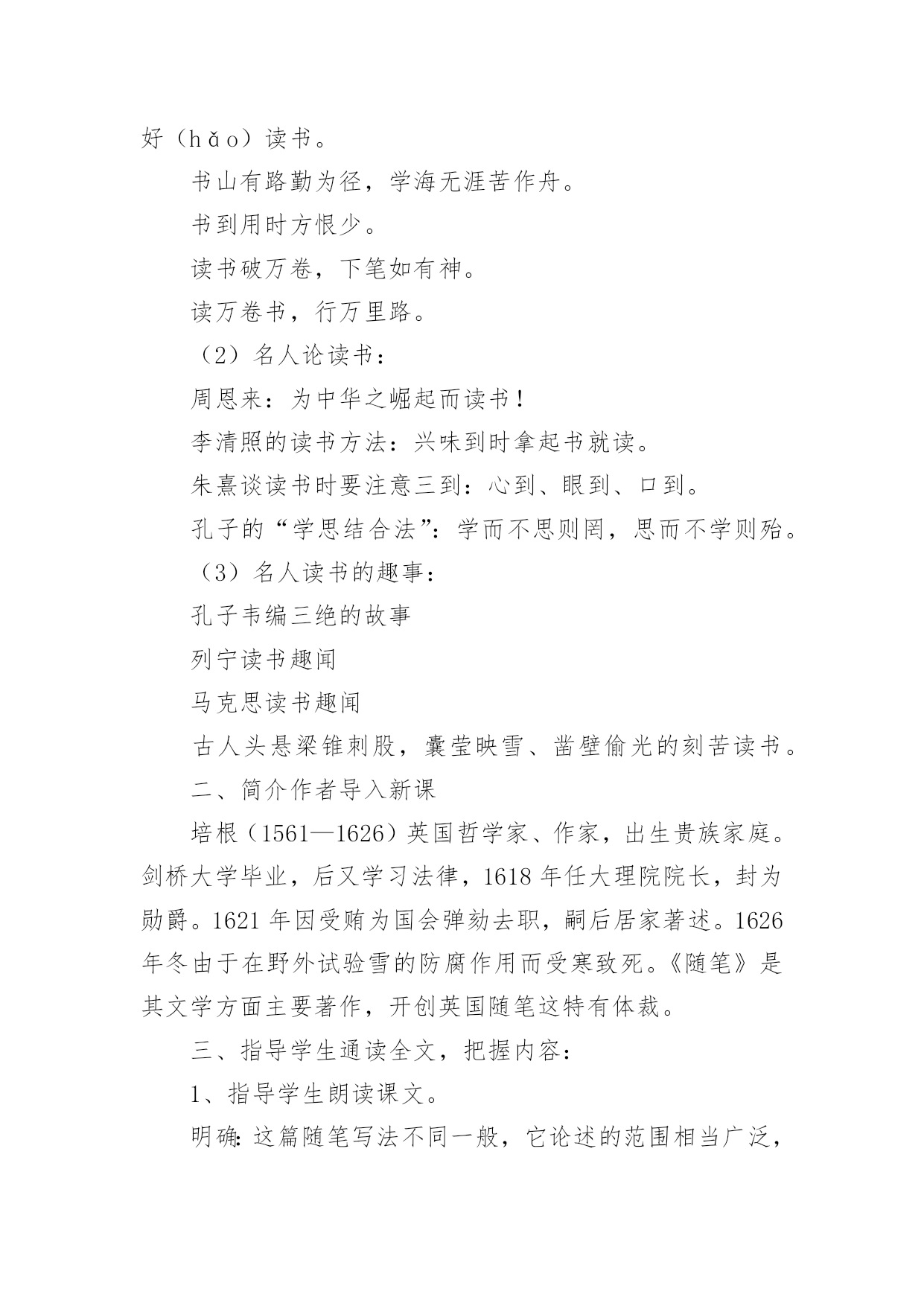 《谈读书》教学设计作为一名无私奉献的老师,通常会被要求编写教学设计,教学设计是一个系统化规划教学系统的过程。怎样写教学设计才更能起到其作用呢?以下是小编精心整理的《谈读书》教学设计,仅供参考,希望能够帮助到大家。教学目的:1、学习文中运用比喻、排比等修辞进行说理的方法。2、积累文中出现的精辟的句子。教学重、难点:重点:(1)课文中出现的名言警句的体会学习。(2)举例论证、道理论证、比喻论证等方法的运用。难点:本文论述的语言十分简练,在学习时体会其作用。教学时数:安排1课时教学过程:一、检查预习情况。分小组比赛,检查积累材料的情况。要求每小组派代表把整理好的关于读书方面的名言警句、名人读书的趣事讲出,以多者为胜方。(1)名言警句:好(hǎo)读书时不好(hào)读书,好(hào)读书时不好(hǎo)读书。书山有路勤为径,学海无涯苦作舟。书到用时方恨少。读书破万卷,下笔如有神。读万卷书,行万里路。(2)名人论读书:周恩来:为中华之崛起而读书!李清照的读书方法:兴味到时拿起书就读。朱熹谈读书时要注意三到:心到、眼到、口到。孔子的“学思结合法”:学而不思则罔,思而不学则殆。(3)名人读书的趣事:孔子韦编三绝的故事列宁读书趣闻马克思读书趣闻古人头悬梁锥刺股,囊莹映雪、凿壁偷光的刻苦读书。二、简介作者导入新课培根(1561—1626)英国哲学家、作家,出生贵族家庭。剑桥大学毕业,后又学习法律,1618年任大理院院长,封为勋爵。1621年因受贿为国会弹劾去职,嗣后居家著述。1626年冬由于在野外试验雪的防腐作用而受寒致死。《随笔》是其文学方面主要著作,开创英国随笔这特有体裁。三、指导学生通读全文,把握内容:1、指导学生朗读课文。明确:这篇随笔写法不同一般,它论述的范围相当广泛,语言十分简练,几乎一句话就是一个观点。2、理解文章内容:作者从哪几个方面谈读书?提示:要理清作者的思路,运用学过的知识归纳、总结。明确:文章可以分为三个层次去理解:第一层:(从开头到“全凭观察得过且过知”)阐述读书的正确目的。(1)先从正面说,读书有三种不同目的:怡情、傅彩和长才。(学生集体回答)重点阐述了读书的好处。(2)后从反面指出读书的三种偏向:并论述读书和经验的关系:(学生通过看书迅速作答)(3)最后指出,只有明察事理的人才能够读书、用书,而用书的智慧是在观察生活中得来的。(4)提问体会句子含义及作用。文章开头的第一句话,运用的是排比说理。(5)提问体会论证方法:对比论证、比喻论证。“盖天生才干犹如自然花草,读书然后知如何修剪移接。”体会:培根在其作品中往往采用这种手法,显出其文笔老练,说理透彻。又如:“德行犹如宝石,朴素最美。”“声名犹如大河,空虚无物者浮,实学有才者沉。”……这种比喻的运用,使其文章更显生动形象,通俗易懂。第二层:(读书时不可存心诘难作者——始能无知而显其有知)阐述读书的方法。(1)本层第一句,作者这样写的用意是什么?明确:这一句指出读书要仔细推敲细思,反对故意挑刺,迷信书本和公限于文字推求。延伸:孟子“尽信书不如无书”。(2)对不同的书,作者又主张怎样?明确:学生找出语句,明确作者主张采用的不同的读书方法。(3)找出文中作者提倡把读书和讨论、作文、做笔记结合起来的那些句子。明确:第三层:(读史使人明智—结尾)阐述读书能塑造人的性格和弥补精神上各种缺陷。分两个小层理解:(1)作者在这一层举了一系列的例子,目的是论述读书能塑造人的性格,体会其说理方法。明确:排比说理、归纳说理。(正面指出)(2)作者进一步指出,人的精神上的缺陷,可以用读书来弥补,就像身体百病,可以用运动驱除一样。(反面指出)论证方法:对比论证、举例论证。四、讨论与交流:(1)学习本课后,对议论文的写作的认识体会。(2)本课中出现的名言警句很多,以小组为讨论单位,谈谈对这些内容的看法。五、总结、归纳:xxxxxx.。六、布置练习:摘抄有关“读书”方面的名句扩大写作素材库,积累写作经验。