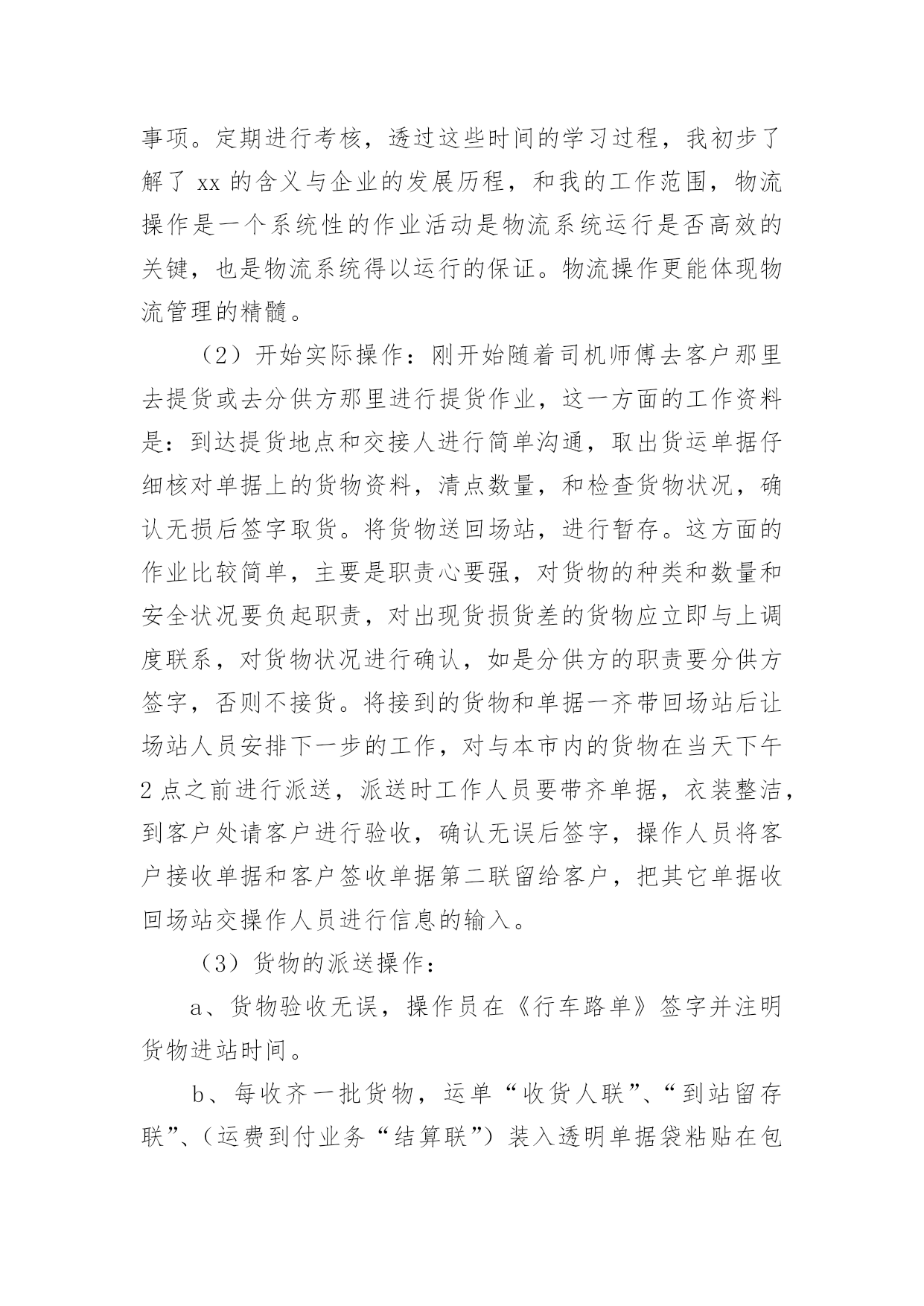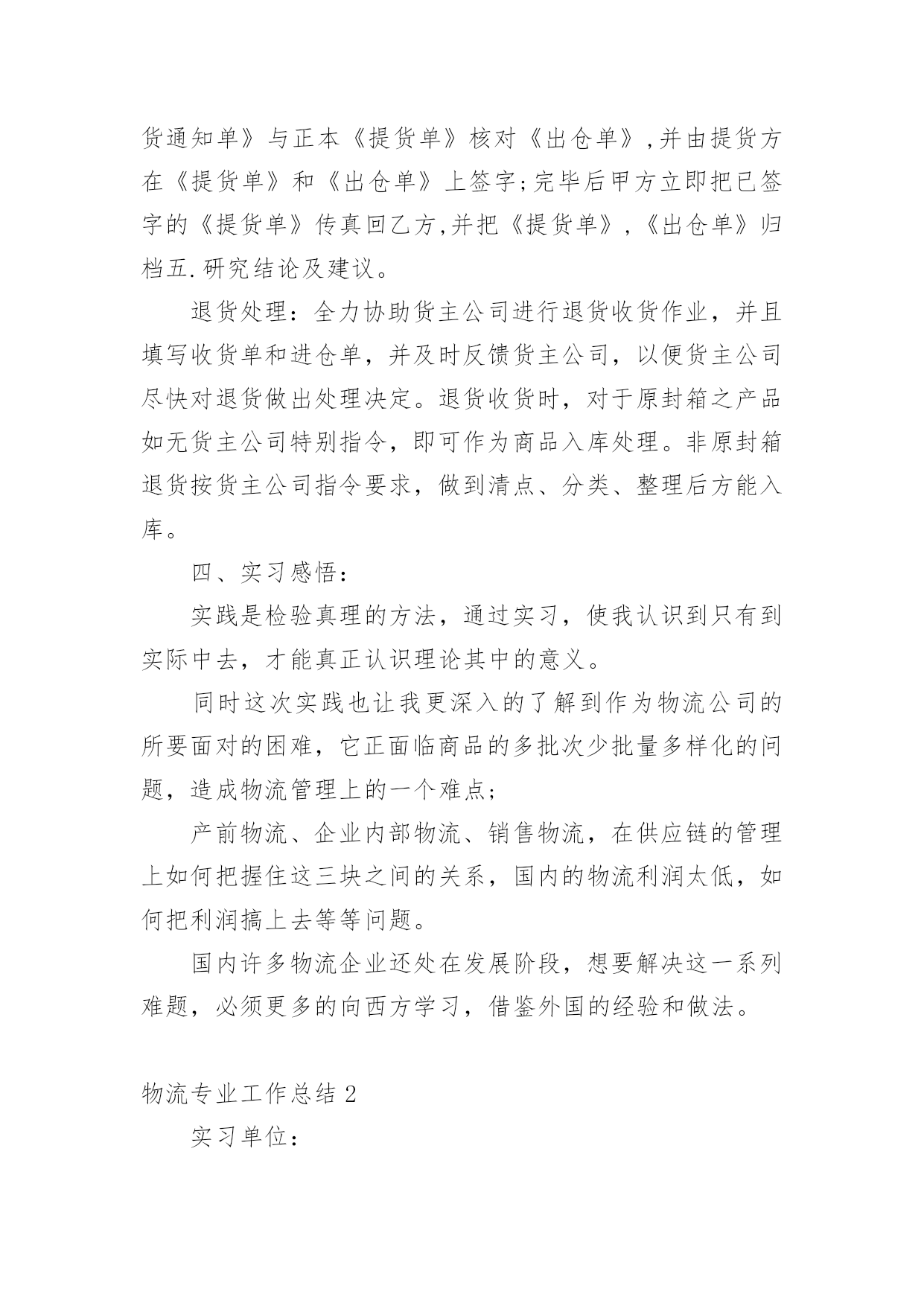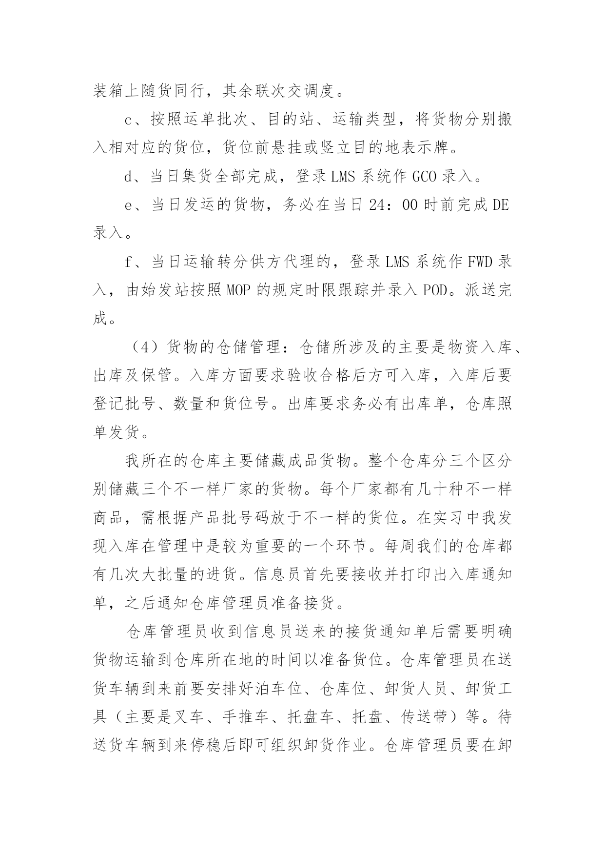 物流专业工作总结总结是把一定阶段内的有关情况分析研究,做出有指导性的经验方法以及结论的书面材料,通过它可以全面地、系统地了解以往的学习和工作情况,让我们抽出时间写写总结吧。我们该怎么写总结呢?下面是小编为大家整理的物流专业工作总结,供大家参考借鉴,希望可以帮助到有需要的朋友。物流专业工作总结1一.实习动机:经过近两年的物流专业知识的学习,对物流的定义,基本功能,各个作业流程有了一定的理论基础,通过实习将这些理论与实际的操作相结合,在实践中提高运用知识的能力.二.实习目的和意义:了解物流的特点,主要设备和作业流程,对其进行分析,并依据学习的理论提出自己的意见.1、实习目的:(1)、运用所学的物流实务知识,初步分析实习单位业务运作和经营管理状况,做到理论和实际相结合,增强分析和解决问题能力;(2)、了解实习单位的各项规章制度,增强组织性和纪律性,使我们逐步认识自身不足并逐步改进;(3)、加强和实习单位各层次员工沟通和交流,学习其优秀品质,提高对现实问题的认识,逐步提高社会交往能力和应变能力;(4)、适应课程教学和专业发展需要,收集不同企业在物流运作方面的资料,夯实专业知识。2、实习意义(1)、通过实习,使我们进一步的加强了对书本知识的'理解和对专业基础重要性的认识;(2)、通过实习,使我们对物流运营和社会生活的现状有了进一步的认识,使我们在今后学习和生活中能够逐步调整自身,为将来从学校向社会转变做好准备。三.公司概况:1、基本情况:物流配送中心位于西安经济技术开发区,在20xx年建成。比邻西安咸阳国际机场,南有二环路,北有三环路,邻近过境高速公路,连接着西铜、西禹、西宝等多条高速公路,交通便利。它占地面积2万9884平方公尺,由两座建筑物组成。其中一座是综合单层仓库及四层办公楼的大楼,面积为1万7861平方公尺;另一座是两层楼高的仓库,面积大约是5315平方公尺。2、主要设施:配送中心拥有两种型号的高位叉车6台,外形美观,电动动力,可升至6.5米的工作臂。手推平板车,拥有多辆手推平板车、手推液压车、人力叉车(俗称地牛)以及国际标准1M*1.2M地台板。运输车辆,中心拥有多辆10吨全封闭厢型货车,8吨全封闭厢型货车,5吨全封闭厢型货车,及2吨以下的厢型货车。同时拥有联盟型车队,可调动车辆近百辆。3、功能区概况:A区、建筑面积5000平方米的生鲜加工配送中心是目前国内连锁超市中的生鲜品生产基地。B区、建筑面积15000平方米的库区,是国内一流的现代化物流库房。采用高站台设计,作业线长度280米,可同时对80辆卡车进行作业;库内采用高位立体式货架,设计标准托盘储位近8000个;采用先进的物流信息系统进行管理,做到在库商品的管理,提高商品周转率,实现了计算机控制的先进先出。现库存商品单品数约在10000种,日出货量约5000箱,差错率控制居于国内水平。运输网络遍布全省大部分地区,有丰富的连锁店物流经验。C区、建筑面积3200平方米的四层综合大楼,做为XX商业集团办公、培训的场所。4、作业流程:进仓:乙方提前一天将《入库通知单》传真给甲方确认;甲方收货时根据《入库通知单》上的内容逐项核对,(如货损,货差,货单不符将记入《进仓单》);二小时内甲方将《进仓单》传真回乙方后归档,月底制定报表.出仓:乙方提前一天将《提货通知单》传真给甲方,写明出货的时间,车队名和所提货品的货号,数量;当天车队携带正本《提货单》到相应的货仓,甲方根据乙方签字样本,《提货通知单》与正本《提货单》核对《出仓单》,并由提货方在《提货单》和《出仓单》上签字;完毕后甲方立即把已签字的《提货单》传真回乙方,并把《提货单》,《出仓单》归档五.研究结论及建议。退货处理:全力协助货主公司进行退货收货作业,并且填写收货单和进仓单,并及时反馈货主公司,以便货主公司尽快对退货做出处理决定。退货收货时,对于原封箱之产品如无货主公司特别指令,即可作为商品入库处理。非原封箱退货按货主公司指令要求,做到清点、分类、整理后方能入库。四、实习感悟:实践是检验真理的方法,通过实习,使我认识到只有到实际中去,才能真正认识理论其中的意义。同时这次实践也让我更深入的了解到作为物流公司的所要面对的困难,它正面临商品的多批次少批量多样化的问题,造成物流管理上的一个难点;产前物流、企业内部物流、销售物流,在供应链的管理上如何把握住这三块之间的关系,国内的物流利润太低,如何把利润搞上去等等问题。国内许多物流企业还处在发展阶段,想要解决这一系列难题,必须更多的向西方学习,借鉴外国的经验和做法。物流专业工作总结2实习单位:xxx实习时间:xxx一、专业概述及前言物流管理专业是为社会培养包括铁路货物运输、货运站;道路货物运输;水上货物运输、货运港口;航空货物运输;管道运输业;装卸搬运和其他运输服务业;仓储业;邮政业;批
