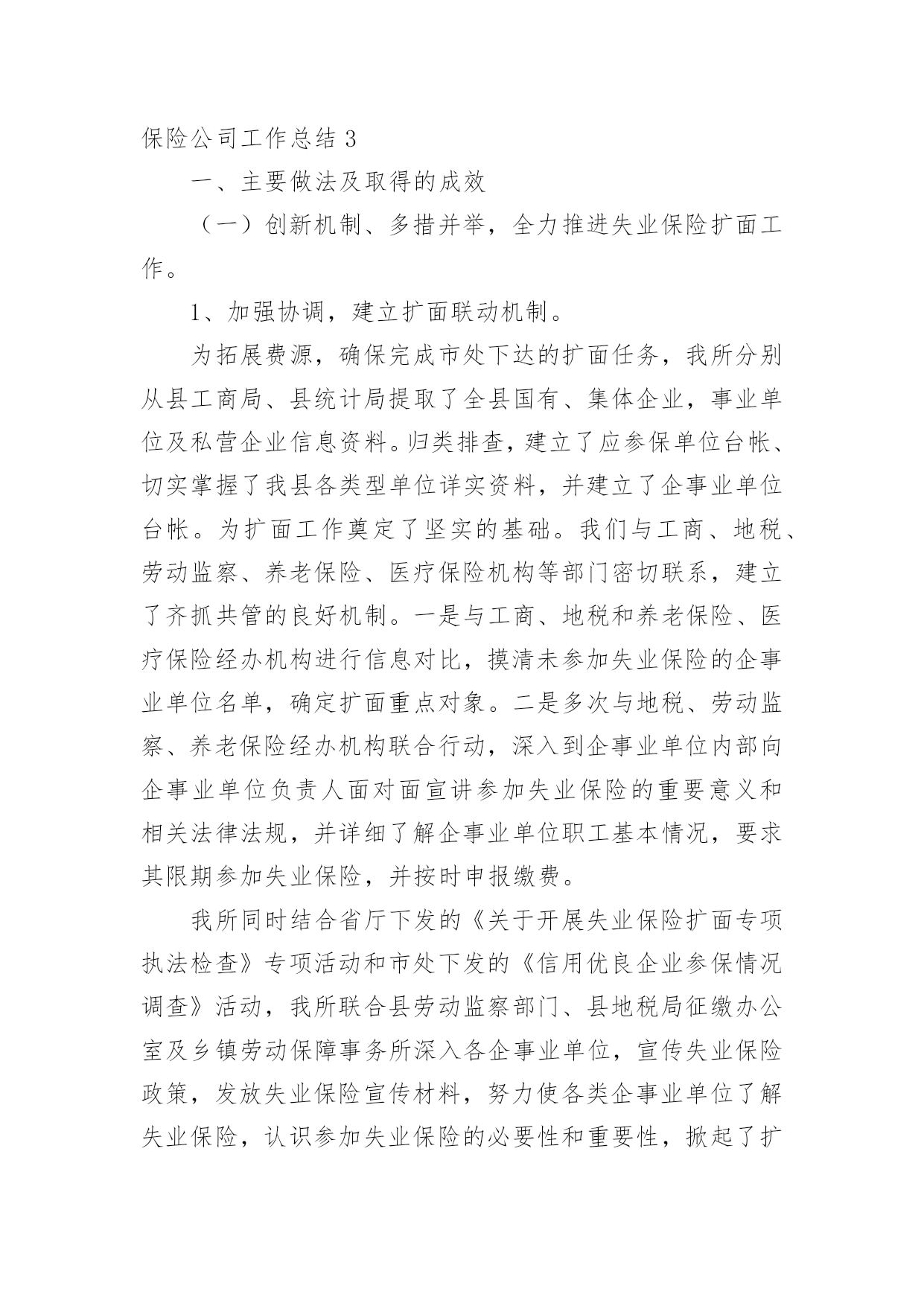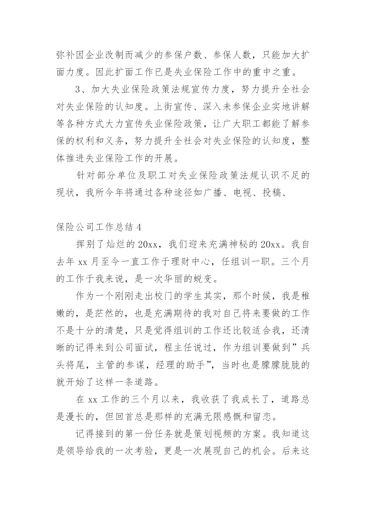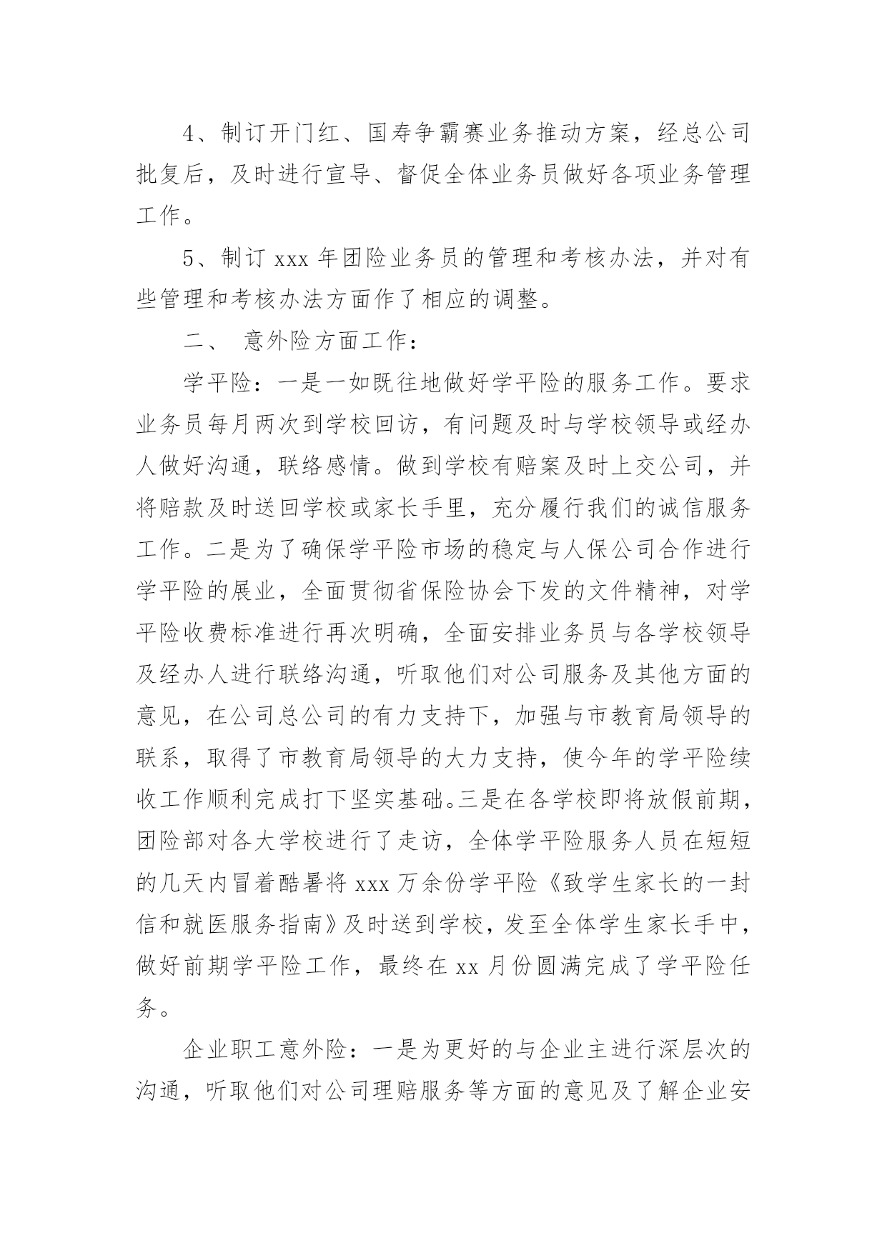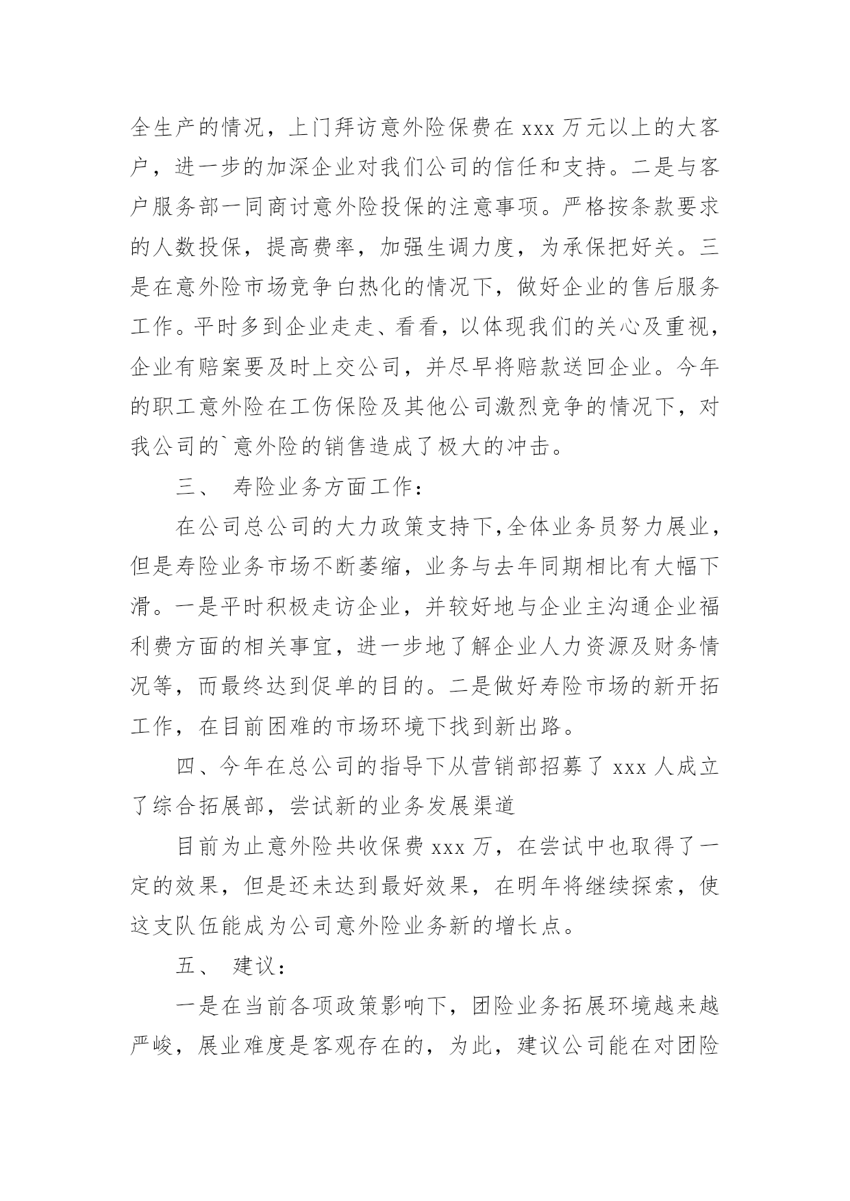 保险公司工作总结总结是在某一时期、某一项目或某些工作告一段落或者全部完成后进行回顾检查、分析评价,从而得出教训和一些规律性认识的一种书面材料,它可以帮助我们有寻找学习和工作中的规律,我想我们需要写一份总结了吧。我们该怎么写总结呢?以下是小编整理的保险公司工作总结,希望能够帮助到大家。保险公司工作总结1一年来,在公司总的指挥下,团险部全体同仁积极领会总公司工作意图和指示,在市场竞争日趋激烈的环境下努力拓展业务,为完成公司下达的任务指标而努力,现将总结如下:一、员工管理、业务学习工作:1、年初按公司总公司工作意图,在团险部内部人员重新进行配置,积极调动团险业务员和协保员的展业积极性。2、制定符合团险实际情况的管理制度,开好部门早会、及时传达上级指示精神,商讨工作中存在的问题,布置学习业务的相关新知识和新承保事项,使业务员能正确引导企业对职工意外险的认识,以减少业务的逆选择,降低赔付率。3、加强部门人员之间的沟通,统一了思想和工作方法,督促部门人员做好活动量管理,督促并较好地配合业务员多方位拓展业务。4、制订开门红、国寿争霸赛业务推动方案,经总公司批复后,及时进行宣导、督促全体业务员做好各项业务管理工作。5、制订xxx年团险业务员的管理和考核办法,并对有些管理和考核办法方面作了相应的调整。二、意外险方面工作:学平险:一是一如既往地做好学平险的服务工作。要求业务员每月两次到学校回访,有问题及时与学校领导或经办人做好沟通,联络感情。做到学校有赔案及时上交公司,并将赔款及时送回学校或家长手里,充分履行我们的诚信服务工作。二是为了确保学平险市场的稳定与人保公司合作进行学平险的展业,全面贯彻省保险协会下发的文件精神,对学平险收费标准进行再次明确,全面安排业务员与各学校领导及经办人进行联络沟通,听取他们对公司服务及其他方面的意见,在公司总公司的有力支持下,加强与市教育局领导的联系,取得了市教育局领导的大力支持,使今年的学平险续收工作顺利完成打下坚实基础。三是在各学校即将放假前期,团险部对各大学校进行了走访,全体学平险服务人员在短短的几天内冒着酷暑将xxx万余份学平险《致学生家长的一封信和就医服务指南》及时送到学校,发至全体学生家长手中,做好前期学平险工作,最终在xx月份圆满完成了学平险任务。企业职工意外险:一是为更好的与企业主进行深层次的沟通,听取他们对公司理赔服务等方面的意见及了解企业安全生产的情况,上门拜访意外险保费在xxx万元以上的大客户,进一步的加深企业对我们公司的信任和支持。二是与客户服务部一同商讨意外险投保的注意事项。严格按条款要求的人数投保,提高费率,加强生调力度,为承保把好关。三是在意外险市场竞争白热化的情况下,做好企业的售后服务工作。平时多到企业走走、看看,以体现我们的关心及重视,企业有赔案要及时上交公司,并尽早将赔款送回企业。今年的职工意外险在工伤保险及其他公司激烈竞争的情况下,对我公司的`意外险的销售造成了极大的冲击。三、寿险业务方面工作:在公司总公司的大力政策支持下,全体业务员努力展业,但是寿险业务市场不断萎缩,业务与去年同期相比有大幅下滑。一是平时积极走访企业,并较好地与企业主沟通企业福利费方面的相关事宜,进一步地了解企业人力资源及财务情况等,而最终达到促单的目的。二是做好寿险市场的新开拓工作,在目前困难的市场环境下找到新出路。四、今年在总公司的指导下从营销部招募了xxx人成立了综合拓展部,尝试新的业务发展渠道目前为止意外险共收保费xxx万,在尝试中也取得了一定的效果,但是还未达到最好效果,在明年将继续探索,使这支队伍能成为公司意外险业务新的增长点。五、建议:一是在当前各项政策影响下,团险业务拓展环境越来越严峻,展业难度是客观存在的,为此,建议公司能在对团险予以重视,并在外围环境经营上予以支持。二是建议公司领导多参加团险部会议,多与业务员沟通、交流,在业务思路上予以指导与帮助。六、明年工作思路1、做好学平险收费前的各项工作。2、明年工伤保险将在全市全面铺开,因此将工伤保险的影响降低,在巩固现有意外险的基础上,开拓新的意外险来源,特别是一些代理业务。3、根据目前新型农村合作医疗的开展情况,找到切入点,以便寻求合作的办法,增加新的业务增长点。4、开拓寿险市场,尝试职场营销。5、加快综合拓展员队伍的建设与发展,在公司总公司的大力支持下,在一体化营销方面多动脑筋、多做文章。6、加强对团险业务员队伍的建设。保险公司工作总结2很多人都说过保险是个骗人的行业,那更别说是加入保险了,更说入职是在给你洗,其实不是,但你在接触一个新的行业的时候,企业必须要给你灌输一些信息,才能使你对心的工作、环境有一个新的认识。短暂的两天学习结束了,然而留给我们的启发及思考却刚刚开始。借此机会来谈谈我的培训心得。回顾这两天的学习过程,真是我人生中的一