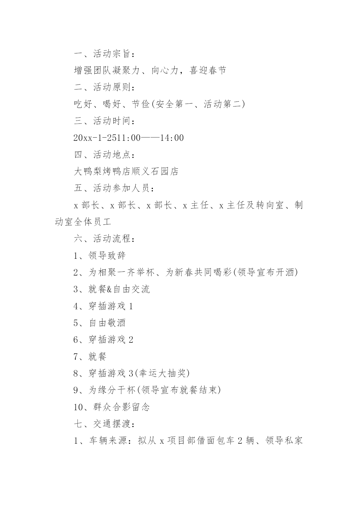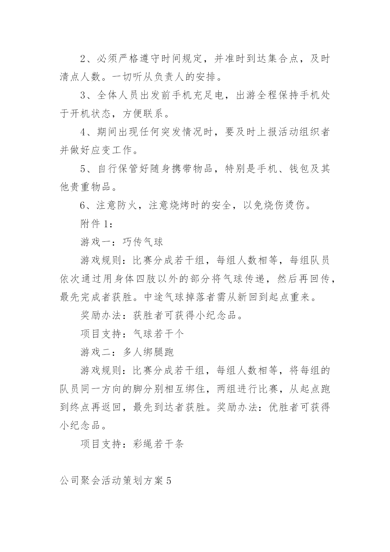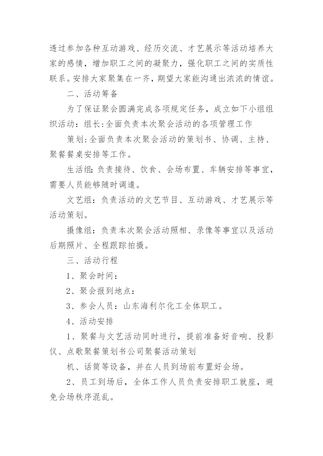 公司聚会活动策划方案为了确保事情或工作科学有序进行,常常需要提前制定一份优秀的方案,一份好的方案一定会注重受众的参与性及互动性。我们应该怎么制定方案呢?下面是小编帮大家整理的公司聚会活动策划方案,希望能够帮助到大家。公司聚会活动策划方案1一、主办单位:集团企管部二、活动主题:努力工作,快乐生活三、活动目的:为丰富同事们办公生活,培养大家团结合作潜力,增强员工之间默契度,同时增进部门之间的交流,提高企业凝聚力。四、活动组织:1、活动时间:20--年11月18日(周日)14:00—17.302、活动地点:办公楼一楼3、活动对象:集团总部所有人员五、活动流程:1、总经理致辞2、主持人介绍比赛项目流程:(一)项目一:你画我猜比赛规则:每个部门出两组队员,每组两人,一个人看主持人手里拿的`画纸,并比划给对方,能够描述资料,但不能说出有关文字,另一个人猜,在5分钟内猜对资料多的为胜。评委记好时间,并登记,统计出名次。(二)项目二:螃蟹运球比赛规则:两人一组,应对面,将气球夹在身体中间手拉手一齐向终点移动。在行走过程中持续平衡,不让球滚下去,也不能用手去碰,让我们比一比,哪两只小螃蟹走的又快又稳,比赛用时最少为获胜。(三)项目三:仙人指路这项游戏由两个人共同来完成。其中一人A在比赛开始前被蒙住双眼,由“仙人”B指引“穿越荆棘”!规则:一组两人,其中一人被蒙住双眼,另一人负责指引道路。只能透过语言沟通,不能搀扶。被蒙住双眼的务必按照比赛设定的路线,越过路障。如在行进过程中碰到路障,每碰一个路障时间加十秒,在最后计算时间时计入总时间。比赛以用时最短为获胜。(四)项目四:2人3足比赛规则:每2个人为一组,2个人中一个人脚与另一个人脚绑在一齐,比赛开始2个人从始点向终点走去或跑去,用时最少的队伍为胜利。3、颁发奖品,合影留念。六、奖励细则1、根据活动现场综合表现评选出优秀部门一个,并颁发奖状。2、每项活动根据比赛成绩:(1)评选出1个优秀部门并颁发奖状;(2)每项活动第一名,奖品:笔记本一个。第二名,手套一副。3、四项活动中有三项活动倒数第一的部门奖励擦电梯一周。七、人员分工:活动主持:评委:奖品采购:八、费用预算:共计:奖状1个-3元+笔记本4个-8元+手套4副-5元=55元公司聚会活动策划方案2为了活跃公司的文化气氛,增进同事之间的`感情,相互了解,强化了每个人的主人翁意识和集体荣誉感,举办此次活动。一、活动时间:20xx年2月xx日,晚6点左右二、活动地点:还未确定,等办公室通知三、策划准备1、地点选择:与酒店方面联系好,要求场地音响设备,定好日期2、车辆安排:当天跟司机联系好3、礼品物资:烟酒花生瓜子零食水果奖品4、设备准备:话筒笔记本电脑相机歌曲歌词活动音乐下载5、节目安排:游戏歌曲舞蹈相声魔术双簧小品抽奖,提前通知各班班长,让员工有准备,然后报公司办公室。6、人员安排:主持:2人男女各一名(准备主持稿串词)摄影设备管理(播放音乐)7、活动结束现场整理四、活动当天流程1、主持人宣布活动开始2、潘总致辞3、表演节目4、抽奖环节5、互动游戏6、用餐五、经费预算交通费用酒店消费礼品水果等六、活动总结文字照片录像存档公司聚会活动策划方案3一、活动目的活动聚会聚餐,是给大家带给一个交流、沟通的机会,透过参加各种互动游戏、经历交流、才艺展示等活动培养大家的感情,增加职工之间的凝聚力,强化职工之间的实质性联系。安排大家聚集在一齐,期望大家能沟通出浓浓的情谊。二、活动筹备为了保证聚会圆满完成各项规定任务,成立如下小组组织活动:组长:全面负责本次聚会活动的各项管理工作策划:全面负责本次聚会活动的策划书、协调、主持、聚餐餐桌安排等工作。生活组:负责接待、饮食、会场布置、车辆安排等事宜,需要人员能够随时调遣。文艺组:负责活动的文艺节目、互动游戏、才艺展示等活动策划。摄像组:负责本次聚会活动照相、录像等事宜以及活动后期照片、全程跟踪拍摄。三、活动行程1、聚会时间:2、聚会报到地点:3、参会人员:山东海利尔化工全体职工。4、活动安排1、聚餐与文艺活动同时进行,提前准备好音响、投影仪、点歌聚餐策划书公司聚餐活动策划机、话筒等设备,并在人员到场前布置好会场。2、员工到场后,全体工作人员负责安排职工就座,避免会场秩序混乱。四、活动经费活动经费由财务科专项管理,所有费用支出由综合办提出和审核,财务负责支出,最后按实际支出做收支明细表,便于审核。五、活动规则:1、聚会活动目的是加强职工友谊,并且在确保所有职工安全的.前提下,才有发起和举办本活动的好处和价值;2、对已经造成实际后果的行为由行为人本人承担一切法律和经济职责,与活动组织者及其他参与活动者无关,活动策划者和组织者不承担任何法律职责;六、活动安全:1、服从统一行程、时间安排,不得擅自脱离团队;2、遵守酒店的一切有