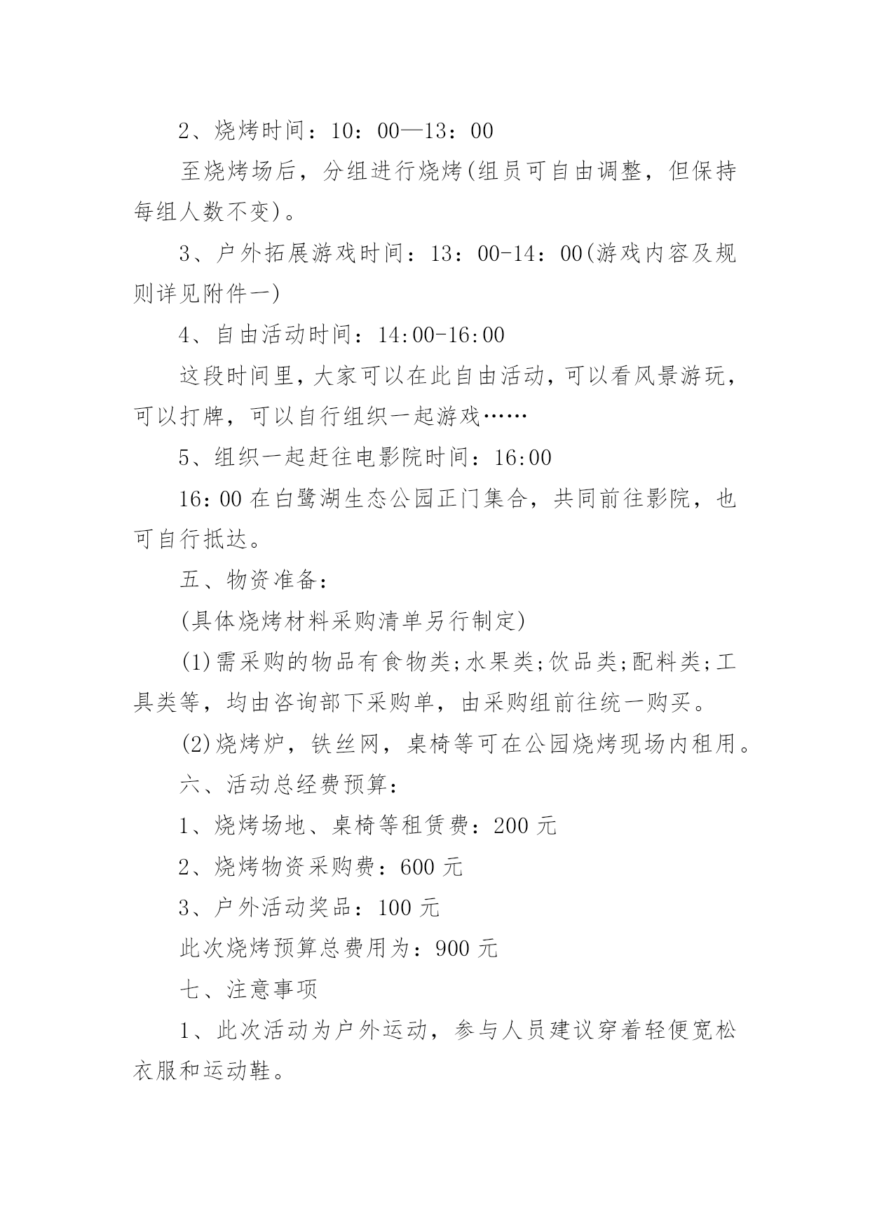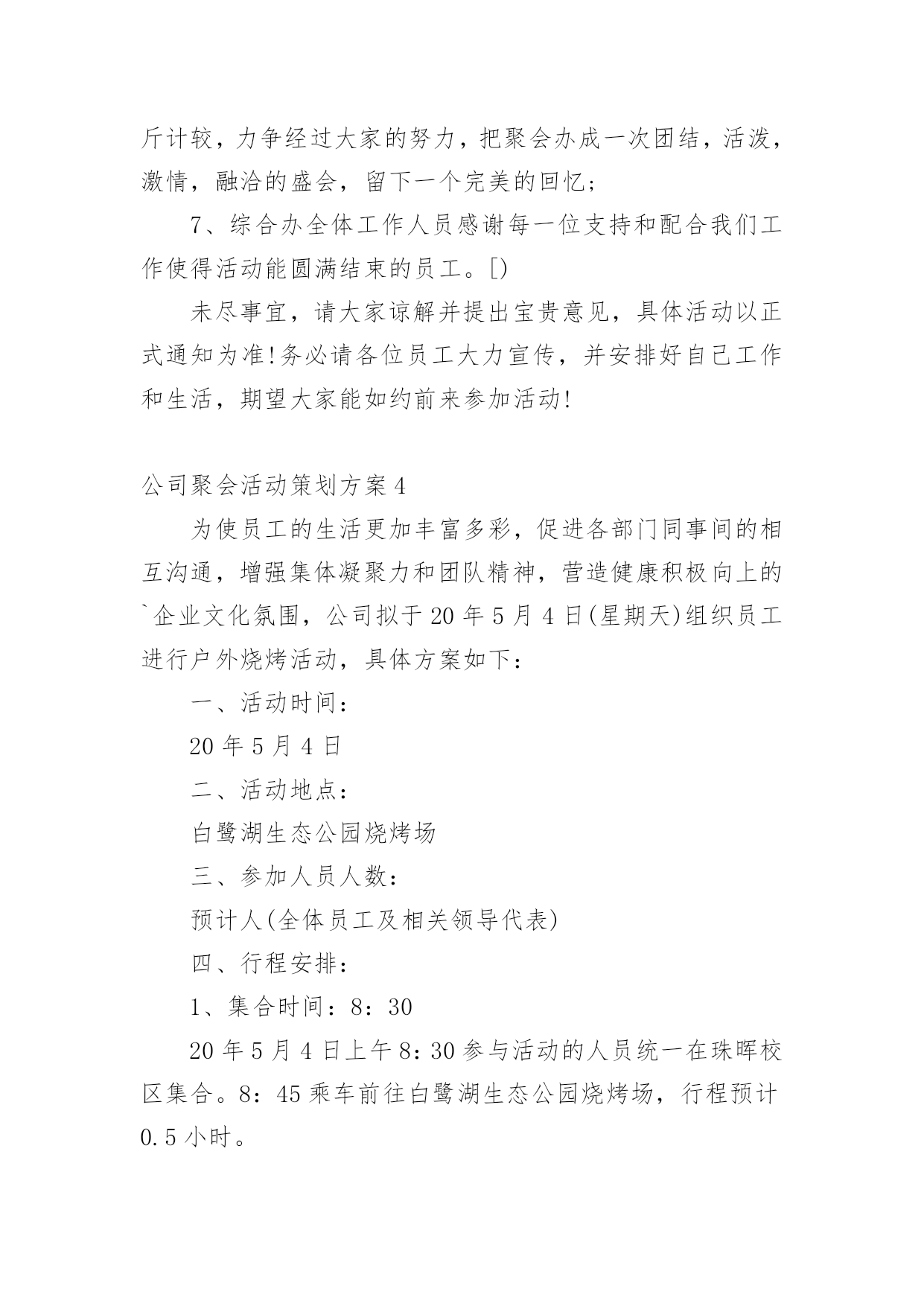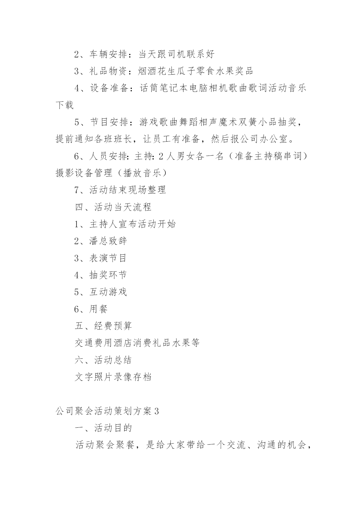 公司聚会活动策划方案为了确保事情或工作科学有序进行,常常需要提前制定一份优秀的方案,一份好的方案一定会注重受众的参与性及互动性。我们应该怎么制定方案呢?下面是小编帮大家整理的公司聚会活动策划方案,希望能够帮助到大家。公司聚会活动策划方案1一、主办单位:集团企管部二、活动主题:努力工作,快乐生活三、活动目的:为丰富同事们办公生活,培养大家团结合作潜力,增强员工之间默契度,同时增进部门之间的交流,提高企业凝聚力。四、活动组织:1、活动时间:20--年11月18日(周日)14:00—17.302、活动地点:办公楼一楼3、活动对象:集团总部所有人员五、活动流程:1、总经理致辞2、主持人介绍比赛项目流程:(一)项目一:你画我猜比赛规则:每个部门出两组队员,每组两人,一个人看主持人手里拿的`画纸,并比划给对方,能够描述资料,但不能说出有关文字,另一个人猜,在5分钟内猜对资料多的为胜。评委记好时间,并登记,统计出名次。(二)项目二:螃蟹运球比赛规则:两人一组,应对面,将气球夹在身体中间手拉手一齐向终点移动。在行走过程中持续平衡,不让球滚下去,也不能用手去碰,让我们比一比,哪两只小螃蟹走的又快又稳,比赛用时最少为获胜。(三)项目三:仙人指路这项游戏由两个人共同来完成。其中一人A在比赛开始前被蒙住双眼,由“仙人”B指引“穿越荆棘”!规则:一组两人,其中一人被蒙住双眼,另一人负责指引道路。只能透过语言沟通,不能搀扶。被蒙住双眼的务必按照比赛设定的路线,越过路障。如在行进过程中碰到路障,每碰一个路障时间加十秒,在最后计算时间时计入总时间。比赛以用时最短为获胜。(四)项目四:2人3足比赛规则:每2个人为一组,2个人中一个人脚与另一个人脚绑在一齐,比赛开始2个人从始点向终点走去或跑去,用时最少的队伍为胜利。3、颁发奖品,合影留念。六、奖励细则1、根据活动现场综合表现评选出优秀部门一个,并颁发奖状。2、每项活动根据比赛成绩:(1)评选出1个优秀部门并颁发奖状;(2)每项活动第一名,奖品:笔记本一个。第二名,手套一副。3、四项活动中有三项活动倒数第一的部门奖励擦电梯一周。七、人员分工:活动主持:评委:奖品采购:八、费用预算:共计:奖状1个-3元+笔记本4个-8元+手套4副-5元=55元公司聚会活动策划方案2为了活跃公司的文化气氛,增进同事之间的`感情,相互了解,强化了每个人的主人翁意识和集体荣誉感,举办此次活动。一、活动时间:20xx年2月xx日,晚6点左右二、活动地点:还未确定,等办公室通知三、策划准备1、地点选择:与酒店方面联系好,要求场地音响设备,定好日期2、车辆安排:当天跟司机联系好3、礼品物资:烟酒花生瓜子零食水果奖品4、设备准备:话筒笔记本电脑相机歌曲歌词活动音乐下载5、节目安排:游戏歌曲舞蹈相声魔术双簧小品抽奖,提前通知各班班长,让员工有准备,然后报公司办公室。6、人员安排:主持:2人男女各一名(准备主持稿串词)摄影设备管理(播放音乐)7、活动结束现场整理四、活动当天流程1、主持人宣布活动开始2、潘总致辞3、表演节目4、抽奖环节5、互动游戏6、用餐五、经费预算交通费用酒店消费礼品水果等六、活动总结文字照片录像存档公司聚会活动策划方案3一、活动目的活动聚会聚餐,是给大家带给一个交流、沟通的机会,透过参加各种互动游戏、经历交流、才艺展示等活动培养大家的感情,增加职工之间的凝聚力,强化职工之间的实质性联系。安排大家聚集在一齐,期望大家能沟通出浓浓的情谊。二、活动筹备为了保证聚会圆满完成各项规定任务,成立如下小组组织活动:组长:全面负责本次聚会活动的各项管理工作策划:全面负责本次聚会活动的策划书、协调、主持、聚餐餐桌安排等工作。生活组:负责接待、饮食、会场布置、车辆安排等事宜,需要人员能够随时调遣。文艺组:负责活动的文艺节目、互动游戏、才艺展示等活动策划。摄像组:负责本次聚会活动照相、录像等事宜以及活动后期照片、全程跟踪拍摄。三、活动行程1、聚会时间:2、聚会报到地点:3、参会人员:山东海利尔化工全体职工。4、活动安排1、聚餐与文艺活动同时进行,提前准备好音响、投影仪、点歌聚餐策划书公司聚餐活动策划机、话筒等设备,并在人员到场前布置好会场。2、员工到场后,全体工作人员负责安排职工就座,避免会场秩序混乱。四、活动经费活动经费由财务科专项管理,所有费用支出由综合办提出和审核,财务负责支出,最后按实际支出做收支明细表,便于审核。五、活动规则:1、聚会活动目的是加强职工友谊,并且在确保所有职工安全的.前提下,才有发起和举办本活动的好处和价值;2、对已经造成实际后果的行为由行为人本人承担一切法律和经济职责,与活动组织者及其他参与活动者无关,活动策划者和组织者不承担任何法律职责;六、活动安全:1、服从统一行程、时间安排,不得擅自脱离团队;2、遵守酒店的一切有