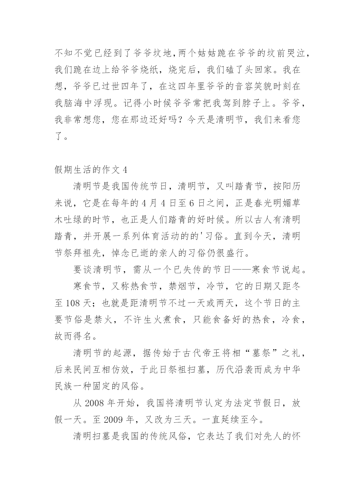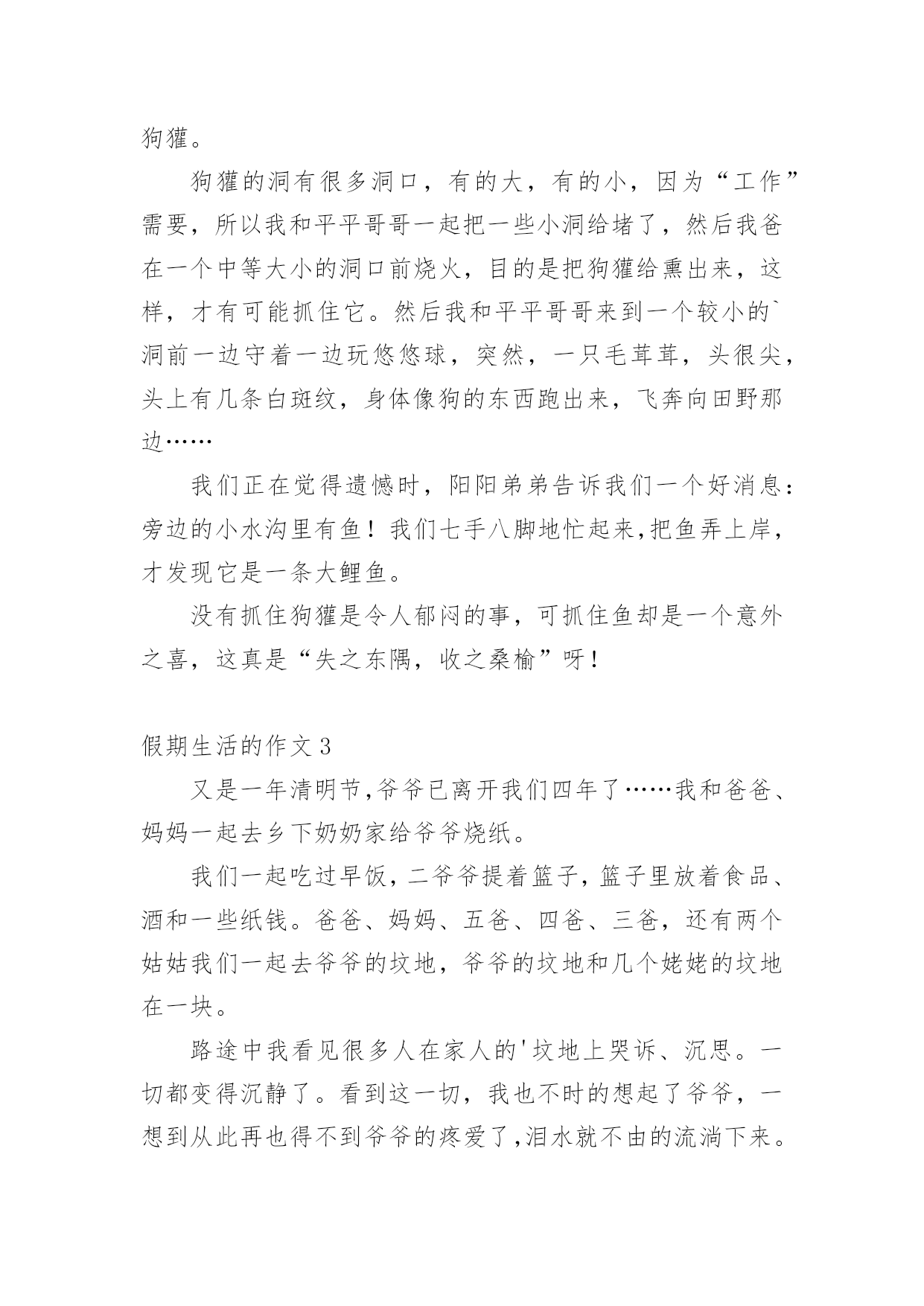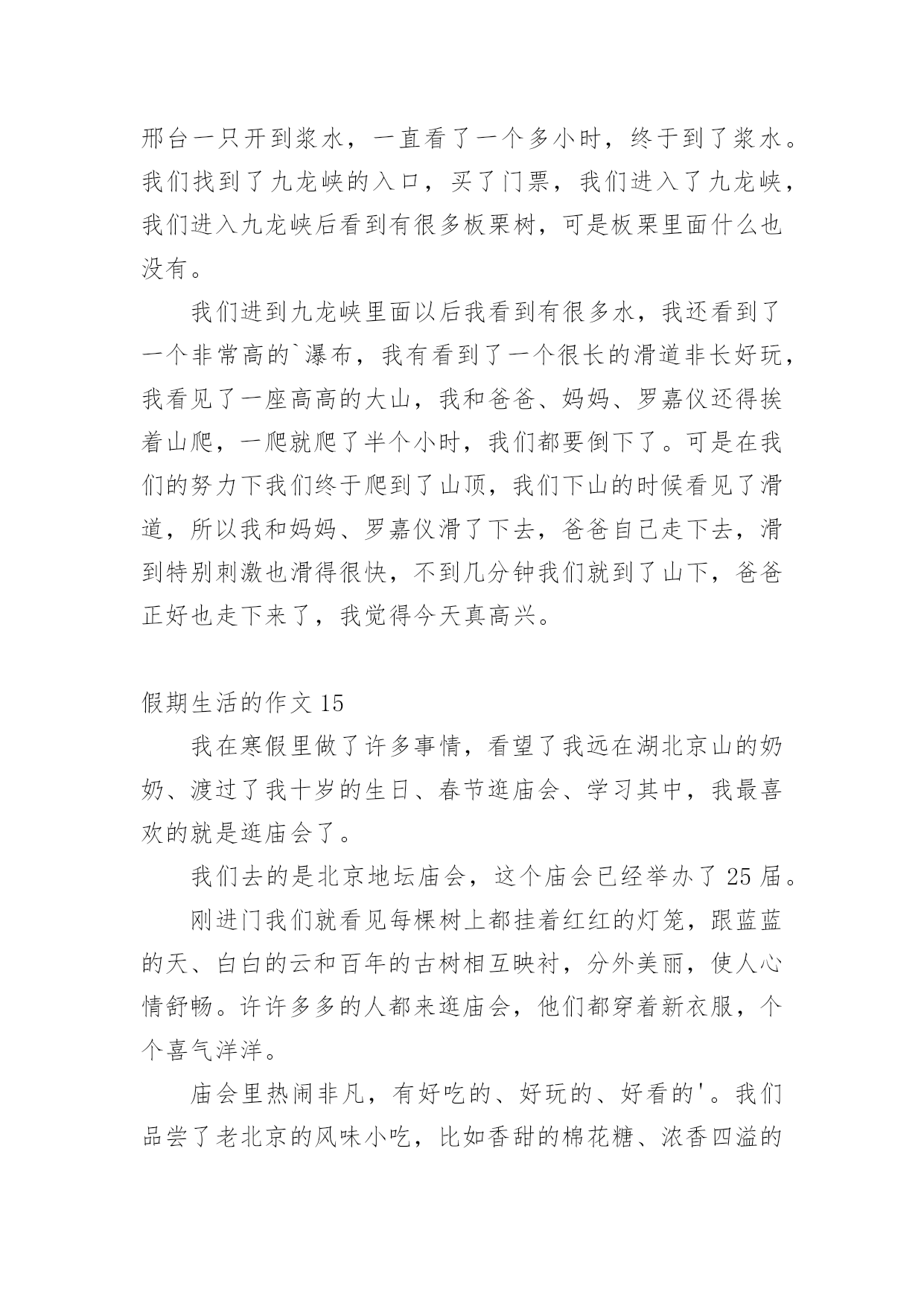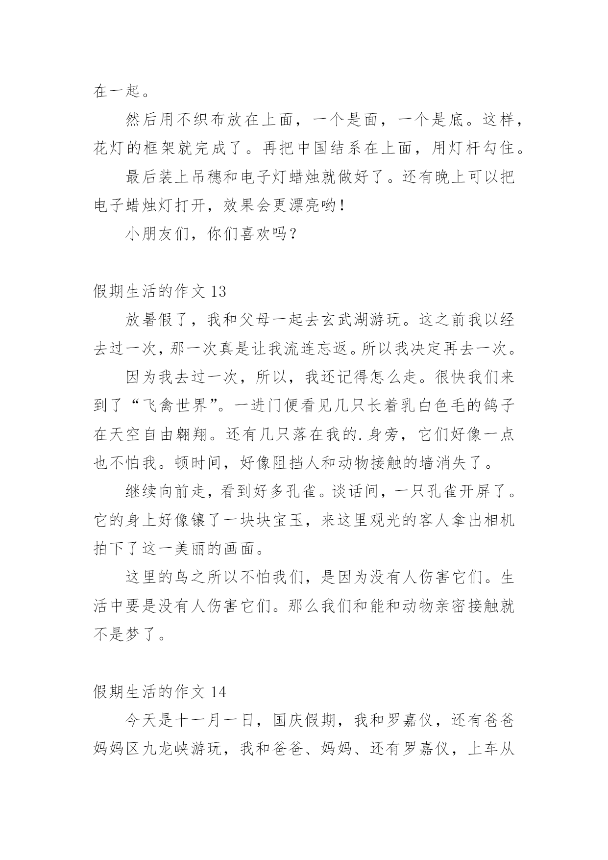 假期生活的作文假期生活的作文精品(15篇)在学习、工作或生活中,许多人都有过写作文的经历,对作文都不陌生吧,借助作文可以宣泄心中的情感,调节自己的心情。写起作文来就毫无头绪?下面是小编为大家收集的假期生活的作文,希望对大家有所帮助。假期生活的作文1假期生活马上就要结束了。不知道同学们是怎么过来的。这个假期我觉得过得特别快,和妈妈出去旅游了两趟,又看了几天书,还没等写完读后感,就觉得马上要开学了。妈妈说领我去游泳,至今也因为她一再地忙,没学成。我每天在奶奶家的楼下玩会儿,交了不少的`朋友。这也算是一个收获吧。这两天写读后感,一个人写挺费劲,就得妈妈陪我一起读和写。写字的时候,有挺多学过的字突然就写不上来了。快要开学了,我得复习一下呀。我才写了3篇读后感。同学们,你们是不都写完了?很想念老师,也想念我的同学。想见你们,又怕开学太快!唉,有点矛盾!假期生活的作文2寒假的一天上午,当时阳光明媚,我们几个人到山上抓狗獾。狗獾的洞有很多洞口,有的大,有的小,因为“工作”需要,所以我和平平哥哥一起把一些小洞给堵了,然后我爸在一个中等大小的洞口前烧火,目的是把狗獾给熏出来,这样,才有可能抓住它。然后我和平平哥哥来到一个较小的`洞前一边守着一边玩悠悠球,突然,一只毛茸茸,头很尖,头上有几条白斑纹,身体像狗的东西跑出来,飞奔向田野那边……我们正在觉得遗憾时,阳阳弟弟告诉我们一个好消息:旁边的小水沟里有鱼!我们七手八脚地忙起来,把鱼弄上岸,才发现它是一条大鲤鱼。没有抓住狗獾是令人郁闷的事,可抓住鱼却是一个意外之喜,这真是“失之东隅,收之桑榆”呀!假期生活的作文3又是一年清明节,爷爷已离开我们四年了……我和爸爸、妈妈一起去乡下奶奶家给爷爷烧纸。我们一起吃过早饭,二爷爷提着篮子,篮子里放着食品、酒和一些纸钱。爸爸、妈妈、五爸、四爸、三爸,还有两个姑姑我们一起去爷爷的坟地,爷爷的坟地和几个姥姥的坟地在一块。路途中我看见很多人在家人的'坟地上哭诉、沉思。一切都变得沉静了。看到这一切,我也不时的想起了爷爷,一想到从此再也得不到爷爷的疼爱了,泪水就不由的流淌下来。不知不觉已经到了爷爷坟地,两个姑姑跪在爷爷的坟前哭泣,我们跪在边上给爷爷烧纸,烧完后,我们磕了头回家。我在想,爷爷已过世四年了,在这四年里爷爷的音容笑貌时刻在我脑海中浮现。记得小时候爷爷常把我驾到脖子上。爷爷,我非常想您,您在那边还好吗?今天是清明节,我们来看您了。假期生活的作文4清明节是我国传统节日,清明节,又叫踏青节,按阳历来说,它是在每年的4月4日至6日之间,正是春光明媚草木吐绿的时节,也正是人们踏青的好时候。所以古人有清明踏青,并开展一系列体育活动的的'习俗。直到今天,清明节祭拜祖先,悼念已逝的亲人的习俗仍很盛行。要谈清明节,需从一个已失传的节日——寒食节说起。寒食节,又称热食节,禁烟节,冷节,它的日期又距冬至108天;也就是距清明节不过一天或两天,这个节日的主要节俗是禁火,不许生火煮食,只能食备好的热食,冷食,故而得名。清明节的起源,据传始于古代帝王将相“墓祭”之礼,后来民间互相仿效,于此日祭祖扫墓,历代沿袭而成为中华民族一种固定的风俗。从2008年开始,我国将清明节认定为法定节假日,放假一天。至2009年,又改为三天。一直延续至今。清明扫墓是我国的传统风俗,它表达了我们对先人的怀念,同时又是踏青赏春的绝好机会。假期生活的作文5玩完水上世界,妈妈带着我们来到了看大马戏的地方。大马戏的舞台、灯光、音响、气氛都布置得精美绝伦。节日也精彩纷呈,分为几个环节:光影传奇、魔幻天使、缘分天空、穿越时空、诙谐幽默和动物表演、功夫英“熊”、摩托飞车、魔域仙境、魔幻火轮、圣殿威仪、再续奇缘。其中最搞笑的是:功夫英“熊”,别看平常的狗熊看起来笨笨重重,可是狗熊在舞台上会变得非常灵巧。你瞧,它们有的会钻火圈,有的会走打滚,还有的会走钢丝呢!最惊险的是:摩托飞车,首先是三辆摩托车在一个球形的大钢丝球里旋转,紧接着又增加了三辆摩托,我的心都提到嗓子眼了,生怕他们撞在一起。没想到他们各个身怀绝技、十分自信,表演结束后,观众们给予了热烈的'掌声。大马戏的精彩无法用言语表达,我只想再看一场,亲爱的小朋友们,你们也去看看吧!假期生活的作文6“流星雨又来临,偷听我的秘密”听着这首魏晨的《流星雨又来临》不禁让我想起暑假里的`一个晚上。那晚,外面静得出奇,只听见风吹着树梢哗哗作响的声音。我和爷爷奶奶一起到院子里乘凉,我仰望天空,黑色的天空中,闪烁着无数颗小星星,不时还有几架飞机飞过。突然,一道光芒划过天空,像是带着尾巴的小星星。是流星!这时我才反应过来,她们都说对着流星许愿很灵,可已经来不及了。唉!在我们的人生中都有许多来不及或没能做的事,现在想想一定有些后悔吧。所以,现在让我们一起努力,为我们的生活增添几分美好的色彩。假期生
