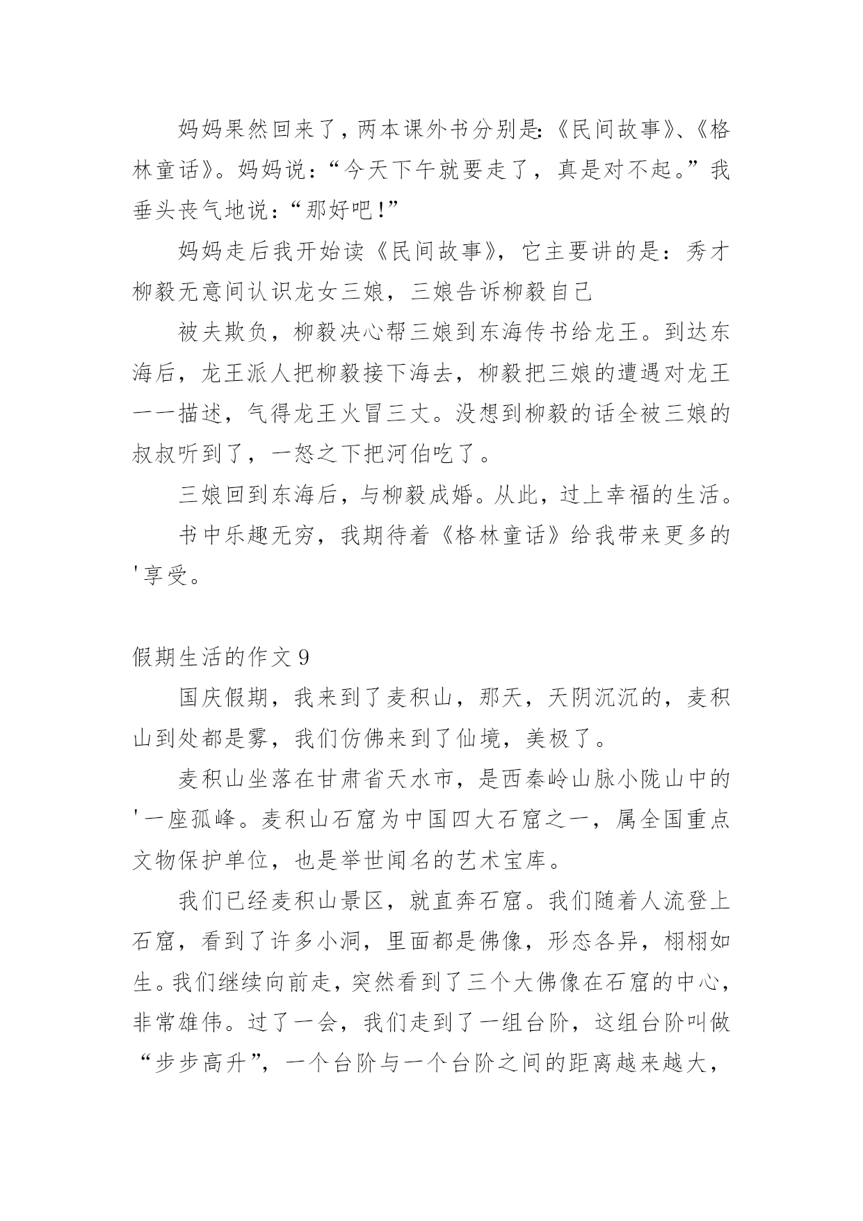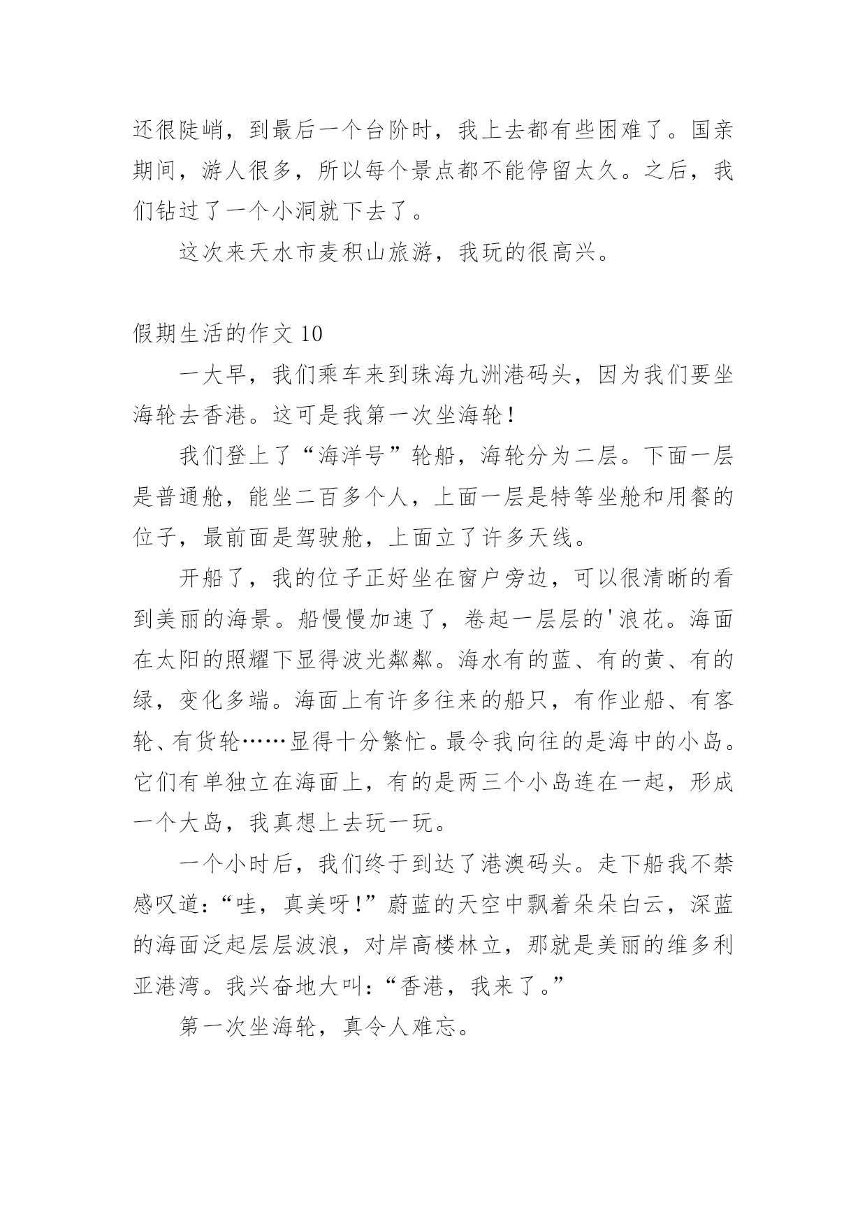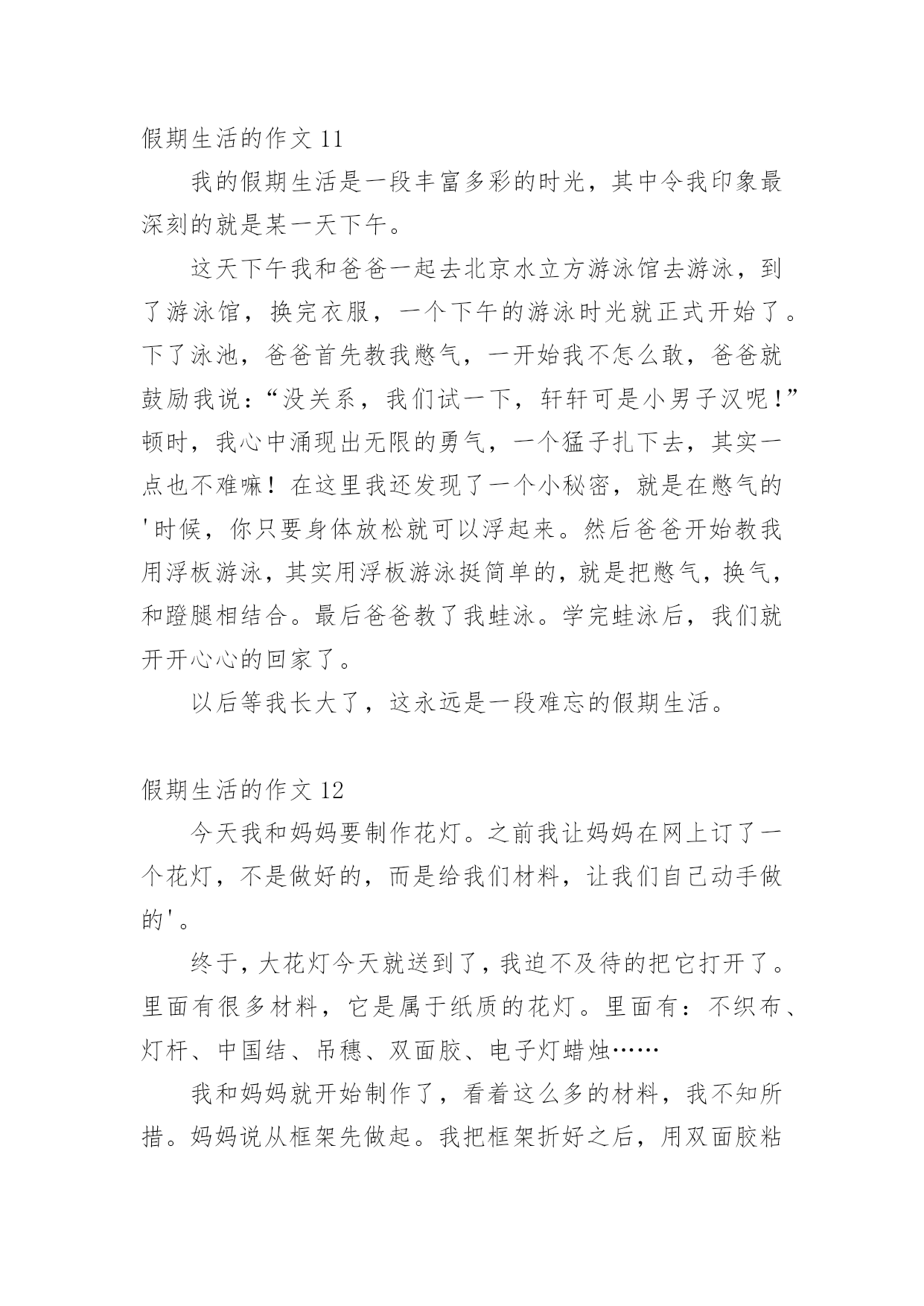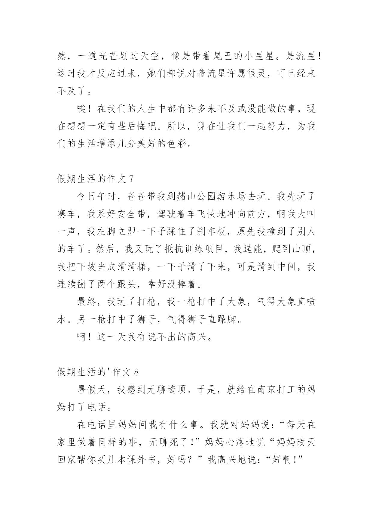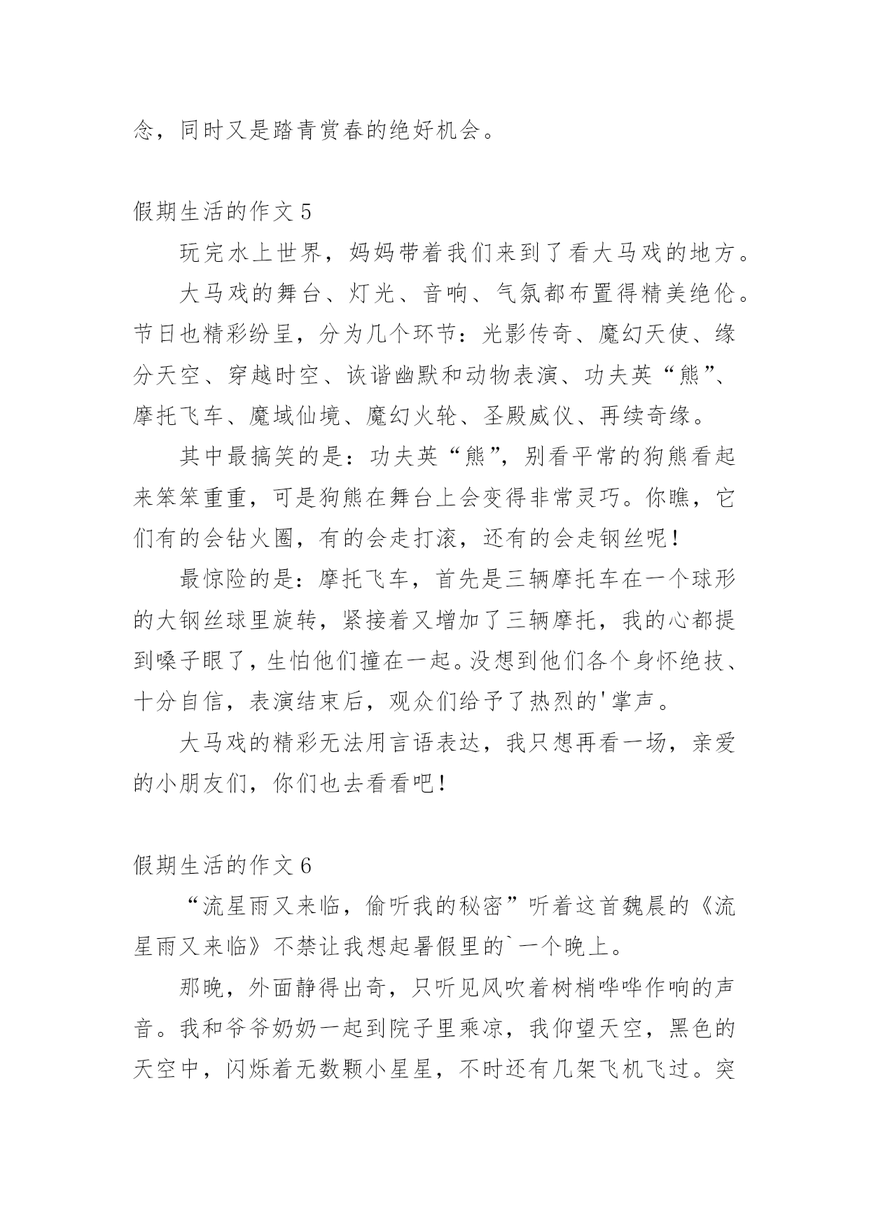 假期生活的作文假期生活的作文精品(15篇)在学习、工作或生活中,许多人都有过写作文的经历,对作文都不陌生吧,借助作文可以宣泄心中的情感,调节自己的心情。写起作文来就毫无头绪?下面是小编为大家收集的假期生活的作文,希望对大家有所帮助。假期生活的作文1假期生活马上就要结束了。不知道同学们是怎么过来的。这个假期我觉得过得特别快,和妈妈出去旅游了两趟,又看了几天书,还没等写完读后感,就觉得马上要开学了。妈妈说领我去游泳,至今也因为她一再地忙,没学成。我每天在奶奶家的楼下玩会儿,交了不少的`朋友。这也算是一个收获吧。这两天写读后感,一个人写挺费劲,就得妈妈陪我一起读和写。写字的时候,有挺多学过的字突然就写不上来了。快要开学了,我得复习一下呀。我才写了3篇读后感。同学们,你们是不都写完了?很想念老师,也想念我的同学。想见你们,又怕开学太快!唉,有点矛盾!假期生活的作文2寒假的一天上午,当时阳光明媚,我们几个人到山上抓狗獾。狗獾的洞有很多洞口,有的大,有的小,因为“工作”需要,所以我和平平哥哥一起把一些小洞给堵了,然后我爸在一个中等大小的洞口前烧火,目的是把狗獾给熏出来,这样,才有可能抓住它。然后我和平平哥哥来到一个较小的`洞前一边守着一边玩悠悠球,突然,一只毛茸茸,头很尖,头上有几条白斑纹,身体像狗的东西跑出来,飞奔向田野那边……我们正在觉得遗憾时,阳阳弟弟告诉我们一个好消息:旁边的小水沟里有鱼!我们七手八脚地忙起来,把鱼弄上岸,才发现它是一条大鲤鱼。没有抓住狗獾是令人郁闷的事,可抓住鱼却是一个意外之喜,这真是“失之东隅,收之桑榆”呀!假期生活的作文3又是一年清明节,爷爷已离开我们四年了……我和爸爸、妈妈一起去乡下奶奶家给爷爷烧纸。我们一起吃过早饭,二爷爷提着篮子,篮子里放着食品、酒和一些纸钱。爸爸、妈妈、五爸、四爸、三爸,还有两个姑姑我们一起去爷爷的坟地,爷爷的坟地和几个姥姥的坟地在一块。路途中我看见很多人在家人的'坟地上哭诉、沉思。一切都变得沉静了。看到这一切,我也不时的想起了爷爷,一想到从此再也得不到爷爷的疼爱了,泪水就不由的流淌下来。不知不觉已经到了爷爷坟地,两个姑姑跪在爷爷的坟前哭泣,我们跪在边上给爷爷烧纸,烧完后,我们磕了头回家。我在想,爷爷已过世四年了,在这四年里爷爷的音容笑貌时刻在我脑海中浮现。记得小时候爷爷常把我驾到脖子上。爷爷,我非常想您,您在那边还好吗?今天是清明节,我们来看您了。假期生活的作文4清明节是我国传统节日,清明节,又叫踏青节,按阳历来说,它是在每年的4月4日至6日之间,正是春光明媚草木吐绿的时节,也正是人们踏青的好时候。所以古人有清明踏青,并开展一系列体育活动的的'习俗。直到今天,清明节祭拜祖先,悼念已逝的亲人的习俗仍很盛行。要谈清明节,需从一个已失传的节日——寒食节说起。寒食节,又称热食节,禁烟节,冷节,它的日期又距冬至108天;也就是距清明节不过一天或两天,这个节日的主要节俗是禁火,不许生火煮食,只能食备好的热食,冷食,故而得名。清明节的起源,据传始于古代帝王将相“墓祭”之礼,后来民间互相仿效,于此日祭祖扫墓,历代沿袭而成为中华民族一种固定的风俗。从2008年开始,我国将清明节认定为法定节假日,放假一天。至2009年,又改为三天。一直延续至今。清明扫墓是我国的传统风俗,它表达了我们对先人的怀念,同时又是踏青赏春的绝好机会。假期生活的作文5玩完水上世界,妈妈带着我们来到了看大马戏的地方。大马戏的舞台、灯光、音响、气氛都布置得精美绝伦。节日也精彩纷呈,分为几个环节:光影传奇、魔幻天使、缘分天空、穿越时空、诙谐幽默和动物表演、功夫英“熊”、摩托飞车、魔域仙境、魔幻火轮、圣殿威仪、再续奇缘。其中最搞笑的是:功夫英“熊”,别看平常的狗熊看起来笨笨重重,可是狗熊在舞台上会变得非常灵巧。你瞧,它们有的会钻火圈,有的会走打滚,还有的会走钢丝呢!最惊险的是:摩托飞车,首先是三辆摩托车在一个球形的大钢丝球里旋转,紧接着又增加了三辆摩托,我的心都提到嗓子眼了,生怕他们撞在一起。没想到他们各个身怀绝技、十分自信,表演结束后,观众们给予了热烈的'掌声。大马戏的精彩无法用言语表达,我只想再看一场,亲爱的小朋友们,你们也去看看吧!假期生活的作文6“流星雨又来临,偷听我的秘密”听着这首魏晨的《流星雨又来临》不禁让我想起暑假里的`一个晚上。那晚,外面静得出奇,只听见风吹着树梢哗哗作响的声音。我和爷爷奶奶一起到院子里乘凉,我仰望天空,黑色的天空中,闪烁着无数颗小星星,不时还有几架飞机飞过。突然,一道光芒划过天空,像是带着尾巴的小星星。是流星!这时我才反应过来,她们都说对着流星许愿很灵,可已经来不及了。唉!在我们的人生中都有许多来不及或没能做的事,现在想想一定有些后悔吧。所以,现在让我们一起努力,为我们的生活增添几分美好的色彩。假期生