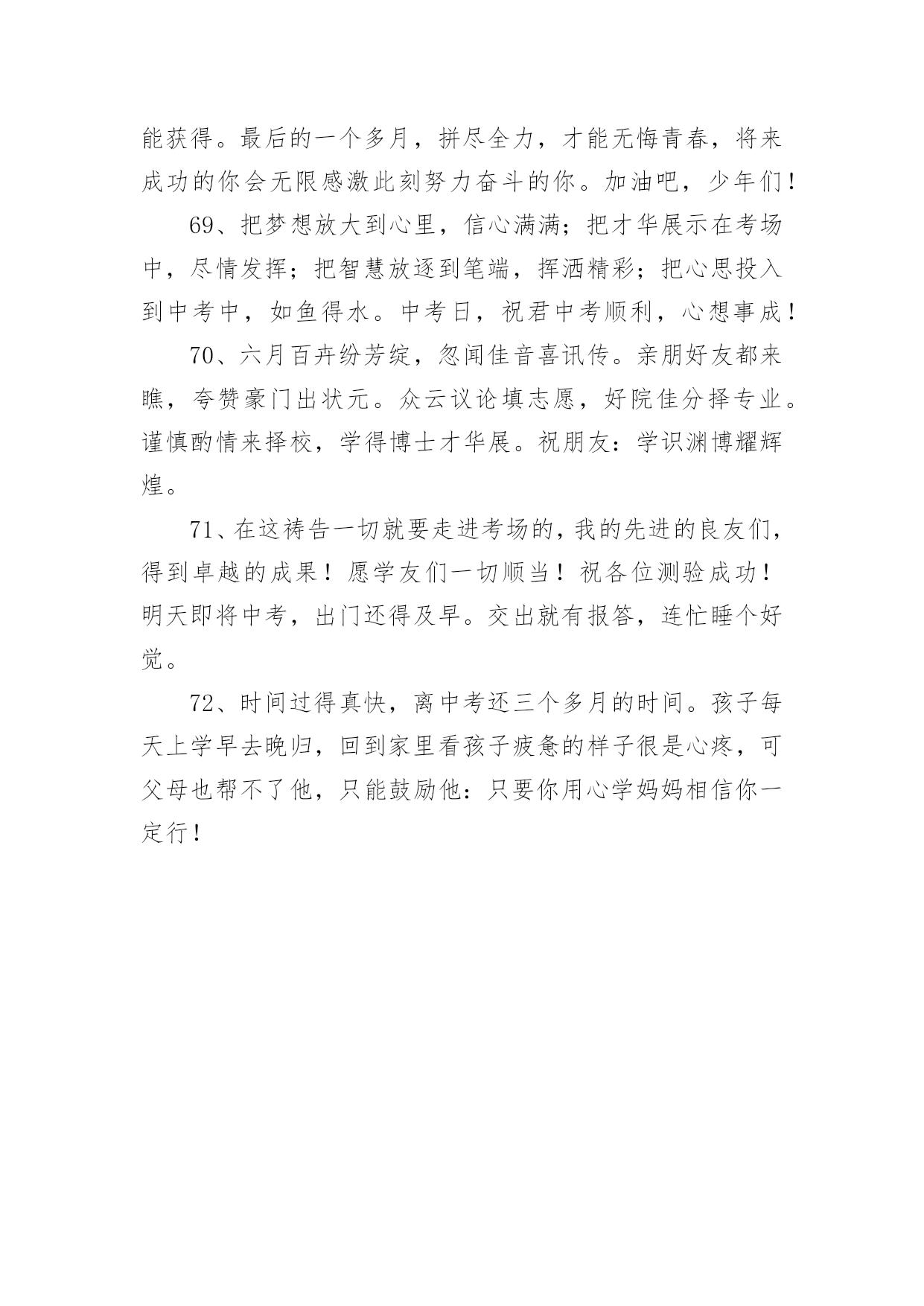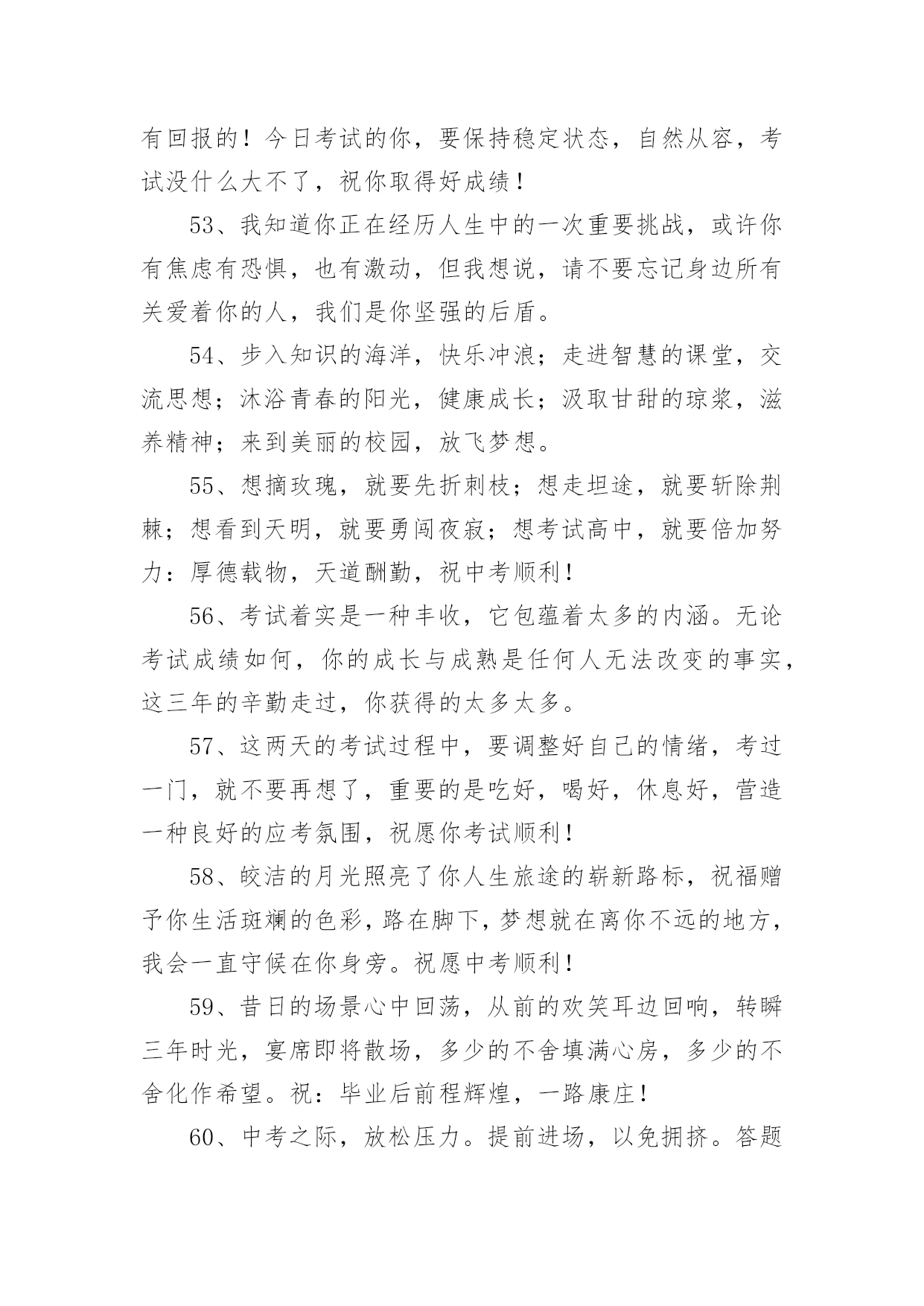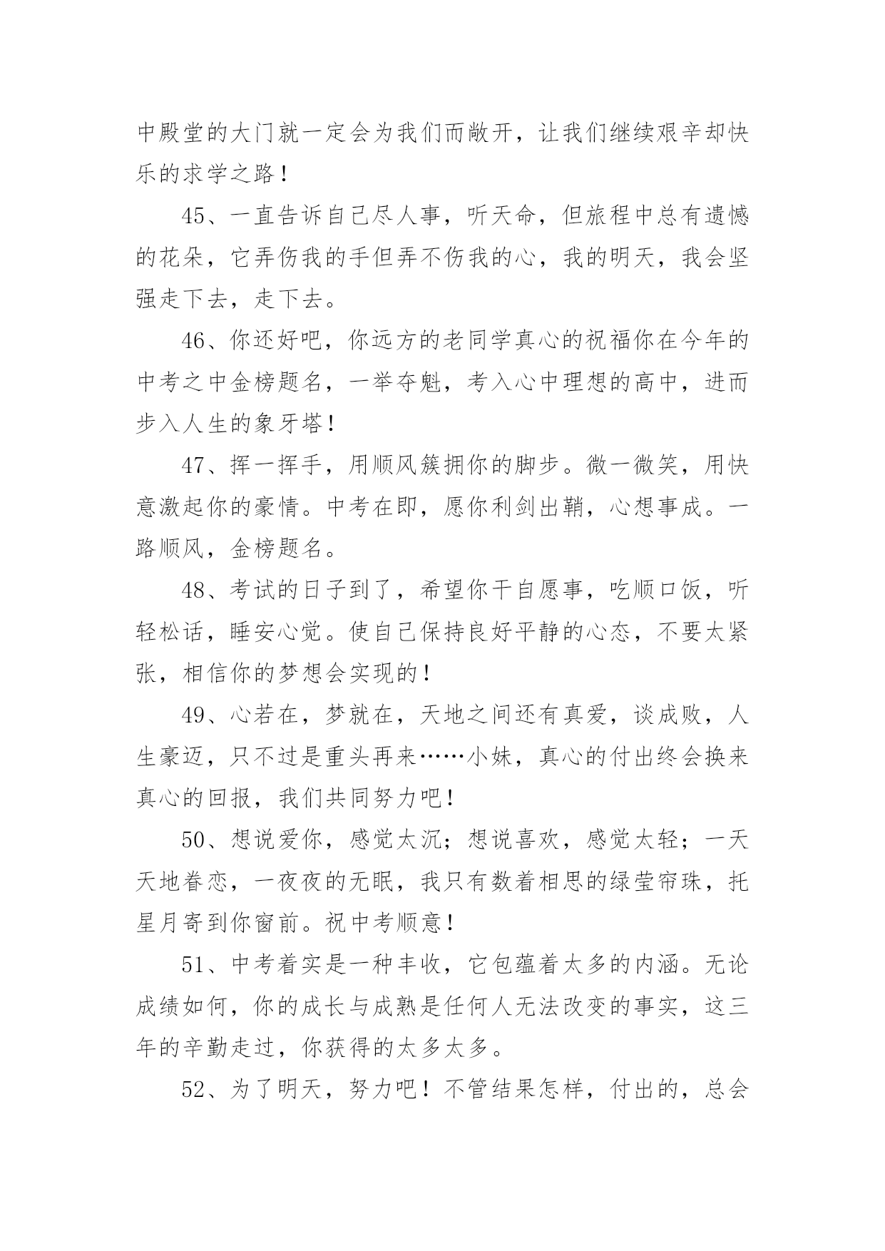中考祝福语简短话中考祝福语简短一句话79句在平平淡淡的日常中,大家都经常接触到祝福语吧,祝福语可以起到可以增进情感,传达祝福的作用。那么,怎么去写祝福语呢?下面是小编整理的中考祝福语简短一句话79句,供大家参考借鉴,希望可以帮助到有需要的朋友。1、相信自己吧!坚持就是胜利!2、祝中考一切顺利成功!美梦成真!3、忘掉失败,不过要牢记失败中的教训。4、师生莫等闲,协力齐心,共同铸就新辉煌。5、终有一天,相约巅峰欢呼起舞!祝考试顺利!6、争取时间就是争取成功,提高效率就是提高分数。7、用心去工作,学习,就一定可以成为生活的强者。8、不要为成功而努力,要为做一个有价值的人而努力。9、分学识智,三心细耐恒,二成应试法,一片平常心。10、重要的不是发生了什么事,而是要做哪些事情来改善它!11、放下包袱开动脑筋,勤于思考好好复习,祝你取得好成绩!12、善待你的爱好,别让它们为学习让路,要让它们替学习服务。13、是对的。老天不负有心人嘛!通知书一定会飞到你的手上的!14、面临大考,心态要好;摆正身心,价值千金;只要努力,总有天地!15、天再热,热不过心;有信心,一切皆有可能。祝中考顺利,前程似锦。16、中考过后好好玩一把吧,用放纵的快乐把中考复习的那些功课统统忘掉!17、初三不再有,劝君珍惜之。一年之经历,终身之财富。加油,祝你成功!18、生命之中最快乐的是拼搏,而非成功,生命之中最痛苦的是懒散,而非失败。19、你所浪费的今天或许就是我们用什么都换不来的过往,珍惜,加油,别留下遗憾。20、你笔下拥有一个色彩绚丽的世界:愿你,也相信你,拥有另一个笔下灿烂的图景。21、中考的意义是在于你真正投入的过程。请务必坚持信念,守得云开见月明!祝你们成功!22、成功的人是可能做出正确决议,并勇敢去尝试,不怕任何难题,为自己的幻想奋斗的人。23、我的各位同伴。最后的一个月。一起收获最后的努力,不管学习还是友情,终将是回忆!24、就要考试了,放开往日学习中的紧张,用一颗平常心轻松面对,相信你会考出理想的成绩。25、开启中考成功之门,钥匙有三。其一:勤奋的精神;其二:科学的方法;其三:良好的心态。26、中考在即,送你一个笑脸,希望你在考试前、考试中、考试后都能保持微笑,相信自己一定能行!27、中考是一个实现人生的省力杠杆,此时是你撬动它的最佳时机,并且以后你的人生会呈弧线上升。28、开明岁月,青春飞扬!愿陈心妍牢记老师的辛勤教诲,常思同学的深厚情谊,在人生的道路上越飞越高!29、愿全区所有的考生都能以平常的心态参加中考,发挥自己的水平,考上理想的学校。我真心地祝福你们。30、也许你不情愿,也许你曾胆怯,但只要跨出那一步,温馨而充满活力的生活就在你的面前。祝你中考成功!31、彩的梦在六月放飞,让我们用行动实现青春的诺言,让我们用汗水浇灌理想的花蕊。祝中考顺利,旗开得胜!32、愿你像那小小的溪流,将那高高的山峰作为生命的起点,一路跳跃,一路奔腾,勇敢地勇敢地奔向生活的大海。33、放开往日的学习中的紧张,用一颗平常心去轻松面对,相信你会考出自己理想的成绩的。愿好运一直陪伴着你!34、曾经我也面对中考,现在有点旁观咯,祝福他们吧,现实象个石头,精神象个蛋,石头虽然坚硬,可蛋才是生命。35、没有了旋律,就没有了诗歌,没有了色彩,那是怎么样的生活?愿春天赋于你绚丽是色彩无限的希望美好的未来。36、明天中考啦,以后不用6点起床啦,以后可以天天游泳啦,明天是新生活的开始,一定不能愁眉苦脸,今晚做个好梦!37、相信自己就好了,没什么大不了的,真的,不用想太多,会什么做什么,你不会的他们肯定会的也不多,相信我没错!38、还有不多的时间就中考了,好好加油吧,记住你们是最棒的。为了自己的未来而奋斗吧!理想的大门正在向你们敞开!39、这么天都坚持下来了,只剩下最后的两个星期了,继续加油,相信你一定会成功的,顺利考入理想,胜利永远属于你!40、如果你想得到甜蜜,就将自己变成工蜂,到花芯中去采撷,如果你想变得聪慧,就将自己变成一尾鱼,遨游于书的海洋。41、为你的付出加油,为你的执着喝彩,为你的努力鼓掌,为你的明天祝福,祝你早日实现心中所想,祝你拥有最美好的未来!42、在即将中考的最后几天里,愿尽最大的可能,在远方倾诉我的祝福,相信自己的梦想与汗水,成功与好运相伴,中考大捷!43、世上最快乐的事是什么?是尽自己的全力做事——不管成功与否,它都值得回味,因为有一张叫“用心”的保鲜膜在帮它哦!44、我坚信,我们付出了汗水,经受了考验,理想中高中殿堂的大门就一定会为我们而敞开,让我们继续艰辛却快乐的求学之路!45、一直告诉自己尽人事,听天命,但旅程中总有遗憾的花朵,它弄伤我的手但弄不伤我的心,我的明天,我会坚强走下去,走下去。46、你还好吧,你远方的老同学真心的祝福你在今年的中考之中金榜题名,一