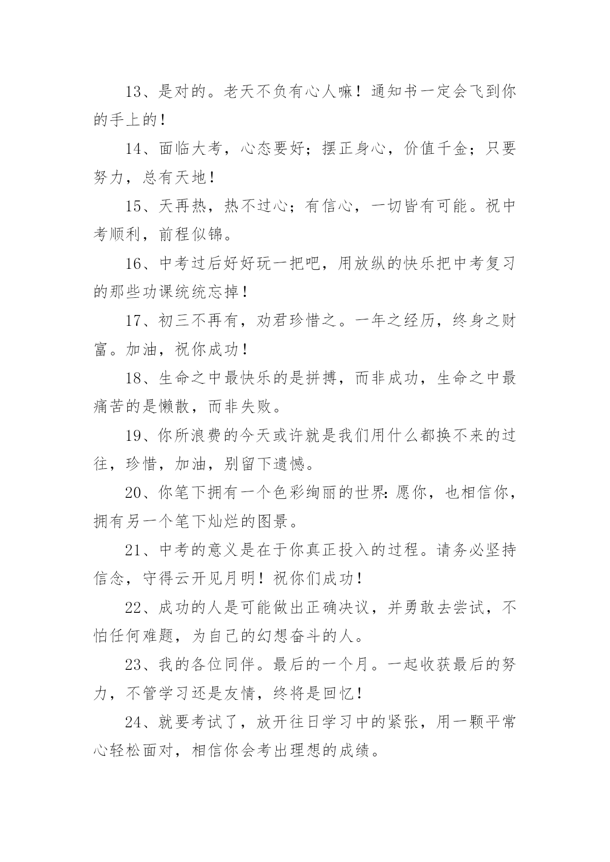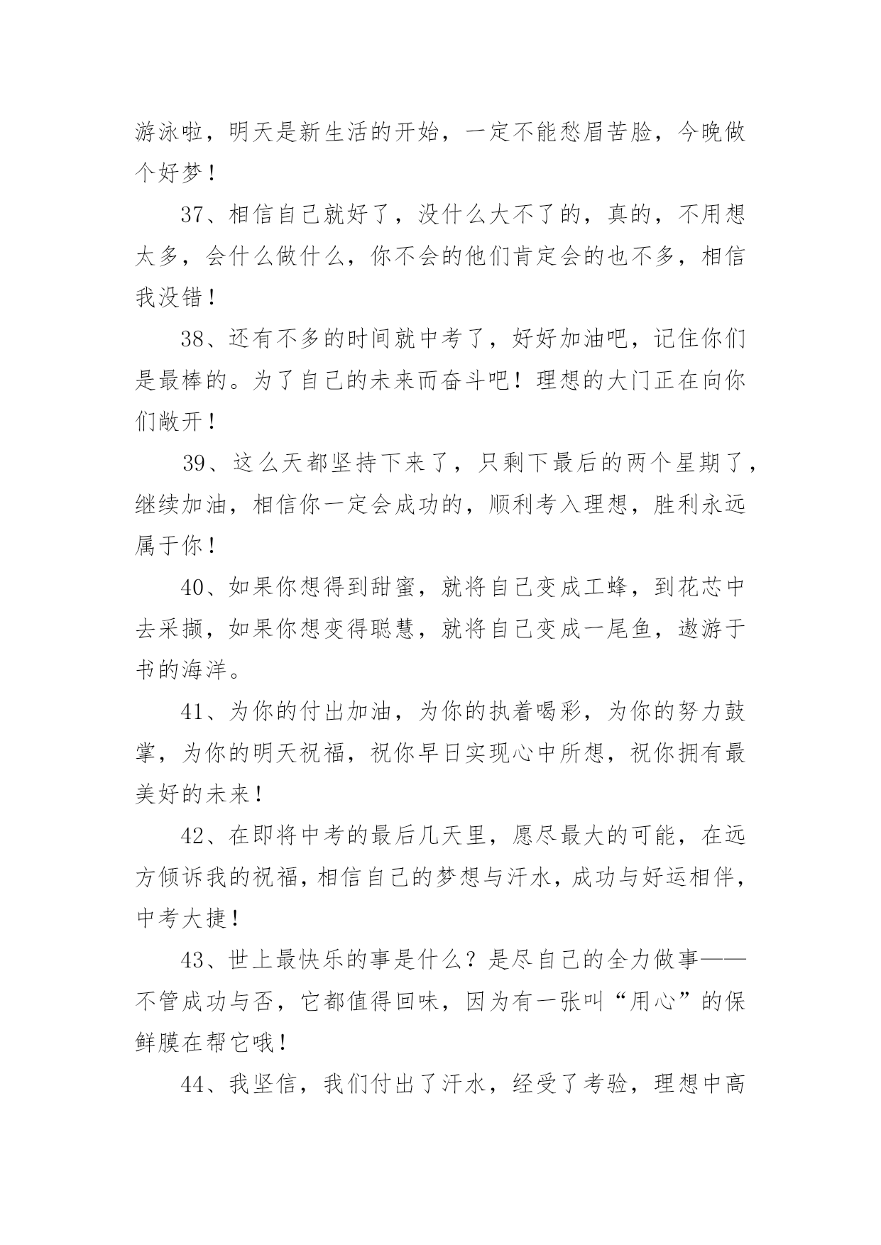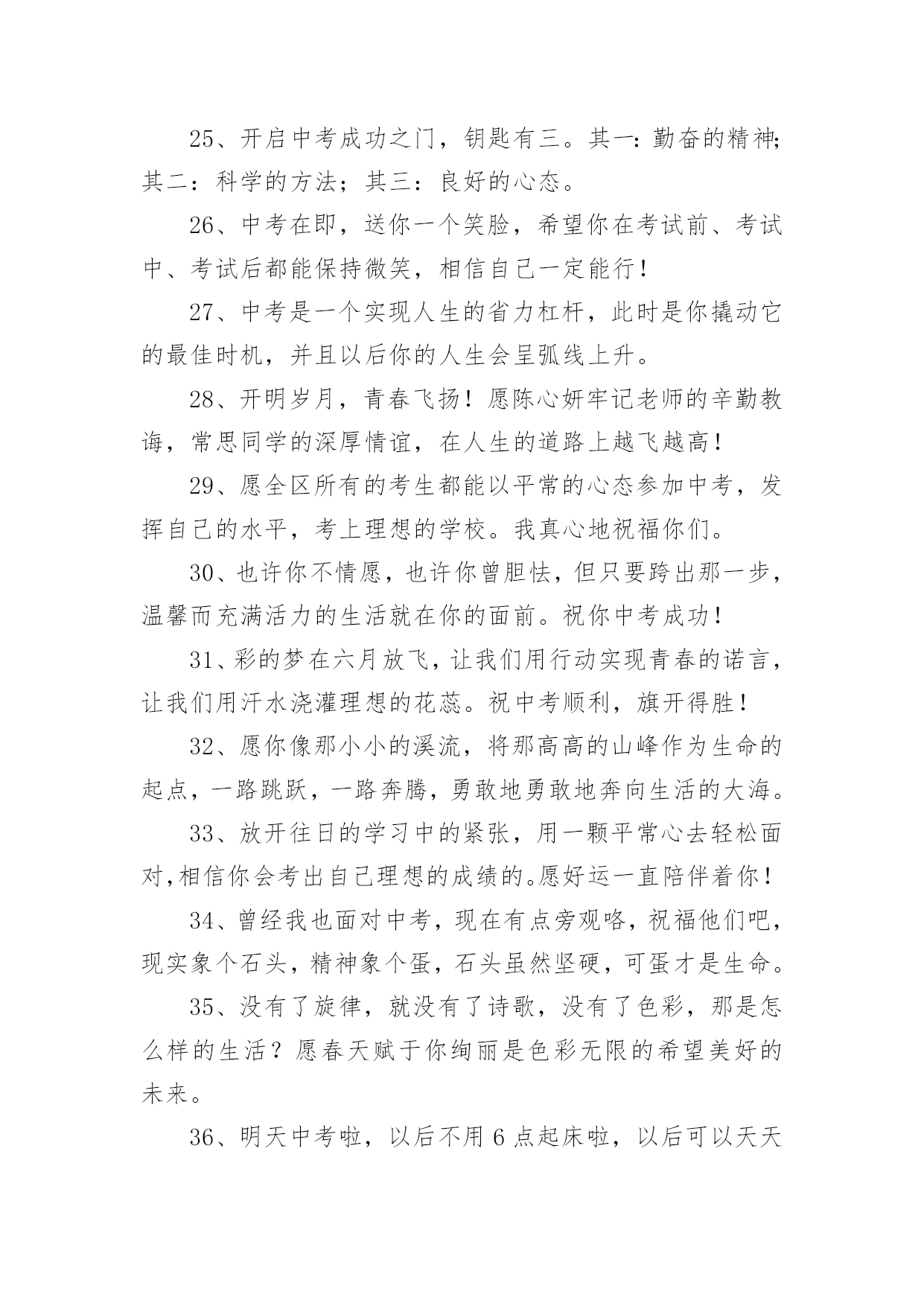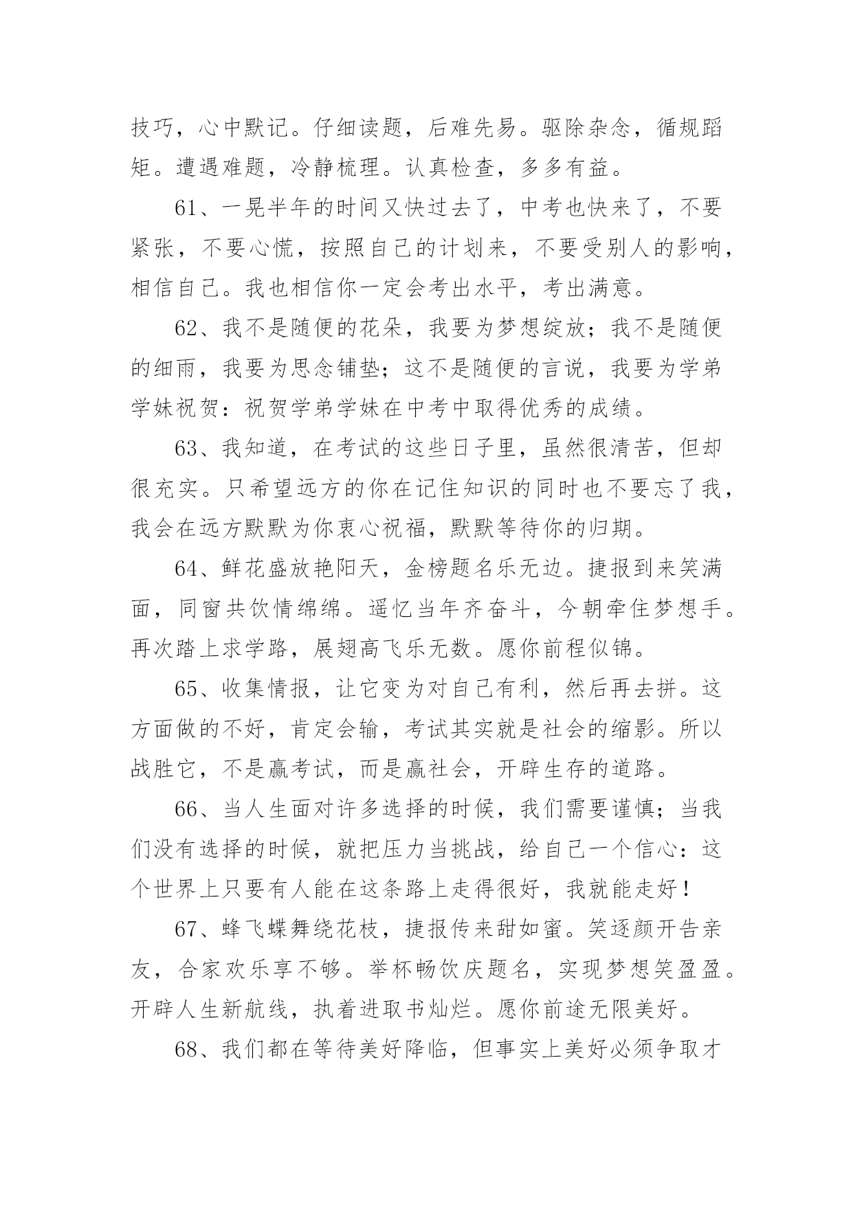 中考祝福语简短话中考祝福语简短一句话79句在平平淡淡的日常中,大家都经常接触到祝福语吧,祝福语可以起到可以增进情感,传达祝福的作用。那么,怎么去写祝福语呢?下面是小编整理的中考祝福语简短一句话79句,供大家参考借鉴,希望可以帮助到有需要的朋友。1、相信自己吧!坚持就是胜利!2、祝中考一切顺利成功!美梦成真!3、忘掉失败,不过要牢记失败中的教训。4、师生莫等闲,协力齐心,共同铸就新辉煌。5、终有一天,相约巅峰欢呼起舞!祝考试顺利!6、争取时间就是争取成功,提高效率就是提高分数。7、用心去工作,学习,就一定可以成为生活的强者。8、不要为成功而努力,要为做一个有价值的人而努力。9、分学识智,三心细耐恒,二成应试法,一片平常心。10、重要的不是发生了什么事,而是要做哪些事情来改善它!11、放下包袱开动脑筋,勤于思考好好复习,祝你取得好成绩!12、善待你的爱好,别让它们为学习让路,要让它们替学习服务。13、是对的。老天不负有心人嘛!通知书一定会飞到你的手上的!14、面临大考,心态要好;摆正身心,价值千金;只要努力,总有天地!15、天再热,热不过心;有信心,一切皆有可能。祝中考顺利,前程似锦。16、中考过后好好玩一把吧,用放纵的快乐把中考复习的那些功课统统忘掉!17、初三不再有,劝君珍惜之。一年之经历,终身之财富。加油,祝你成功!18、生命之中最快乐的是拼搏,而非成功,生命之中最痛苦的是懒散,而非失败。19、你所浪费的今天或许就是我们用什么都换不来的过往,珍惜,加油,别留下遗憾。20、你笔下拥有一个色彩绚丽的世界:愿你,也相信你,拥有另一个笔下灿烂的图景。21、中考的意义是在于你真正投入的过程。请务必坚持信念,守得云开见月明!祝你们成功!22、成功的人是可能做出正确决议,并勇敢去尝试,不怕任何难题,为自己的幻想奋斗的人。23、我的各位同伴。最后的一个月。一起收获最后的努力,不管学习还是友情,终将是回忆!24、就要考试了,放开往日学习中的紧张,用一颗平常心轻松面对,相信你会考出理想的成绩。25、开启中考成功之门,钥匙有三。其一:勤奋的精神;其二:科学的方法;其三:良好的心态。26、中考在即,送你一个笑脸,希望你在考试前、考试中、考试后都能保持微笑,相信自己一定能行!27、中考是一个实现人生的省力杠杆,此时是你撬动它的最佳时机,并且以后你的人生会呈弧线上升。28、开明岁月,青春飞扬!愿陈心妍牢记老师的辛勤教诲,常思同学的深厚情谊,在人生的道路上越飞越高!29、愿全区所有的考生都能以平常的心态参加中考,发挥自己的水平,考上理想的学校。我真心地祝福你们。30、也许你不情愿,也许你曾胆怯,但只要跨出那一步,温馨而充满活力的生活就在你的面前。祝你中考成功!31、彩的梦在六月放飞,让我们用行动实现青春的诺言,让我们用汗水浇灌理想的花蕊。祝中考顺利,旗开得胜!32、愿你像那小小的溪流,将那高高的山峰作为生命的起点,一路跳跃,一路奔腾,勇敢地勇敢地奔向生活的大海。33、放开往日的学习中的紧张,用一颗平常心去轻松面对,相信你会考出自己理想的成绩的。愿好运一直陪伴着你!34、曾经我也面对中考,现在有点旁观咯,祝福他们吧,现实象个石头,精神象个蛋,石头虽然坚硬,可蛋才是生命。35、没有了旋律,就没有了诗歌,没有了色彩,那是怎么样的生活?愿春天赋于你绚丽是色彩无限的希望美好的未来。36、明天中考啦,以后不用6点起床啦,以后可以天天游泳啦,明天是新生活的开始,一定不能愁眉苦脸,今晚做个好梦!37、相信自己就好了,没什么大不了的,真的,不用想太多,会什么做什么,你不会的他们肯定会的也不多,相信我没错!38、还有不多的时间就中考了,好好加油吧,记住你们是最棒的。为了自己的未来而奋斗吧!理想的大门正在向你们敞开!39、这么天都坚持下来了,只剩下最后的两个星期了,继续加油,相信你一定会成功的,顺利考入理想,胜利永远属于你!40、如果你想得到甜蜜,就将自己变成工蜂,到花芯中去采撷,如果你想变得聪慧,就将自己变成一尾鱼,遨游于书的海洋。41、为你的付出加油,为你的执着喝彩,为你的努力鼓掌,为你的明天祝福,祝你早日实现心中所想,祝你拥有最美好的未来!42、在即将中考的最后几天里,愿尽最大的可能,在远方倾诉我的祝福,相信自己的梦想与汗水,成功与好运相伴,中考大捷!43、世上最快乐的事是什么?是尽自己的全力做事——不管成功与否,它都值得回味,因为有一张叫“用心”的保鲜膜在帮它哦!44、我坚信,我们付出了汗水,经受了考验,理想中高中殿堂的大门就一定会为我们而敞开,让我们继续艰辛却快乐的求学之路!45、一直告诉自己尽人事,听天命,但旅程中总有遗憾的花朵,它弄伤我的手但弄不伤我的心,我的明天,我会坚强走下去,走下去。46、你还好吧,你远方的老同学真心的祝福你在今年的中考之中金榜题名,一