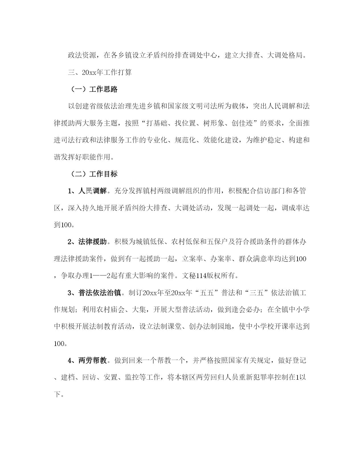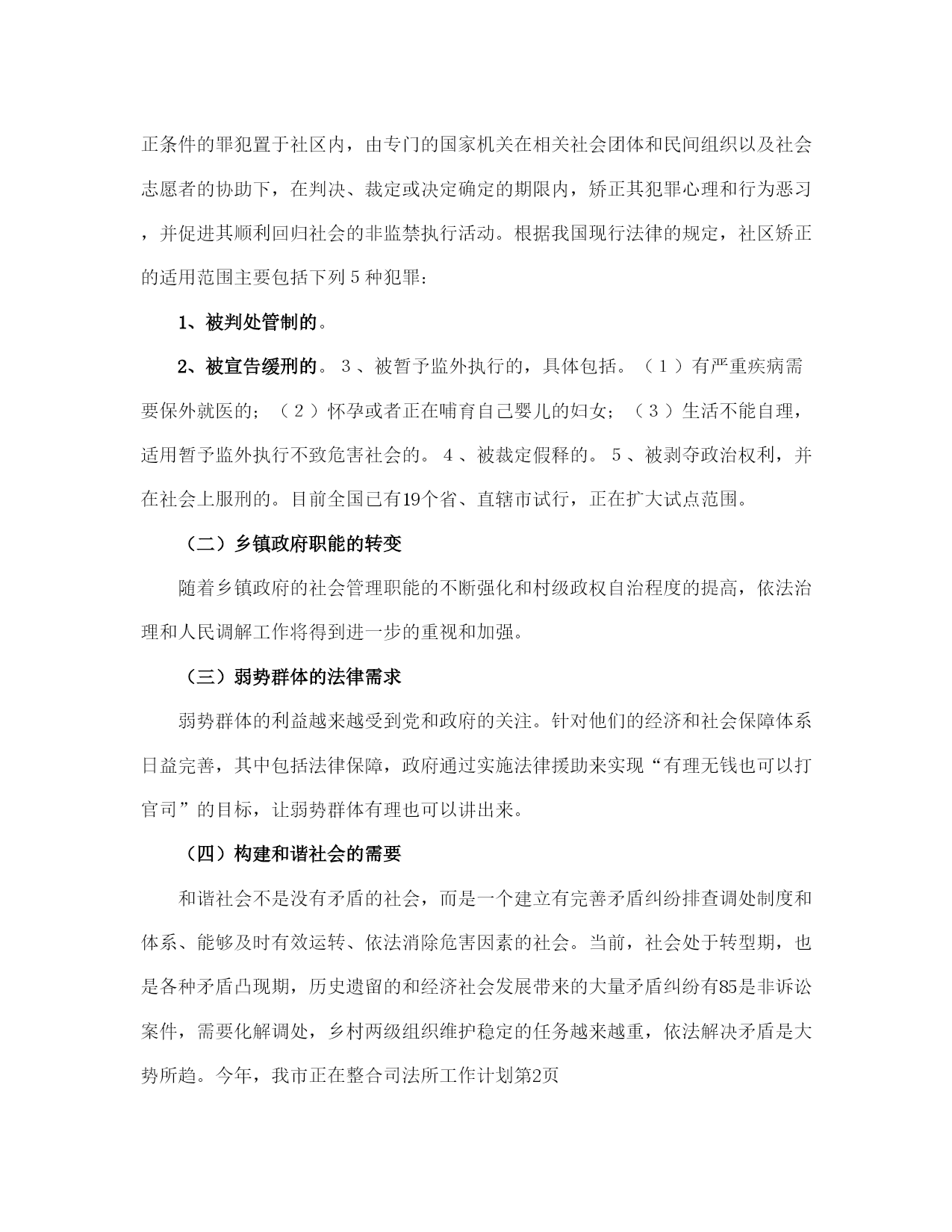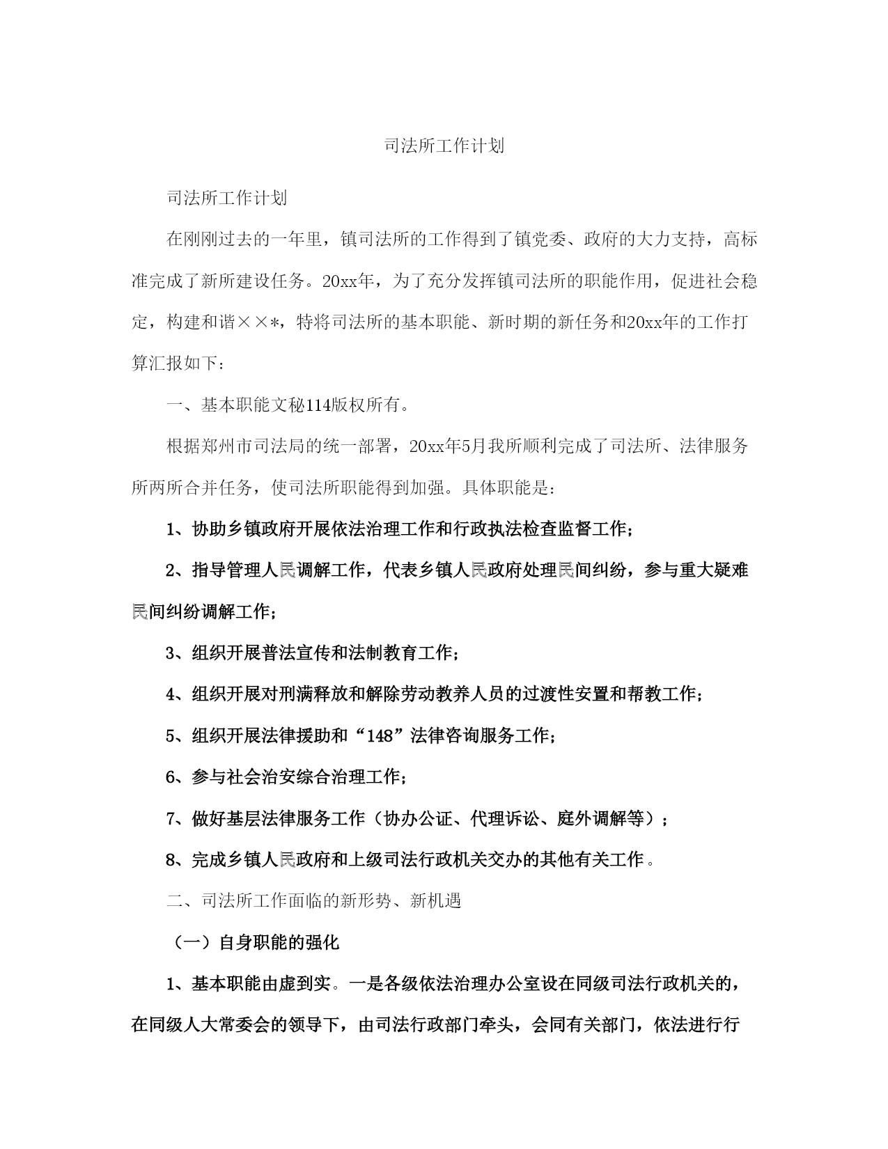 司法所工作计划(完整版)文档资料可直接使用,可编辑,欢迎下载司法所工作计划司法所工作计划在刚刚过去的一年里,镇司法所的工作得到了镇党委、政府的大力支持,高标准完成了新所建设任务。20xx年,为了充分发挥镇司法所的职能作用,促进社会稳定,构建和谐××*,特将司法所的基本职能、新时期的新任务和20xx年的工作打算汇报如下:一、基本职能文秘114版权所有。根据郑州市司法局的统一部署,20xx年5月我所顺利完成了司法所、法律服务所两所合并任务,使司法所职能得到加强。具体职能是:1、协助乡镇政府开展依法治理工作和行政执法检查监督工作;2、指导管理人民调解工作,代表乡镇人民政府处理民间纠纷,参与重大疑难民间纠纷调解工作;3、组织开展普法宣传和法制教育工作;4、组织开展对刑满释放和解除劳动教养人员的过渡性安置和帮教工作;5、组织开展法律援助和“148”法律咨询服务工作;6、参与社会治安综合治理工作;7、做好基层法律服务工作(协办公证、代理诉讼、庭外调解等);8、完成乡镇人民政府和上级司法行政机关交办的其他有关工作。二、司法所工作面临的新形势、新机遇(一)自身职能的强化1、基本职能由虚到实。一是各级依法治理办公室设在同级司法行政机关的,在同级人大常委会的领导下,由司法行政部门牵头,会同有关部门,依法进行行政执法检查监督。二是根据20xx年《最高人民法院、最高人民检察院、司法部关于加强新时期人民调解工作的若干意见》,乡镇人民调解委员会在当事双方自愿、调解的依据和程序合法的前提下形成的调解协议,效力优先。即:在调解协议签定生效后,当事人一方仍向人民法院提起诉讼的,法院不予受理或采信原协议,维持协议的效力优先权。三是根据20xx年11月生效的《最高人民法院、司法部关于人民法院实施法律援助政策的若干规定》,凡是法律援助中心(站)作出援助决定,指定的律师事务所或法律服务所必须为援助对象提供无偿的法律服务,人民法院必须无条件受理援助对象的诉讼请求,免收一切费用。2、职能下放和法定。主要指公证业务,基层司法所可以协助公证处办理公证业务。20xx年3月1日即将实施的《公证法》明确地将公证职能下放和法定化。所谓下放,一是指国家和省不再设立同级公证机构,只在设区的市和县设立,将公证职能下放。二是公证机构没有隶属关系,即在设区的市和县(区)设立的公证机构没有行政隶属关系,公证事项和效力同等。因此,在县(区)设立的公证机构权利扩充较大,可以办理涉外、国家招标等业务。所谓法定,一是即将实施的《公证法》一大特点是,将法律、行政法规规定应该办理公证的事项(如土地挂牌出让、政府采购、国家工程招投标等政府行为)由法人自愿变为法定(强制、必须)。二是公证书上载明有强制执行的条款,当事人可申请法院直接强制执行,而不必另行判决。(当然,若公证事项有误或不合法,由公证机关单独承担法律责任的除外)3、主要职能转移。是指司法所职能的发展。在我国中西部地区完成3年建设司法所的目标和完成修改民事诉讼法、刑事诉讼法的任务后,基层司法所的主要职能将转移为社区矫正。社区矫正是与监禁矫正相对的行刑方式,是指将符合社区矫正条件的罪犯置于社区内,由专门的国家机关在相关社会团体和民间组织以及社会志愿者的协助下,在判决、裁定或决定确定的期限内,矫正其犯罪心理和行为恶习,并促进其顺利回归社会的非监禁执行活动。根据我国现行法律的规定,社区矫正的适用范围主要包括下列5种犯罪:1、被判处管制的。2、被宣告缓刑的。3、被暂予监外执行的,具体包括。(1)有严重疾病需要保外就医的;(2)怀孕或者正在哺育自己婴儿的妇女;(3)生活不能自理,适用暂予监外执行不致危害社会的。4、被裁定假释的。5、被剥夺政治权利,并在社会上服刑的。目前全国已有19个省、直辖市试行,正在扩大试点范围。(二)乡镇政府职能的转变随着乡镇政府的社会管理职能的不断强化和村级政权自治程度的提高,依法治理和人民调解工作将得到进一步的重视和加强。(三)弱势群体的法律需求弱势群体的利益越来越受到党和政府的关注。针对他们的经济和社会保障体系日益完善,其中包括法律保障,政府通过实施法律援助来实现“有理无钱也可以打官司”的目标,让弱势群体有理也可以讲出来。(四)构建和谐社会的需要和谐社会不是没有矛盾的社会,而是一个建立有完善矛盾纠纷排查调处制度和体系、能够及时有效运转、依法消除危害因素的社会。当前,社会处于转型期,也是各种矛盾凸现期,历史遗留的和经济社会发展带来的大量矛盾纠纷有85是非诉讼案件,需要化解调处,乡村两级组织维护稳定的任务越来越重,依法解决矛盾是大势所趋。今年,我市正在整合司法所工作计划政法资源,在各乡镇设立矛盾纠纷排查调处中心,建立大排查、大调处格局。三、20xx年工作打算(一)工作思路以创建
