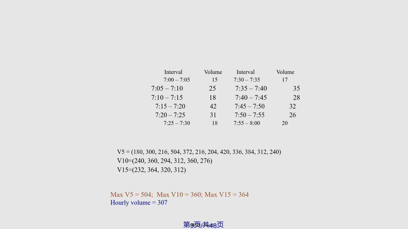 1.VolumeSomeusefulvolumes//Dailyvariationfactor(DF)---isdefinedasratioofAADToveryearlyaveragevolumeforparticulardayofweek(Monday,Tuesdayetc.)Monthlyvariationfactor(MF)---isdefinedasratioofAADToverADTforparticularmonthoftheyearHourlyvolumesandpeakhourvolume(小时流量(liúliàng),高峰小时流量(liúliàng))Hourlyvolumesareusedtoreflectvariation(fluctuation)oftrafficvolumeinadayPeakhourvolumeisdefinedasthevolumeinthesinglehourthathasthehighesthourlyvolumeRateofflow(流率)---definedasanequivalenthourlyvolumeforagiveninterval(intervalcanbe5,10,15minutes)usedindesigntoreflecttheworstscenariousedinmodelingmathematicalrelationshipamongparametersinresearchgenerallytheshortertheintervalthehighertherateofflowIntervalVolumeIntervalVolume7:00–7:05157:30–7:35177:05–7:10257:35–7:40357:10–7:15187:40–7:45287:15–7:20427:45–7:50327:20–7:25317:50–7:55267:25–7:30187:55–8:0020Peakhourfactor(高峰小时(xiǎoshí)系数)---isdefinedastheratioofhourlyvolumedividedbymaximumrateofflowThe30thhourlyvolume(第30位小时(xiǎoshí)交通量)---definedasanhourlyvolumeatwhichitsrankingonyearly-countingcurvecounts30thamong8760hourlyvolumesinayearDDHV(DirectionalDesignHourlyVolume设计小时(xiǎoshí)流量)---DDHV=AADTⅹKⅹDwhere:Kisproportionofdailytrafficoccurringduringthepeakhour,expressedasadecimal;Disproportionofpeak-hourtraffictravelinginthepeakdirection,expressedasadecimalD=ratioofdesignhourvolumeinthemajordirectiontothetotal(方向性系数(xìshù))/VMT(VehicleMilesTraveled=车英里(yīnglǐ))orVKT(VehicleKilometersTraveled车公里)---definedasaproductofnumberofvehiclesandmiles(orkilometer)traveledbythesevehiclesPCEandPCU(小汽车当量(dāngliàng))---definedasthenumberofpassengercarsdisplacedbyonetruck,bus,orRVinagiventrafficstreamTrafficintensitycanbeusedascriteriontodeterminepassengercarequivalent2.SpeedTMSisapointmeasure,whileSMSisameasurerelatingtoalengthofhighwayorlaneSMSisoftenusedintrafficflowtheorystudyatmacroscopiclevelwhileTMSisusedforengineeringstudyTMS≥SMSAveragetravelspeedandaveragerunningspeed(平均(píngjūn)行程,行驶速度)---Averagetravelspeed=distance/traveltime