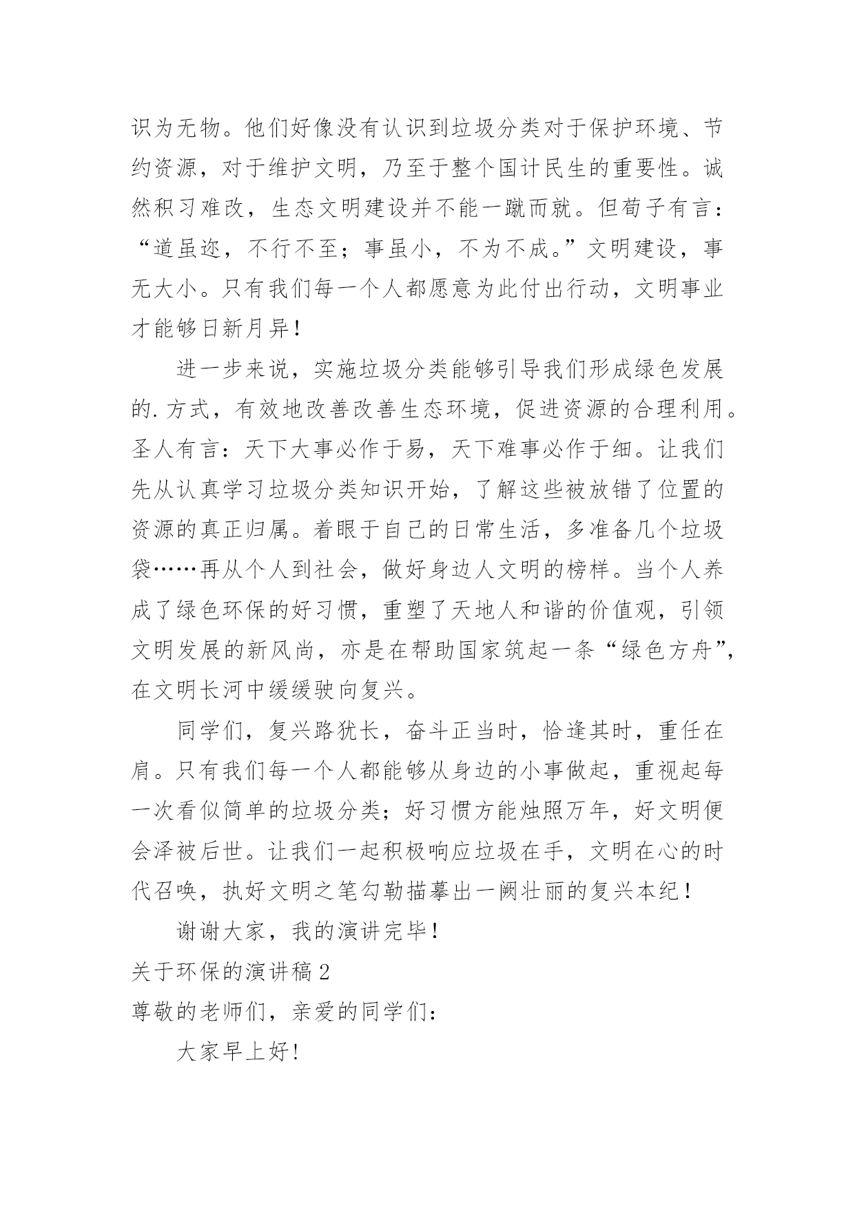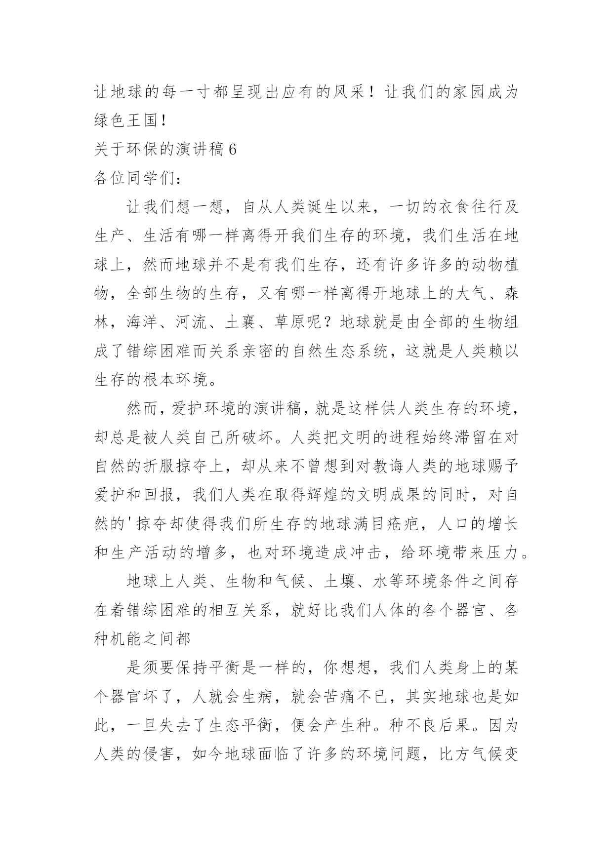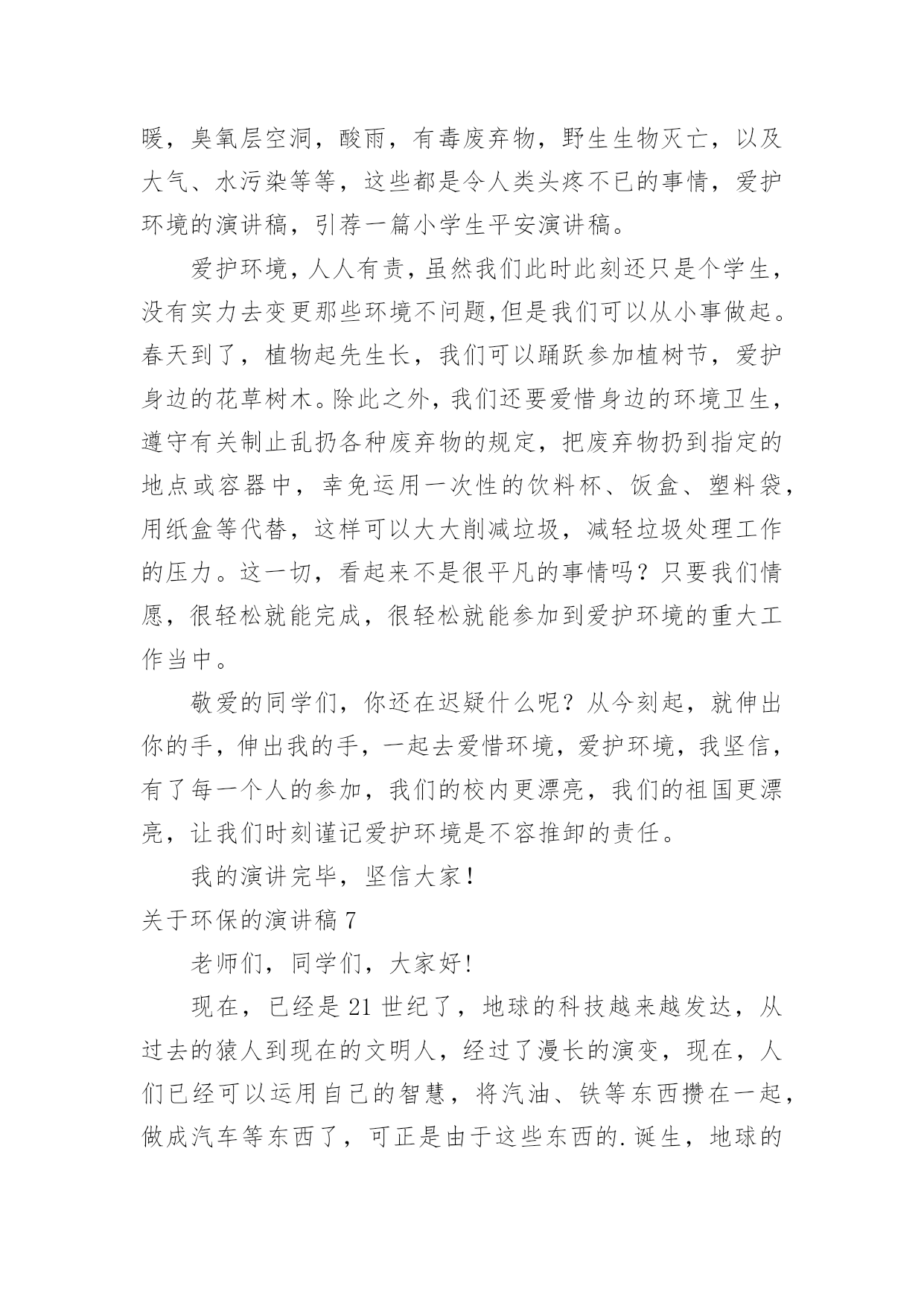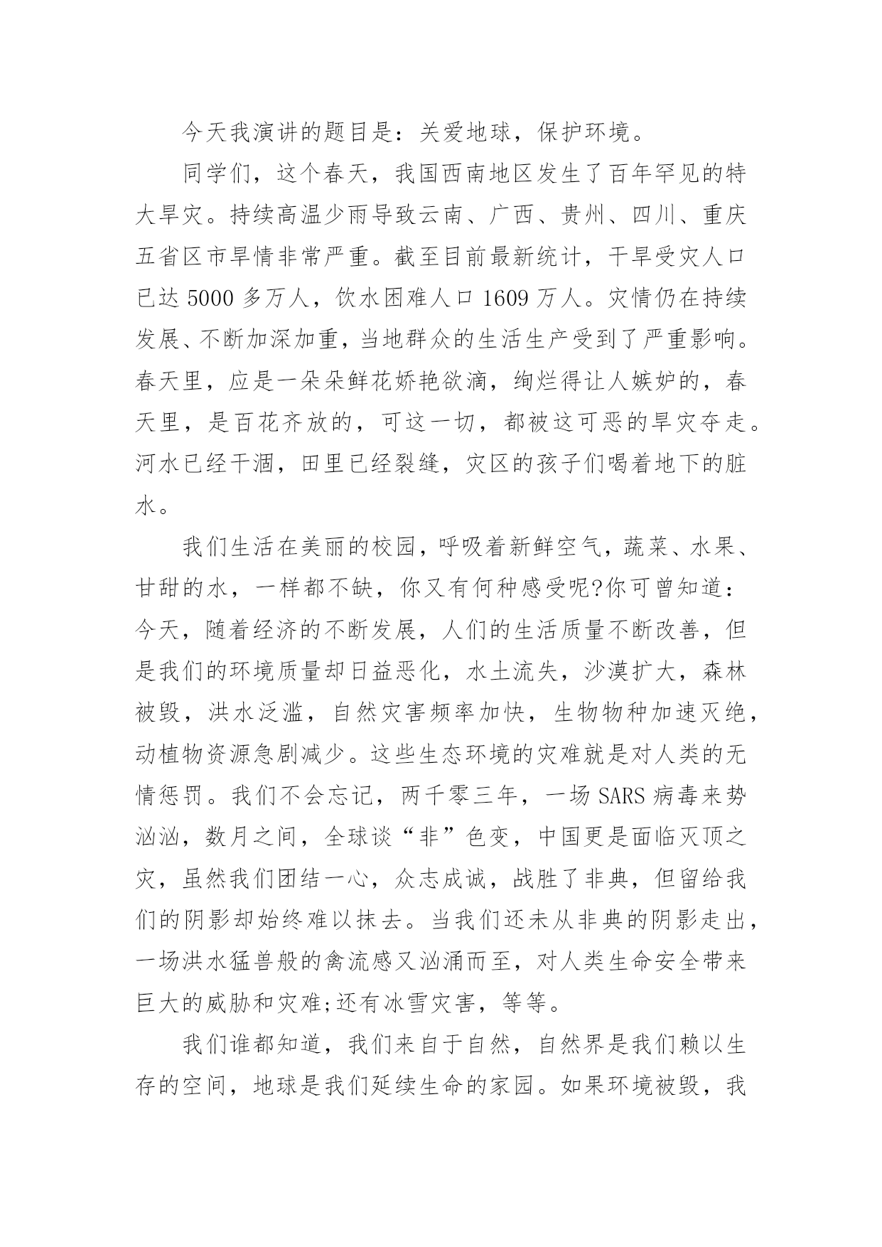 环保的演讲稿关于环保的演讲稿演讲稿要求内容充实,条理清楚,重点突出。在生活中,越来越多人会去使用演讲稿,怎么写演讲稿才能避免踩雷呢?以下是小编精心整理的关于环保的演讲稿,希望对大家有所帮助。关于环保的演讲稿1敬爱的老师,亲爱的同学们:大家好!今天我演讲的题目是垃圾分类显文明,文明助力成复兴。近日以来,上海与深圳相继通过的垃圾分类管理法令都在提醒着我们垃圾分类的重要性。而正是因为垃圾分类将民生与文明相联结,我们才不容懈怠。有些同学却没能够认清楚垃圾分类的本质,不明白现下如此强调分类是为何。近年以来,因为我国经济的不断发展,物质消费水平的稳步提高,在消费社会下,享乐主义与普遍的自我放纵也应运而生,垃圾量便在急剧增长。在造成资源浪费的同时,也使得环境生态问题日益突出。为了令我们所立足的家园变得更加美好,使我们的生活习惯更加文明,垃圾分类要求的提出,在当下便显得格外重要。有些同学却不以为然,仍然我行我素,视垃圾分类的标识为无物。他们好像没有认识到垃圾分类对于保护环境、节约资源,对于维护文明,乃至于整个国计民生的重要性。诚然积习难改,生态文明建设并不能一蹴而就。但荀子有言:“道虽迩,不行不至;事虽小,不为不成。”文明建设,事无大小。只有我们每一个人都愿意为此付出行动,文明事业才能够日新月异!进一步来说,实施垃圾分类能够引导我们形成绿色发展的.方式,有效地改善改善生态环境,促进资源的合理利用。圣人有言:天下大事必作于易,天下难事必作于细。让我们先从认真学习垃圾分类知识开始,了解这些被放错了位置的资源的真正归属。着眼于自己的日常生活,多准备几个垃圾袋……再从个人到社会,做好身边人文明的榜样。当个人养成了绿色环保的好习惯,重塑了天地人和谐的价值观,引领文明发展的新风尚,亦是在帮助国家筑起一条“绿色方舟”,在文明长河中缓缓驶向复兴。同学们,复兴路犹长,奋斗正当时,恰逢其时,重任在肩。只有我们每一个人都能够从身边的小事做起,重视起每一次看似简单的垃圾分类;好习惯方能烛照万年,好文明便会泽被后世。让我们一起积极响应垃圾在手,文明在心的时代召唤,执好文明之笔勾勒描摹出一阙壮丽的复兴本纪!谢谢大家,我的演讲完毕!关于环保的演讲稿2尊敬的老师们,亲爱的同学们:大家早上好!今天我演讲的题目是:关爱地球,保护环境。同学们,这个春天,我国西南地区发生了百年罕见的特大旱灾。持续高温少雨导致云南、广西、贵州、四川、重庆五省区市旱情非常严重。截至目前最新统计,干旱受灾人口已达5000多万人,饮水困难人口1609万人。灾情仍在持续发展、不断加深加重,当地群众的生活生产受到了严重影响。春天里,应是一朵朵鲜花娇艳欲滴,绚烂得让人嫉妒的,春天里,是百花齐放的,可这一切,都被这可恶的旱灾夺走。河水已经干涸,田里已经裂缝,灾区的孩子们喝着地下的脏水。我们生活在美丽的校园,呼吸着新鲜空气,蔬菜、水果、甘甜的水,一样都不缺,你又有何种感受呢?你可曾知道:今天,随着经济的不断发展,人们的生活质量不断改善,但是我们的环境质量却日益恶化,水土流失,沙漠扩大,森林被毁,洪水泛滥,自然灾害频率加快,生物物种加速灭绝,动植物资源急剧减少。这些生态环境的灾难就是对人类的无情惩罚。我们不会忘记,两千零三年,一场SARS病毒来势汹汹,数月之间,全球谈“非”色变,中国更是面临灭顶之灾,虽然我们团结一心,众志成诚,战胜了非典,但留给我们的阴影却始终难以抹去。当我们还未从非典的阴影走出,一场洪水猛兽般的禽流感又汹涌而至,对人类生命安全带来巨大的威胁和灾难;还有冰雪灾害,等等。我们谁都知道,我们来自于自然,自然界是我们赖以生存的空间,地球是我们延续生命的家园。如果环境被毁,我们将栖身何处?那时就是世界末日的真正到来,而造成这末日到来的是谁呢?就是我们人类自己。因此,环境保护很重要,它关系着全世界每一个地球人的生死存亡。环境保护是跨世纪的奋斗目标;是一项崇高、“积德”的事业,是中华民族千秋万代的利益所在,重任在肩,时不我待。从现在起,我们要用十分认真、十分严肃的态度,接受“环境忧患”的教育,我们向世人呼吁:“我们不再需要任何奢侈的'东西,我们更需要蓝天,更需要净水,更需要无毒的空气和青翠的草木!”我们不仅要接受宏观意识的教育,更要从小事做起,从身边做起。第一,爱护环境卫生,不随地吐痰,不乱丢杂物,不乱涂墙壁,维护环境整洁。第二,不在楼道、教室和公共场所大声喧哗喊叫,以杜绝或减少噪音污染,创造一个安祥、宁静的优美环境,做维护安宁的义务。第三,爱护花草树木和文物古迹,做到不攀摘、不刻划。第四:节约用水,节约用电,保护资源。同学们,生态灾害就在我们身边,它敲响了环保的警钟。环境保护,人人有责。只有我们人人为环保做好事,这座城市才会更美丽,祖国才会更美丽。地球才有希望,人类才有希望。我的演讲完毕。谢谢大家。关于环