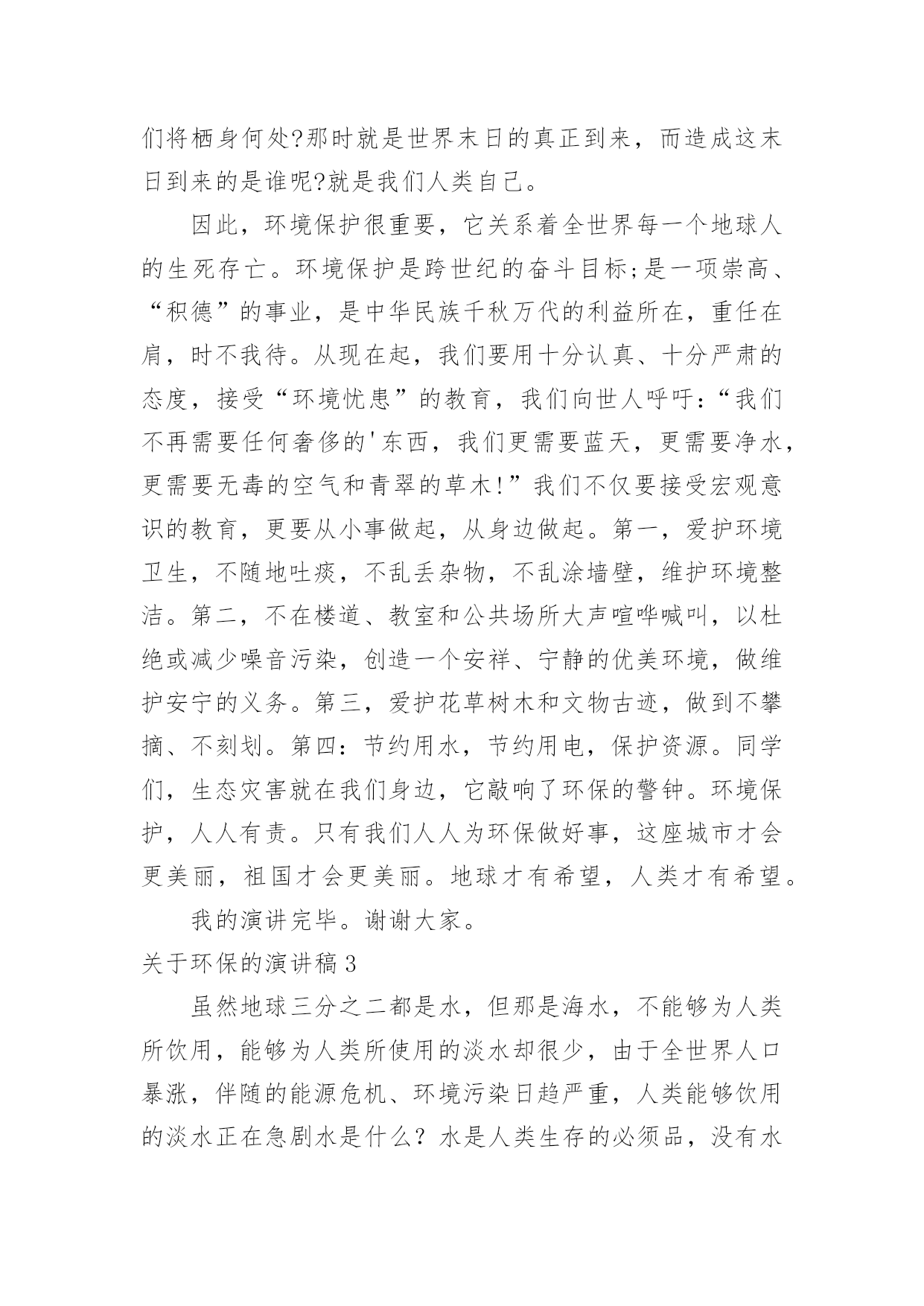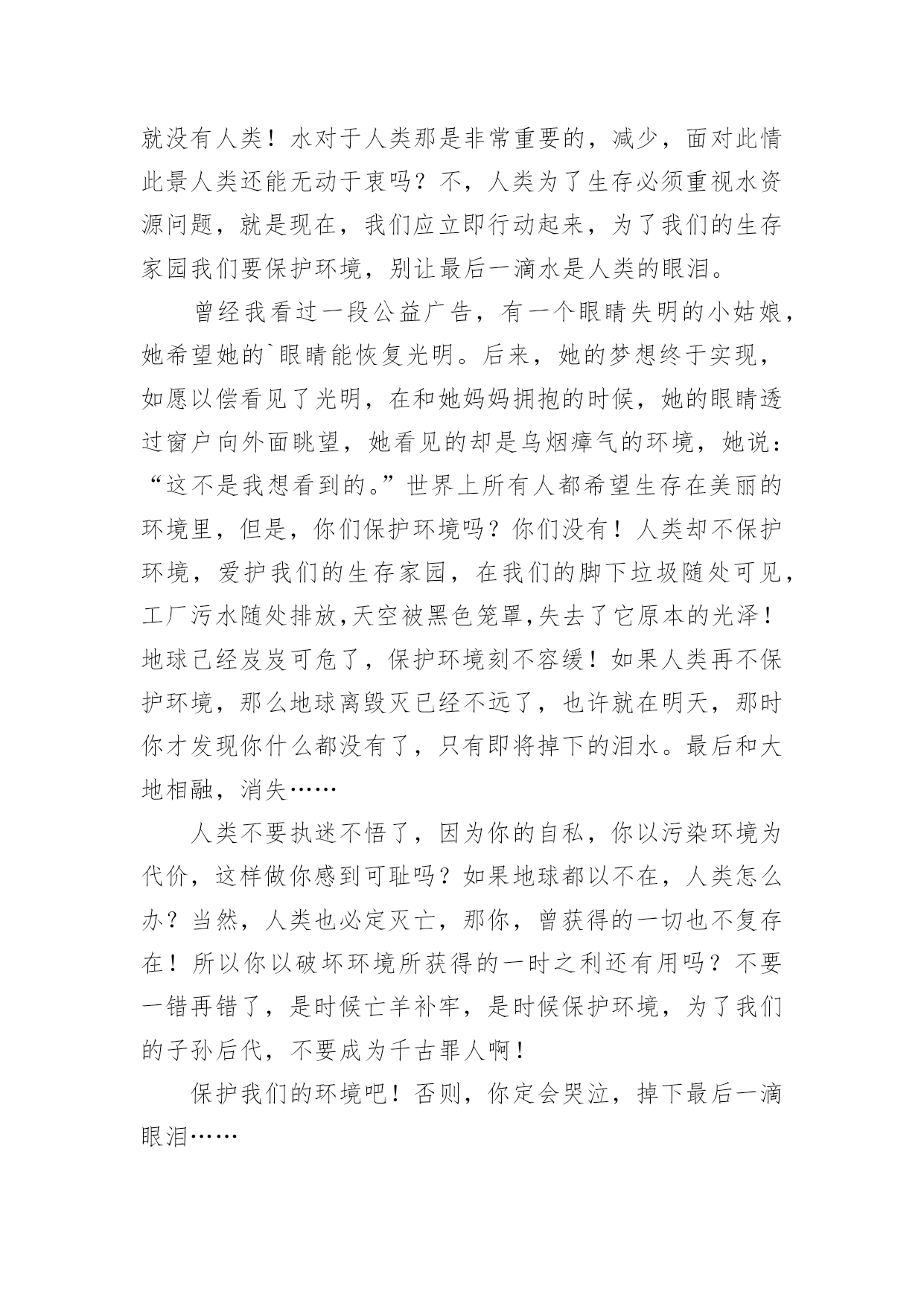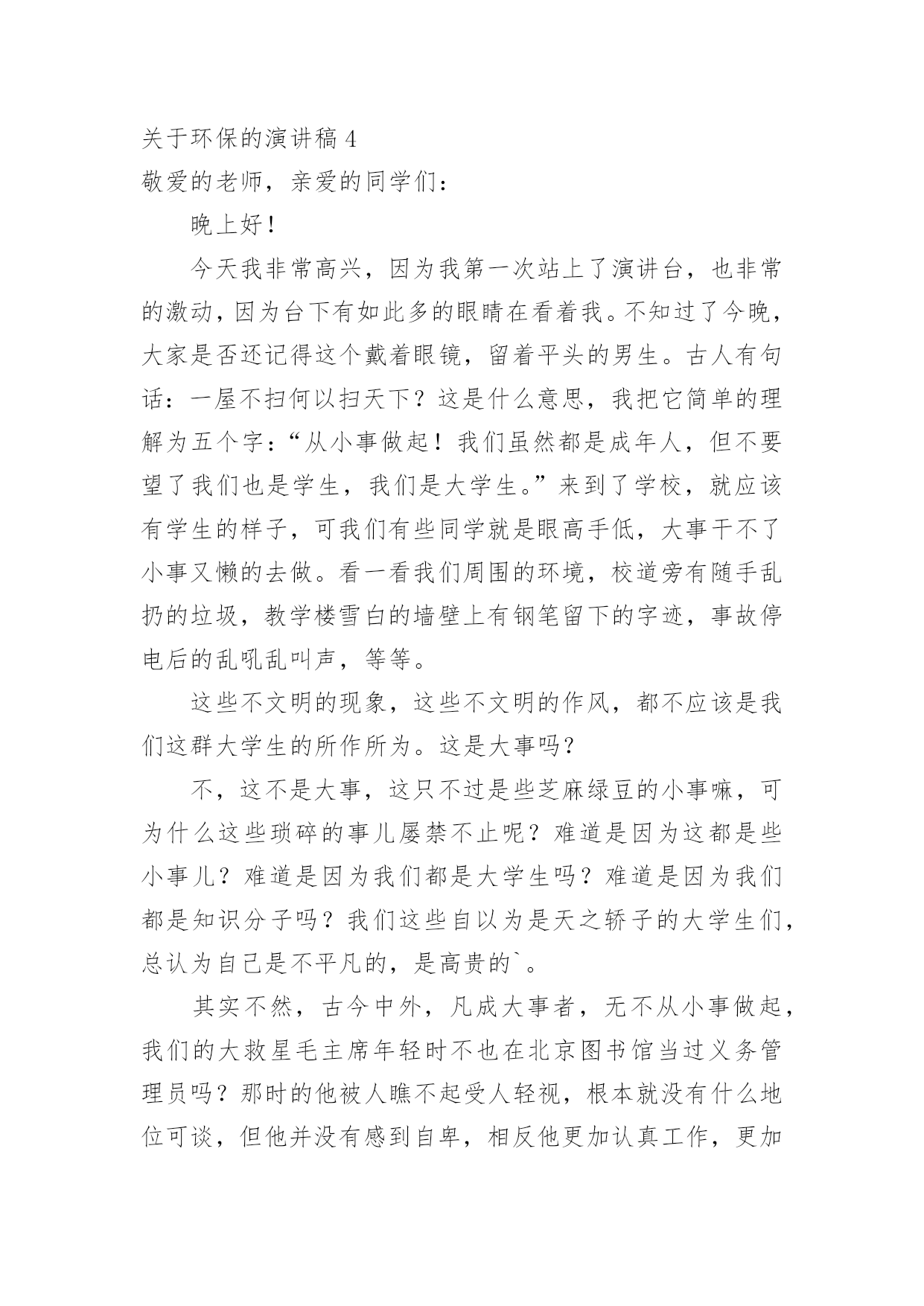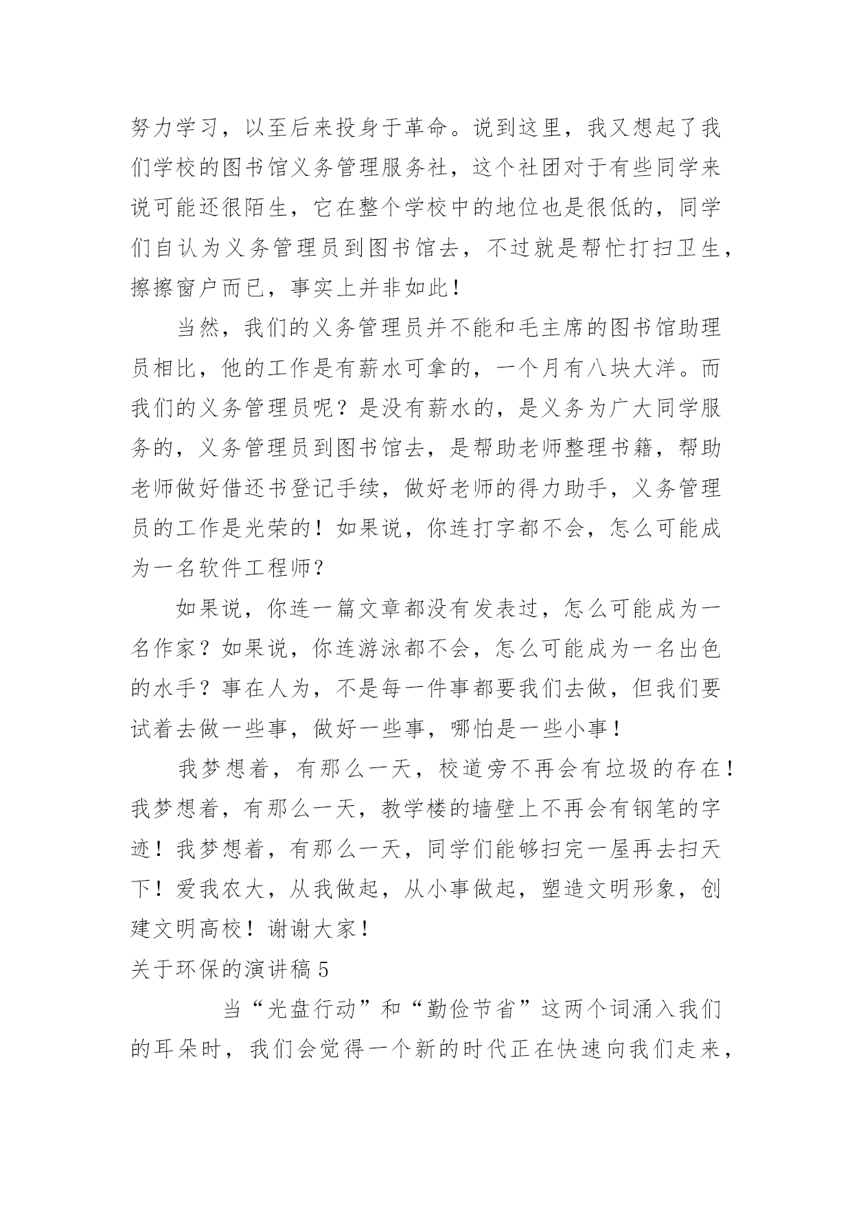 环保的演讲稿关于环保的演讲稿演讲稿要求内容充实,条理清楚,重点突出。在生活中,越来越多人会去使用演讲稿,怎么写演讲稿才能避免踩雷呢?以下是小编精心整理的关于环保的演讲稿,希望对大家有所帮助。关于环保的演讲稿1敬爱的老师,亲爱的同学们:大家好!今天我演讲的题目是垃圾分类显文明,文明助力成复兴。近日以来,上海与深圳相继通过的垃圾分类管理法令都在提醒着我们垃圾分类的重要性。而正是因为垃圾分类将民生与文明相联结,我们才不容懈怠。有些同学却没能够认清楚垃圾分类的本质,不明白现下如此强调分类是为何。近年以来,因为我国经济的不断发展,物质消费水平的稳步提高,在消费社会下,享乐主义与普遍的自我放纵也应运而生,垃圾量便在急剧增长。在造成资源浪费的同时,也使得环境生态问题日益突出。为了令我们所立足的家园变得更加美好,使我们的生活习惯更加文明,垃圾分类要求的提出,在当下便显得格外重要。有些同学却不以为然,仍然我行我素,视垃圾分类的标识为无物。他们好像没有认识到垃圾分类对于保护环境、节约资源,对于维护文明,乃至于整个国计民生的重要性。诚然积习难改,生态文明建设并不能一蹴而就。但荀子有言:“道虽迩,不行不至;事虽小,不为不成。”文明建设,事无大小。只有我们每一个人都愿意为此付出行动,文明事业才能够日新月异!进一步来说,实施垃圾分类能够引导我们形成绿色发展的.方式,有效地改善改善生态环境,促进资源的合理利用。圣人有言:天下大事必作于易,天下难事必作于细。让我们先从认真学习垃圾分类知识开始,了解这些被放错了位置的资源的真正归属。着眼于自己的日常生活,多准备几个垃圾袋……再从个人到社会,做好身边人文明的榜样。当个人养成了绿色环保的好习惯,重塑了天地人和谐的价值观,引领文明发展的新风尚,亦是在帮助国家筑起一条“绿色方舟”,在文明长河中缓缓驶向复兴。同学们,复兴路犹长,奋斗正当时,恰逢其时,重任在肩。只有我们每一个人都能够从身边的小事做起,重视起每一次看似简单的垃圾分类;好习惯方能烛照万年,好文明便会泽被后世。让我们一起积极响应垃圾在手,文明在心的时代召唤,执好文明之笔勾勒描摹出一阙壮丽的复兴本纪!谢谢大家,我的演讲完毕!关于环保的演讲稿2尊敬的老师们,亲爱的同学们:大家早上好!今天我演讲的题目是:关爱地球,保护环境。同学们,这个春天,我国西南地区发生了百年罕见的特大旱灾。持续高温少雨导致云南、广西、贵州、四川、重庆五省区市旱情非常严重。截至目前最新统计,干旱受灾人口已达5000多万人,饮水困难人口1609万人。灾情仍在持续发展、不断加深加重,当地群众的生活生产受到了严重影响。春天里,应是一朵朵鲜花娇艳欲滴,绚烂得让人嫉妒的,春天里,是百花齐放的,可这一切,都被这可恶的旱灾夺走。河水已经干涸,田里已经裂缝,灾区的孩子们喝着地下的脏水。我们生活在美丽的校园,呼吸着新鲜空气,蔬菜、水果、甘甜的水,一样都不缺,你又有何种感受呢?你可曾知道:今天,随着经济的不断发展,人们的生活质量不断改善,但是我们的环境质量却日益恶化,水土流失,沙漠扩大,森林被毁,洪水泛滥,自然灾害频率加快,生物物种加速灭绝,动植物资源急剧减少。这些生态环境的灾难就是对人类的无情惩罚。我们不会忘记,两千零三年,一场SARS病毒来势汹汹,数月之间,全球谈“非”色变,中国更是面临灭顶之灾,虽然我们团结一心,众志成诚,战胜了非典,但留给我们的阴影却始终难以抹去。当我们还未从非典的阴影走出,一场洪水猛兽般的禽流感又汹涌而至,对人类生命安全带来巨大的威胁和灾难;还有冰雪灾害,等等。我们谁都知道,我们来自于自然,自然界是我们赖以生存的空间,地球是我们延续生命的家园。如果环境被毁,我们将栖身何处?那时就是世界末日的真正到来,而造成这末日到来的是谁呢?就是我们人类自己。因此,环境保护很重要,它关系着全世界每一个地球人的生死存亡。环境保护是跨世纪的奋斗目标;是一项崇高、“积德”的事业,是中华民族千秋万代的利益所在,重任在肩,时不我待。从现在起,我们要用十分认真、十分严肃的态度,接受“环境忧患”的教育,我们向世人呼吁:“我们不再需要任何奢侈的'东西,我们更需要蓝天,更需要净水,更需要无毒的空气和青翠的草木!”我们不仅要接受宏观意识的教育,更要从小事做起,从身边做起。第一,爱护环境卫生,不随地吐痰,不乱丢杂物,不乱涂墙壁,维护环境整洁。第二,不在楼道、教室和公共场所大声喧哗喊叫,以杜绝或减少噪音污染,创造一个安祥、宁静的优美环境,做维护安宁的义务。第三,爱护花草树木和文物古迹,做到不攀摘、不刻划。第四:节约用水,节约用电,保护资源。同学们,生态灾害就在我们身边,它敲响了环保的警钟。环境保护,人人有责。只有我们人人为环保做好事,这座城市才会更美丽,祖国才会更美丽。地球才有希望,人类才有希望。我的演讲完毕。谢谢大家。关于环