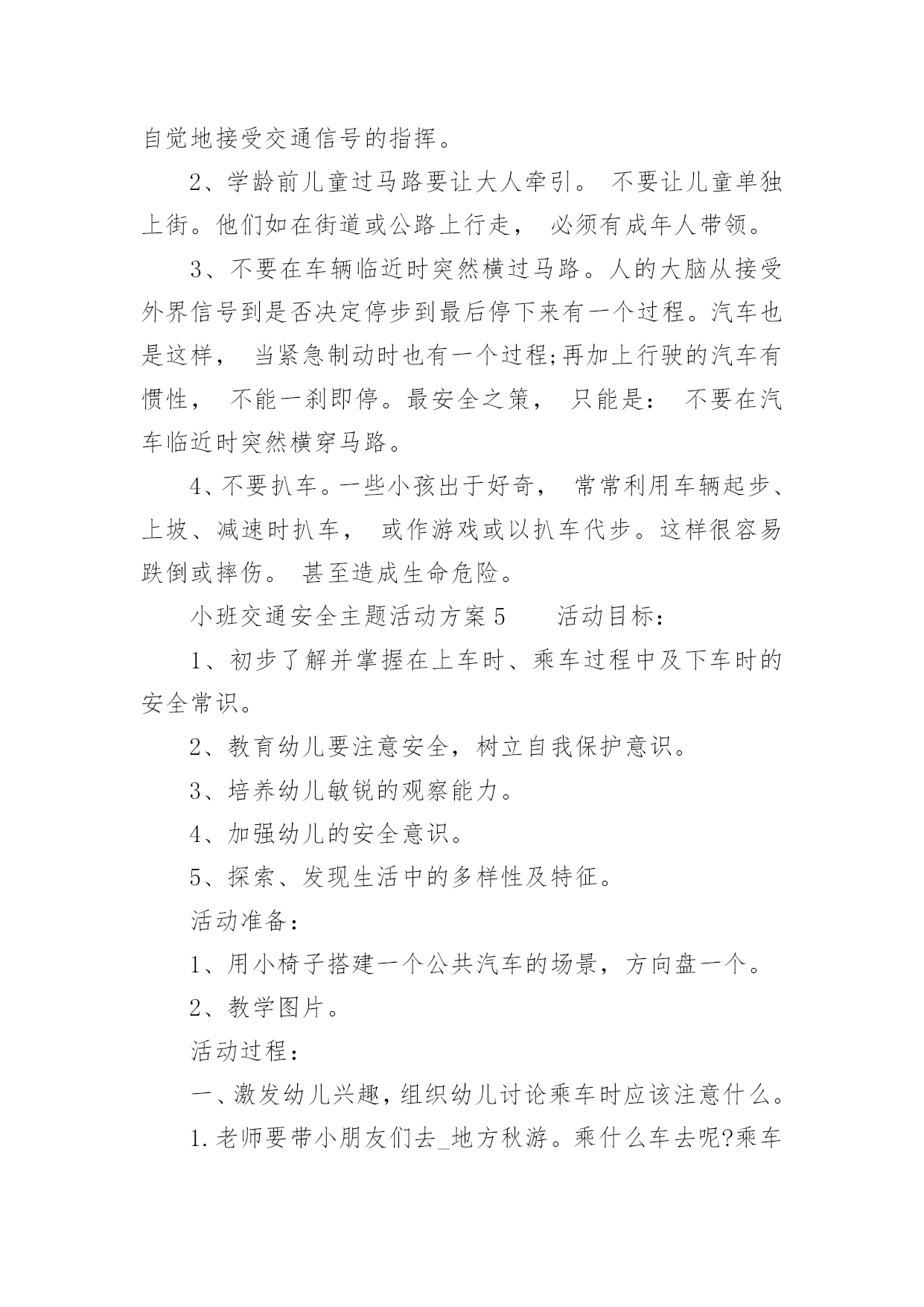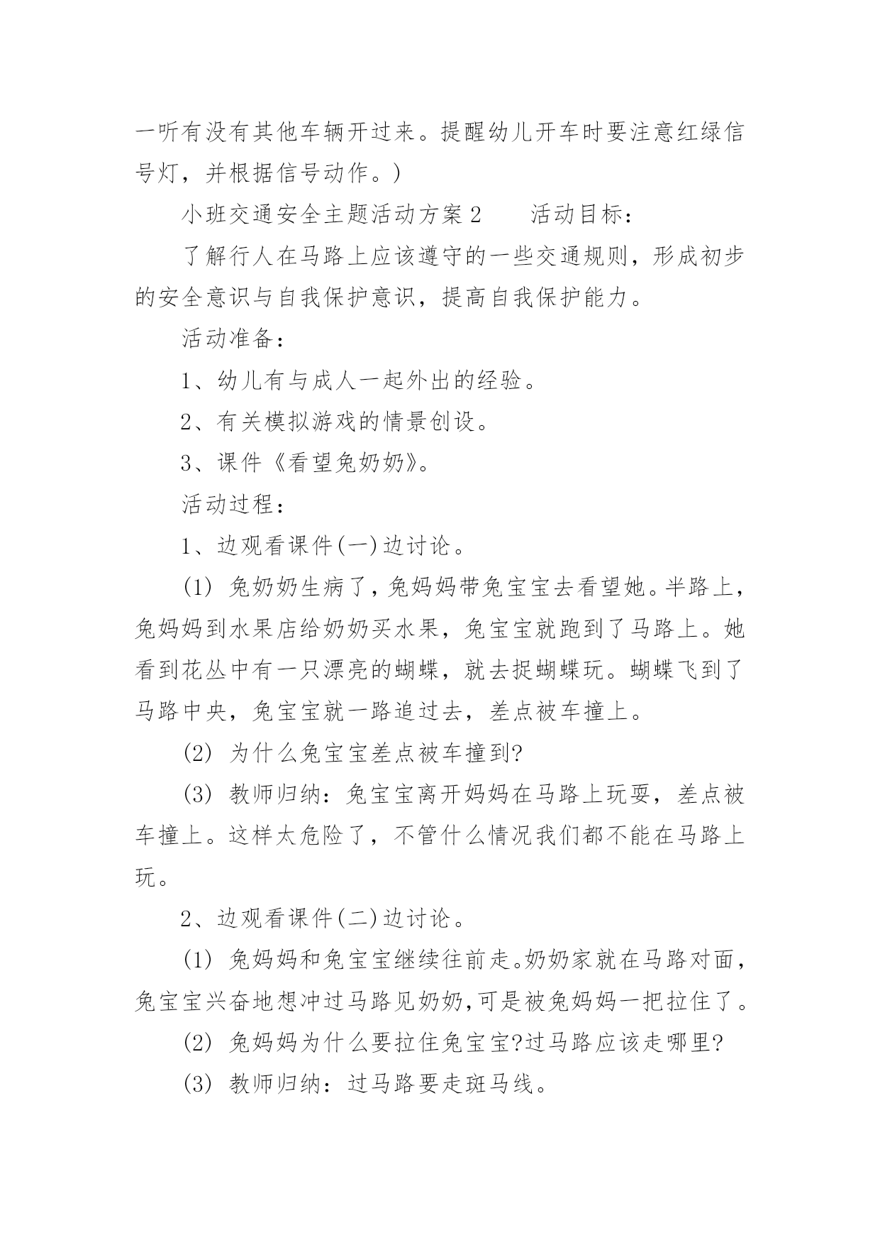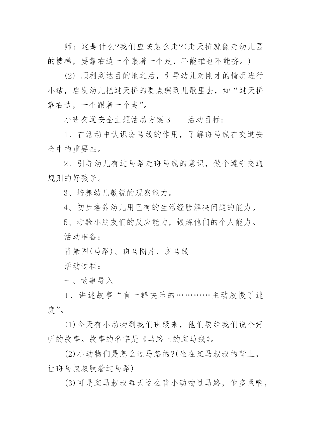 小班交通安全主题活动方案小班交通安全主题活动方案(精选5篇)为了确保活动顺利进行,就不得不需要事先制定活动方案,活动方案是整场活动的战略,可以为活动指明方向。那么优秀的活动方案是什么样的呢?以下是小编帮大家整理的小班交通安全主题活动方案(精选5篇),供大家参考借鉴,希望可以帮助到有需要的朋友。小班交通安全主题活动方案1活动目标:1、认识红、黄、绿色,了解基本的交通规则,知道遵守交通规则的重要性。2、通过参与情境游戏活动,理解红绿灯的作用。3、树立遵守社会公共规则的好品质,增强自我保护意识。4、培养幼儿敏锐的观察能力。5、遵守社会行为规则,不做“禁止”的事。活动准备:布置情境化场景,红绿信号灯。活动过程:一、观看儿歌《红绿灯》二、通过提问的方式,帮助幼儿了解红绿灯的作用。(1)教师:马路上有什么?有哪些颜色?红绿灯有什么用处。小朋友们,儿歌看完啦,老师现在有几个问题想问你们,在刚才的那段视频里呀你们看到的马路上都有什么?有那些颜色?你们觉得红绿灯都有什么用处呢?(2)教师:汽车在中间的快车道上行使,马路上的汽车是怎样过马路的?那你们看到刚才那些小汽车都是在哪儿行驶的么?小汽车又是怎样过马路的?发生了些什么?三、启发幼儿探讨马路上的交通规则。教师:自行车应该在什么道上行使?自行车应该怎样过马路?自行车该遵守哪些交通规则呢?小朋友们刚才观察的都很仔细,说的也很对。那老师还想问一问,在我们的生活当中自行车应该在什么道上行驶?自行车应该怎样过马路?自行车又应该遵守哪些交通规则?那行人呢?四、带幼儿到布置好的游戏情景中,配班教师装扮成交通警察,并做指挥交通状。教师:这是谁?他在做什么?他是在怎么站的?他是怎么指挥交通的?小朋友们,现在我们来看一看,站在马路中间的他是谁?他站在了哪里?他是怎么指挥交通的?好啦,小朋友们说的特别好,那老师就要奖励一下小朋友啦,老师请小朋友和老师一起来做个游戏。老师现在说一下游戏的玩法,我们先要穿过马路去停车场(走人行横道线,看红绿灯),到了停车场,每位小司机开一辆车。然后将你们的小汽车开回来。(开出停车场时提醒幼儿要看一看,听一听有没有其他车辆开过来。提醒幼儿开车时要注意红绿信号灯,并根据信号动作。)小班交通安全主题活动方案2活动目标:了解行人在马路上应该遵守的一些交通规则,形成初步的安全意识与自我保护意识,提高自我保护能力。活动准备:1、幼儿有与成人一起外出的经验。2、有关模拟游戏的情景创设。3、课件《看望兔奶奶》。活动过程:1、边观看课件(一)边讨论。(1)兔奶奶生病了,兔妈妈带兔宝宝去看望她。半路上,兔妈妈到水果店给奶奶买水果,兔宝宝就跑到了马路上。她看到花丛中有一只漂亮的蝴蝶,就去捉蝴蝶玩。蝴蝶飞到了马路中央,兔宝宝就一路追过去,差点被车撞上。(2)为什么兔宝宝差点被车撞到?(3)教师归纳:兔宝宝离开妈妈在马路上玩耍,差点被车撞上。这样太危险了,不管什么情况我们都不能在马路上玩。2、边观看课件(二)边讨论。(1)兔妈妈和兔宝宝继续往前走。奶奶家就在马路对面,兔宝宝兴奋地想冲过马路见奶奶,可是被兔妈妈一把拉住了。(2)兔妈妈为什么要拉住兔宝宝?过马路应该走哪里?(3)教师归纳:过马路要走斑马线。(4)十字路口有斑马线,行人是不是什么时候都可以走呢?什么时候可以走?(5)教师归纳:过十字路口要看红绿灯,红灯停,绿灯行。(6)兔妈妈和兔宝宝走到斑马线前,等绿灯亮时再穿过马路去奶奶家。3、小结:兔宝宝在路上遇到了一些危险,你们知道怎样才能避免那样的危险吗?(幼儿回答后,教师用自编儿歌进行归纳:小朋友,要牢记,走路要走人行道,路上玩耍不可以。过马路走斑马线,红灯停,绿灯行,确保安全是第一。)4、在情景模拟游戏“去春游”中或到马路上去实地体验。(1)带领幼儿一边走一边根据场景提问,巩固对交通规则的认识。场景一:人行道和车行道师:前面有两种道路,行人应该走哪一种路?(人行道。)师:行人应该注意什么?(靠右边走,不能边走边玩,特别是不能到车行道上玩。)场景二:十字路口师:要过马路了,我们应该怎么走?(找到斑马线,看清红绿灯,红灯停,绿灯行。)场景三:天桥师:这是什么?我们应该怎么走?(走天桥就像走幼儿园的楼梯,要靠右边一个跟着一个走,不能推也不能挤。)(2)顺利到达目的地之后,引导幼儿对刚才的情况进行小结,启发幼儿把过天桥的要点编到儿歌里去,如“过天桥靠右边,一个跟着一个走”。小班交通安全主题活动方案3活动目标:1、在活动中认识斑马线的作用,了解斑马线在交通安全中的重要性。2、引导幼儿有过马路走斑马线的意识,做个遵守交通规则的好孩子。3、培养幼儿敏锐的观察能力。4、初步培养幼儿用已有的生活经验解决问题的能力。5、考验小朋友们的反应能力,锻炼他们的个人能力。活动准备:背景图(马路)、斑马图片、斑马线活动过程:一、故