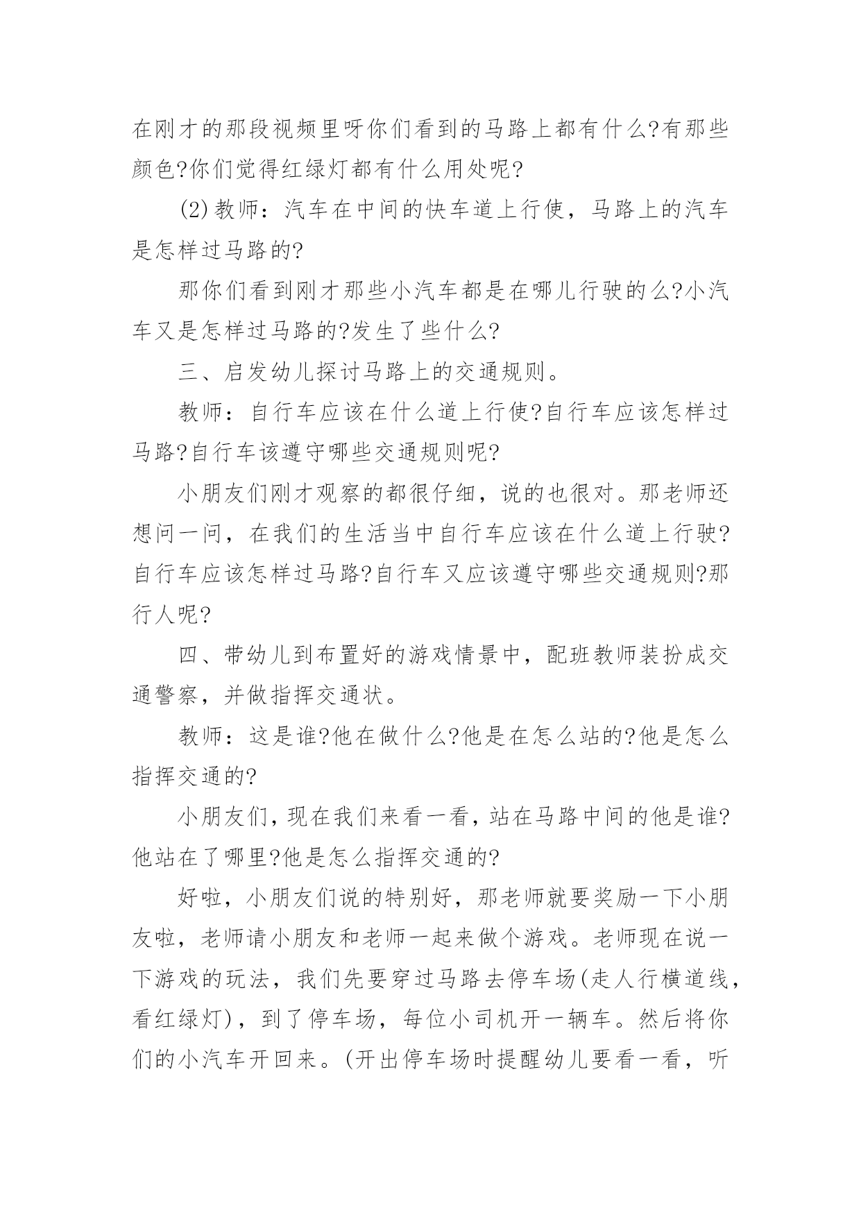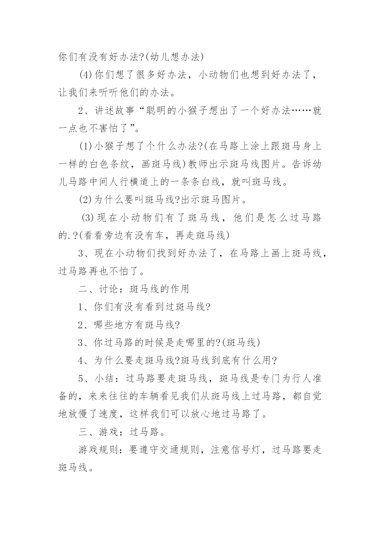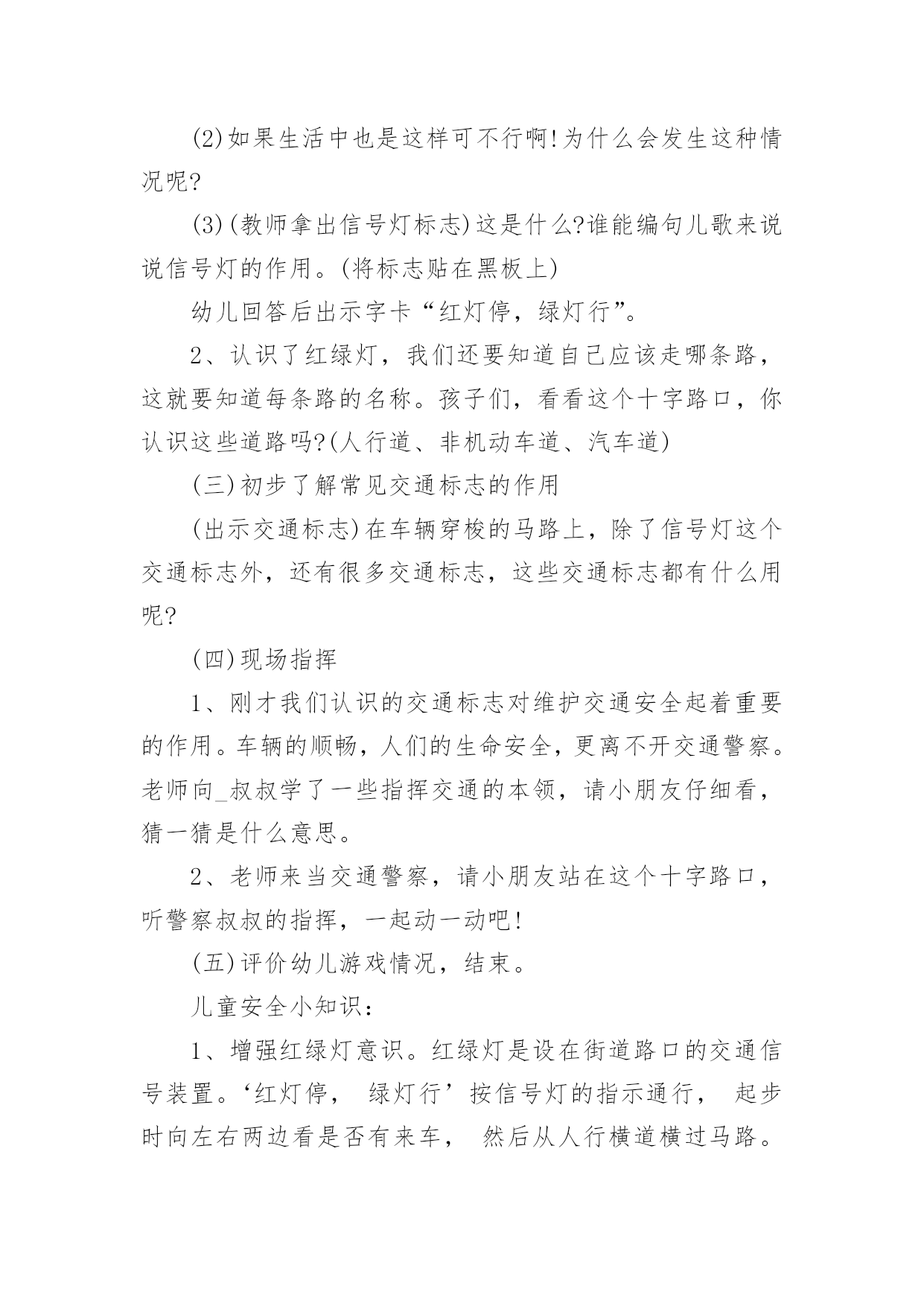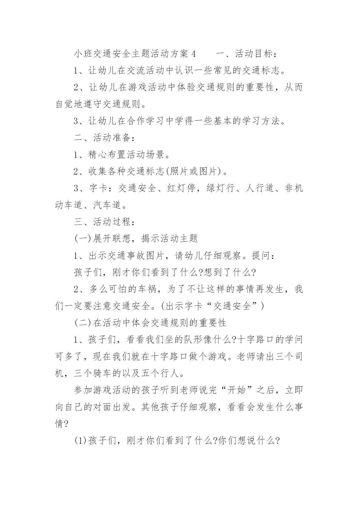 小班交通安全主题活动方案小班交通安全主题活动方案(精选5篇)为了确保活动顺利进行,就不得不需要事先制定活动方案,活动方案是整场活动的战略,可以为活动指明方向。那么优秀的活动方案是什么样的呢?以下是小编帮大家整理的小班交通安全主题活动方案(精选5篇),供大家参考借鉴,希望可以帮助到有需要的朋友。小班交通安全主题活动方案1活动目标:1、认识红、黄、绿色,了解基本的交通规则,知道遵守交通规则的重要性。2、通过参与情境游戏活动,理解红绿灯的作用。3、树立遵守社会公共规则的好品质,增强自我保护意识。4、培养幼儿敏锐的观察能力。5、遵守社会行为规则,不做“禁止”的事。活动准备:布置情境化场景,红绿信号灯。活动过程:一、观看儿歌《红绿灯》二、通过提问的方式,帮助幼儿了解红绿灯的作用。(1)教师:马路上有什么?有哪些颜色?红绿灯有什么用处。小朋友们,儿歌看完啦,老师现在有几个问题想问你们,在刚才的那段视频里呀你们看到的马路上都有什么?有那些颜色?你们觉得红绿灯都有什么用处呢?(2)教师:汽车在中间的快车道上行使,马路上的汽车是怎样过马路的?那你们看到刚才那些小汽车都是在哪儿行驶的么?小汽车又是怎样过马路的?发生了些什么?三、启发幼儿探讨马路上的交通规则。教师:自行车应该在什么道上行使?自行车应该怎样过马路?自行车该遵守哪些交通规则呢?小朋友们刚才观察的都很仔细,说的也很对。那老师还想问一问,在我们的生活当中自行车应该在什么道上行驶?自行车应该怎样过马路?自行车又应该遵守哪些交通规则?那行人呢?四、带幼儿到布置好的游戏情景中,配班教师装扮成交通警察,并做指挥交通状。教师:这是谁?他在做什么?他是在怎么站的?他是怎么指挥交通的?小朋友们,现在我们来看一看,站在马路中间的他是谁?他站在了哪里?他是怎么指挥交通的?好啦,小朋友们说的特别好,那老师就要奖励一下小朋友啦,老师请小朋友和老师一起来做个游戏。老师现在说一下游戏的玩法,我们先要穿过马路去停车场(走人行横道线,看红绿灯),到了停车场,每位小司机开一辆车。然后将你们的小汽车开回来。(开出停车场时提醒幼儿要看一看,听一听有没有其他车辆开过来。提醒幼儿开车时要注意红绿信号灯,并根据信号动作。)小班交通安全主题活动方案2活动目标:了解行人在马路上应该遵守的一些交通规则,形成初步的安全意识与自我保护意识,提高自我保护能力。活动准备:1、幼儿有与成人一起外出的经验。2、有关模拟游戏的情景创设。3、课件《看望兔奶奶》。活动过程:1、边观看课件(一)边讨论。(1)兔奶奶生病了,兔妈妈带兔宝宝去看望她。半路上,兔妈妈到水果店给奶奶买水果,兔宝宝就跑到了马路上。她看到花丛中有一只漂亮的蝴蝶,就去捉蝴蝶玩。蝴蝶飞到了马路中央,兔宝宝就一路追过去,差点被车撞上。(2)为什么兔宝宝差点被车撞到?(3)教师归纳:兔宝宝离开妈妈在马路上玩耍,差点被车撞上。这样太危险了,不管什么情况我们都不能在马路上玩。2、边观看课件(二)边讨论。(1)兔妈妈和兔宝宝继续往前走。奶奶家就在马路对面,兔宝宝兴奋地想冲过马路见奶奶,可是被兔妈妈一把拉住了。(2)兔妈妈为什么要拉住兔宝宝?过马路应该走哪里?(3)教师归纳:过马路要走斑马线。(4)十字路口有斑马线,行人是不是什么时候都可以走呢?什么时候可以走?(5)教师归纳:过十字路口要看红绿灯,红灯停,绿灯行。(6)兔妈妈和兔宝宝走到斑马线前,等绿灯亮时再穿过马路去奶奶家。3、小结:兔宝宝在路上遇到了一些危险,你们知道怎样才能避免那样的危险吗?(幼儿回答后,教师用自编儿歌进行归纳:小朋友,要牢记,走路要走人行道,路上玩耍不可以。过马路走斑马线,红灯停,绿灯行,确保安全是第一。)4、在情景模拟游戏“去春游”中或到马路上去实地体验。(1)带领幼儿一边走一边根据场景提问,巩固对交通规则的认识。场景一:人行道和车行道师:前面有两种道路,行人应该走哪一种路?(人行道。)师:行人应该注意什么?(靠右边走,不能边走边玩,特别是不能到车行道上玩。)场景二:十字路口师:要过马路了,我们应该怎么走?(找到斑马线,看清红绿灯,红灯停,绿灯行。)场景三:天桥师:这是什么?我们应该怎么走?(走天桥就像走幼儿园的楼梯,要靠右边一个跟着一个走,不能推也不能挤。)(2)顺利到达目的地之后,引导幼儿对刚才的情况进行小结,启发幼儿把过天桥的要点编到儿歌里去,如“过天桥靠右边,一个跟着一个走”。小班交通安全主题活动方案3活动目标:1、在活动中认识斑马线的作用,了解斑马线在交通安全中的重要性。2、引导幼儿有过马路走斑马线的意识,做个遵守交通规则的好孩子。3、培养幼儿敏锐的观察能力。4、初步培养幼儿用已有的生活经验解决问题的能力。5、考验小朋友们的反应能力,锻炼他们的个人能力。活动准备:背景图(马路)、斑马图片、斑马线活动过程:一、故