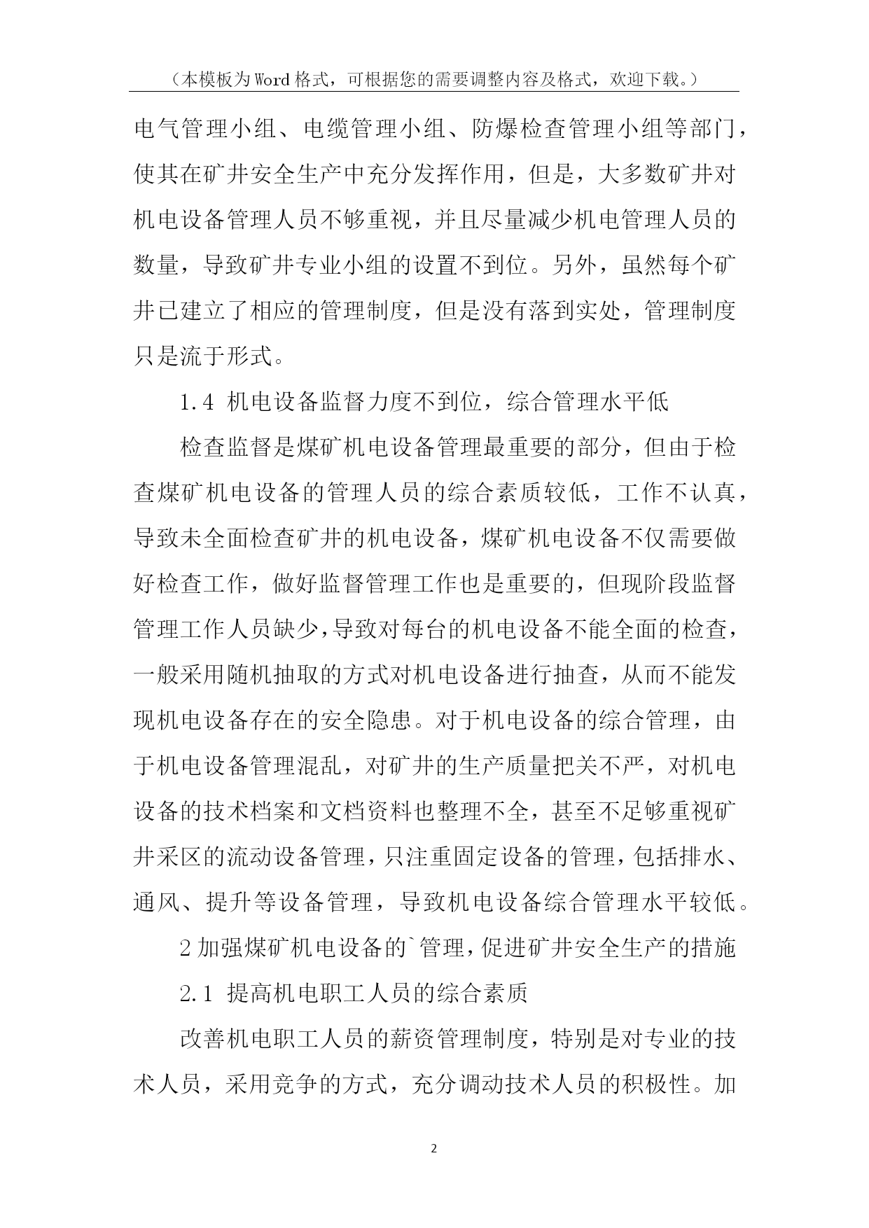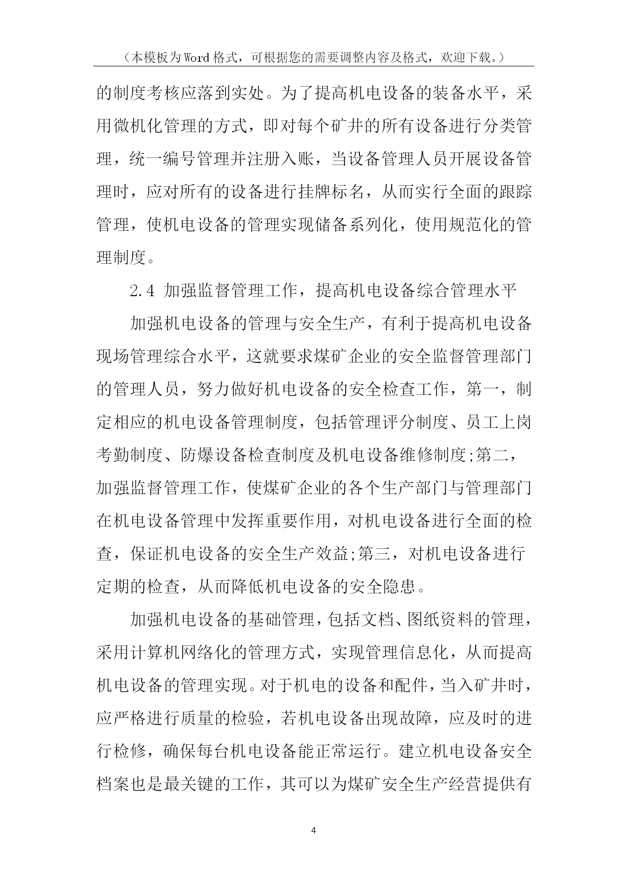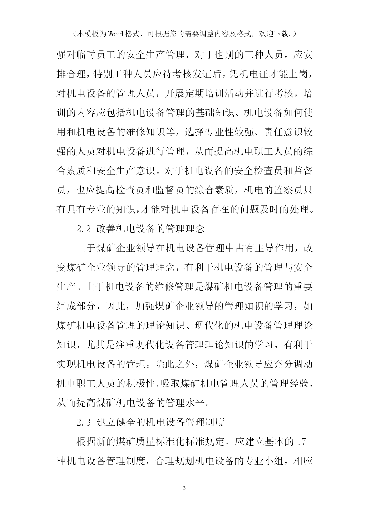 (本模板为Word格式,可根据您的需要调整内容及格式,欢迎下载。)PAGE\*MERGEFORMAT5煤矿机电设备管理与安全生产1煤矿机电设备管理存在的问题分析1.1机电职工人员综合素质不高随着煤矿行业的发展,对矿工人员的需求也逐渐增多,但是,煤矿业缺乏专业的优秀人才,专业的技术人才也大量的流失,剩下的基本上是农民工。另外,由于煤矿业的机电人员工资收入较低,对于专业的优秀人才和技术工,也很难吸引技术人员的眼球,导致煤矿招工难的现象发生,由于多方面的因素,导致煤矿的机电人员队伍的素质呈现下滑的趋势。1.2煤矿机电设备管理理念落后由于煤矿业的领导注重煤矿生产的产量,却对机电设备的管理未引起足够的重视,导致煤矿机电设备的管理理念存在落后的现象,只有机电设备出现问题,领带才安排技术人员对其进行维修,对于煤矿的机电设备管理,大部分煤矿企业都把机电设备管理放在主要地位,导致管理部门的工作意识不强,对于工作也是应付了事。1.3管理制度不完善根据煤矿业颁布的管理制度,矿井应建立机电主管部门、电气管理小组、电缆管理小组、防爆检查管理小组等部门,使其在矿井安全生产中充分发挥作用,但是,大多数矿井对机电设备管理人员不够重视,并且尽量减少机电管理人员的数量,导致矿井专业小组的设置不到位。另外,虽然每个矿井已建立了相应的管理制度,但是没有落到实处,管理制度只是流于形式。1.4机电设备监督力度不到位,综合管理水平低检查监督是煤矿机电设备管理最重要的部分,但由于检查煤矿机电设备的管理人员的综合素质较低,工作不认真,导致未全面检查矿井的机电设备,煤矿机电设备不仅需要做好检查工作,做好监督管理工作也是重要的,但现阶段监督管理工作人员缺少,导致对每台的机电设备不能全面的检查,一般采用随机抽取的方式对机电设备进行抽查,从而不能发现机电设备存在的安全隐患。对于机电设备的综合管理,由于机电设备管理混乱,对矿井的生产质量把关不严,对机电设备的技术档案和文档资料也整理不全,甚至不足够重视矿井采区的流动设备管理,只注重固定设备的管理,包括排水、通风、提升等设备管理,导致机电设备综合管理水平较低。2加强煤矿机电设备的`管理,促进矿井安全生产的措施2.1提高机电职工人员的综合素质改善机电职工人员的薪资管理制度,特别是对专业的技术人员,采用竞争的方式,充分调动技术人员的积极性。加强对临时员工的安全生产管理,对于也别的工种人员,应安排合理,特别工种人员应待考核发证后,凭机电证才能上岗,对机电设备的管理人员,开展定期培训活动并进行考核,培训的内容应包括机电设备管理的基础知识、机电设备如何使用和机电设备的维修知识等,选择专业性较强、责任意识较强的人员对机电设备进行管理,从而提高机电职工人员的综合素质和安全生产意识。对于机电设备的安全检查员和监督员,也应提高检查员和监督员的综合素质,机电的监察员只有具有专业的知识,才能对机电设备存在的问题及时的处理。2.2改善机电设备的管理理念由于煤矿企业领导在机电设备管理中占有主导作用,改变煤矿企业领导的管理理念,有利于机电设备的管理与安全生产。由于机电设备的维修管理是煤矿机电设备管理的重要组成部分,因此,加强煤矿企业领导的管理知识的学习,如煤矿机电设备管理的理论知识、现代化的机电设备管理理论知识,尤其是注重现代化设备管理理论知识的学习,有利于实现机电设备的管理。除此之外,煤矿企业领导应充分调动机电职工人员的积极性,吸取煤矿机电管理人员的管理经验,从而提高煤矿机电设备的管理水平。2.3建立健全的机电设备管理制度根据新的煤矿质量标准化标准规定,应建立基本的17种机电设备管理制度,合理规划机电设备的专业小组,相应的制度考核应落到实处。为了提高机电设备的装备水平,采用微机化管理的方式,即对每个矿井的所有设备进行分类管理,统一编号管理并注册入账,当设备管理人员开展设备管理时,应对所有的设备进行挂牌标名,从而实行全面的跟踪管理,使机电设备的管理实现储备系列化,使用规范化的管理制度。2.4加强监督管理工作,提高机电设备综合管理水平加强机电设备的管理与安全生产,有利于提高机电设备现场管理综合水平,这就要求煤矿企业的安全监督管理部门的管理人员,努力做好机电设备的安全检查工作,第一,制定相应的机电设备管理制度,包括管理评分制度、员工上岗考勤制度、防爆设备检查制度及机电设备维修制度;第二,加强监督管理工作,使煤矿企业的各个生产部门与管理部门在机电设备管理中发挥重要作用,对机电设备进行全面的检查,保证机电设备的安全生产效益;第三,对机电设备进行定期的检查,从而降低机电设备的安全隐患。加强机电设备的基础管理,包括文档、图纸资料的管理,采用计算机网络化的管理方式,实现管理信息化,从而提高机电设备的管理实现。对于机电的设备和配件,当入矿井时,应严格进行质量的检验