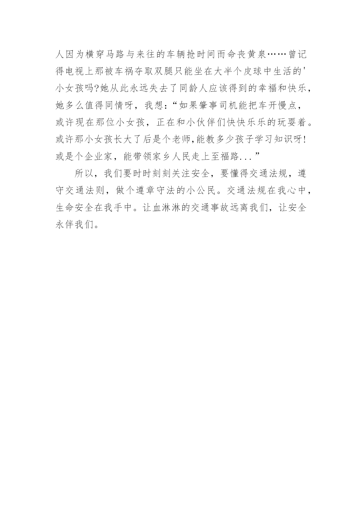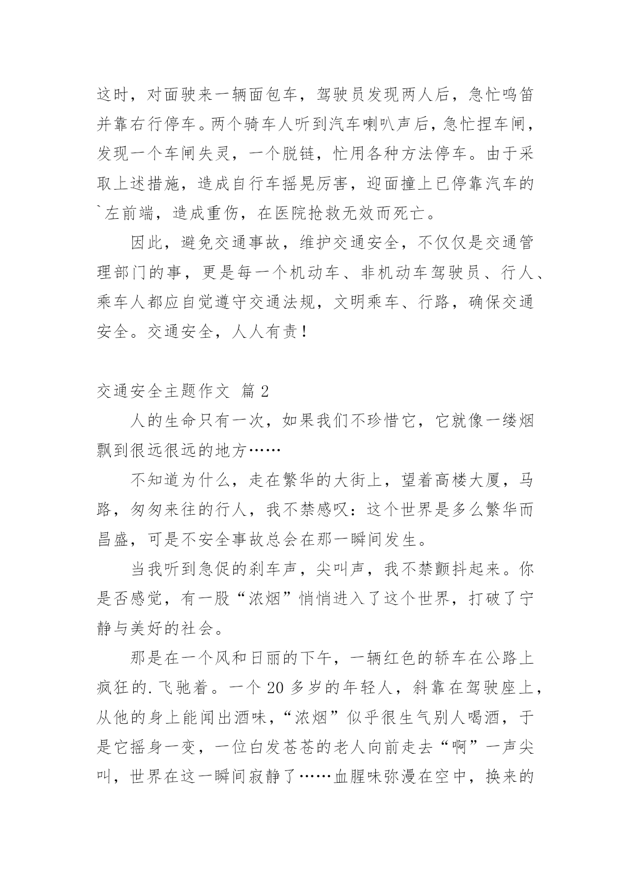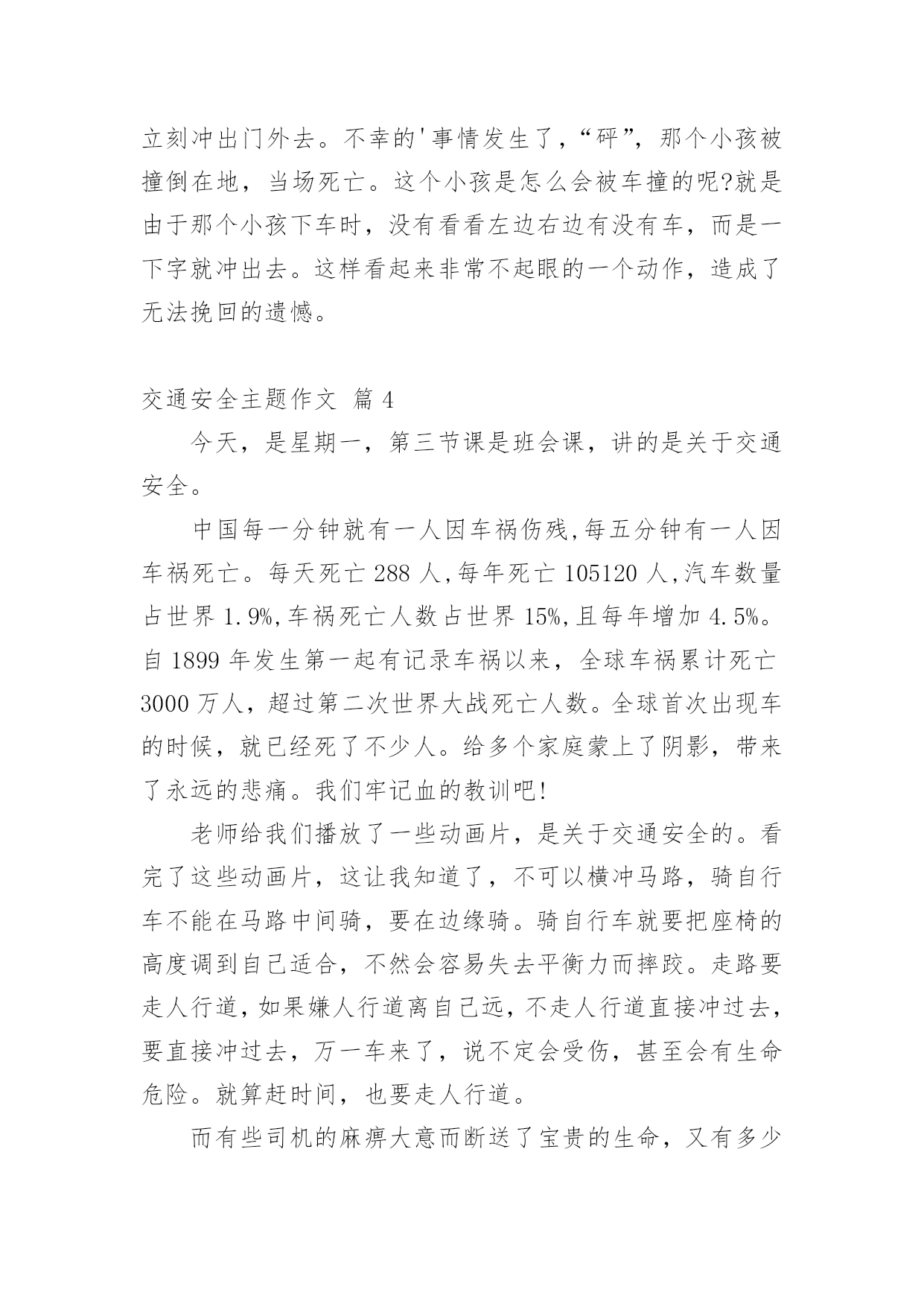 交通安全主题作文(实用)交通安全主题作文在学习、工作、生活中,大家都有写作文的经历,对作文很是熟悉吧,根据写作命题的特点,作文可以分为命题作文和非命题作文。相信许多人会觉得作文很难写吧,以下是小编精心整理的交通安全主题作文4篇,供大家参考借鉴,希望可以帮助到有需要的朋友。交通安全主题作文篇1今天,我看一段关于交通安全的光碟,使我感触颇深。在小学生们非正常死亡人数中,交通事故死亡人数占有一定的比例。于是,学校在今天——全国中小学生安全教育日,给我们上一堂生动的课——在看中学会交通规则,在看中学会自救方法!汽车是现代重要的交通工具,人们在享受汽车带来的方便、快捷的同时,也不得不面对交通事故带来的困扰。车祸,现在已成为人类第一杀手。学生谭某去同学家玩,在返回学校时,因为与同学嬉戏打闹、互相追逐。中途因贪玩,被汽车撞倒、辗压,当场死亡。某校6名学生相约一起外出郊游,途中,马某某与李某骑车打闹,自行车失去平衡,行至下坡路,还是敞开滑行。这时,对面驶来一辆面包车,驾驶员发现两人后,急忙鸣笛并靠右行停车。两个骑车人听到汽车喇叭声后,急忙捏车闸,发现一个车闸失灵,一个脱链,忙用各种方法停车。由于采取上述措施,造成自行车摇晃厉害,迎面撞上已停靠汽车的`左前端,造成重伤,在医院抢救无效而死亡。因此,避免交通事故,维护交通安全,不仅仅是交通管理部门的事,更是每一个机动车、非机动车驾驶员、行人、乘车人都应自觉遵守交通法规,文明乘车、行路,确保交通安全。交通安全,人人有责!交通安全主题作文篇2人的生命只有一次,如果我们不珍惜它,它就像一缕烟飘到很远很远的地方……不知道为什么,走在繁华的大街上,望着高楼大厦,马路,匆匆来往的行人,我不禁感叹:这个世界是多么繁华而昌盛,可是不安全事故总会在那一瞬间发生。当我听到急促的刹车声,尖叫声,我不禁颤抖起来。你是否感觉,有一股“浓烟”悄悄进入了这个世界,打破了宁静与美好的社会。那是在一个风和日丽的下午,一辆红色的轿车在公路上疯狂的.飞驰着。一个20多岁的年轻人,斜靠在驾驶座上,从他的身上能闻出酒味,“浓烟”似乎很生气别人喝酒,于是它摇身一变,一位白发苍苍的老人向前走去“啊”一声尖叫,世界在这一瞬间寂静了……血腥味弥漫在空中,换来的是亲人无数的泪水,以及自己年轻的生命……老人倒在地上,“浓烟”冷笑了几声,渐渐飞走了!一场悲剧就在这一刻发生了。全世界每天都有不安全事故发生,几人伤心,几人忧,可是安全在你我心里到底有多少份量?你是否想过生命重于泰山,所以安全意识人人有责。我们要先行动起来,遵守交通规则让悲剧不在重演。安全是火,点燃了生命之灯!安全是灯,照亮了生命之路!安全是路,引导着生命走向新的辉煌!交通安全主题作文篇3在我们的身边,常常会发生一些交通事故。在这些事故中,小到跌痛,大到身亡,这提醒我们每个人:必须时时刻刻注意交通安全!交通事故其实是可以避免的,只要我们遵守交通规则,就不会发生交通事故。但是有些人就是不遵守交通规则,所以才导致了一起起交通事故。如有些人走路不靠右边走;明明是红灯,见到两边没人,就闯红灯;过马路不看旁边有没有车,就冲过去……虽然这些看起来都是鸡毛蒜皮的小事,但往往就是这些鸡毛蒜皮的小事引起了一些重大交通事故,给家庭、社会造成了很大损失。那是20xx年,一辆接送孩子的车停在我们学校的新港公路旁。车上一个小男孩的奶奶在路边等他,那个小男孩看见了奶奶,大概是一时兴奋,忘记了向左右看有没有车辆,立刻冲出门外去。不幸的'事情发生了,“砰”,那个小孩被撞倒在地,当场死亡。这个小孩是怎么会被车撞的呢?就是由于那个小孩下车时,没有看看左边右边有没有车,而是一下字就冲出去。这样看起来非常不起眼的一个动作,造成了无法挽回的遗憾。交通安全主题作文篇4今天,是星期一,第三节课是班会课,讲的是关于交通安全。中国每一分钟就有一人因车祸伤残,每五分钟有一人因车祸死亡。每天死亡288人,每年死亡105120人,汽车数量占世界1.9%,车祸死亡人数占世界15%,且每年增加4.5%。自1899年发生第一起有记录车祸以来,全球车祸累计死亡3000万人,超过第二次世界大战死亡人数。全球首次出现车的时候,就已经死了不少人。给多个家庭蒙上了阴影,带来了永远的悲痛。我们牢记血的教训吧!老师给我们播放了一些动画片,是关于交通安全的。看完了这些动画片,这让我知道了,不可以横冲马路,骑自行车不能在马路中间骑,要在边缘骑。骑自行车就要把座椅的高度调到自己适合,不然会容易失去平衡力而摔跤。走路要走人行道,如果嫌人行道离自己远,不走人行道直接冲过去,要直接冲过去,万一车来了,说不定会受伤,甚至会有生命危险。就算赶时间,也要走人行道。而有些司机的麻痹大意而断送了宝贵的生命,又有多少人因为横穿马路与来往的车辆抢时间而命丧黄泉……曾记得电视上那被车祸夺取