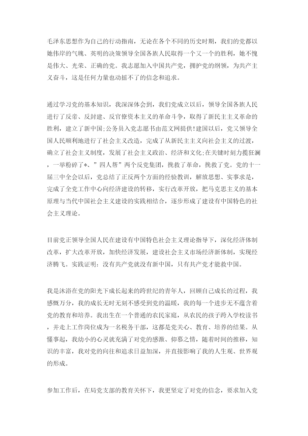 2020乡镇公务员入党申请书范文篇一尊敬的党组织:我是一名来自汨罗市三洲乡的基层公务员。今天我怀着无比诚挚与虔诚的心,向党组织提出,申请加入我梦寐以求的中国共产党。因为在我这二十多年的人生历程中,使我逐步认识到:中国共产党是伟大、光荣、正确的党,使中国工人阶级先锋队,使中国各族人民利益的忠实代表。是中国社会主义事业的领导核心。党的最终目的是实现共产主义的社会制度。我们党是已马列主义、毛泽东思想和邓--理论为指导思想的。正如党的xx大报告所提出的那样:中国共产党是全国各族人民的领导核心。党的领导地位是有党的工人阶级先锋队性质决定的,是经过长期斗争考验形成的。历史把重大责任赋予我们党,人民对我们党寄予厚望,党领导人民在二十世纪写下了光辉篇章,也一定能在二十一世纪写下心得光辉篇章。人民生活会更加幸福,祖国更加繁荣昌盛,人民更加充满信心。尽管在我们的前进道路上还有许多困难和艰辛,但我坚信:只要我们认认真真地落实和践行科学发展观,不断完善和修正前进思路,一个繁荣富强、高度民主、高度文明的社会主义现代化国家必将屹立于世界民学族习之网林。为此我要全身心地投入到我们伟大祖国的现代化建设事业中。加入到共产主义的伟大事业行业中去,为我们伟大祖国的腾飞崛起、为中华民族的强大而贡献自己的沧海一粟。通过学习,我进一步认识到入党不是一个短暂的行为,必须经过长期不懈的努力,做到从思想上、行动上真正入党。入党是我人生的奋斗目标,加入中国共产党才能使自己得以不断提高和发展,也才能为自己进一步做好工作、服务社会提供更广阔的空间。中国共产党又是中国社会主义建设的核心。在中国革命每一个时期,党勇敢地担负起领导革命的任务。以中国共产党为代表的共产党人,把马克思主义的普遍真理同中国革命的具体实践相结合带领人民群众推倒三座大山,建立人民民主专政的新中国,开辟了中华民族奋发图强的新纪元。单就这个成就,就是任何一个政党无法比拟的。新中国成立后,党又领导全国各族人民完成社会主义改造,进行大规模的社会主义建设,使一个备受欺辱的半封建半殖民地国家一跃成为在国际舞台上占有举足轻重地位的社会主义国家。党的十一届三中全会以后,确定把工作重心转移到经济建设上,党又带领全国人民迎来了改革开放和社会主义建设的新时期,国家面貌发生了天翻地覆的变化。我坚信在党的领导下,我国的社会主义建设事业必将取得辉煌的成就,我们的祖国一定走向繁荣富强。中国共产党以马列主义,毛泽东思想和邓--理论、xxxx理论作为自己的行动指南。正是因为党以这些正确的理论和先进的思想作为思想武器,她才能如此正确地认识和掌握事物的发展规律,判明国内外的复杂形势,制定不同历史时期正确的纲领,才能树立坚定的信念和必胜的信心,始终站在革命运动和建设事业的前头,带领工人阶级和广大群众,建设有中国特色的社会主义,完成社会主义初级阶段的历史任务,并最终实现共产主义。中国共产党在现阶段的总任务是领导和团结全国各族人民,以经济建设为中心,坚持四项基本原则,坚持改革开放,坚持科学发展观,自力更生,艰苦奋斗,为把我国建设成为富强,民主,文明的社会主义现代化国家而奋斗。这充分表明了中国共产党已经纠正”左倾”错误,党的工作重心完全转到经济建设上来。党提出的走有中国特色社会主义的理论,是深入进行改革开放和社会主义建设的需要,并进一步表明党对建设有中国特色社会主义充满必胜信心,毫不动摇把党的基本路线坚持下去。我走上工作岗位后,使我更渴望早日加入到党组织的行列中去,我决心以爱岗敬业、任劳任怨、悉心求教的精神,保质保量完成党组织和领导分配的工作任务,认真做好本职工作,不论在任何岗位事事处处以一个共产党员和一个国家公务员的标准严格要求自己,把认认真真的共组当成党组织对自己的考验,不计个人得失,团结同事、尊敬领导。时时提醒自己必须坚持科学发展观以人为本的原则,强化服务意识,努力为构建和谐气象事业贡献自己的一份力量。此致敬礼!申请人:xxxxxxx年xx月xx日篇二敬爱的党组织:我之所以要加入中国共产党,是因为我深信共产主义事业的必然成功,深信只有社会主义才能救中国,只有社会主义才能发展中国。实践也充分证明。建设有中国特色社会主义,是实现中国经济繁荣和社会进步的康庄大道。我深信共产党员是彻底的唯物主义者,我将努力向这个方向发展。中国共产党是中国工人阶级的先锋队,是中国各族人民利益的踏实代表,是中国社会主义事业的领导核心。党的最终目的是实现共产主义的社会制度。我们党是以马列主义、毛泽东思想、邓小平理论为指导思想的。自19XX年中国共产党创建至今,已经走过了近XX年光荣的斗争道路。这几十年,中国共产党从小到大、从弱到强、从幼稚到成熟,不断发展壮大。从建党之初仅有的50多名党员,几个小组逐步发展到今天拥有数千万党员的执政党,并在长期的革命中