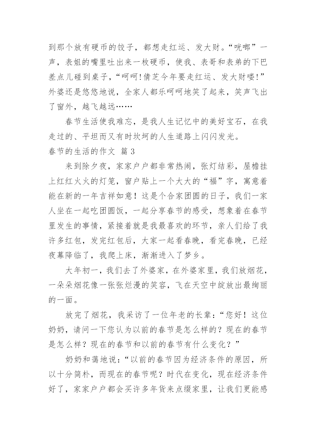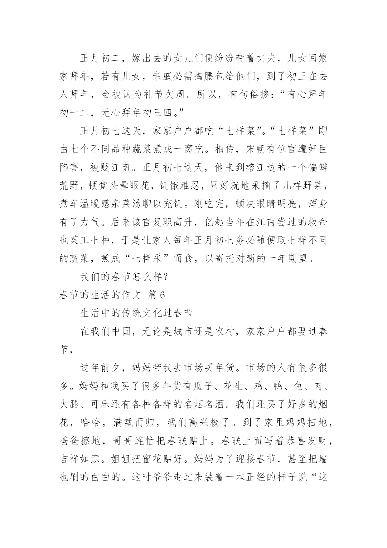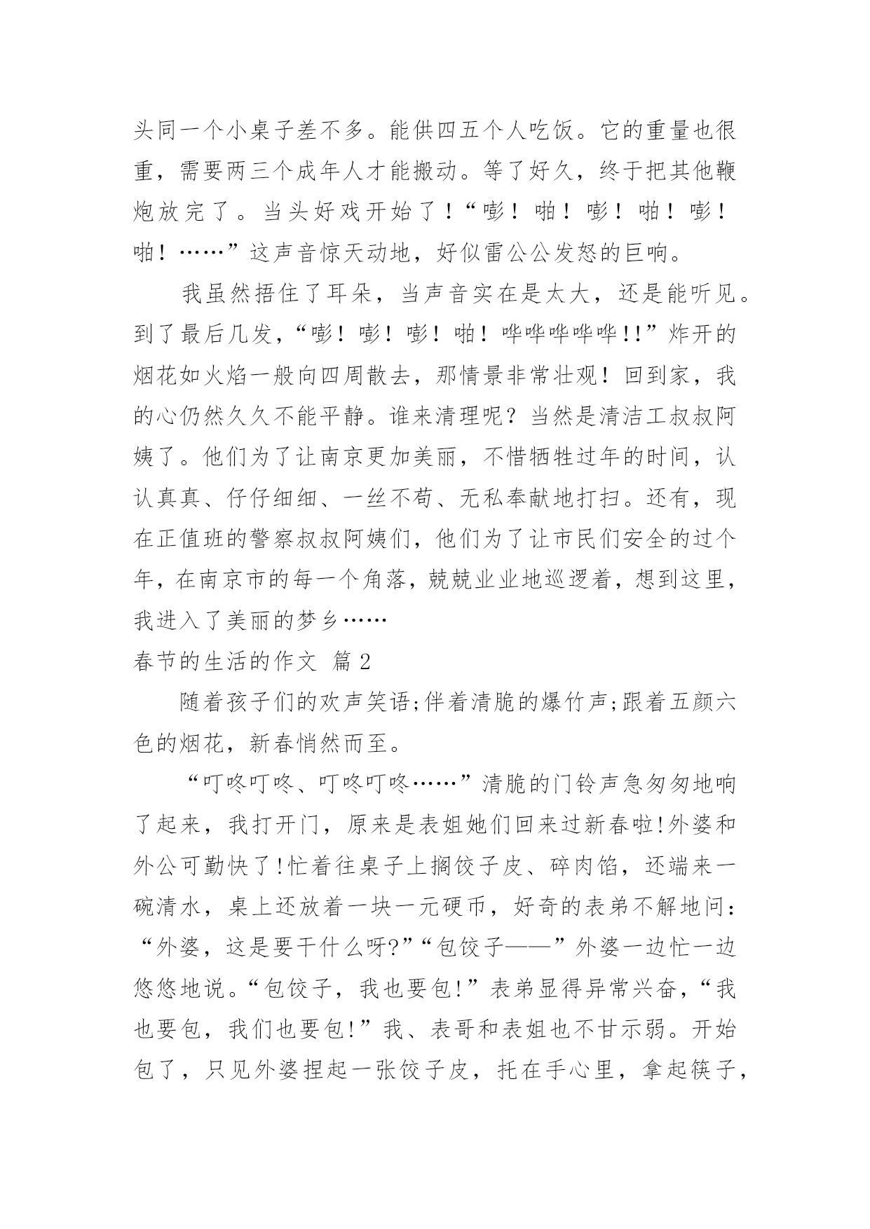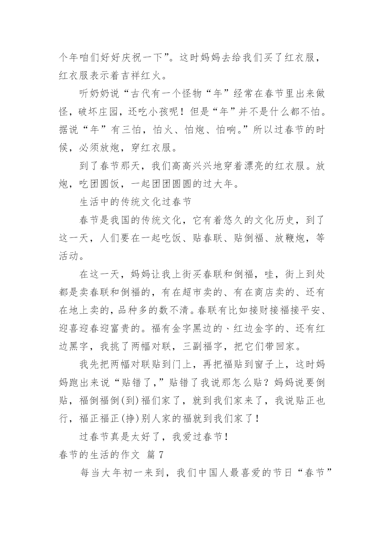 春节的生活的作文关于春节的生活的作文7篇在学习、工作、生活中,大家都经常接触到作文吧,作文是由文字组成,经过人的思想考虑,通过语言组织来表达一个主题意义的文体。相信写作文是一个让许多人都头痛的问题,下面是小编精心整理的春节的生活的作文9篇,欢迎大家分享。春节的生活的作文篇1新春是我国传统节日之一。在年30这天,小朋友们要给长辈拜年,拿红包;人们要和亲人团聚,吃年夜饭;更要在家,一边看“新春联欢晚会”,一边守岁;等到凌晨12点,家外,窗边,楼下,鞭炮声震耳欲聋,人们放着鞭炮,完全沉醉在新春这欢乐的节日中。我是在外婆家过的新春。晚上,我照旧在看“新春联欢晚会”,当离12点越来越近时,主持人进行倒计时“10,9,8……3,2,1。”随着数字的接近,声音越来越缓慢,一直延续着,直到12点。当倒计时数完时,我们家热闹起来了了!妈妈高兴的喊道:“过年啦!过年啦!你又长大了一岁。”接着,我们一家下楼放烟火。前几天,舅舅买了许多鞭炮。有地陀螺,有小蜜蜂,有夜明珠,有天地响,还有许多叫不上名字的。鞭炮的样子也有许多。花脸,蝴蝶……有的天地响20发,有的天地响50发,还有的天地响100发。在这么多的鞭炮中,最引人注目的要数一种天地响。它的个头同一个小桌子差不多。能供四五个人吃饭。它的重量也很重,需要两三个成年人才能搬动。等了好久,终于把其他鞭炮放完了。当头好戏开始了!“嘭!啪!嘭!啪!嘭!啪!……”这声音惊天动地,好似雷公公发怒的巨响。我虽然捂住了耳朵,当声音实在是太大,还是能听见。到了最后几发,“嘭!嘭!嘭!啪!哗哗哗哗哗!!”炸开的烟花如火焰一般向四周散去,那情景非常壮观!回到家,我的心仍然久久不能平静。谁来清理呢?当然是清洁工叔叔阿姨了。他们为了让南京更加美丽,不惜牺牲过年的时间,认认真真、仔仔细细、一丝不苟、无私奉献地打扫。还有,现在正值班的警察叔叔阿姨们,他们为了让市民们安全的过个年,在南京市的每一个角落,兢兢业业地巡逻着,想到这里,我进入了美丽的梦乡……春节的生活的作文篇2随着孩子们的欢声笑语;伴着清脆的爆竹声;跟着五颜六色的烟花,新春悄然而至。“叮咚叮咚、叮咚叮咚……”清脆的门铃声急匆匆地响了起来,我打开门,原来是表姐她们回来过新春啦!外婆和外公可勤快了!忙着往桌子上搁饺子皮、碎肉馅,还端来一碗清水,桌上还放着一块一元硬币,好奇的表弟不解地问:“外婆,这是要干什么呀?”“包饺子——”外婆一边忙一边悠悠地说。“包饺子,我也要包!”表弟显得异常兴奋,“我也要包,我们也要包!”我、表哥和表姐也不甘示弱。开始包了,只见外婆捏起一张饺子皮,托在手心里,拿起筷子,加了点儿肉,蘸一些清水,左手一捏,一个小巧玲珑的饺子就诞生了。我心里想:这对我来说根本就是小菜一碟嘛!我笨手笨脚地也捏起来一张饺子皮,饺子皮冰凉冰凉的,真舒服!接着用筷子加了一大坨肉塞在白嫩嫩的饺子皮上,蘸了些清水,顺手一捏,肉馅儿好像硬是要和我作对似的',冒出了尖尖的小脑袋,我是第一次包饺子,见如此情景,先是呆住了,第二反应便是赶紧去捏,捏好了这边,可那边又破了,我又去捏那儿,捏好了那儿,可这边又破了,好几个来回后,我急得满头大汗,有点儿不知所措了,一抹脸,抬起头正想去请教外婆,大家哄堂大笑——原来我变成大花脸了。在院子里修剪花枝的舅舅听见了,也闻讯赶来。我原以为他包饺子的技术比我好不了多少,可后来便完全打消了这种念头。舅舅可是个包饺子高手,他一下就包了三四个饺子。我不服气,捏起一张饺子皮,夹了一大坨肉馅,蘸了些清水,一边包一边大声喊:“我要超过舅舅的本事——”大话还没说完,肉馅又一股脑冒了才出来,惹得大家又是一阵笑声!“哦,瞧我这记性!忘了上硬币!”外婆小孩似的拍着脑袋调皮地说道。说着,她左手托皮,右手夹馅,顺便把硬币放入馅内,表弟歪着小脑袋,调皮地问道:“外婆,为什么要在饺子馅里放硬币呢?”“你们不知道,谁呀要是吃到这有硬币的饺子,谁今年就要走红运、发大财啦!”外婆一边神秘地说着,一边慈祥地看着我们这群调皮的小孩。“开吃喽!开吃喽!”外公端着一碗热腾腾的饺子来到桌前,我们这几个调皮的小孩都争先恐后地抢着饺子,都想吃到那个放有硬币的饺子,都想走红运、发大财。“咣啷”一声,表姐的嘴里吐出来一枚硬币,使我、表哥和表弟的下巴差点儿碰到桌子,“呵呵!倩芝今年要走红运、发大财喽!”外婆还是悠悠地说,全家人都乐呵呵地笑了起来,笑声飞出了窗外,越飞越远……春节生活使我难忘,是我人生记忆中的美好宝石,在我走过的、平坦而又有时坎坷的人生道路上闪闪发光。春节的生活的作文篇3来到除夕夜,家家户户都非常热闹,张灯结彩,屋檐挂上红红火火的灯笼,窗户贴上一个大大的“福”字,寓意着能在新的一年吉祥如意!这是个合家团圆的日子,我们一家人坐在一起吃团圆饭,一起分享春节的感受,想象着在春节里发生的事情,紧接着就是