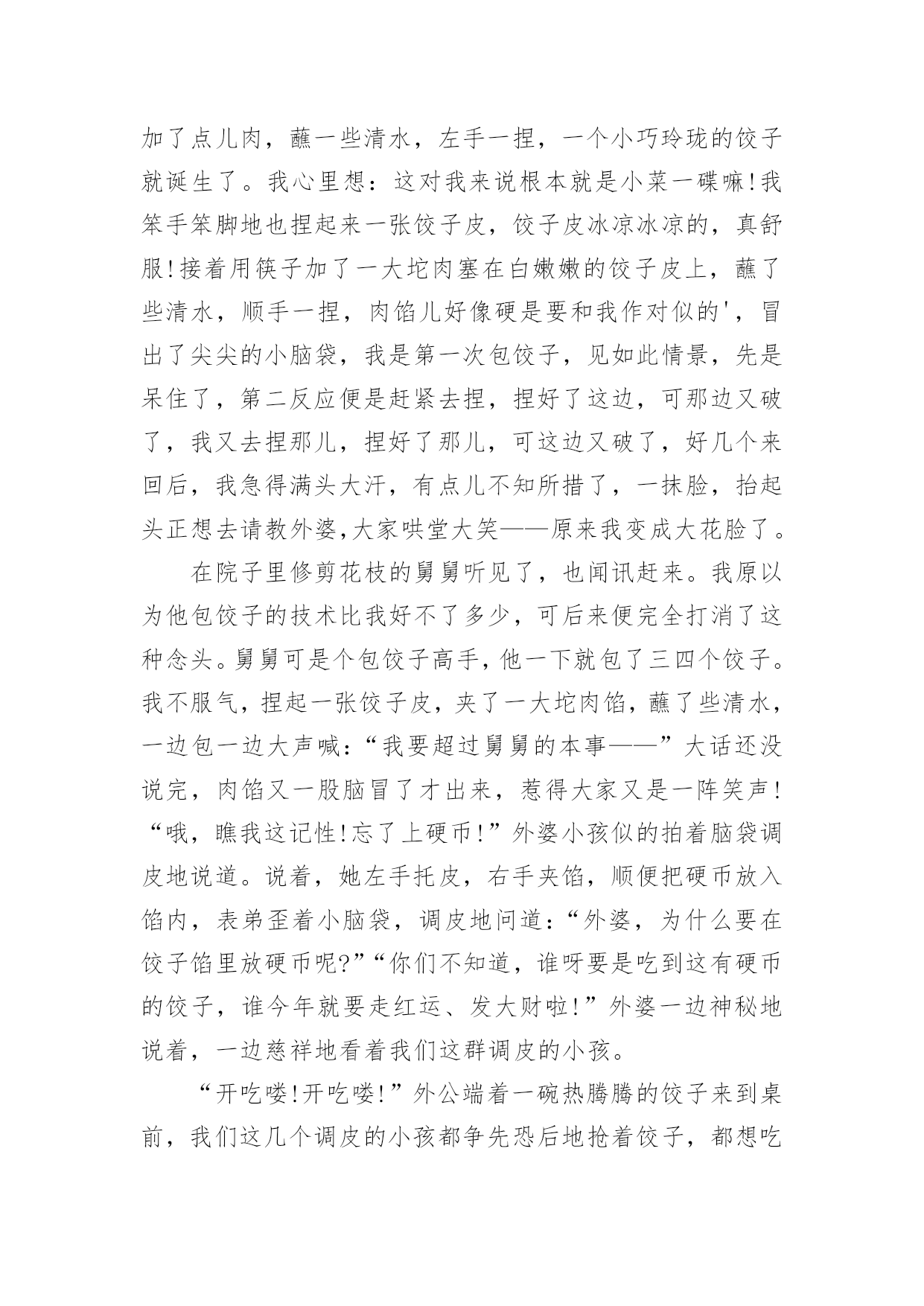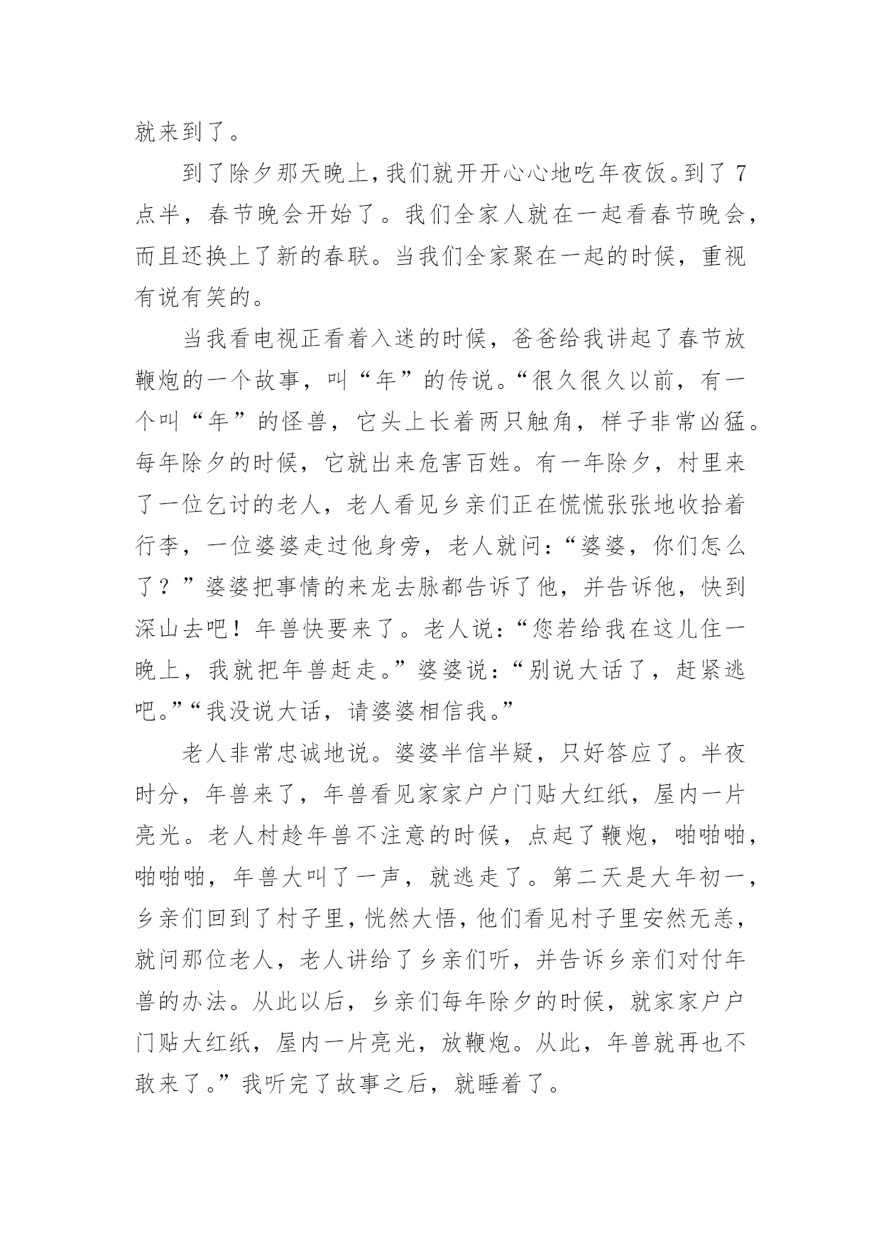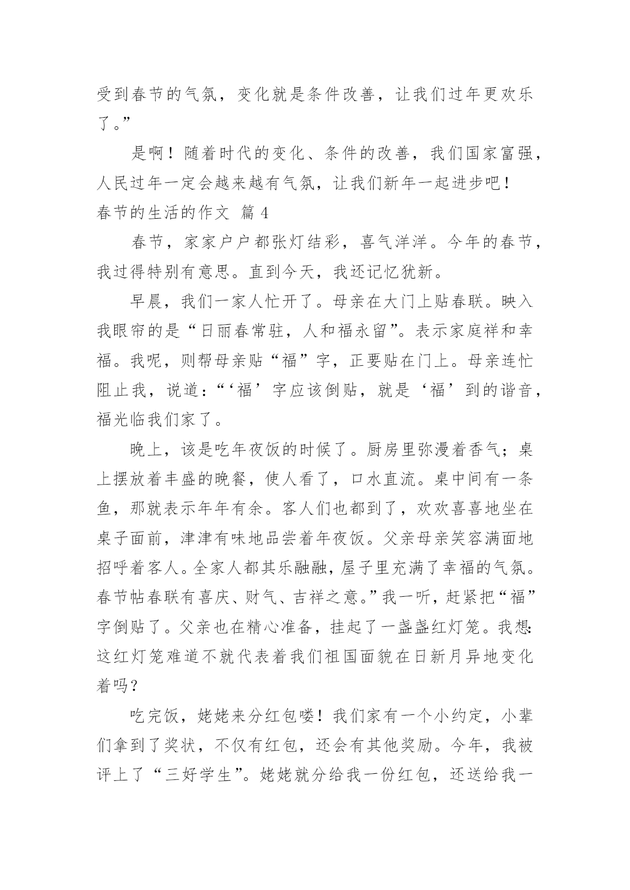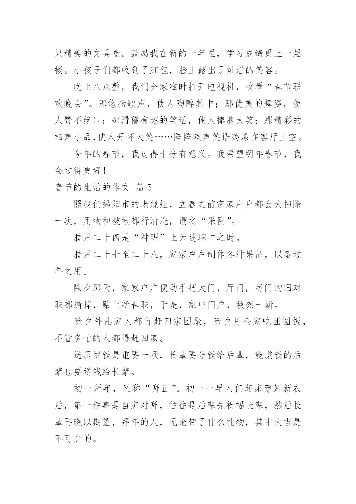 春节的生活的作文关于春节的生活的作文7篇在学习、工作、生活中,大家都经常接触到作文吧,作文是由文字组成,经过人的思想考虑,通过语言组织来表达一个主题意义的文体。相信写作文是一个让许多人都头痛的问题,下面是小编精心整理的春节的生活的作文9篇,欢迎大家分享。春节的生活的作文篇1新春是我国传统节日之一。在年30这天,小朋友们要给长辈拜年,拿红包;人们要和亲人团聚,吃年夜饭;更要在家,一边看“新春联欢晚会”,一边守岁;等到凌晨12点,家外,窗边,楼下,鞭炮声震耳欲聋,人们放着鞭炮,完全沉醉在新春这欢乐的节日中。我是在外婆家过的新春。晚上,我照旧在看“新春联欢晚会”,当离12点越来越近时,主持人进行倒计时“10,9,8……3,2,1。”随着数字的接近,声音越来越缓慢,一直延续着,直到12点。当倒计时数完时,我们家热闹起来了了!妈妈高兴的喊道:“过年啦!过年啦!你又长大了一岁。”接着,我们一家下楼放烟火。前几天,舅舅买了许多鞭炮。有地陀螺,有小蜜蜂,有夜明珠,有天地响,还有许多叫不上名字的。鞭炮的样子也有许多。花脸,蝴蝶……有的天地响20发,有的天地响50发,还有的天地响100发。在这么多的鞭炮中,最引人注目的要数一种天地响。它的个头同一个小桌子差不多。能供四五个人吃饭。它的重量也很重,需要两三个成年人才能搬动。等了好久,终于把其他鞭炮放完了。当头好戏开始了!“嘭!啪!嘭!啪!嘭!啪!……”这声音惊天动地,好似雷公公发怒的巨响。我虽然捂住了耳朵,当声音实在是太大,还是能听见。到了最后几发,“嘭!嘭!嘭!啪!哗哗哗哗哗!!”炸开的烟花如火焰一般向四周散去,那情景非常壮观!回到家,我的心仍然久久不能平静。谁来清理呢?当然是清洁工叔叔阿姨了。他们为了让南京更加美丽,不惜牺牲过年的时间,认认真真、仔仔细细、一丝不苟、无私奉献地打扫。还有,现在正值班的警察叔叔阿姨们,他们为了让市民们安全的过个年,在南京市的每一个角落,兢兢业业地巡逻着,想到这里,我进入了美丽的梦乡……春节的生活的作文篇2随着孩子们的欢声笑语;伴着清脆的爆竹声;跟着五颜六色的烟花,新春悄然而至。“叮咚叮咚、叮咚叮咚……”清脆的门铃声急匆匆地响了起来,我打开门,原来是表姐她们回来过新春啦!外婆和外公可勤快了!忙着往桌子上搁饺子皮、碎肉馅,还端来一碗清水,桌上还放着一块一元硬币,好奇的表弟不解地问:“外婆,这是要干什么呀?”“包饺子——”外婆一边忙一边悠悠地说。“包饺子,我也要包!”表弟显得异常兴奋,“我也要包,我们也要包!”我、表哥和表姐也不甘示弱。开始包了,只见外婆捏起一张饺子皮,托在手心里,拿起筷子,加了点儿肉,蘸一些清水,左手一捏,一个小巧玲珑的饺子就诞生了。我心里想:这对我来说根本就是小菜一碟嘛!我笨手笨脚地也捏起来一张饺子皮,饺子皮冰凉冰凉的,真舒服!接着用筷子加了一大坨肉塞在白嫩嫩的饺子皮上,蘸了些清水,顺手一捏,肉馅儿好像硬是要和我作对似的',冒出了尖尖的小脑袋,我是第一次包饺子,见如此情景,先是呆住了,第二反应便是赶紧去捏,捏好了这边,可那边又破了,我又去捏那儿,捏好了那儿,可这边又破了,好几个来回后,我急得满头大汗,有点儿不知所措了,一抹脸,抬起头正想去请教外婆,大家哄堂大笑——原来我变成大花脸了。在院子里修剪花枝的舅舅听见了,也闻讯赶来。我原以为他包饺子的技术比我好不了多少,可后来便完全打消了这种念头。舅舅可是个包饺子高手,他一下就包了三四个饺子。我不服气,捏起一张饺子皮,夹了一大坨肉馅,蘸了些清水,一边包一边大声喊:“我要超过舅舅的本事——”大话还没说完,肉馅又一股脑冒了才出来,惹得大家又是一阵笑声!“哦,瞧我这记性!忘了上硬币!”外婆小孩似的拍着脑袋调皮地说道。说着,她左手托皮,右手夹馅,顺便把硬币放入馅内,表弟歪着小脑袋,调皮地问道:“外婆,为什么要在饺子馅里放硬币呢?”“你们不知道,谁呀要是吃到这有硬币的饺子,谁今年就要走红运、发大财啦!”外婆一边神秘地说着,一边慈祥地看着我们这群调皮的小孩。“开吃喽!开吃喽!”外公端着一碗热腾腾的饺子来到桌前,我们这几个调皮的小孩都争先恐后地抢着饺子,都想吃到那个放有硬币的饺子,都想走红运、发大财。“咣啷”一声,表姐的嘴里吐出来一枚硬币,使我、表哥和表弟的下巴差点儿碰到桌子,“呵呵!倩芝今年要走红运、发大财喽!”外婆还是悠悠地说,全家人都乐呵呵地笑了起来,笑声飞出了窗外,越飞越远……春节生活使我难忘,是我人生记忆中的美好宝石,在我走过的、平坦而又有时坎坷的人生道路上闪闪发光。春节的生活的作文篇3来到除夕夜,家家户户都非常热闹,张灯结彩,屋檐挂上红红火火的灯笼,窗户贴上一个大大的“福”字,寓意着能在新的一年吉祥如意!这是个合家团圆的日子,我们一家人坐在一起吃团圆饭,一起分享春节的感受,想象着在春节里发生的事情,紧接着就是