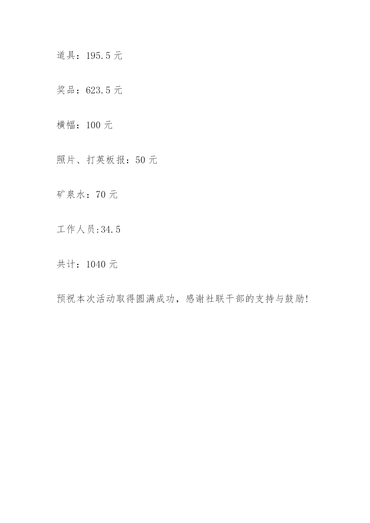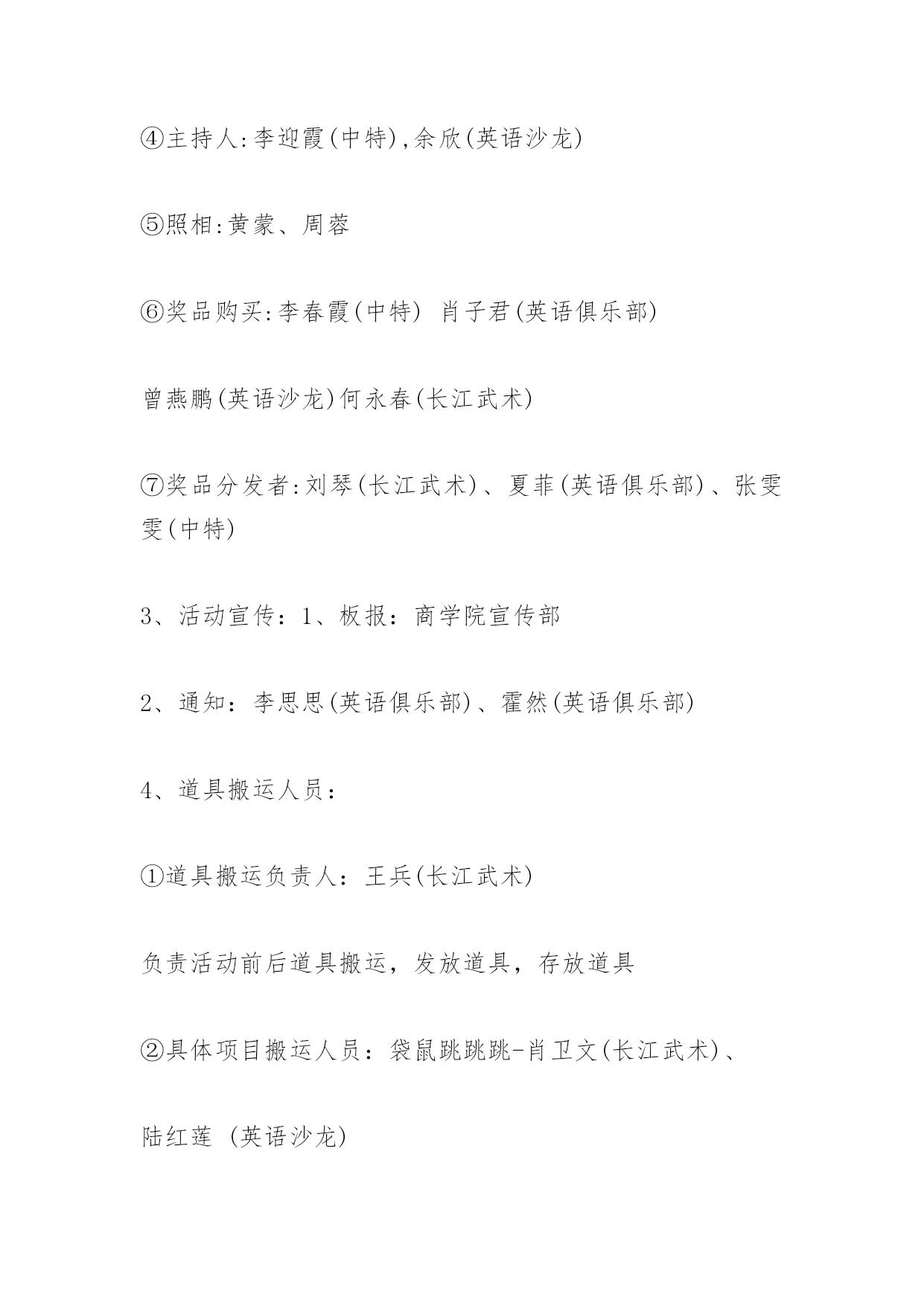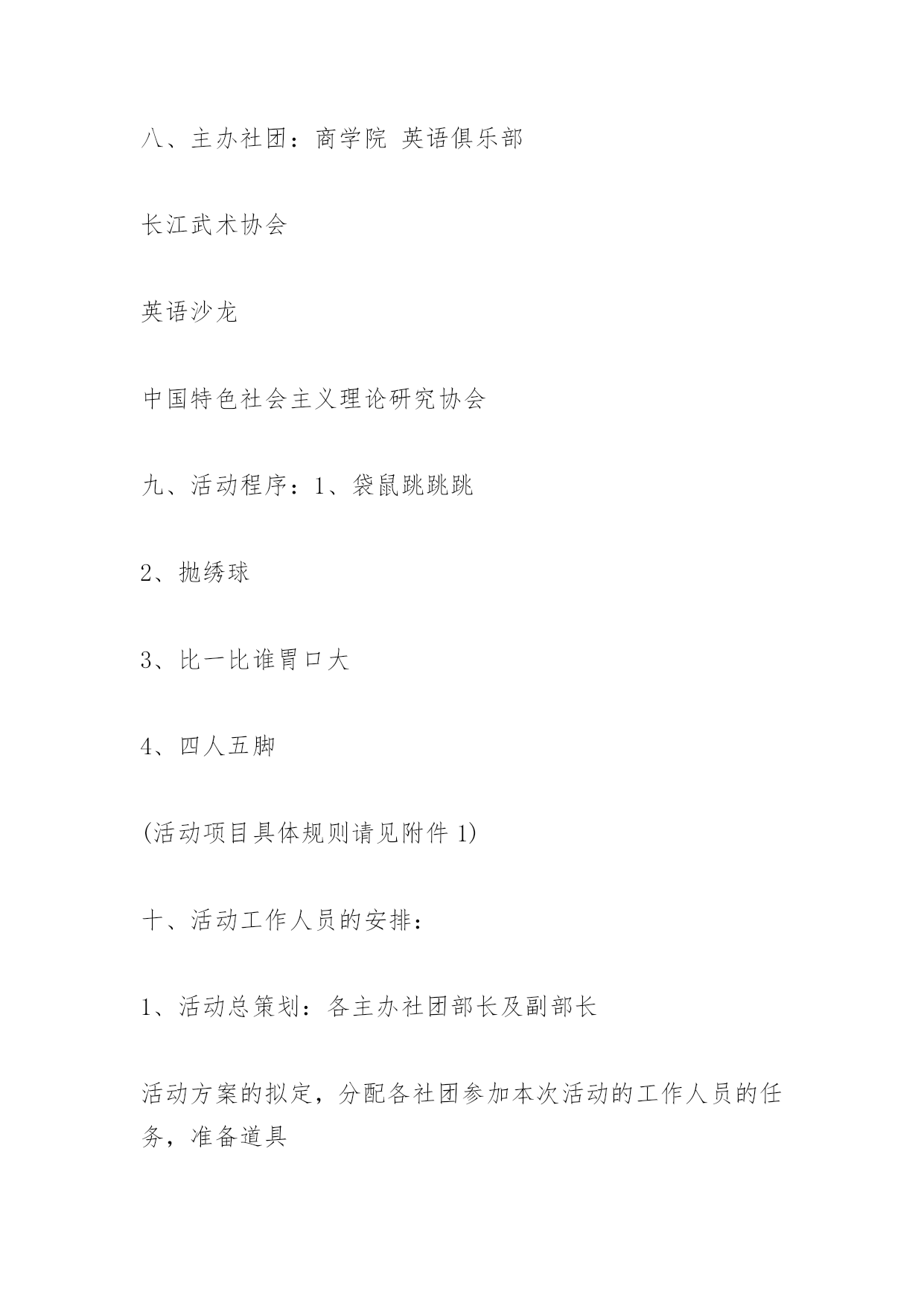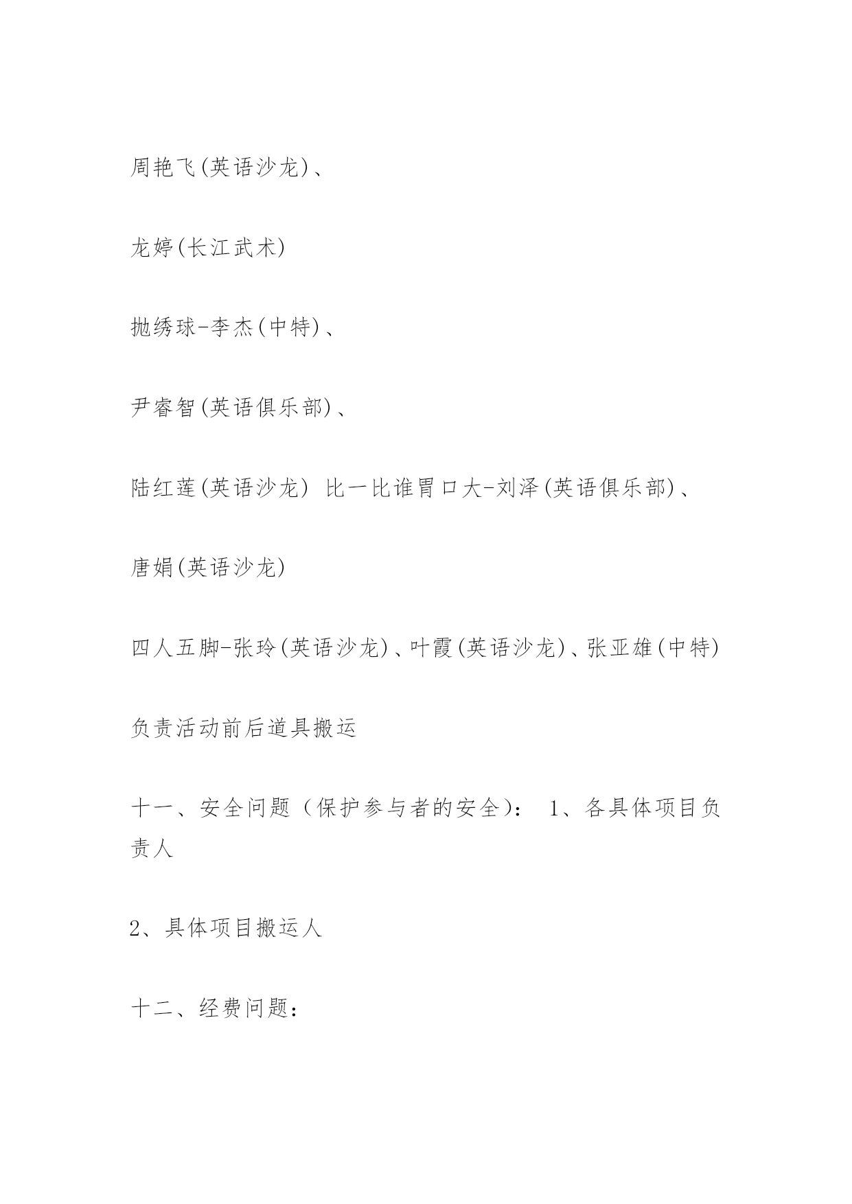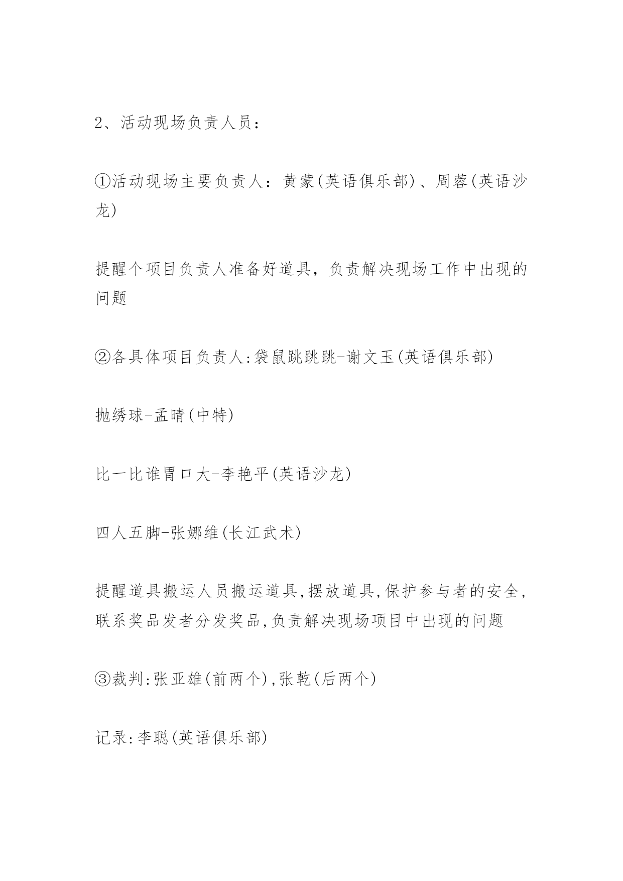 趣味运动会目的趣味运动会目的一、活动名称:趣味运动会二、参与主题:参与、健康、娱乐、和谐三、活动目的:为丰富我们的课外生活,培养积极参与的热情和团队合作意识,同时,促进校园文化氛围,特举办此次趣味运动会四、活动时间:2xx-x年5月的第一周(具体时间另行通知)五、活动地点:学校篮球场六、活动可参与的对象:湘潭职院学生七、报名方式:1、樟树林报名(5月的'第一周)周蓉(英语沙龙)﹑黄蒙(英语俱乐部)、邹丽萍(英语俱乐部)、郝艳艳(英语沙龙)、宋蓉(中特)2、活动现场报名八、主办社团:商学院英语俱乐部长江武术协会英语沙龙中国特色社会主义理论研究协会九、活动程序:1、袋鼠跳跳跳2、抛绣球3、比一比谁胃口大4、四人五脚(活动项目具体规则请见附件1)十、活动工作人员的安排:1、活动总策划:各主办社团部长及副部长活动方案的拟定,分配各社团参加本次活动的工作人员的任务,准备道具2、活动现场负责人员:①活动现场主要负责人:黄蒙(英语俱乐部)、周蓉(英语沙龙)提醒个项目负责人准备好道具,负责解决现场工作中出现的问题②各具体项目负责人:袋鼠跳跳跳-谢文玉(英语俱乐部)抛绣球-孟晴(中特)比一比谁胃口大-李艳平(英语沙龙)四人五脚-张娜维(长江武术)提醒道具搬运人员搬运道具,摆放道具,保护参与者的安全,联系奖品发者分发奖品,负责解决现场项目中出现的问题③裁判:张亚雄(前两个),张乾(后两个)记录:李聪(英语俱乐部)④主持人:李迎霞(中特),余欣(英语沙龙)⑤照相:黄蒙、周蓉⑥奖品购买:李春霞(中特)肖子君(英语俱乐部)曾燕鹏(英语沙龙)何永春(长江武术)⑦奖品分发者:刘琴(长江武术)、夏菲(英语俱乐部)、张雯雯(中特)3、活动宣传:1、板报:商学院宣传部2、通知:李思思(英语俱乐部)、霍然(英语俱乐部)4、道具搬运人员:①道具搬运负责人:王兵(长江武术)负责活动前后道具搬运,发放道具,存放道具②具体项目搬运人员:袋鼠跳跳跳-肖卫文(长江武术)、陆红莲(英语沙龙)周艳飞(英语沙龙)、龙婷(长江武术)抛绣球-李杰(中特)、尹睿智(英语俱乐部)、陆红莲(英语沙龙)比一比谁胃口大-刘泽(英语俱乐部)、唐娟(英语沙龙)四人五脚-张玲(英语沙龙)、叶霞(英语沙龙)、张亚雄(中特)负责活动前后道具搬运十一、安全问题(保护参与者的安全):1、各具体项目负责人2、具体项目搬运人十二、经费问题:道具:195.5元奖品:623.5元横幅:100元照片、打英板报:50元矿泉水:70元工作人员:34.5共计:1040元预祝本次活动取得圆满成功,感谢社联干部的支持与鼓励!