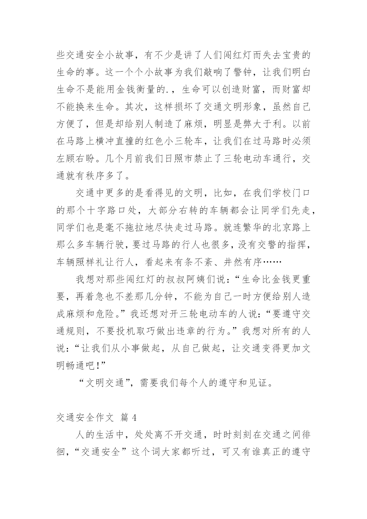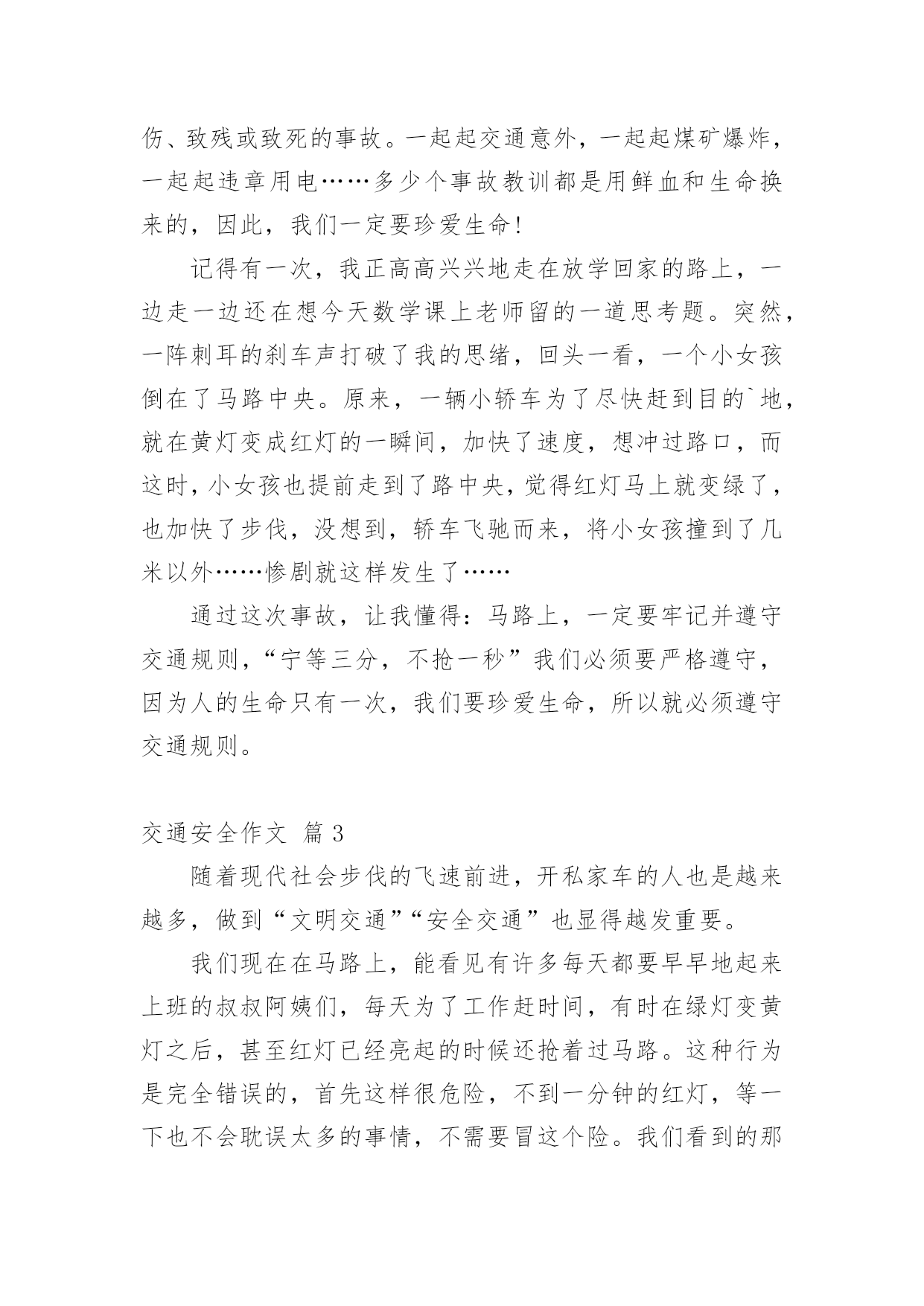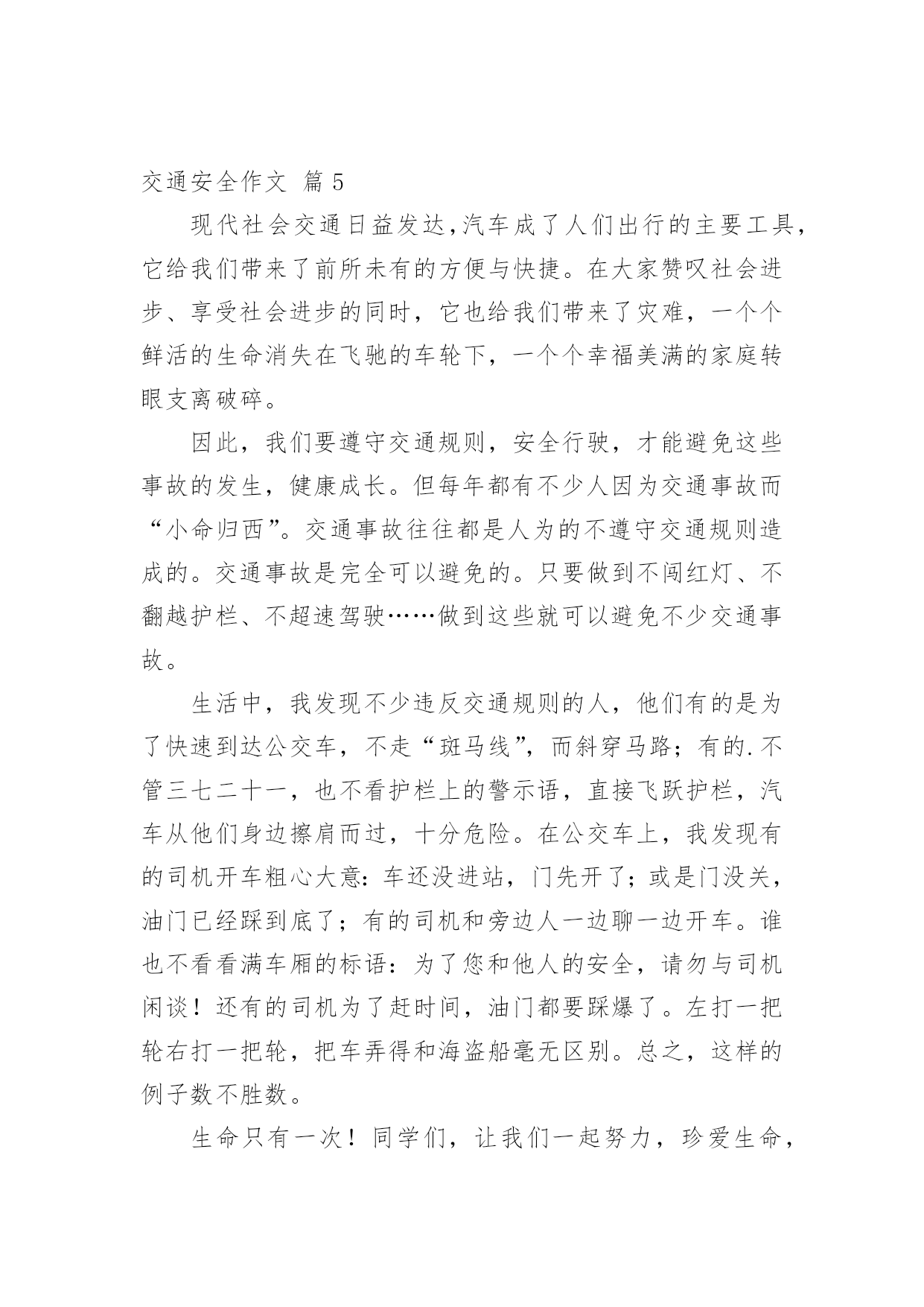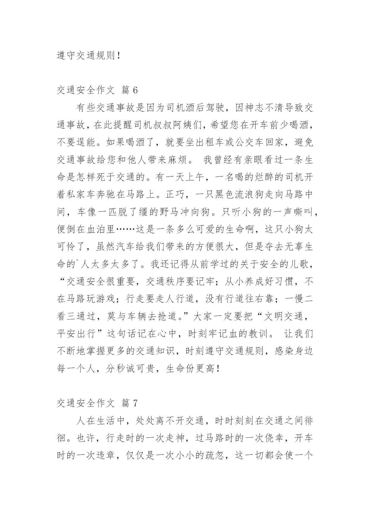 交通安全作文实用的交通安全作文范例[8篇]在日常学习、工作抑或是生活中,大家对作文都不陌生吧,作文根据写作时限的不同可以分为限时作文和非限时作文。如何写一篇有思想、有文采的作文呢?下面是小编为大家收集的交通安全作文8篇,供大家参考借鉴,希望可以帮助到有需要的朋友。交通安全作文篇1在我们身边,常常会发生一些交通事故,交通安全。在这些事故中,小到跌倒、大到身立,这些都是在提醒我们没一个人:必须时时刻刻注意交通安全!其实交通事故很多都是可以避免的。我们走路、骑车都要靠右边行走,我们过马路的时候左右看看,如果是十字路口要看“红绿灯”、如果没有“红绿灯”我们要看前后左右,不闯红灯,不要在马路上反架。交通安全作文篇2珍爱生命,关注交通安全在学校,老师经常告诉我们:要珍爱生命,遵守交通规则。不翻越栏杆,不横穿马路,不在马路上嬉戏、打闹,是我们必须要遵守的。因为人的生命是宝贵的,我们要珍爱它。在我们周围,时时刻刻都会发生因违反交通规则,而致伤、致残或致死的事故。一起起交通意外,一起起煤矿爆炸,一起起违章用电……多少个事故教训都是用鲜血和生命换来的,因此,我们一定要珍爱生命!记得有一次,我正高高兴兴地走在放学回家的路上,一边走一边还在想今天数学课上老师留的一道思考题。突然,一阵刺耳的刹车声打破了我的思绪,回头一看,一个小女孩倒在了马路中央。原来,一辆小轿车为了尽快赶到目的`地,就在黄灯变成红灯的一瞬间,加快了速度,想冲过路口,而这时,小女孩也提前走到了路中央,觉得红灯马上就变绿了,也加快了步伐,没想到,轿车飞驰而来,将小女孩撞到了几米以外……惨剧就这样发生了……通过这次事故,让我懂得:马路上,一定要牢记并遵守交通规则,“宁等三分,不抢一秒”我们必须要严格遵守,因为人的生命只有一次,我们要珍爱生命,所以就必须遵守交通规则。交通安全作文篇3随着现代社会步伐的飞速前进,开私家车的人也是越来越多,做到“文明交通”“安全交通”也显得越发重要。我们现在在马路上,能看见有许多每天都要早早地起来上班的叔叔阿姨们,每天为了工作赶时间,有时在绿灯变黄灯之后,甚至红灯已经亮起的时候还抢着过马路。这种行为是完全错误的,首先这样很危险,不到一分钟的红灯,等一下也不会耽误太多的事情,不需要冒这个险。我们看到的那些交通安全小故事,有不少是讲了人们闯红灯而失去宝贵的生命的事。这一个个小故事为我们敲响了警钟,让我们明白生命不是能用金钱衡量的.,生命可以创造财富,而财富却不能换来生命。其次,这样损坏了交通文明形象,虽然自己方便了,但是却给别人制造了麻烦,明显是弊大于利。以前在马路上横冲直撞的红色小三轮车,让我们在过马路时必须左顾右盼。几个月前我们日照市禁止了三轮电动车通行,交通就有秩序多了。交通中更多的是看得见的文明,比如,在我们学校门口的那个十字路口处,大部分右转的车辆都会让同学们先走,同学们也是毫不拖拉地尽快走过马路。就连繁华的北京路上那么多车辆行驶,要过马路的行人也很多,没有交警的指挥,车辆照样礼让行人,看起来有条不紊、井然有序……我想对那些闯红灯的叔叔阿姨们说:“生命比金钱更重要,再着急也不差那几分钟,不能为自己一时方便给别人造成麻烦和危险。”我还想对开三轮电动车的人说:“要遵守交通规则,不要投机取巧做出违章的行为。”我想对所有的人说:“让我们从小事做起,从自己做起,让交通变得更加文明畅通吧!”“文明交通”,需要我们每个人的遵守和见证。交通安全作文篇4人的生活中,处处离不开交通,时时刻刻在交通之间徘徊,“交通安全”这个词大家都听过,可又有谁真正的遵守了呢?也许,一刹那的疏忽,会给你带来终身的遗憾。因此,为了朋友,为了家人,为了自己,我们应该遵守交通,做一个知法、守法的好公民。就拿我姑父说吧,他是一位货车司机,整天都要拉货。可这又有什么办法呢,还不是为了挣钱,有一次,姑父在拉货的途中车出了故障,他就只好把货车停在路边,给货车的反光镜帮上一大把红线,提醒人们他在修车。姑父以为车修好了,就把大红线收起并试试发动货车,可谁叫这么倒霉呢。车还没修好,姑父只好又钻到车底下修车。俗话说得好“不怕一万,就怕万一”呀,姑父居然忘了挂大红线!不料这时,一位喝了酒的货车司机驾驶货车从后面撞了上来。就这样,我那才30多岁的姑父去世了。这件血淋淋的事实在我们的眼前一闪而过,可那悲痛的情景却铭刻于心,那是血的挣扎,那是痛苦的'泪痕,那是同情的目光。在一次次恶剧不断重演之时,我们是否有所体会,难道不应该为此而珍惜宝贵的生命吗?也许他们死不瞑目,在黑暗中,那哀叹永不停息。也许,他们在告诫我们:应该注意交通安全,珍惜拥有。这是他们唯一的话语,这是他们一生中最为精典的佳话。他们已深深领悟到生命的脆弱与顽强,它取决于你对它的珍惜。生命只有一次,我们大家都必须去呵护它,我们共同生活在社会这个大家庭里,因为有