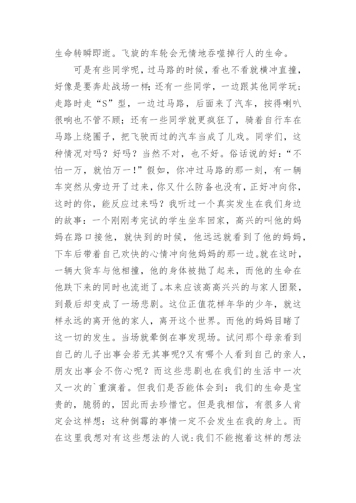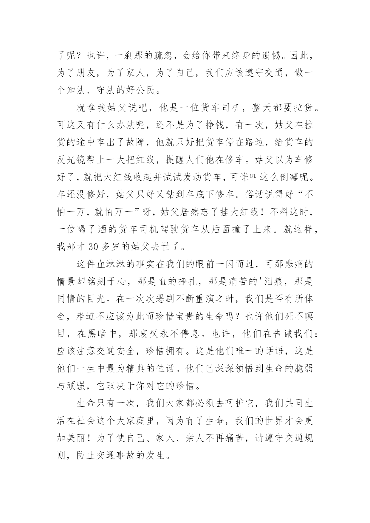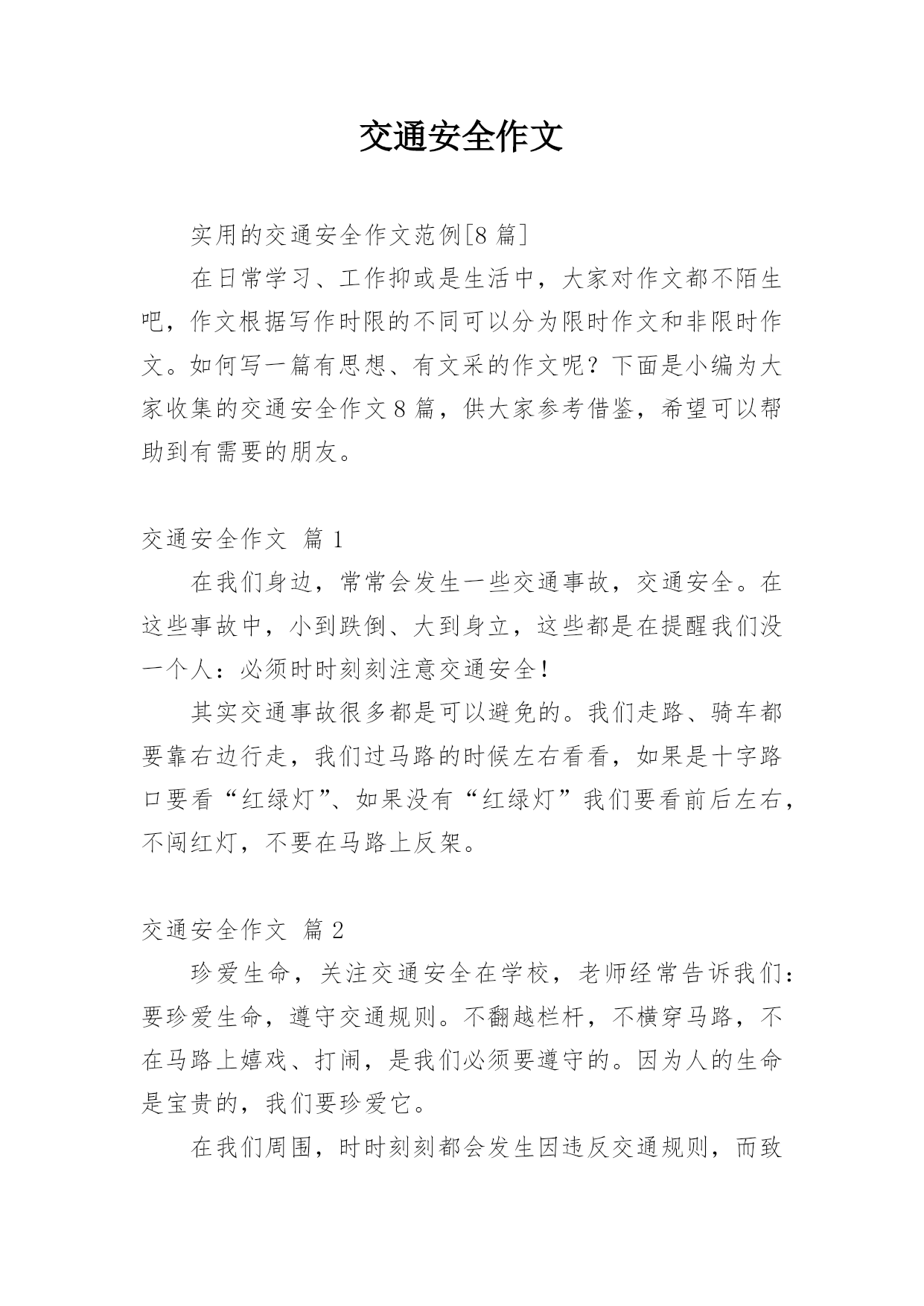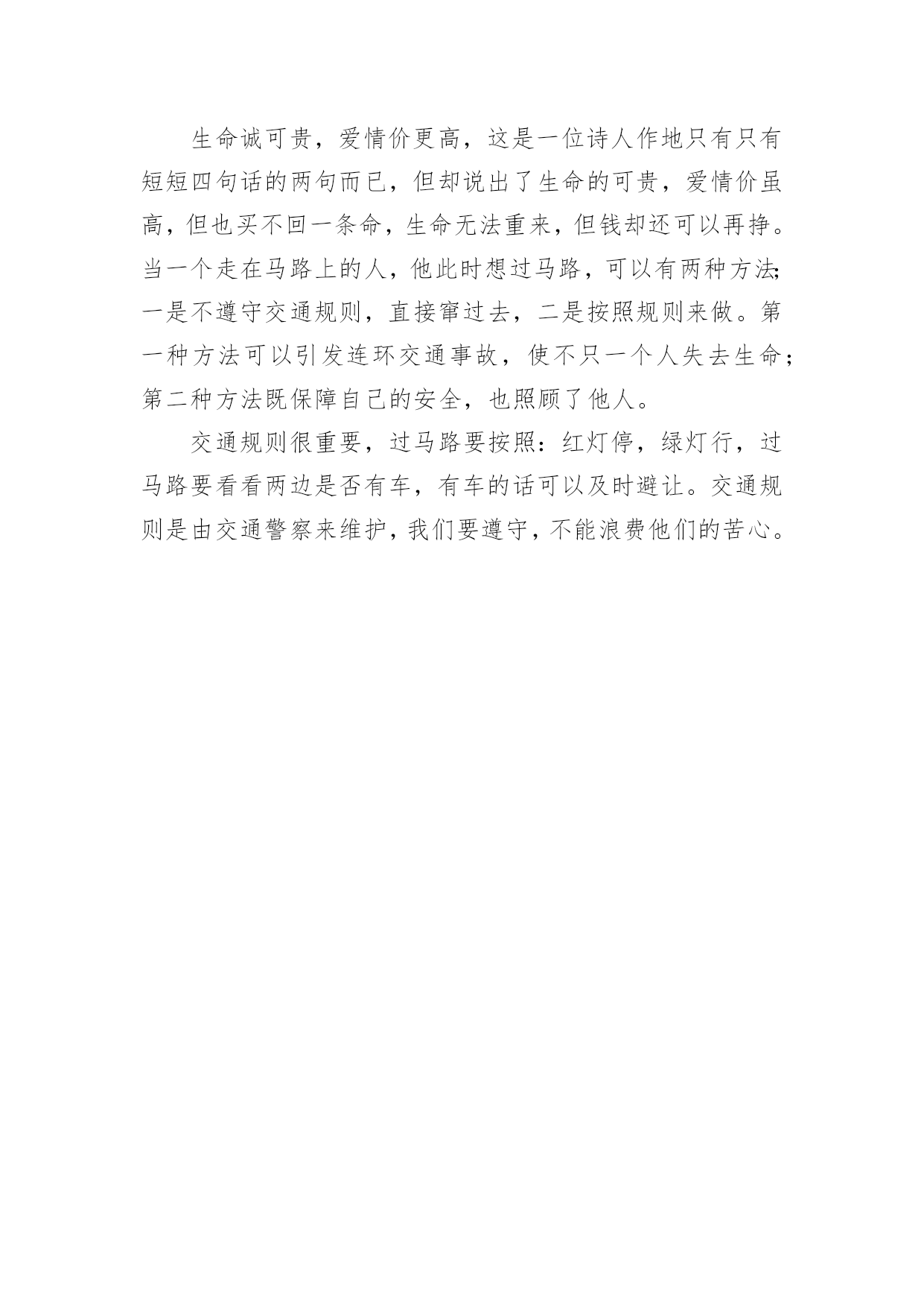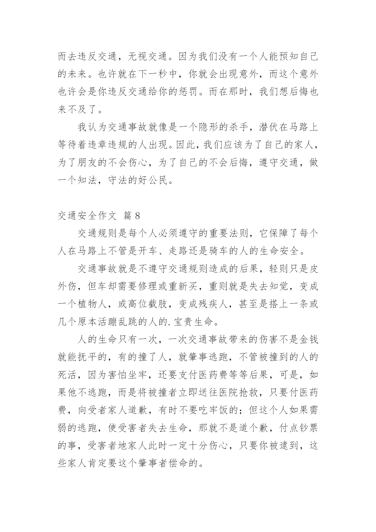 交通安全作文实用的交通安全作文范例[8篇]在日常学习、工作抑或是生活中,大家对作文都不陌生吧,作文根据写作时限的不同可以分为限时作文和非限时作文。如何写一篇有思想、有文采的作文呢?下面是小编为大家收集的交通安全作文8篇,供大家参考借鉴,希望可以帮助到有需要的朋友。交通安全作文篇1在我们身边,常常会发生一些交通事故,交通安全。在这些事故中,小到跌倒、大到身立,这些都是在提醒我们没一个人:必须时时刻刻注意交通安全!其实交通事故很多都是可以避免的。我们走路、骑车都要靠右边行走,我们过马路的时候左右看看,如果是十字路口要看“红绿灯”、如果没有“红绿灯”我们要看前后左右,不闯红灯,不要在马路上反架。交通安全作文篇2珍爱生命,关注交通安全在学校,老师经常告诉我们:要珍爱生命,遵守交通规则。不翻越栏杆,不横穿马路,不在马路上嬉戏、打闹,是我们必须要遵守的。因为人的生命是宝贵的,我们要珍爱它。在我们周围,时时刻刻都会发生因违反交通规则,而致伤、致残或致死的事故。一起起交通意外,一起起煤矿爆炸,一起起违章用电……多少个事故教训都是用鲜血和生命换来的,因此,我们一定要珍爱生命!记得有一次,我正高高兴兴地走在放学回家的路上,一边走一边还在想今天数学课上老师留的一道思考题。突然,一阵刺耳的刹车声打破了我的思绪,回头一看,一个小女孩倒在了马路中央。原来,一辆小轿车为了尽快赶到目的`地,就在黄灯变成红灯的一瞬间,加快了速度,想冲过路口,而这时,小女孩也提前走到了路中央,觉得红灯马上就变绿了,也加快了步伐,没想到,轿车飞驰而来,将小女孩撞到了几米以外……惨剧就这样发生了……通过这次事故,让我懂得:马路上,一定要牢记并遵守交通规则,“宁等三分,不抢一秒”我们必须要严格遵守,因为人的生命只有一次,我们要珍爱生命,所以就必须遵守交通规则。交通安全作文篇3随着现代社会步伐的飞速前进,开私家车的人也是越来越多,做到“文明交通”“安全交通”也显得越发重要。我们现在在马路上,能看见有许多每天都要早早地起来上班的叔叔阿姨们,每天为了工作赶时间,有时在绿灯变黄灯之后,甚至红灯已经亮起的时候还抢着过马路。这种行为是完全错误的,首先这样很危险,不到一分钟的红灯,等一下也不会耽误太多的事情,不需要冒这个险。我们看到的那些交通安全小故事,有不少是讲了人们闯红灯而失去宝贵的生命的事。这一个个小故事为我们敲响了警钟,让我们明白生命不是能用金钱衡量的.,生命可以创造财富,而财富却不能换来生命。其次,这样损坏了交通文明形象,虽然自己方便了,但是却给别人制造了麻烦,明显是弊大于利。以前在马路上横冲直撞的红色小三轮车,让我们在过马路时必须左顾右盼。几个月前我们日照市禁止了三轮电动车通行,交通就有秩序多了。交通中更多的是看得见的文明,比如,在我们学校门口的那个十字路口处,大部分右转的车辆都会让同学们先走,同学们也是毫不拖拉地尽快走过马路。就连繁华的北京路上那么多车辆行驶,要过马路的行人也很多,没有交警的指挥,车辆照样礼让行人,看起来有条不紊、井然有序……我想对那些闯红灯的叔叔阿姨们说:“生命比金钱更重要,再着急也不差那几分钟,不能为自己一时方便给别人造成麻烦和危险。”我还想对开三轮电动车的人说:“要遵守交通规则,不要投机取巧做出违章的行为。”我想对所有的人说:“让我们从小事做起,从自己做起,让交通变得更加文明畅通吧!”“文明交通”,需要我们每个人的遵守和见证。交通安全作文篇4人的生活中,处处离不开交通,时时刻刻在交通之间徘徊,“交通安全”这个词大家都听过,可又有谁真正的遵守了呢?也许,一刹那的疏忽,会给你带来终身的遗憾。因此,为了朋友,为了家人,为了自己,我们应该遵守交通,做一个知法、守法的好公民。就拿我姑父说吧,他是一位货车司机,整天都要拉货。可这又有什么办法呢,还不是为了挣钱,有一次,姑父在拉货的途中车出了故障,他就只好把货车停在路边,给货车的反光镜帮上一大把红线,提醒人们他在修车。姑父以为车修好了,就把大红线收起并试试发动货车,可谁叫这么倒霉呢。车还没修好,姑父只好又钻到车底下修车。俗话说得好“不怕一万,就怕万一”呀,姑父居然忘了挂大红线!不料这时,一位喝了酒的货车司机驾驶货车从后面撞了上来。就这样,我那才30多岁的姑父去世了。这件血淋淋的事实在我们的眼前一闪而过,可那悲痛的情景却铭刻于心,那是血的挣扎,那是痛苦的'泪痕,那是同情的目光。在一次次恶剧不断重演之时,我们是否有所体会,难道不应该为此而珍惜宝贵的生命吗?也许他们死不瞑目,在黑暗中,那哀叹永不停息。也许,他们在告诫我们:应该注意交通安全,珍惜拥有。这是他们唯一的话语,这是他们一生中最为精典的佳话。他们已深深领悟到生命的脆弱与顽强,它取决于你对它的珍惜。生命只有一次,我们大家都必须去呵护它,我们共同生活在社会这个大家庭里,因为有