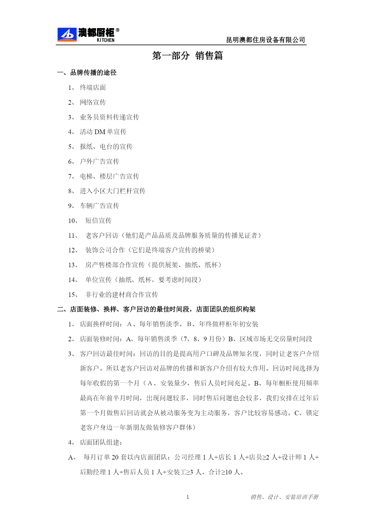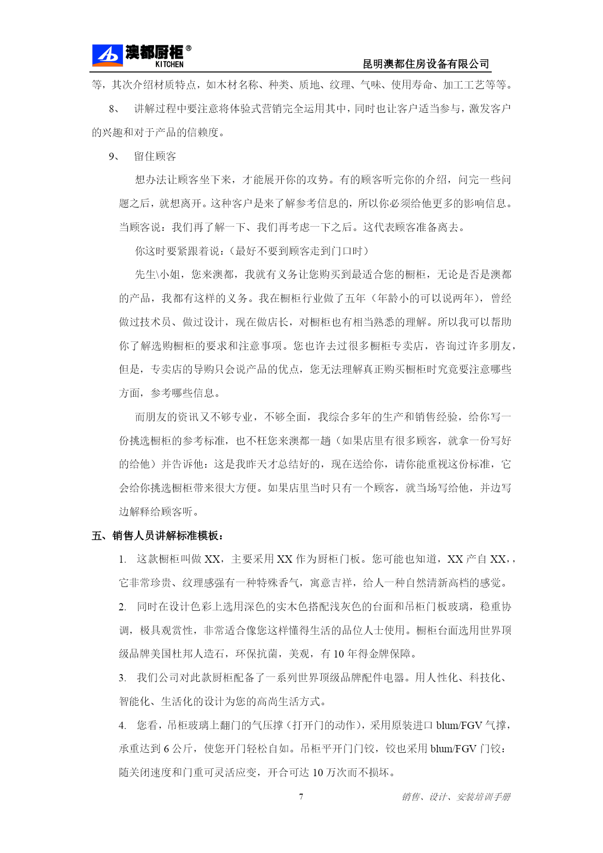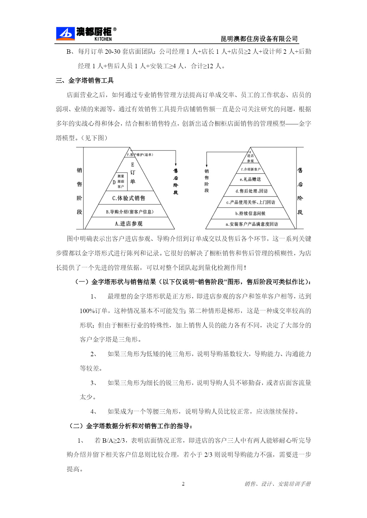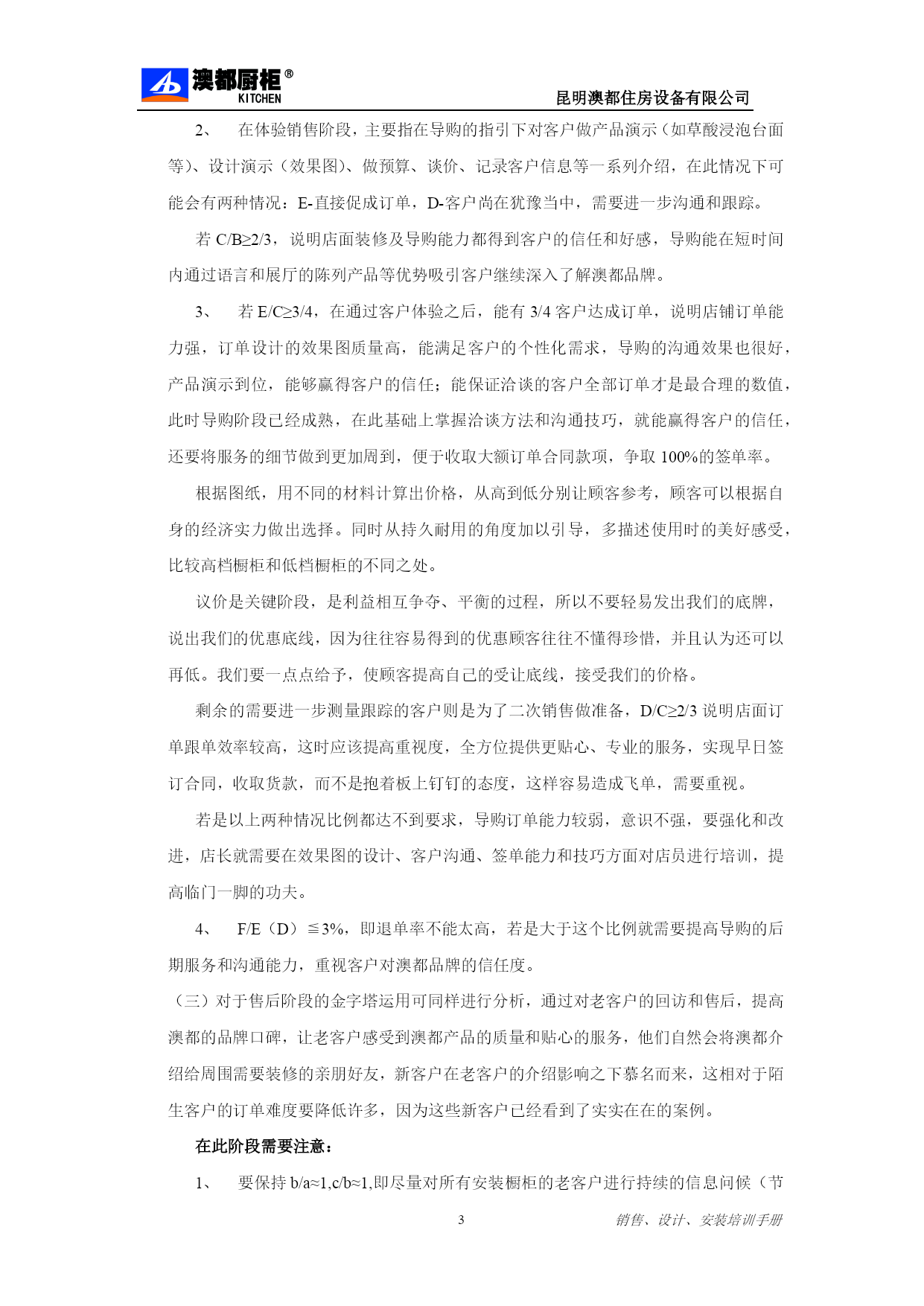 PAGE目录第一部分销售篇一、品牌传播的途径二、店面装修、换样、客户回访的最佳时间段,店面团队的组织构架三、金字塔销售工具四、顾客信任分量五、销售人员讲解标准模板:六、如何识别竞争对手调查市场或假客户七、如何识别准客户八、掌握成交技巧九、实战案例十、拜访客户十一、单位团购销售流程第二部分设计篇一、厨柜的设计风格二、设计师工作三、橱柜设计要考虑的问题四、一般厨房设计要满足的功能要求五、一般设计应注意的问题六、设计要方便橱柜安装七、合理设计:八、橱柜柜门的设计:九、澳都橱柜柜体、抽屉样式设计参考十、烟机、水盆及五金设计尺寸参考第三部分安装篇安装的准备工作地柜安装:二、吊柜安装:三、台板安装:Ⅰ台面工艺标准Ⅱ台面安装基本要求:Ⅲ台板安装流程:四、拉篮安装:五、灶具电器安装:六、水槽安装:七、注意事项八、验收标准第四部分售后服务第一章橱柜使用须知第二章橱柜保养与清洁第三章厨柜常规问题分析及处理办法第四章电器售后常规问题分析及处理办法第五章上门咨询、保养、移机(安装)、维修费用价目表昆明澳都住房设备有限公司PAGE64销售、设计、安装培训手册第一部分销售篇一、品牌传播的途径终端店面网络宣传业务员资料传递宣传活动DM单宣传报纸、电台的宣传户外广告宣传电梯、楼层广告宣传进入小区大门栏杆宣传车辆广告宣传短信宣传老客户回访(他们是产品品质及品牌服务质量的传播见证者)装饰公司合作(它们是终端客户宣传的桥梁)房产售楼部合作宣传(提供展架、抽纸、纸杯)单位宣传(抽纸、纸杯,要考虑时间段)非行业的建材商合作宣传二、店面装修、换样、客户回访的最佳时间段,店面团队的组织构架店面换样时间:A、每年销售淡季。B、年终做样柜年初安装店面装修时间:A、每年销售淡季(7、8、9月份)B、区域市场无交房量时间段客户回访最佳时间:回访的目的是提高用户口碑及品牌知名度,同时让老客户介绍新客户。所以老客户回访对品牌的传播和新客户介绍有较大作用。回访时间选择为每年收假的第一个月(A、安装量少,售后人员时间充足。B、每年橱柜使用频率最高在年前半月时间,出现问题较多,同时售后问题也会较多,我们安排在过年后第一个月做售后回访就会从被动服务变为主动服务,客户比较容易感动。C、锁定老客户身边一年新朋友做装修客户群体)店面团队组建:每月订单20套以内店面团队:公司经理1人+店长1人+店员≥2人+设计师1人+后勤经理1人+售后人员1人+安装工≥3人,合计≥10人。每月订单20-30套店面团队:公司经理1人+店长1人+店员≥2人+设计师2人+后勤经理1人+售后人员1人+安装工≥4人,合计≥12人。三、金字塔销售工具店面营业之后,如何通过专业销售管理方法提高订单成交率、员工的工作状态、店员的弱项、业绩的来源等,通过有效销售工具提升店铺销售额一直是公司关注研究的问题,根据多年的实战心得和体会,结合橱柜销售特点,创新出适合橱柜店面销售的管理模型——金字塔模型。(见下图)图中明确表示出客户进店参观、导购介绍到订单成交以及售后各个环节,这一系列关键步骤都以金字塔形式进行陈列和记录。它很好的解决了橱柜销售和售后管理的模糊性,为店长提供了一个先进的管理依据,可以对整个团队起到量化检测作用!(一)金字塔形状与销售结果(以下仅说明“销售阶段”图形,售后阶段可类似作比):最理想的金字塔形状是正方形,即进店参观的客户和签单客户相等,达到100%订单,这种情况基本不可能发生;第二种情形是梯形,这是一种成交率较高的形状;但由于橱柜行业的特殊性,加上销售人员的能力各有不同,决定了大部分的客户金字塔是三角形。如果三角形为低矮的钝三角形,说明导购基数较大,导购能力、沟通能力等较差。如果三角形为细长的锐三角形,说明导购人员不够勤奋,或者店面客流量太少。如果成为一个等腰三角形,说明导购人员比较正常,应该继续保持。(二)金字塔数据分析和对销售工作的指导:若B/A≥2/3,表明店面情况正常,即进店的客户三人中有两人能够耐心听完导购介绍并留下相关客户信息则比较合理,若小于2/3则说明导购能力不强,需要进一步提高。在体验销售阶段,主要指在导购的指引下对客户做产品演示(如草酸浸泡台面等)、设计演示(效果图)、做预算、谈价、记录客户信息等一系列介绍,在此情况下可能会有两种情况:E-直接促成订单,D-客户尚在犹豫当中,需要进一步沟通和跟踪。若C/B≥2/3,说明店面装修及导购能力都得到客户的信任和好感,导购能在短时间内通过语言和展厅的陈列产品等优势吸引客户继续深入了解澳都品牌。若E/C≥3/4,在通过客户体验之后,能有3/4客户达成订单,说明店铺订单能力强,订