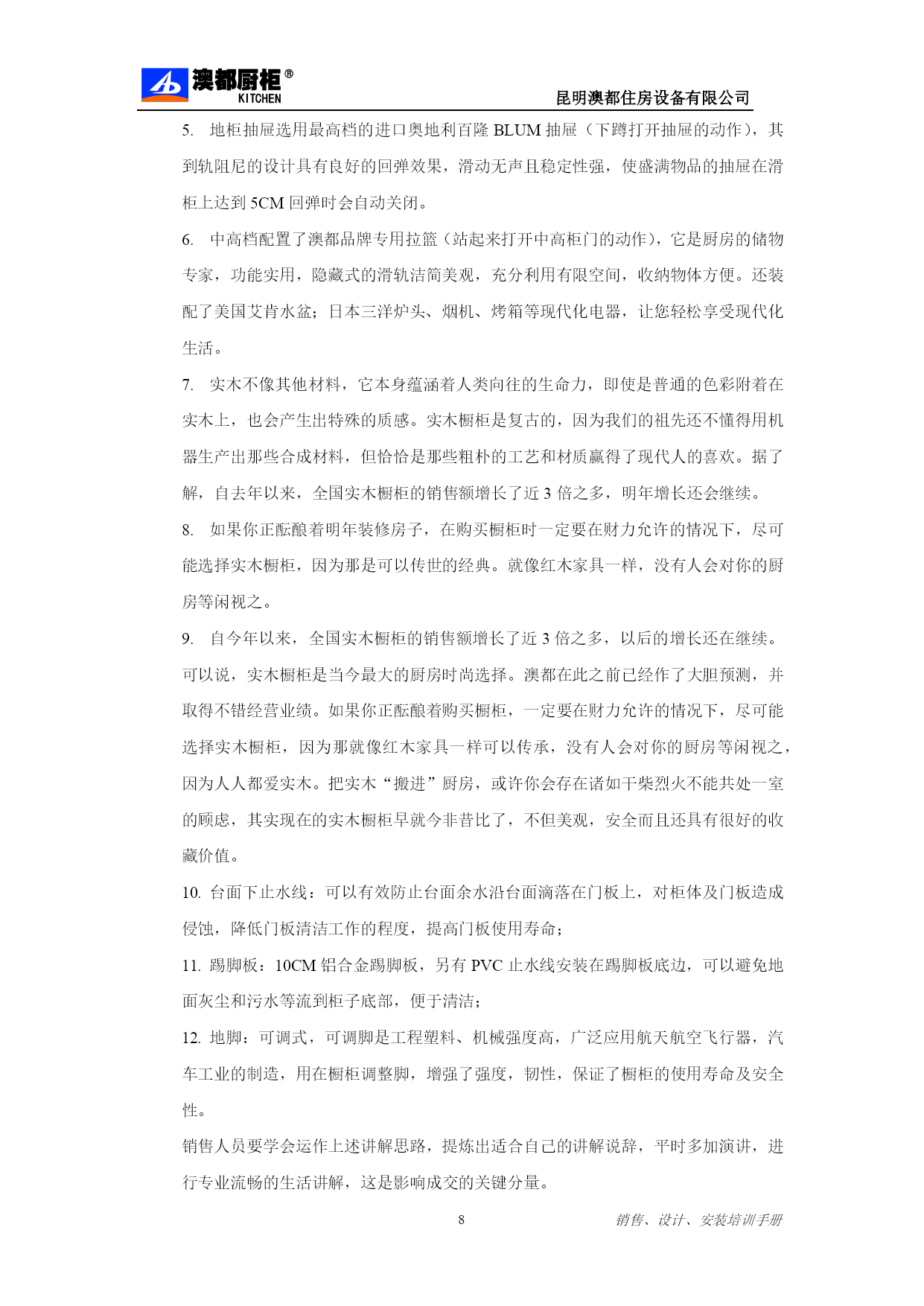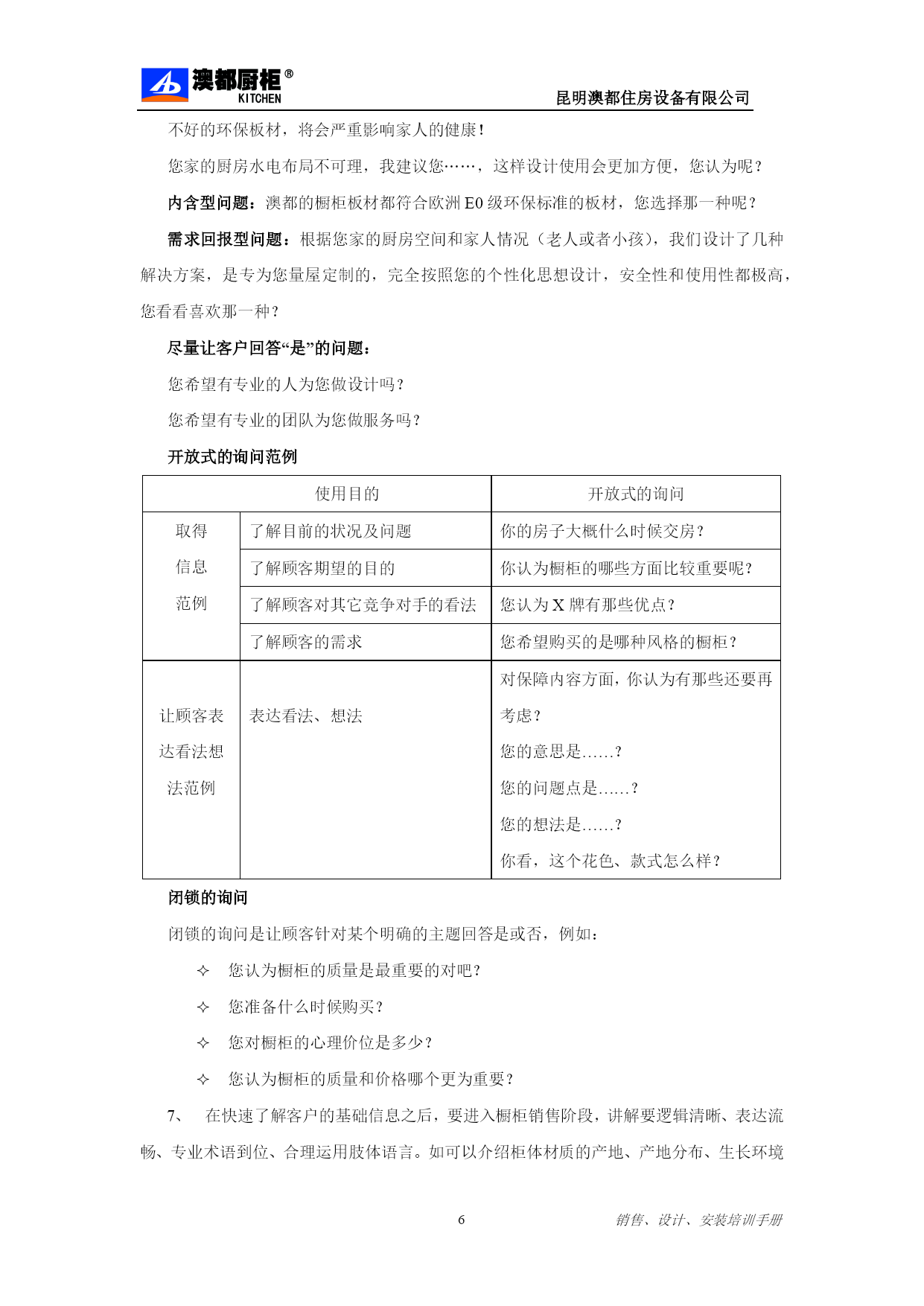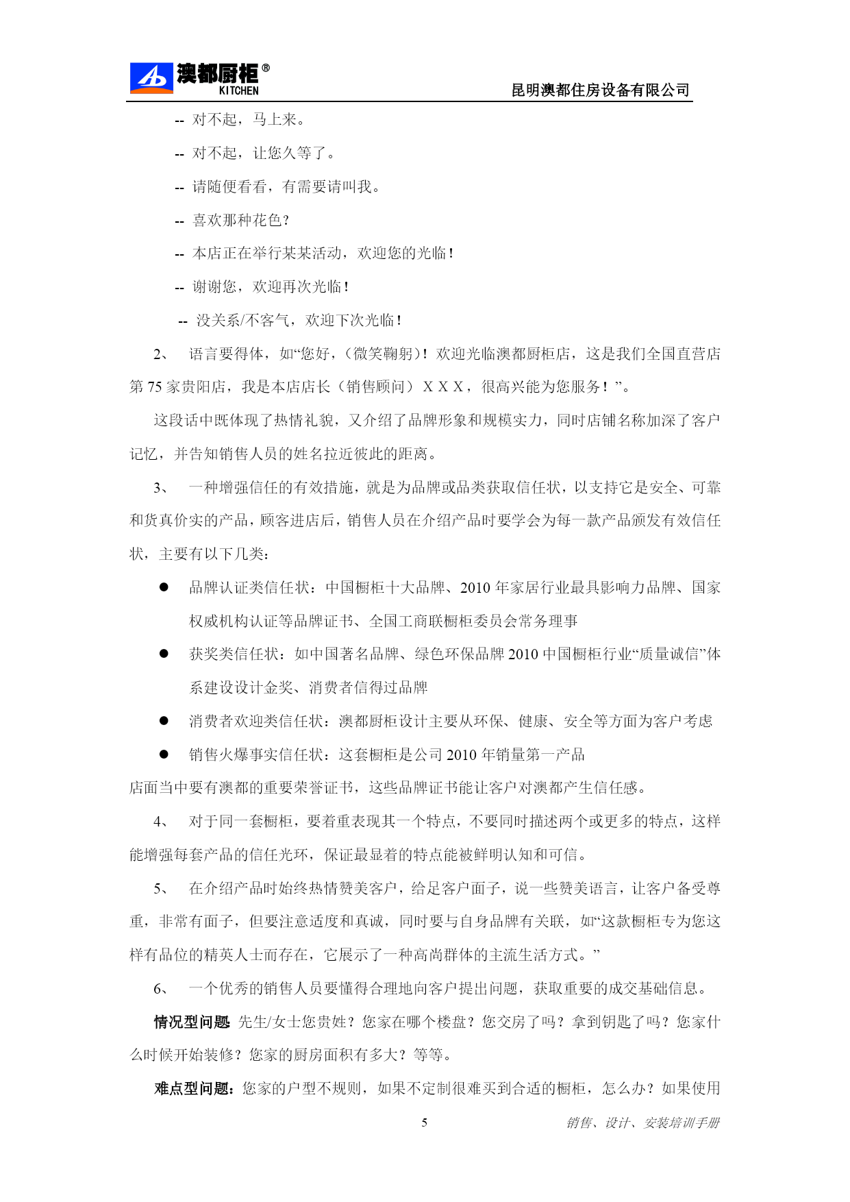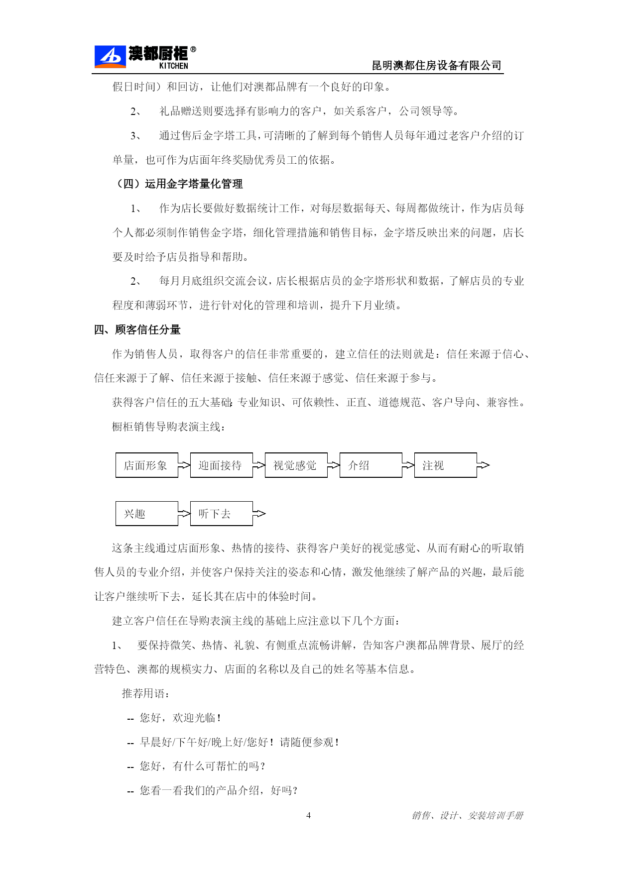 PAGE目录第一部分销售篇一、品牌传播的途径二、店面装修、换样、客户回访的最佳时间段,店面团队的组织构架三、金字塔销售工具四、顾客信任分量五、销售人员讲解标准模板:六、如何识别竞争对手调查市场或假客户七、如何识别准客户八、掌握成交技巧九、实战案例十、拜访客户十一、单位团购销售流程第二部分设计篇一、厨柜的设计风格二、设计师工作三、橱柜设计要考虑的问题四、一般厨房设计要满足的功能要求五、一般设计应注意的问题六、设计要方便橱柜安装七、合理设计:八、橱柜柜门的设计:九、澳都橱柜柜体、抽屉样式设计参考十、烟机、水盆及五金设计尺寸参考第三部分安装篇安装的准备工作地柜安装:二、吊柜安装:三、台板安装:Ⅰ台面工艺标准Ⅱ台面安装基本要求:Ⅲ台板安装流程:四、拉篮安装:五、灶具电器安装:六、水槽安装:七、注意事项八、验收标准第四部分售后服务第一章橱柜使用须知第二章橱柜保养与清洁第三章厨柜常规问题分析及处理办法第四章电器售后常规问题分析及处理办法第五章上门咨询、保养、移机(安装)、维修费用价目表昆明澳都住房设备有限公司PAGE64销售、设计、安装培训手册第一部分销售篇一、品牌传播的途径终端店面网络宣传业务员资料传递宣传活动DM单宣传报纸、电台的宣传户外广告宣传电梯、楼层广告宣传进入小区大门栏杆宣传车辆广告宣传短信宣传老客户回访(他们是产品品质及品牌服务质量的传播见证者)装饰公司合作(它们是终端客户宣传的桥梁)房产售楼部合作宣传(提供展架、抽纸、纸杯)单位宣传(抽纸、纸杯,要考虑时间段)非行业的建材商合作宣传二、店面装修、换样、客户回访的最佳时间段,店面团队的组织构架店面换样时间:A、每年销售淡季。B、年终做样柜年初安装店面装修时间:A、每年销售淡季(7、8、9月份)B、区域市场无交房量时间段客户回访最佳时间:回访的目的是提高用户口碑及品牌知名度,同时让老客户介绍新客户。所以老客户回访对品牌的传播和新客户介绍有较大作用。回访时间选择为每年收假的第一个月(A、安装量少,售后人员时间充足。B、每年橱柜使用频率最高在年前半月时间,出现问题较多,同时售后问题也会较多,我们安排在过年后第一个月做售后回访就会从被动服务变为主动服务,客户比较容易感动。C、锁定老客户身边一年新朋友做装修客户群体)店面团队组建:每月订单20套以内店面团队:公司经理1人+店长1人+店员≥2人+设计师1人+后勤经理1人+售后人员1人+安装工≥3人,合计≥10人。每月订单20-30套店面团队:公司经理1人+店长1人+店员≥2人+设计师2人+后勤经理1人+售后人员1人+安装工≥4人,合计≥12人。三、金字塔销售工具店面营业之后,如何通过专业销售管理方法提高订单成交率、员工的工作状态、店员的弱项、业绩的来源等,通过有效销售工具提升店铺销售额一直是公司关注研究的问题,根据多年的实战心得和体会,结合橱柜销售特点,创新出适合橱柜店面销售的管理模型——金字塔模型。(见下图)图中明确表示出客户进店参观、导购介绍到订单成交以及售后各个环节,这一系列关键步骤都以金字塔形式进行陈列和记录。它很好的解决了橱柜销售和售后管理的模糊性,为店长提供了一个先进的管理依据,可以对整个团队起到量化检测作用!(一)金字塔形状与销售结果(以下仅说明“销售阶段”图形,售后阶段可类似作比):最理想的金字塔形状是正方形,即进店参观的客户和签单客户相等,达到100%订单,这种情况基本不可能发生;第二种情形是梯形,这是一种成交率较高的形状;但由于橱柜行业的特殊性,加上销售人员的能力各有不同,决定了大部分的客户金字塔是三角形。如果三角形为低矮的钝三角形,说明导购基数较大,导购能力、沟通能力等较差。如果三角形为细长的锐三角形,说明导购人员不够勤奋,或者店面客流量太少。如果成为一个等腰三角形,说明导购人员比较正常,应该继续保持。(二)金字塔数据分析和对销售工作的指导:若B/A≥2/3,表明店面情况正常,即进店的客户三人中有两人能够耐心听完导购介绍并留下相关客户信息则比较合理,若小于2/3则说明导购能力不强,需要进一步提高。在体验销售阶段,主要指在导购的指引下对客户做产品演示(如草酸浸泡台面等)、设计演示(效果图)、做预算、谈价、记录客户信息等一系列介绍,在此情况下可能会有两种情况:E-直接促成订单,D-客户尚在犹豫当中,需要进一步沟通和跟踪。若C/B≥2/3,说明店面装修及导购能力都得到客户的信任和好感,导购能在短时间内通过语言和展厅的陈列产品等优势吸引客户继续深入了解澳都品牌。若E/C≥3/4,在通过客户体验之后,能有3/4客户达成订单,说明店铺订单能力强,订