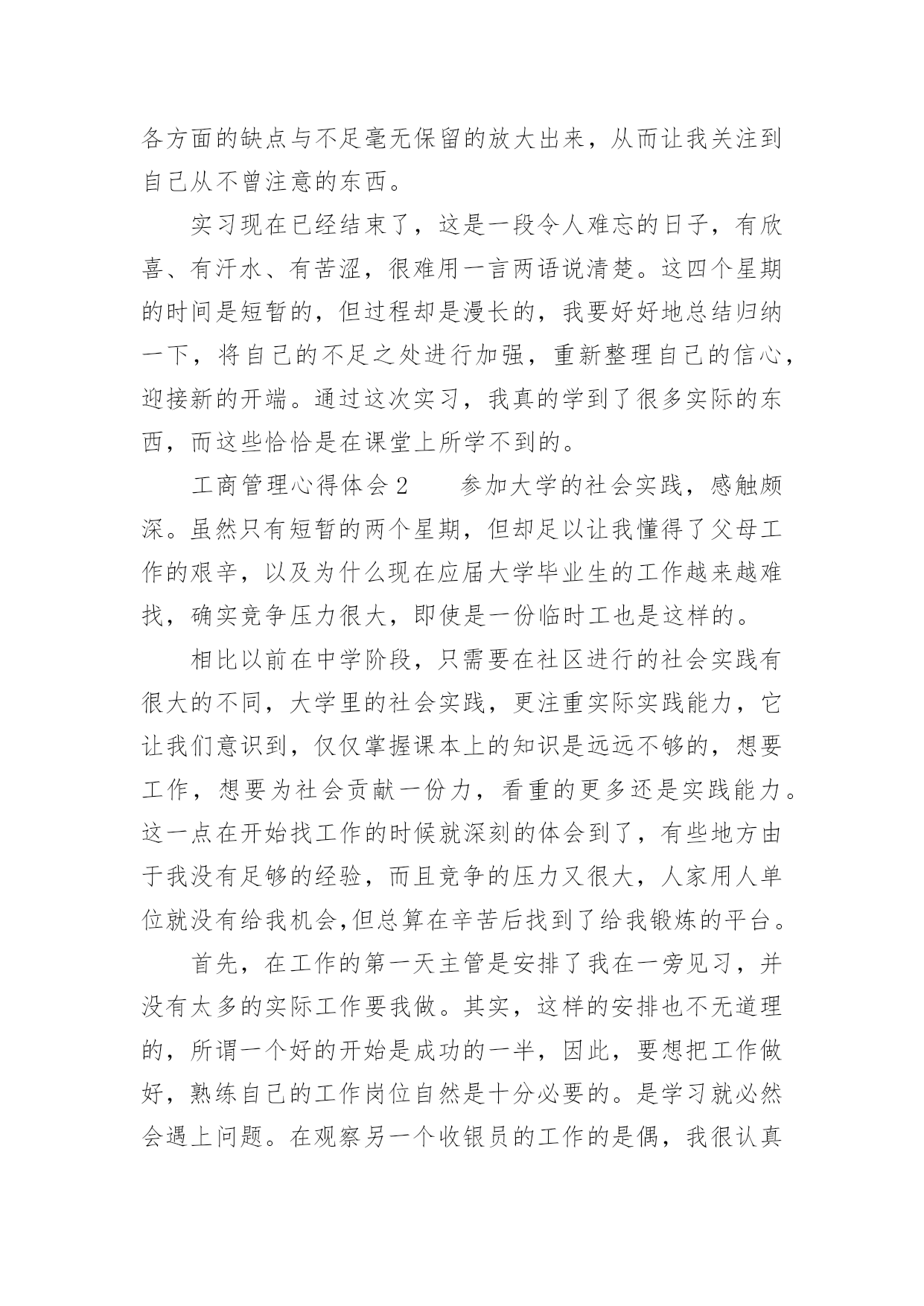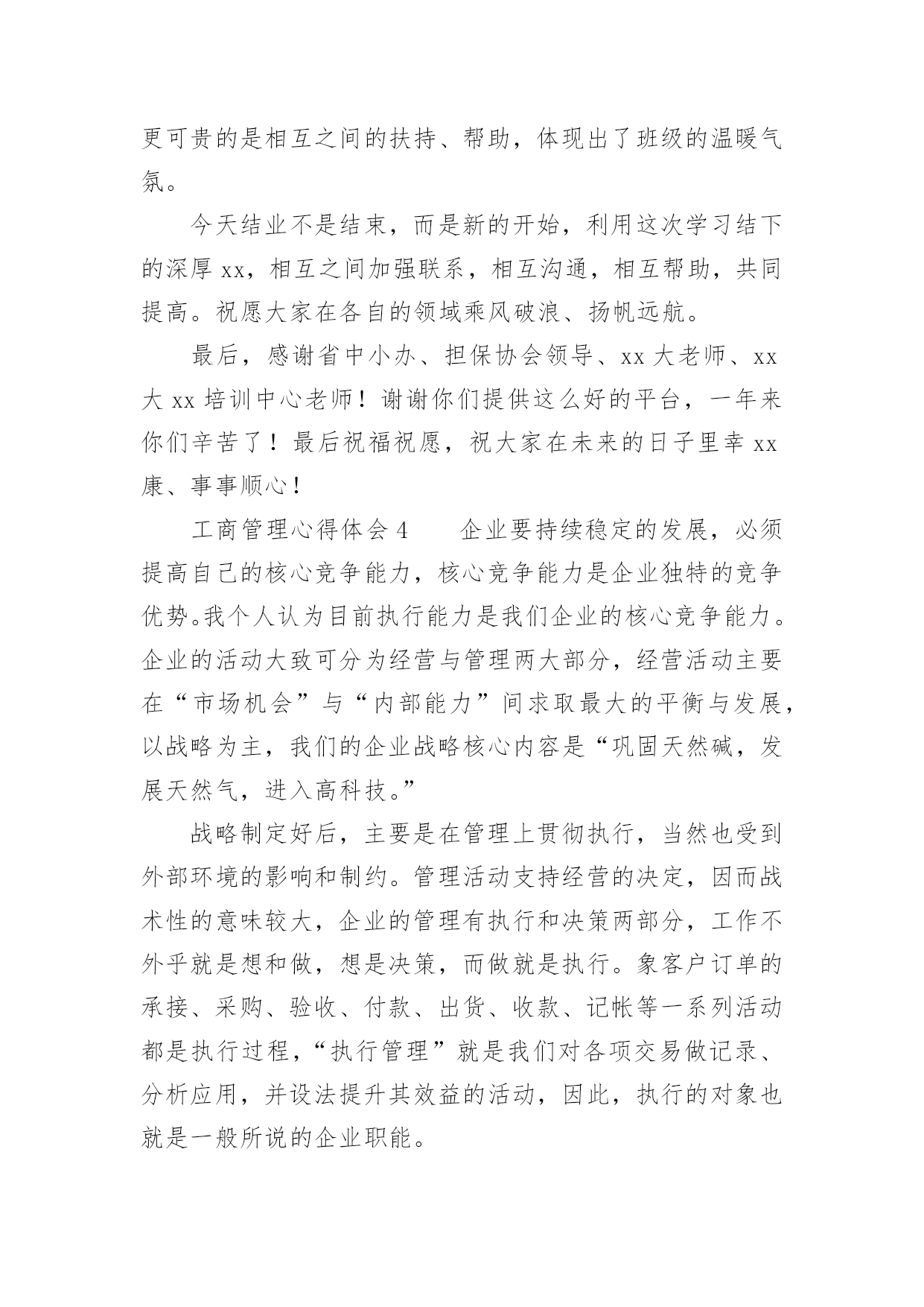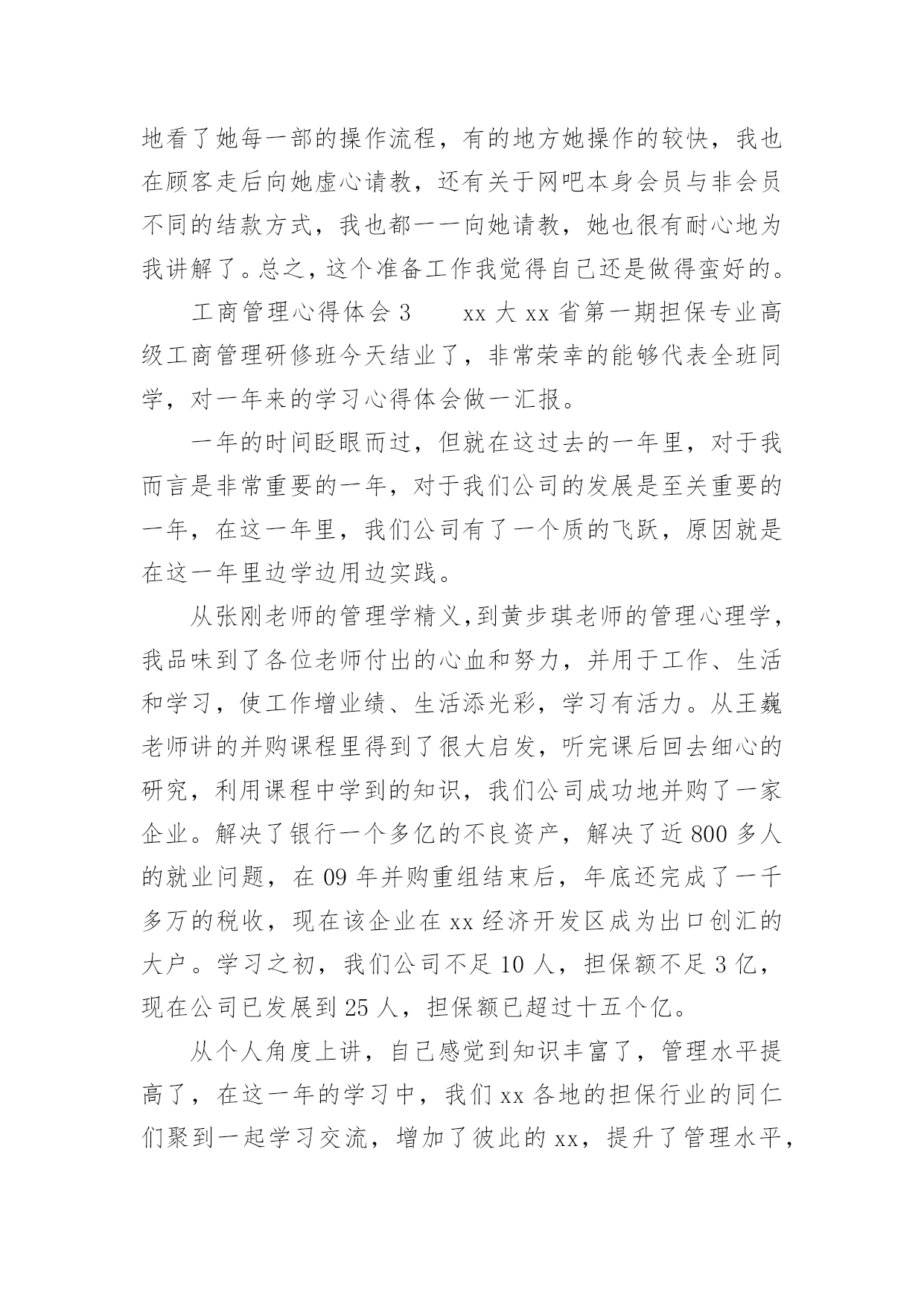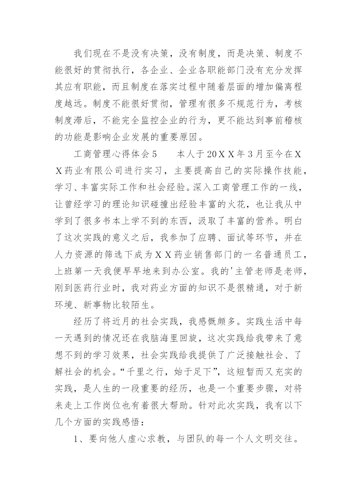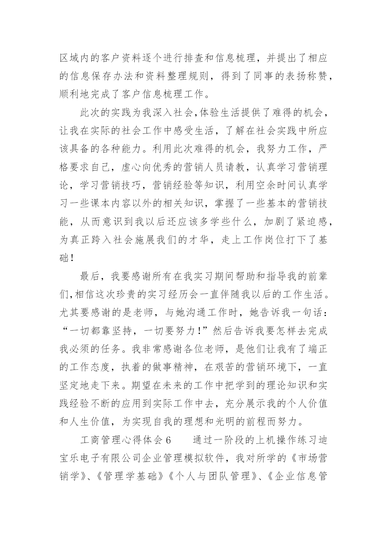 工商管理心得体会最新工商管理心得体会(精选6篇)我们得到了一些心得体会以后,往往会写一篇心得体会,这样可以帮助我们总结以往思想、工作和学习。那么如何写心得体会才能更有感染力呢?以下是小编为大家收集的最新工商管理心得体会(精选6篇),仅供参考,欢迎大家阅读。工商管理心得体会1为了真正做到理论和实践相结合,也为了能更详细地了解工商管理这一专业的真正内涵,通过对企业实际的调查、研究,熟悉外贸实务的具体操作程序,增强感性认识,初步培养学生理论联系实际的能力和分析问题与解决问题的能力。真正做到融会贯通,切实达到实习的目的。实习是一个很好的平台,让我对社会有了新的领悟和认识,只有在现实中经历过,才会明白这个社会是如此的复杂,远没有我们想象的美好。在酒店实习期间,我发现自己的想法和观点是如此的幼稚,不过后来我就慢慢转变了,想法变得成熟。在大学里,我们只是一张白纸,只有通过实习才能体味社会和人生,在话务员这个不起眼的岗位,我能够感受到社会上的人情事理,我在一点点的积累社会经验和学习处世之道,了解人际关系的复杂,这是整个实习过程中最宝贵的一部分。整个实习历程,我不仅看到自己好的一面,也将我在各方面的缺点与不足毫无保留的放大出来,从而让我关注到自己从不曾注意的东西。实习现在已经结束了,这是一段令人难忘的日子,有欣喜、有汗水、有苦涩,很难用一言两语说清楚。这四个星期的时间是短暂的,但过程却是漫长的,我要好好地总结归纳一下,将自己的不足之处进行加强,重新整理自己的信心,迎接新的开端。通过这次实习,我真的学到了很多实际的东西,而这些恰恰是在课堂上所学不到的。工商管理心得体会2参加大学的社会实践,感触颇深。虽然只有短暂的两个星期,但却足以让我懂得了父母工作的艰辛,以及为什么现在应届大学毕业生的工作越来越难找,确实竞争压力很大,即使是一份临时工也是这样的。相比以前在中学阶段,只需要在社区进行的社会实践有很大的不同,大学里的社会实践,更注重实际实践能力,它让我们意识到,仅仅掌握课本上的知识是远远不够的,想要工作,想要为社会贡献一份力,看重的更多还是实践能力。这一点在开始找工作的时候就深刻的体会到了,有些地方由于我没有足够的经验,而且竞争的压力又很大,人家用人单位就没有给我机会,但总算在辛苦后找到了给我锻炼的平台。首先,在工作的第一天主管是安排了我在一旁见习,并没有太多的实际工作要我做。其实,这样的安排也不无道理的,所谓一个好的开始是成功的一半,因此,要想把工作做好,熟练自己的工作岗位自然是十分必要的。是学习就必然会遇上问题。在观察另一个收银员的工作的是偶,我很认真地看了她每一部的操作流程,有的地方她操作的较快,我也在顾客走后向她虚心请教,还有关于网吧本身会员与非会员不同的结款方式,我也都一一向她请教,她也很有耐心地为我讲解了。总之,这个准备工作我觉得自己还是做得蛮好的。工商管理心得体会3xx大xx省第一期担保专业高级工商管理研修班今天结业了,非常荣幸的能够代表全班同学,对一年来的学习心得体会做一汇报。一年的时间眨眼而过,但就在这过去的一年里,对于我而言是非常重要的一年,对于我们公司的发展是至关重要的一年,在这一年里,我们公司有了一个质的飞跃,原因就是在这一年里边学边用边实践。从张刚老师的管理学精义,到黄步琪老师的管理心理学,我品味到了各位老师付出的心血和努力,并用于工作、生活和学习,使工作增业绩、生活添光彩,学习有活力。从王巍老师讲的并购课程里得到了很大启发,听完课后回去细心的研究,利用课程中学到的知识,我们公司成功地并购了一家企业。解决了银行一个多亿的不良资产,解决了近800多人的就业问题,在09年并购重组结束后,年底还完成了一千多万的税收,现在该企业在xx经济开发区成为出口创汇的大户。学习之初,我们公司不足10人,担保额不足3亿,现在公司已发展到25人,担保额已超过十五个亿。从个人角度上讲,自己感觉到知识丰富了,管理水平提高了,在这一年的学习中,我们xx各地的担保行业的同仁们聚到一起学习交流,增加了彼此的xx,提升了管理水平,更可贵的是相互之间的扶持、帮助,体现出了班级的温暖气氛。今天结业不是结束,而是新的开始,利用这次学习结下的深厚xx,相互之间加强联系,相互沟通,相互帮助,共同提高。祝愿大家在各自的领域乘风破浪、扬帆远航。最后,感谢省中小办、担保协会领导、xx大老师、xx大xx培训中心老师!谢谢你们提供这么好的平台,一年来你们辛苦了!最后祝福祝愿,祝大家在未来的日子里幸xx康、事事顺心!工商管理心得体会4企业要持续稳定的发展,必须提高自己的核心竞争能力,核心竞争能力是企业独特的竞争优势。我个人认为目前执行能力是我们企业的核心竞争能力。企业的活动大致可分为经营与管理两大部分,经营活动主要在“市场机会”与“内部能力”间求取最大的平衡与发展,以战略为主