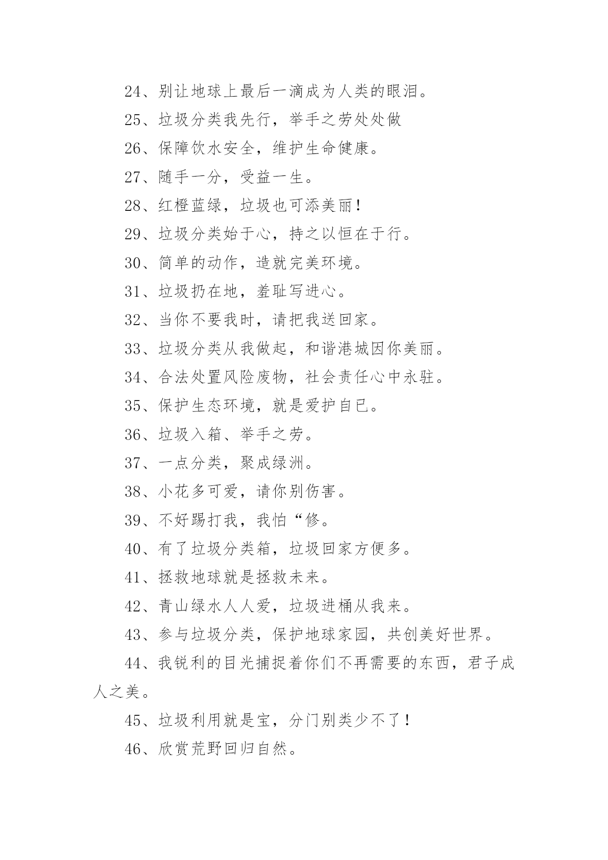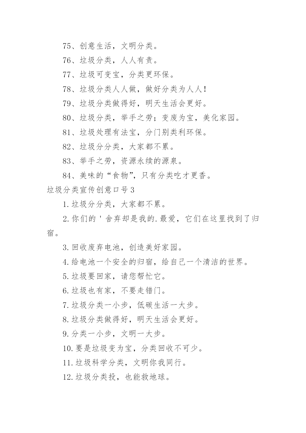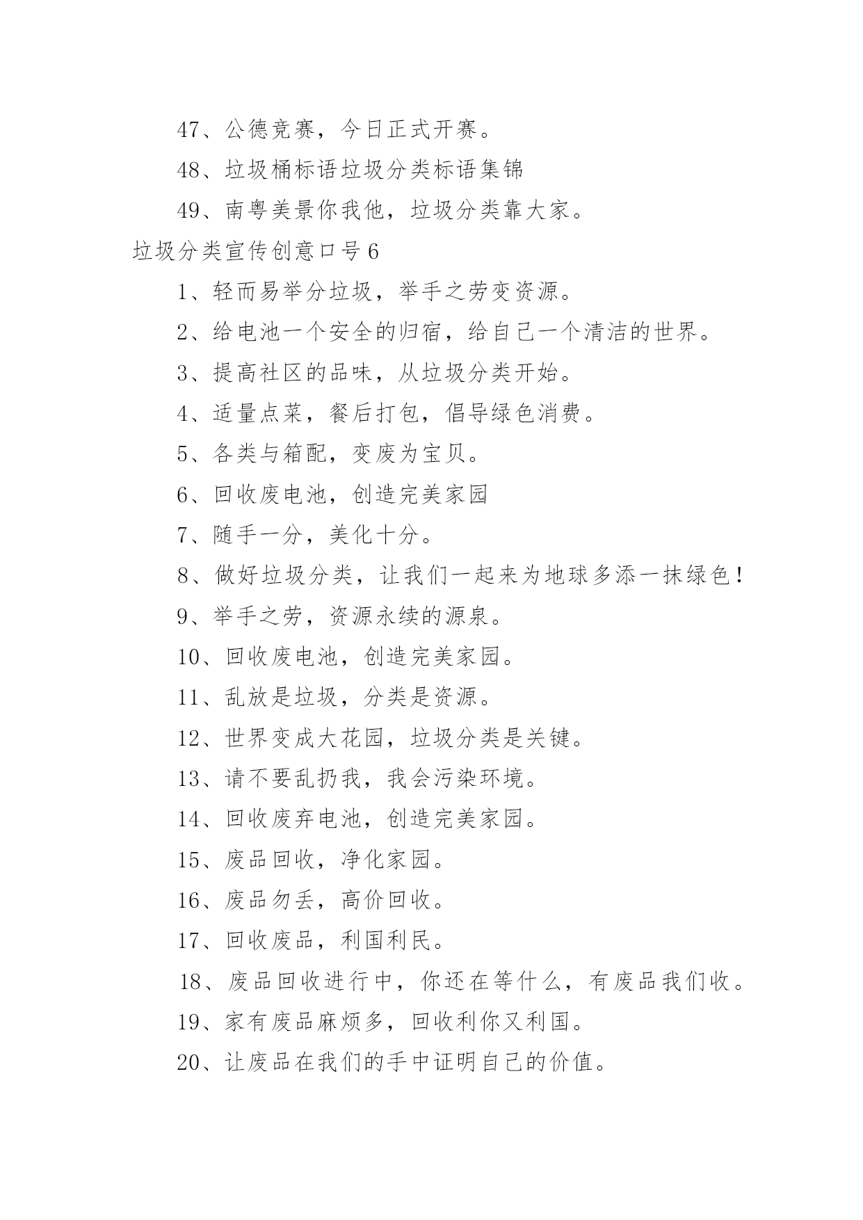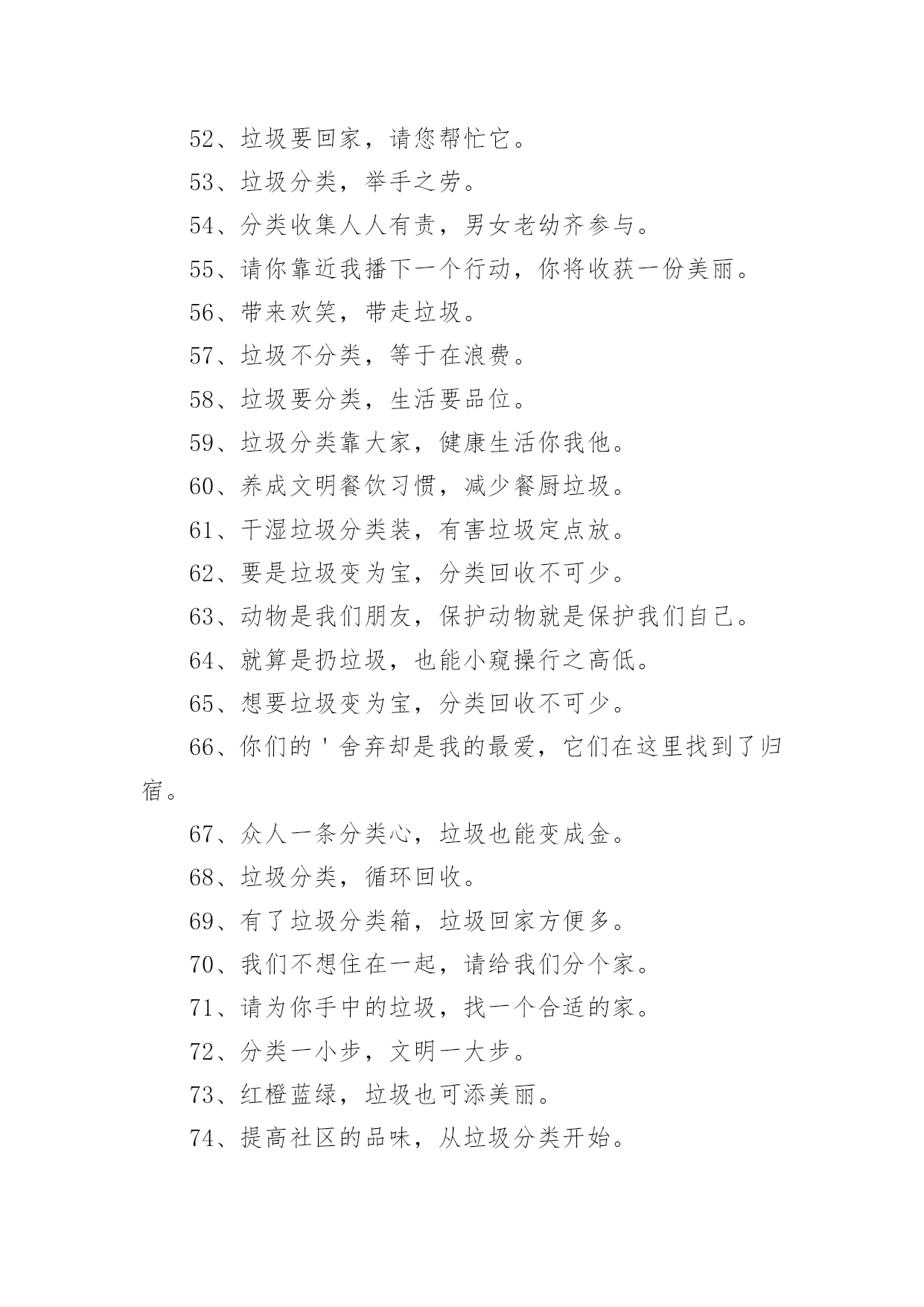 垃圾分类宣传创意口号垃圾分类宣传创意口号在我们平凡的日常里,大家都知道一些经典的口号吧,口号对人们的思维是有一定的感性作用的。那什么样的口号才是经典的呢?下面是小编精心整理的垃圾分类宣传创意口号,仅供参考,大家一起来看看吧。垃圾分类宣传创意口号11、垃圾分类一小步,低碳生活一大步。2、垃圾可变宝,分类更环保。3、给垃圾一个分类的`归宿,还我们一个清洁的世界。4、垃圾分类人人做,做好分类为人人。5、地球是我家,垃圾分类靠大家。6、分类让垃圾变宝,和谐让上海微笑。7、垃圾要分类,生活更美好。8、就算是扔垃圾,也能小窥操行之高低。9、垃圾分类人人动手,干湿分离家家行动。10、垃圾也想有个家,一个不大不小的处所。垃圾分类宣传创意口号21、不要让垃圾回错家。2、垃圾也想有个家,一个不大不小的处所。3、垃圾分类人人做,做好分类为人人。4、未来人类的文明,将是绿色文明。5、适量点菜,餐后打包,倡导绿色消费。6、垃圾分类责无旁贷,持续发展千秋万代。7、垃圾分类一小步,低碳生活一大步。8、你给我的不是施舍,而是一份爱心。9、分类投放垃圾,关系你我。10、垃圾混置是垃圾,垃圾分类是资源。11、垃圾分好类,生活没烦恼。12、为垃圾分家,给城市减负。13、垃圾分一分,环境美十分。14、垃圾分分类,一点也不累。15、各类与箱配,变废为宝贝。16、全民参与垃圾分类,共享环保低碳生活。17、请不要乱扔我,我会污染环境。18、垃圾和人一样,应该各有所归。19、回收废弃电池,创造美好家园。20、为垃圾分类助力,给和谐申城添彩。21、垃圾也有家,不要走错门。22、垃圾要分类,资源要利用。23、请为你手中的垃圾,找一个适宜的家。24、仍掉,成为“白色污染”回收,变成“白色资源”。25、垃圾科学分类,文明你我同行。26、地球是我家,垃圾分类靠大家。27、垃圾分类,从无做起。28、积极参与垃圾分类,创优美社区环境。29、用心参与废电池回收。30、扔掉,成为千污万染;回收,变成各种资源。31、废物,宝物,一息之中;垃圾,资源,一念之间。32、倒垃圾,先分类;带走文明留下美。33、配合垃圾分类,争做文明市民。34、给电池一个安全的归宿,给自己一个清洁的`世界。35、阳光灿烂请千万忘记我,光线暗淡你才能拥有我。36、举手之劳小动作,环境大难题。37、你们的舍弃却是我的最爱,它们在这里找到了归宿。38、我们兄弟有点像,分清我们好处多。39、垃圾分类,守护家园。40、你需要优美的环境,我需要你的电池。41、垃圾要分类,生活更美好。42、垃圾利用就是宝,分门别类少不了。43、分类有道,垃圾成宝。44、垃圾分类人人动手,干湿分离家家行动。45、绿化家园,文明人心。46、垃圾入箱,文明健康。47、心中留意手中留神,垃圾分类环保节能。48、垃圾分类投,也能救地球。49、垃圾分类扔,节约环保又卫生。50、给垃圾一个分类的归宿,还我们一个清洁的世界。51、推进农村生活垃圾无害化处理工作向纵深发展。52、垃圾要回家,请您帮忙它。53、垃圾分类,举手之劳。54、分类收集人人有责,男女老幼齐参与。55、请你靠近我播下一个行动,你将收获一份美丽。56、带来欢笑,带走垃圾。57、垃圾不分类,等于在浪费。58、垃圾要分类,生活要品位。59、垃圾分类靠大家,健康生活你我他。60、养成文明餐饮习惯,减少餐厨垃圾。61、干湿垃圾分类装,有害垃圾定点放。62、要是垃圾变为宝,分类回收不可少。63、动物是我们朋友,保护动物就是保护我们自己。64、就算是扔垃圾,也能小窥操行之高低。65、想要垃圾变为宝,分类回收不可少。66、你们的'舍弃却是我的最爱,它们在这里找到了归宿。67、众人一条分类心,垃圾也能变成金。68、垃圾分类,循环回收。69、有了垃圾分类箱,垃圾回家方便多。70、我们不想住在一起,请给我们分个家。71、请为你手中的垃圾,找一个合适的家。72、分类一小步,文明一大步。73、红橙蓝绿,垃圾也可添美丽。74、提高社区的品味,从垃圾分类开始。75、创意生活,文明分类。76、垃圾分类,人人有责。77、垃圾可变宝,分类更环保。78、垃圾分类人人做,做好分类为人人!79、垃圾分类做得好,明天生活会更好。80、垃圾分类,举手之劳;变废为宝,美化家园。81、垃圾处理有法宝,分门别类利环保。82、垃圾分分类,大家都不累。83、举手之劳,资源永续的源泉。84、美味的“食物”,只有分类吃才更香。垃圾分类宣传创意口号31.垃圾分分类,大家都不累。2.你们的'舍弃却是我的.最爱,它们在这里找到了归宿。3.回收废弃电池,创造美好家园。4.给电池一个安全的归宿,给自己一个清洁的世界。5.垃圾要回家,请您帮忙它。6.垃圾也有家,不要走错门。7.垃圾分类一小步,低碳生活一大步。8.垃圾分类做得好,明天生活会更好。9.分类一小步,文
