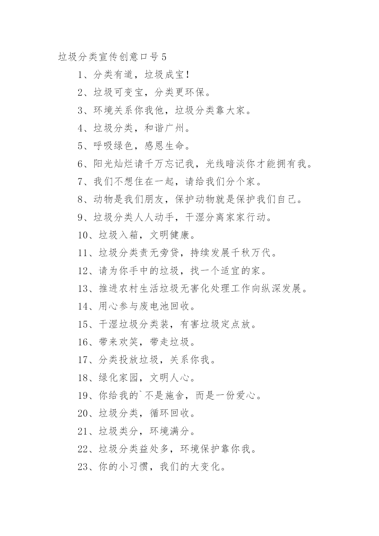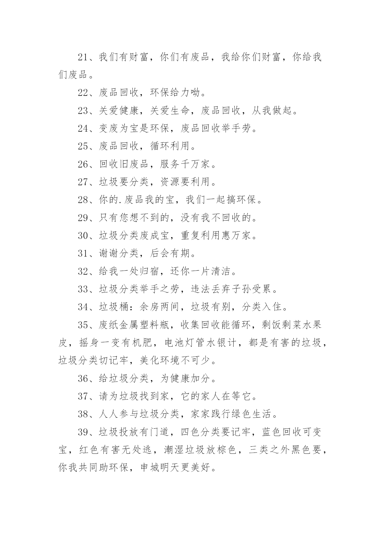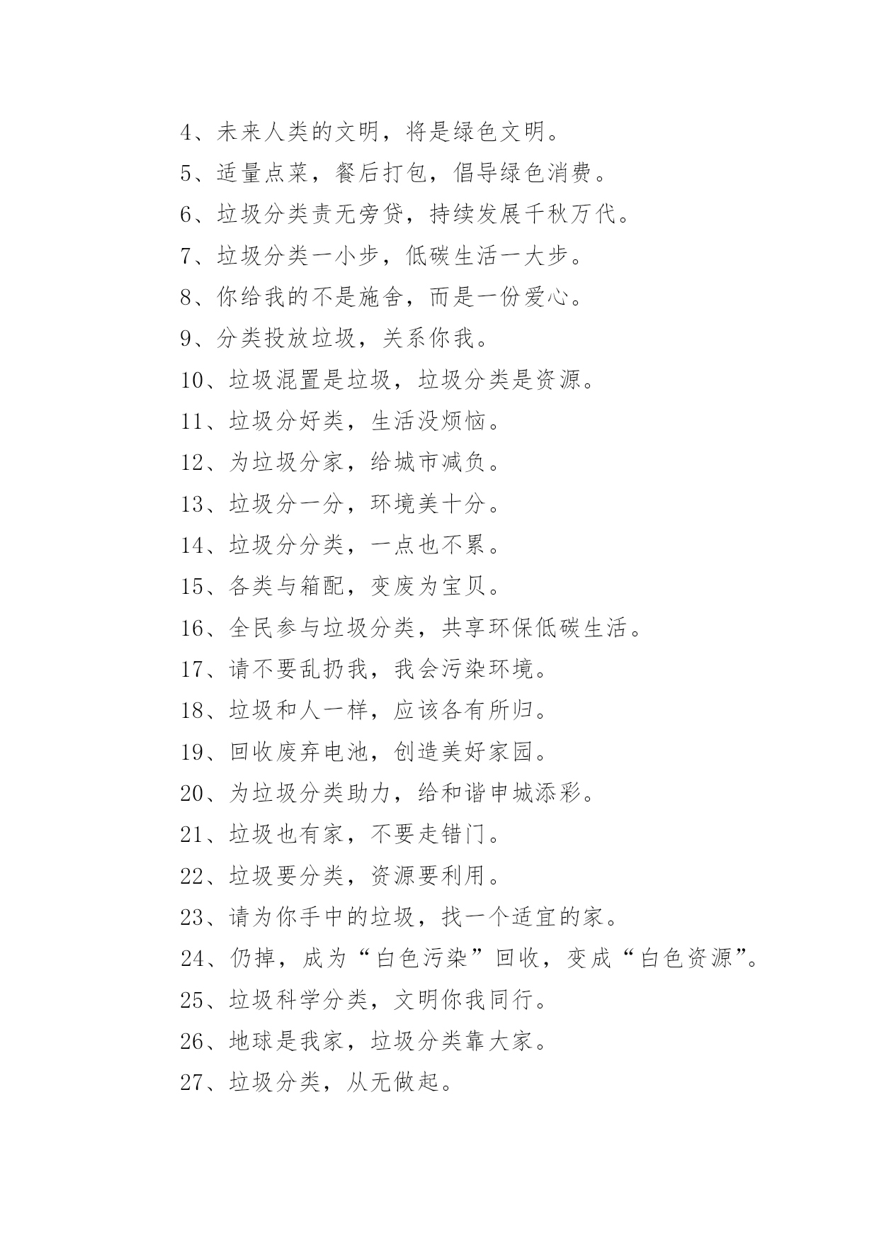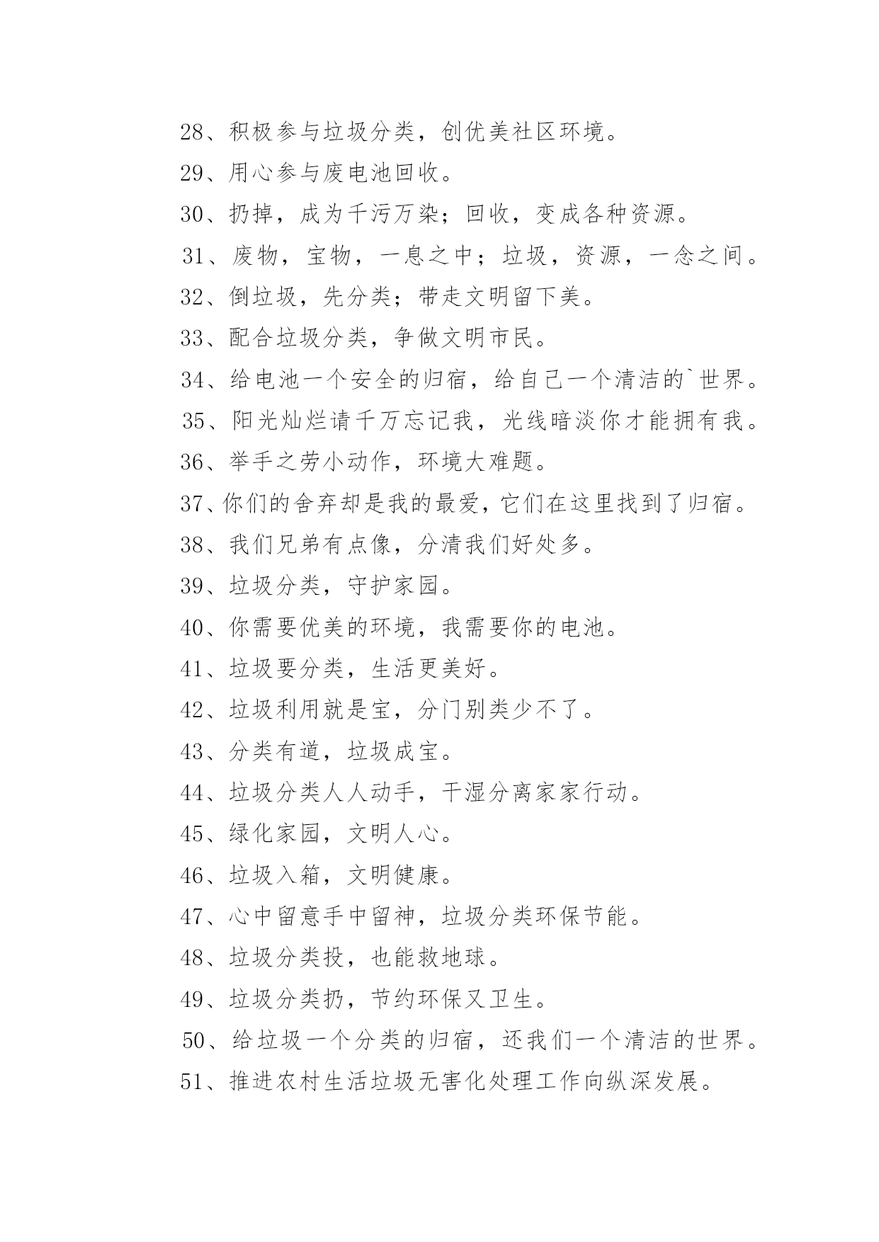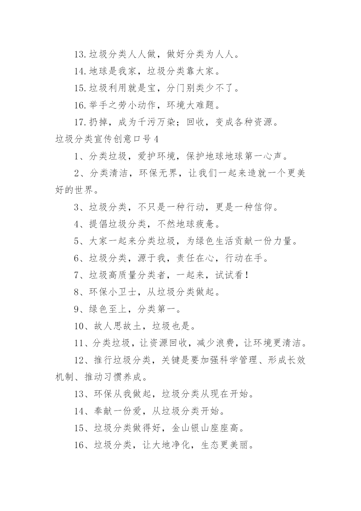 垃圾分类宣传创意口号垃圾分类宣传创意口号在我们平凡的日常里,大家都知道一些经典的口号吧,口号对人们的思维是有一定的感性作用的。那什么样的口号才是经典的呢?下面是小编精心整理的垃圾分类宣传创意口号,仅供参考,大家一起来看看吧。垃圾分类宣传创意口号11、垃圾分类一小步,低碳生活一大步。2、垃圾可变宝,分类更环保。3、给垃圾一个分类的`归宿,还我们一个清洁的世界。4、垃圾分类人人做,做好分类为人人。5、地球是我家,垃圾分类靠大家。6、分类让垃圾变宝,和谐让上海微笑。7、垃圾要分类,生活更美好。8、就算是扔垃圾,也能小窥操行之高低。9、垃圾分类人人动手,干湿分离家家行动。10、垃圾也想有个家,一个不大不小的处所。垃圾分类宣传创意口号21、不要让垃圾回错家。2、垃圾也想有个家,一个不大不小的处所。3、垃圾分类人人做,做好分类为人人。4、未来人类的文明,将是绿色文明。5、适量点菜,餐后打包,倡导绿色消费。6、垃圾分类责无旁贷,持续发展千秋万代。7、垃圾分类一小步,低碳生活一大步。8、你给我的不是施舍,而是一份爱心。9、分类投放垃圾,关系你我。10、垃圾混置是垃圾,垃圾分类是资源。11、垃圾分好类,生活没烦恼。12、为垃圾分家,给城市减负。13、垃圾分一分,环境美十分。14、垃圾分分类,一点也不累。15、各类与箱配,变废为宝贝。16、全民参与垃圾分类,共享环保低碳生活。17、请不要乱扔我,我会污染环境。18、垃圾和人一样,应该各有所归。19、回收废弃电池,创造美好家园。20、为垃圾分类助力,给和谐申城添彩。21、垃圾也有家,不要走错门。22、垃圾要分类,资源要利用。23、请为你手中的垃圾,找一个适宜的家。24、仍掉,成为“白色污染”回收,变成“白色资源”。25、垃圾科学分类,文明你我同行。26、地球是我家,垃圾分类靠大家。27、垃圾分类,从无做起。28、积极参与垃圾分类,创优美社区环境。29、用心参与废电池回收。30、扔掉,成为千污万染;回收,变成各种资源。31、废物,宝物,一息之中;垃圾,资源,一念之间。32、倒垃圾,先分类;带走文明留下美。33、配合垃圾分类,争做文明市民。34、给电池一个安全的归宿,给自己一个清洁的`世界。35、阳光灿烂请千万忘记我,光线暗淡你才能拥有我。36、举手之劳小动作,环境大难题。37、你们的舍弃却是我的最爱,它们在这里找到了归宿。38、我们兄弟有点像,分清我们好处多。39、垃圾分类,守护家园。40、你需要优美的环境,我需要你的电池。41、垃圾要分类,生活更美好。42、垃圾利用就是宝,分门别类少不了。43、分类有道,垃圾成宝。44、垃圾分类人人动手,干湿分离家家行动。45、绿化家园,文明人心。46、垃圾入箱,文明健康。47、心中留意手中留神,垃圾分类环保节能。48、垃圾分类投,也能救地球。49、垃圾分类扔,节约环保又卫生。50、给垃圾一个分类的归宿,还我们一个清洁的世界。51、推进农村生活垃圾无害化处理工作向纵深发展。52、垃圾要回家,请您帮忙它。53、垃圾分类,举手之劳。54、分类收集人人有责,男女老幼齐参与。55、请你靠近我播下一个行动,你将收获一份美丽。56、带来欢笑,带走垃圾。57、垃圾不分类,等于在浪费。58、垃圾要分类,生活要品位。59、垃圾分类靠大家,健康生活你我他。60、养成文明餐饮习惯,减少餐厨垃圾。61、干湿垃圾分类装,有害垃圾定点放。62、要是垃圾变为宝,分类回收不可少。63、动物是我们朋友,保护动物就是保护我们自己。64、就算是扔垃圾,也能小窥操行之高低。65、想要垃圾变为宝,分类回收不可少。66、你们的'舍弃却是我的最爱,它们在这里找到了归宿。67、众人一条分类心,垃圾也能变成金。68、垃圾分类,循环回收。69、有了垃圾分类箱,垃圾回家方便多。70、我们不想住在一起,请给我们分个家。71、请为你手中的垃圾,找一个合适的家。72、分类一小步,文明一大步。73、红橙蓝绿,垃圾也可添美丽。74、提高社区的品味,从垃圾分类开始。75、创意生活,文明分类。76、垃圾分类,人人有责。77、垃圾可变宝,分类更环保。78、垃圾分类人人做,做好分类为人人!79、垃圾分类做得好,明天生活会更好。80、垃圾分类,举手之劳;变废为宝,美化家园。81、垃圾处理有法宝,分门别类利环保。82、垃圾分分类,大家都不累。83、举手之劳,资源永续的源泉。84、美味的“食物”,只有分类吃才更香。垃圾分类宣传创意口号31.垃圾分分类,大家都不累。2.你们的'舍弃却是我的.最爱,它们在这里找到了归宿。3.回收废弃电池,创造美好家园。4.给电池一个安全的归宿,给自己一个清洁的世界。5.垃圾要回家,请您帮忙它。6.垃圾也有家,不要走错门。7.垃圾分类一小步,低碳生活一大步。8.垃圾分类做得好,明天生活会更好。9.分类一小步,文