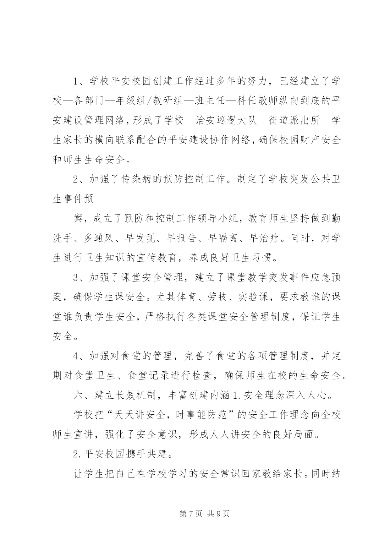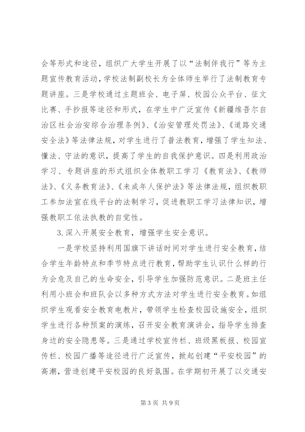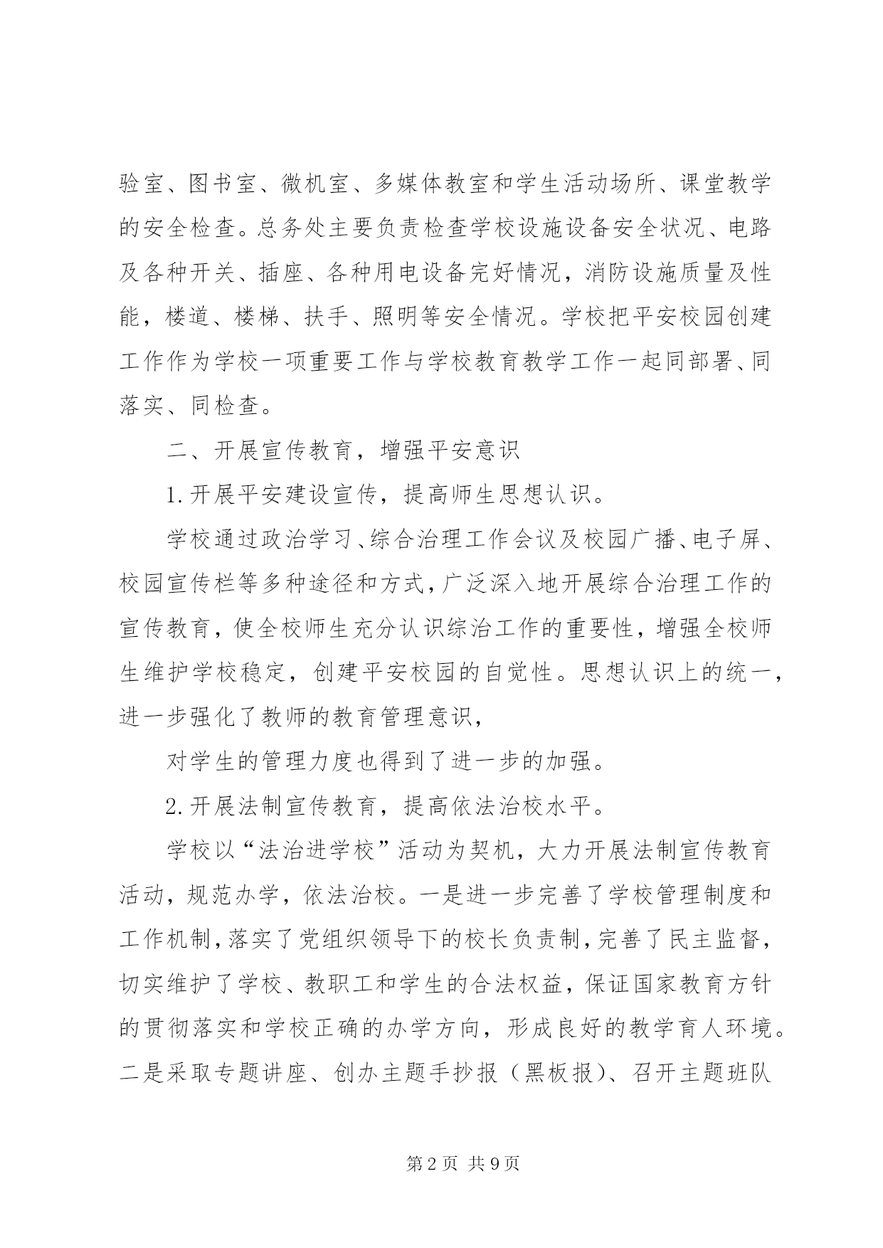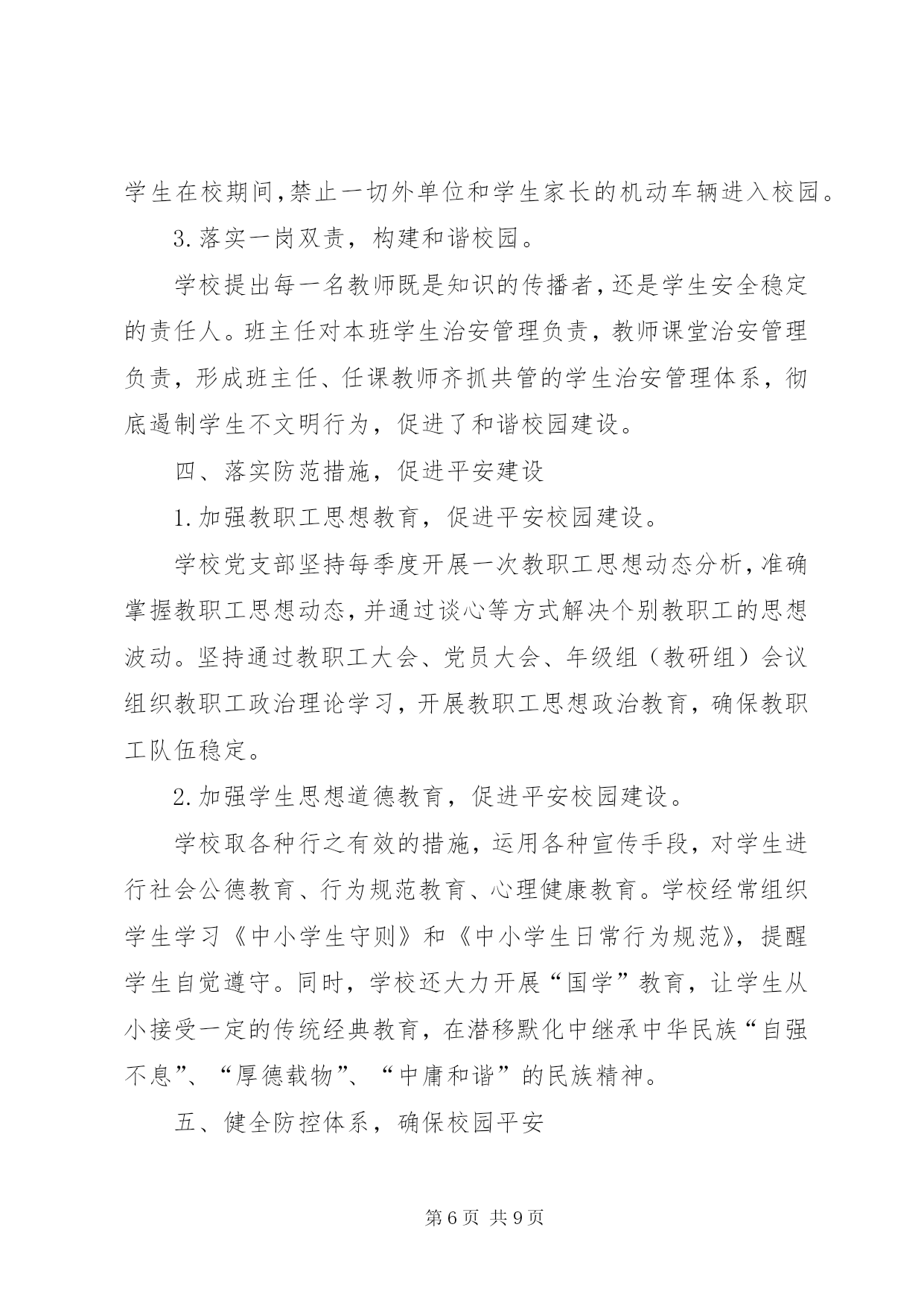第PAGE\*Arabic\*MERGEFORMAT9页共NUMPAGES\*MERGEFORMAT9页学校综合治理及平安校园建设工作总结XX市第七十五小学综合治理及平安校园建设工作总结一年来,学校综合治理及平安校园创建工作在区教育局党委的正确领导下,坚持以邓小平理论和“三个代表”重要思想为指导,紧紧围绕“创建平安校园、建设和谐学校”这一主题,以制度落实、责任落实为重点,加强了学校安全防范基础工作,建立起维护校园安全稳定的长效机制,确保了师生安全,维护了校园的政治稳定、治安环境和正常的教学秩序,促进学校持续、快速、健康、协调发展。现将近一年来我校“综合治理、平安校园创建”情况总结如下:一、加强组织领导,健全创建网络创建“平安校园”工作是维护校园良好的教书育人环境,促进学校各项事业发展的有力保证。为切实加强对平安校园建设工作的领导,确保平安校园建设各项工作落到实处,我校成立了社会管理综合治理集中宣传领导小组,组长由校长李紫同志担任,副校长董承香同志任副组长,各班班主任为成员。领导组成员分工明确,保证了社会管理综合治理工作得到全面落实。学校细化了分工,明确了各部门职责。德育处和各班主任主要负责对学生的法制安全教育,对学生进行常规安全检查和交通、防水、防火、防盗、防电等安全教育。教务处主要负责教育教学安全检查和实验室、图书室、微机室、多媒体教室和学生活动场所、课堂教学的安全检查。总务处主要负责检查学校设施设备安全状况、电路及各种开关、插座、各种用电设备完好情况,消防设施质量及性能,楼道、楼梯、扶手、照明等安全情况。学校把平安校园创建工作作为学校一项重要工作与学校教育教学工作一起同部署、同落实、同检查。二、开展宣传教育,增强平安意识1.开展平安建设宣传,提高师生思想认识。学校通过政治学习、综合治理工作会议及校园广播、电子屏、校园宣传栏等多种途径和方式,广泛深入地开展综合治理工作的宣传教育,使全校师生充分认识综治工作的重要性,增强全校师生维护学校稳定,创建平安校园的自觉性。思想认识上的统一,进一步强化了教师的教育管理意识,对学生的管理力度也得到了进一步的加强。2.开展法制宣传教育,提高依法治校水平。学校以“法治进学校”活动为契机,大力开展法制宣传教育活动,规范办学,依法治校。一是进一步完善了学校管理制度和工作机制,落实了党组织领导下的校长负责制,完善了民主监督,切实维护了学校、教职工和学生的合法权益,保证国家教育方针的贯彻落实和学校正确的办学方向,形成良好的教学育人环境。二是采取专题讲座、创办主题手抄报(黑板报)、召开主题班队会等形式和途径,组织广大学生开展了以“法制伴我行”等为主题宣传教育活动,学校法制副校长为全体师生举行了法制教育专题讲座。三是学校通过主题班会、电子屏、校园公众平台、征文比赛、手抄报等途径和形式,在学生中广泛宣传《新疆维吾尔自治区社会治安综合治理条例》、《治安管理处罚法》、《道路交通安全法》等法律法规,对学生进行了普法教育,增强了学生知法、懂法、守法的意识,提高了学生的自我保护意识。四是利用政治学习、专题讲座的形式组织全体教职工学习《教育法》、《教师法》、《义务教育法》、《未成年人保护法》等法律法规,组织教职工参加法宣在线平台的法制学习,促进教职工学习法律知识,增强教职工依法执教的自觉性。3.深入开展安全教育,增强学生安全意识。一是学校坚持利用国旗下讲话时间对学生进行安全教育,结合学生年龄特点和季节特点进行教育,帮助学生认识什么样的行为会危及自己的生命安全,引导学生加强防范意识。二是班主任利用小班会和班队会以多种方式方法对学生进行安全教育。如组织学生观看安全教育电教片,带领学生检查校园设施安全,组织学生进行各种预案的演练,召开安全教育演讲会,指导学生排查身边的安全隐患等。三是通过学校宣传栏、班级黑板报、校园宣传栏、校园广播等途径进行广泛宣传,掀起创建“平安校园”的高潮,营造创建平安校园的良好氛围。在学期初开展了以交通安全为主题的教育活动,要求学生加强自我保护意识,提高自我保护的能力。学期中举办防震、消防安全紧急疏散演练,夏季对学生进行防溺水教育。4.持续开展意识形态领域反分裂斗争再教育活动。学校坚持把意识形态领域反分裂斗争再教育作为“热爱伟大祖国,建设美好家园”主题教育活动的重要内容,持续不断地在广大师生中开展了马克思主义“五观”、“四个认同”和“三个离不开”教育,严防“三股势力”的渗透和破坏。根据自治区、地区和分局的统一安排部署,在广大师生中集中开展了“反暴力、讲法治、讲秩序”专题教育活动,通过活动使广大师生彻底认清了“三股势力”的险恶用心和罪恶本质,把思想和行动统一到了中央和自治区党委的指示要求上来,进一步提高了广大师生维护人民利益、维护法律尊严、维护民族团结、维护祖国统一的自觉性和坚定