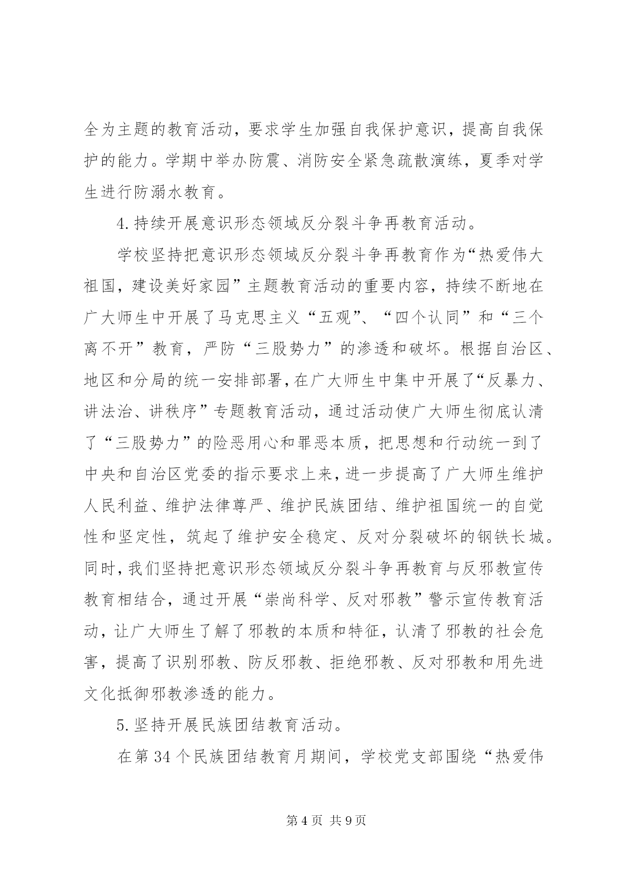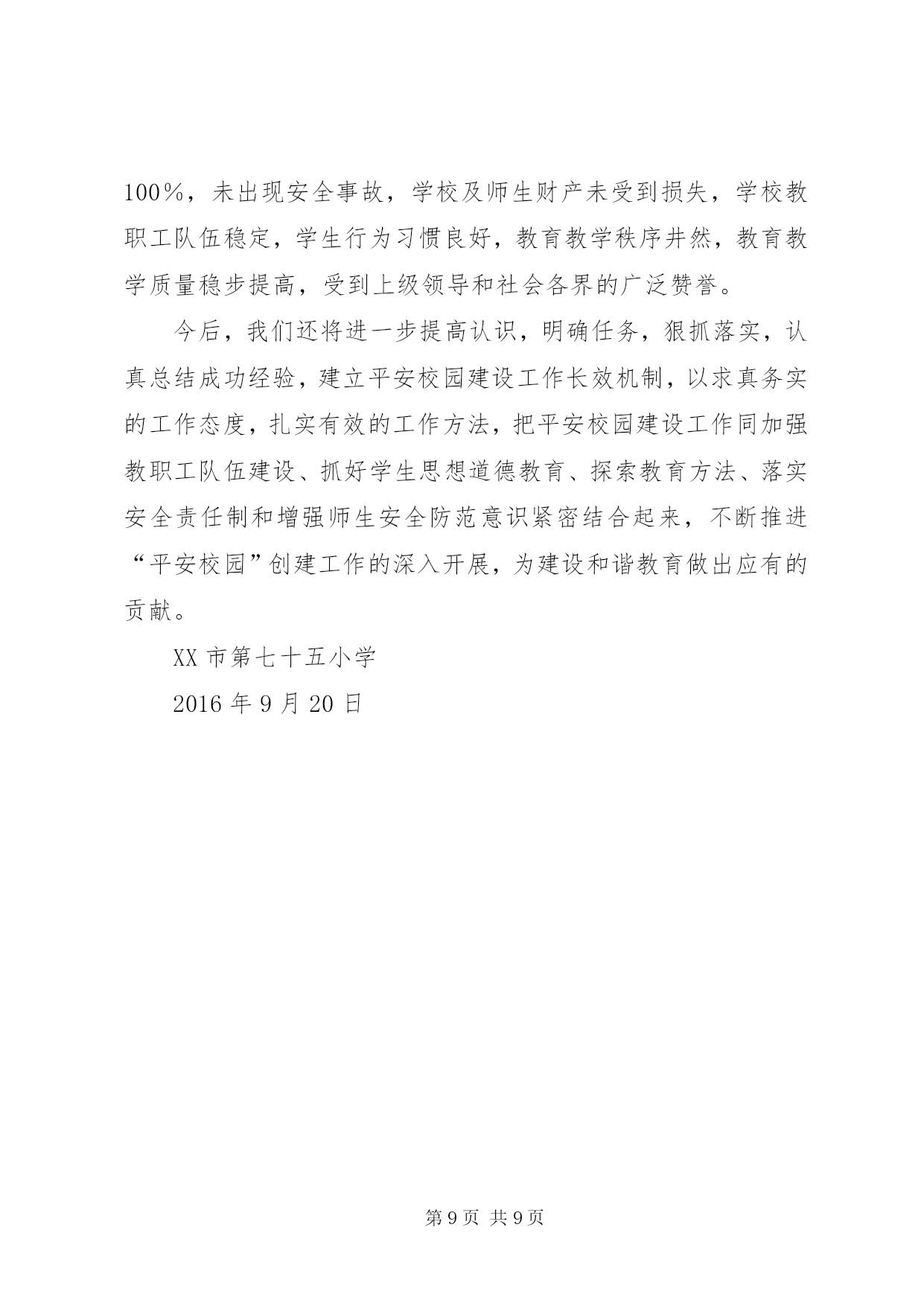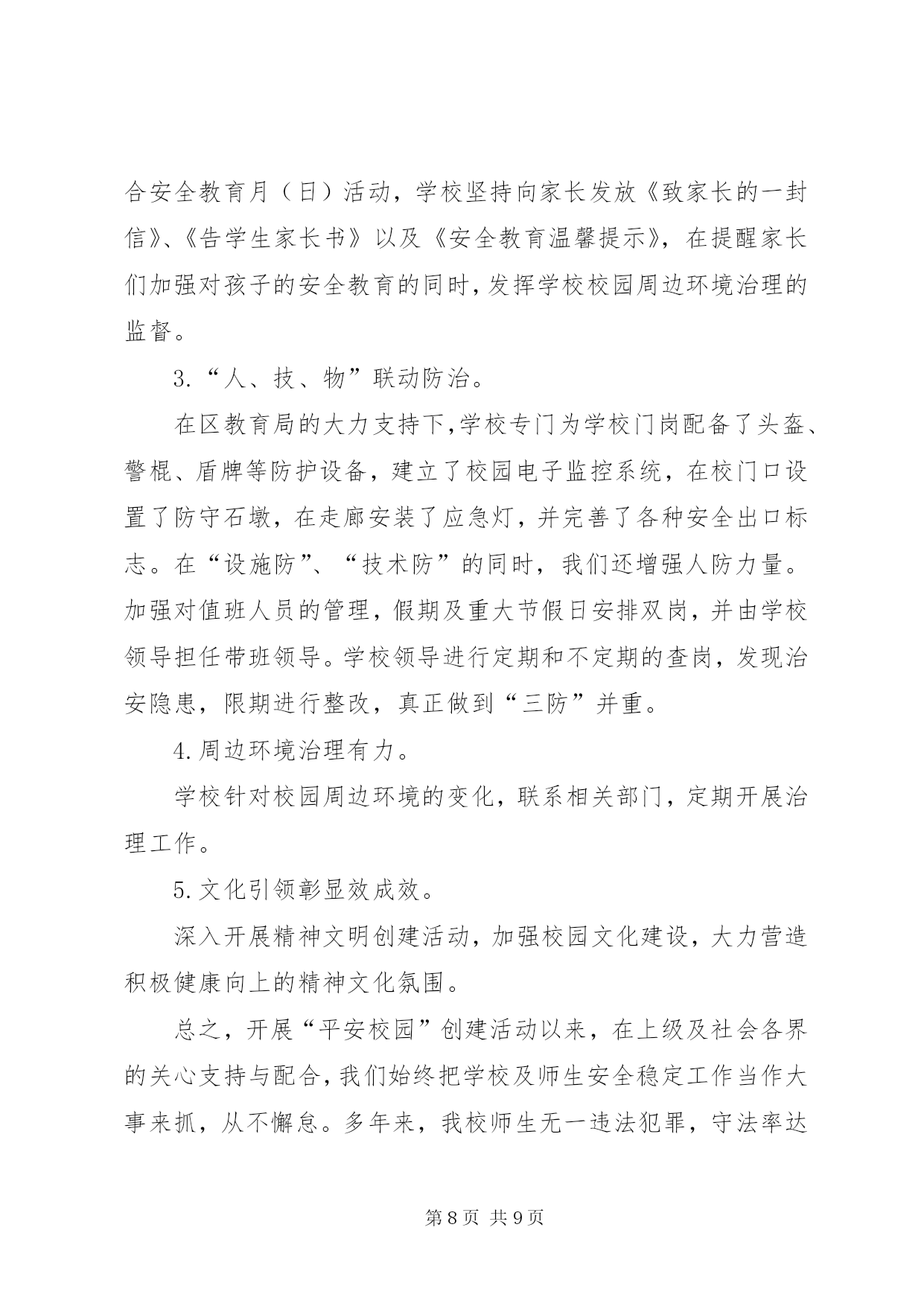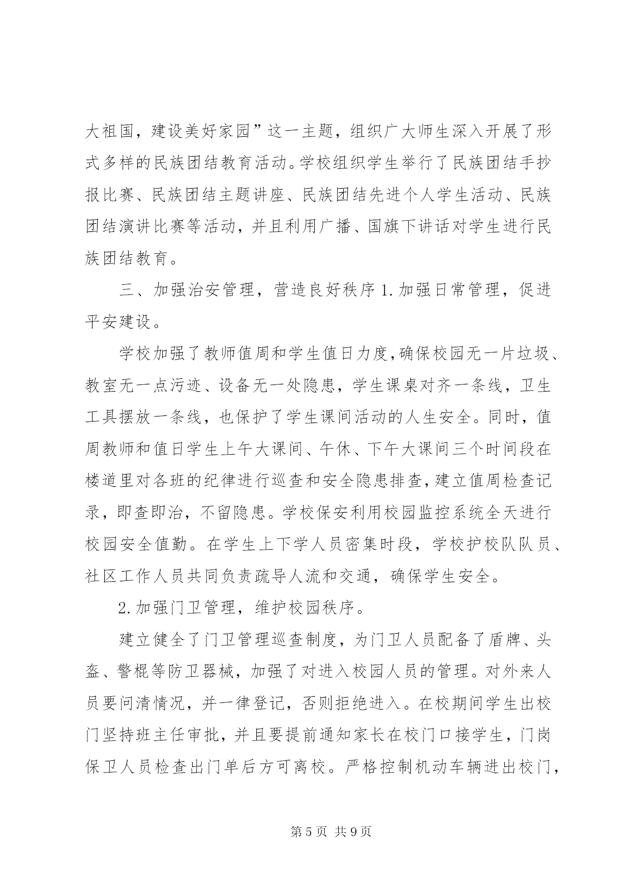 第PAGE\*Arabic\*MERGEFORMAT9页共NUMPAGES\*MERGEFORMAT9页学校综合治理及平安校园建设工作总结XX市第七十五小学综合治理及平安校园建设工作总结一年来,学校综合治理及平安校园创建工作在区教育局党委的正确领导下,坚持以邓小平理论和“三个代表”重要思想为指导,紧紧围绕“创建平安校园、建设和谐学校”这一主题,以制度落实、责任落实为重点,加强了学校安全防范基础工作,建立起维护校园安全稳定的长效机制,确保了师生安全,维护了校园的政治稳定、治安环境和正常的教学秩序,促进学校持续、快速、健康、协调发展。现将近一年来我校“综合治理、平安校园创建”情况总结如下:一、加强组织领导,健全创建网络创建“平安校园”工作是维护校园良好的教书育人环境,促进学校各项事业发展的有力保证。为切实加强对平安校园建设工作的领导,确保平安校园建设各项工作落到实处,我校成立了社会管理综合治理集中宣传领导小组,组长由校长李紫同志担任,副校长董承香同志任副组长,各班班主任为成员。领导组成员分工明确,保证了社会管理综合治理工作得到全面落实。学校细化了分工,明确了各部门职责。德育处和各班主任主要负责对学生的法制安全教育,对学生进行常规安全检查和交通、防水、防火、防盗、防电等安全教育。教务处主要负责教育教学安全检查和实验室、图书室、微机室、多媒体教室和学生活动场所、课堂教学的安全检查。总务处主要负责检查学校设施设备安全状况、电路及各种开关、插座、各种用电设备完好情况,消防设施质量及性能,楼道、楼梯、扶手、照明等安全情况。学校把平安校园创建工作作为学校一项重要工作与学校教育教学工作一起同部署、同落实、同检查。二、开展宣传教育,增强平安意识1.开展平安建设宣传,提高师生思想认识。学校通过政治学习、综合治理工作会议及校园广播、电子屏、校园宣传栏等多种途径和方式,广泛深入地开展综合治理工作的宣传教育,使全校师生充分认识综治工作的重要性,增强全校师生维护学校稳定,创建平安校园的自觉性。思想认识上的统一,进一步强化了教师的教育管理意识,对学生的管理力度也得到了进一步的加强。2.开展法制宣传教育,提高依法治校水平。学校以“法治进学校”活动为契机,大力开展法制宣传教育活动,规范办学,依法治校。一是进一步完善了学校管理制度和工作机制,落实了党组织领导下的校长负责制,完善了民主监督,切实维护了学校、教职工和学生的合法权益,保证国家教育方针的贯彻落实和学校正确的办学方向,形成良好的教学育人环境。二是采取专题讲座、创办主题手抄报(黑板报)、召开主题班队会等形式和途径,组织广大学生开展了以“法制伴我行”等为主题宣传教育活动,学校法制副校长为全体师生举行了法制教育专题讲座。三是学校通过主题班会、电子屏、校园公众平台、征文比赛、手抄报等途径和形式,在学生中广泛宣传《新疆维吾尔自治区社会治安综合治理条例》、《治安管理处罚法》、《道路交通安全法》等法律法规,对学生进行了普法教育,增强了学生知法、懂法、守法的意识,提高了学生的自我保护意识。四是利用政治学习、专题讲座的形式组织全体教职工学习《教育法》、《教师法》、《义务教育法》、《未成年人保护法》等法律法规,组织教职工参加法宣在线平台的法制学习,促进教职工学习法律知识,增强教职工依法执教的自觉性。3.深入开展安全教育,增强学生安全意识。一是学校坚持利用国旗下讲话时间对学生进行安全教育,结合学生年龄特点和季节特点进行教育,帮助学生认识什么样的行为会危及自己的生命安全,引导学生加强防范意识。二是班主任利用小班会和班队会以多种方式方法对学生进行安全教育。如组织学生观看安全教育电教片,带领学生检查校园设施安全,组织学生进行各种预案的演练,召开安全教育演讲会,指导学生排查身边的安全隐患等。三是通过学校宣传栏、班级黑板报、校园宣传栏、校园广播等途径进行广泛宣传,掀起创建“平安校园”的高潮,营造创建平安校园的良好氛围。在学期初开展了以交通安全为主题的教育活动,要求学生加强自我保护意识,提高自我保护的能力。学期中举办防震、消防安全紧急疏散演练,夏季对学生进行防溺水教育。4.持续开展意识形态领域反分裂斗争再教育活动。学校坚持把意识形态领域反分裂斗争再教育作为“热爱伟大祖国,建设美好家园”主题教育活动的重要内容,持续不断地在广大师生中开展了马克思主义“五观”、“四个认同”和“三个离不开”教育,严防“三股势力”的渗透和破坏。根据自治区、地区和分局的统一安排部署,在广大师生中集中开展了“反暴力、讲法治、讲秩序”专题教育活动,通过活动使广大师生彻底认清了“三股势力”的险恶用心和罪恶本质,把思想和行动统一到了中央和自治区党委的指示要求上来,进一步提高了广大师生维护人民利益、维护法律尊严、维护民族团结、维护祖国统一的自觉性和坚定