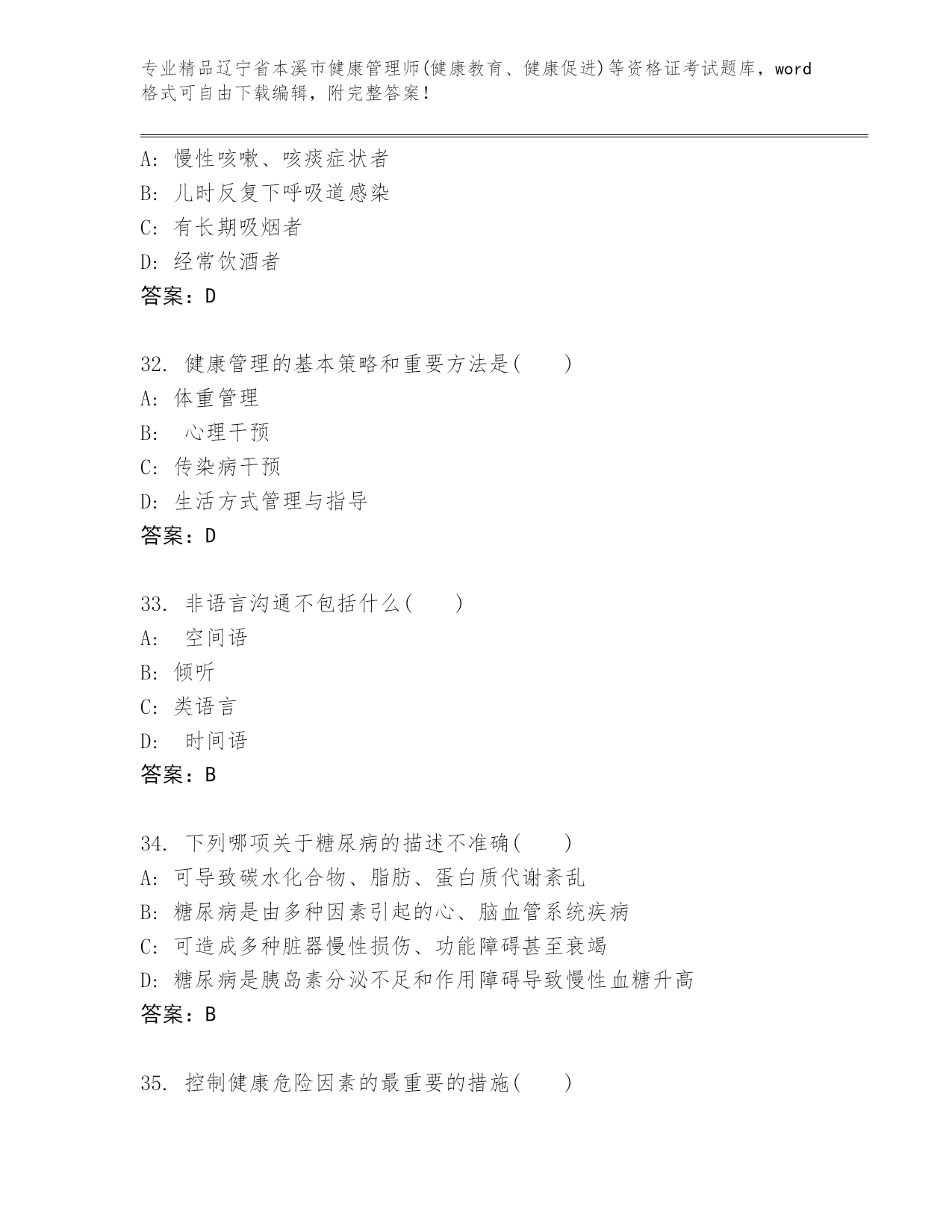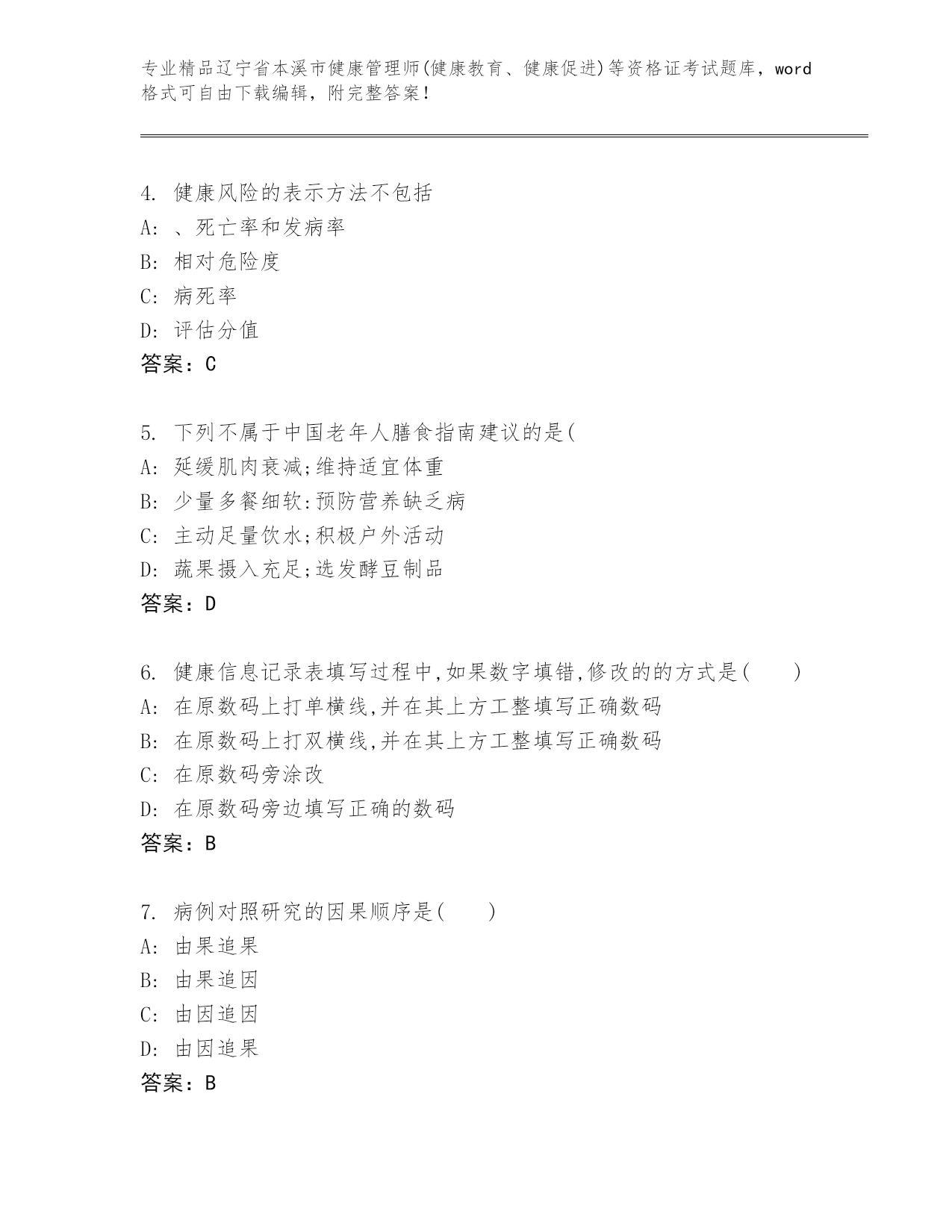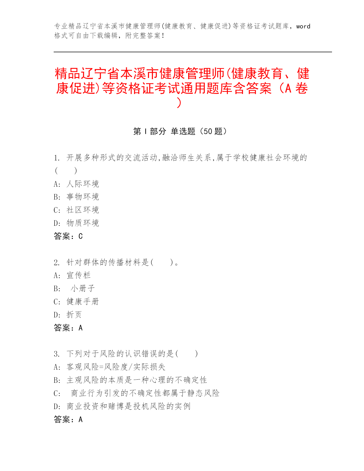 精品辽宁省本溪市健康管理师(健康教育、健康促进)等资格证考试通用题库含答案(A卷).docx