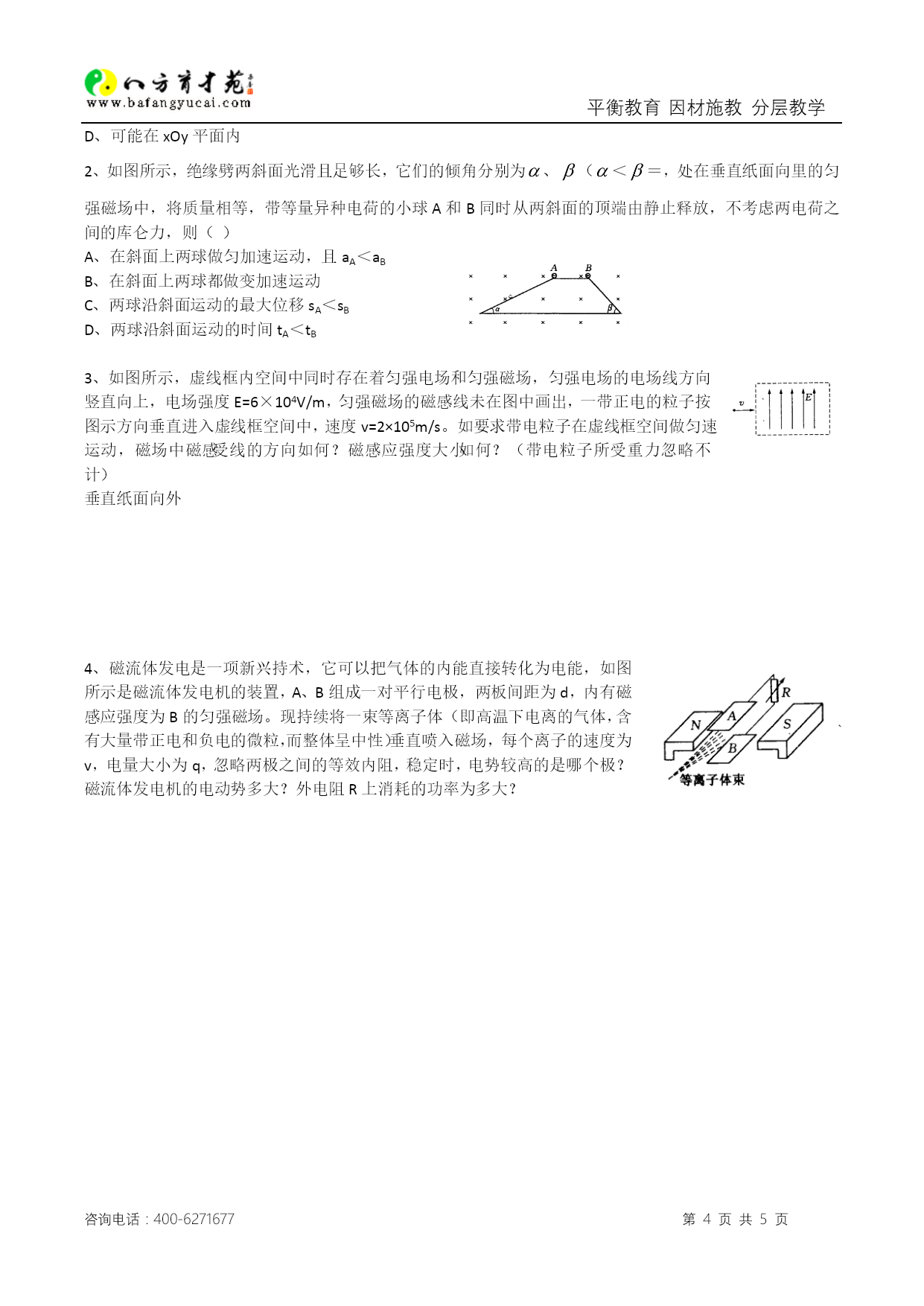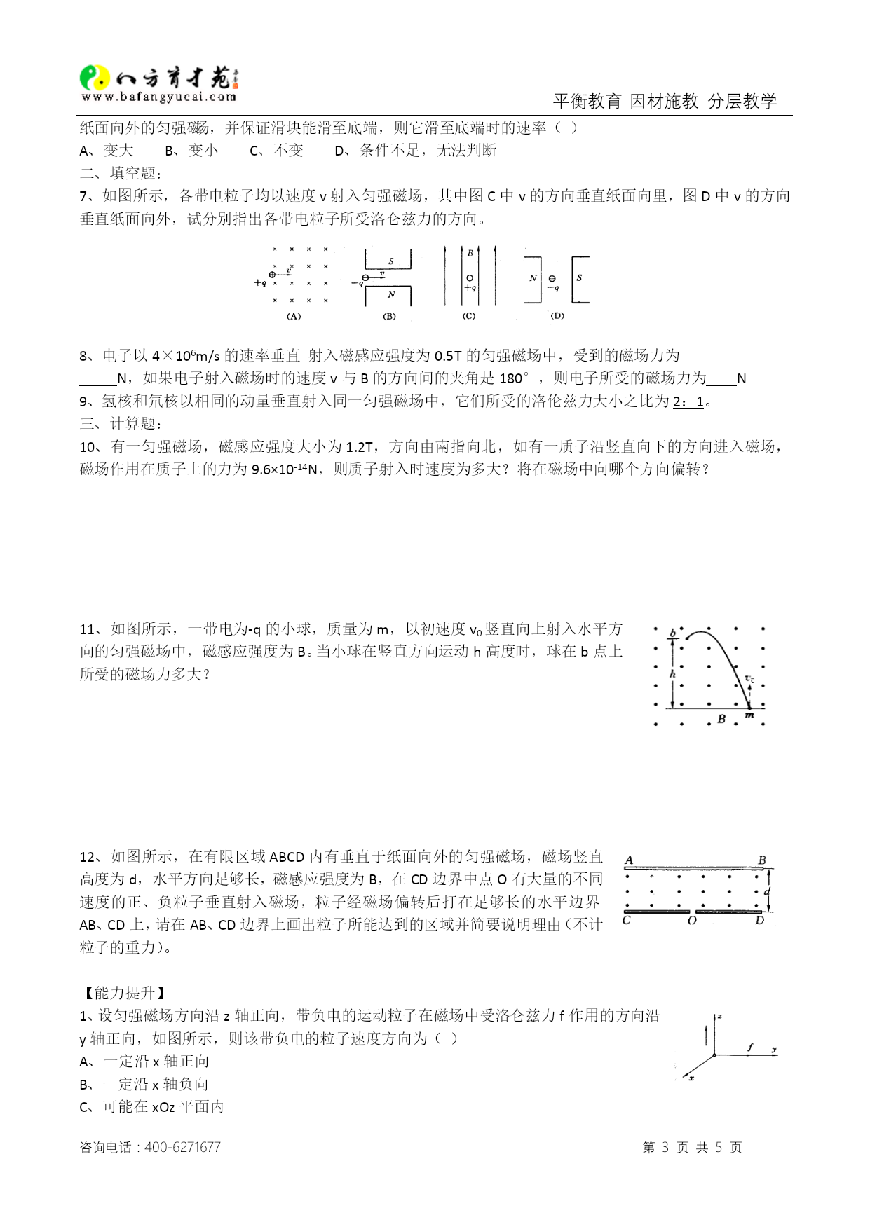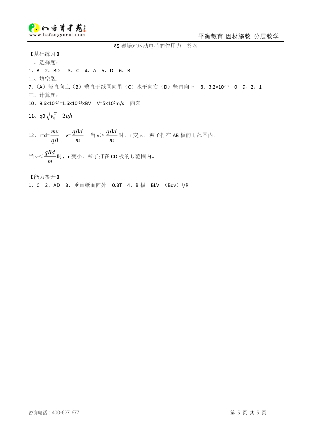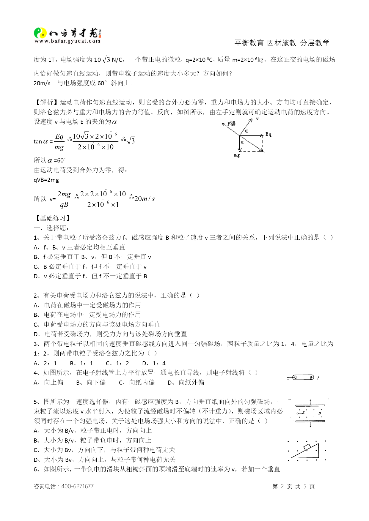 平衡教育因材施教分层教学PAGE咨询电话:400-6271677第PAGE5页共NUMPAGES5页磁场对运动电荷的作用力【典型例题】【例1】关于运动电荷和磁场的说法中,正确的是(D)A、运动电荷在某点不受洛仑兹力作用,这点的磁感应强度必为零B、电荷的运动方向、磁感应强度方向和电荷所受洛仑兹力的方向一定互相垂直C、电子射线由于受到垂直于它的磁场作用而偏转,这是因为洛仑兹力对电子做功的结果D、电荷与磁场力没有相对运动,电荷就一定不受磁场的作用力【解析】运动电荷处于磁感线强度为零处,所受洛仑兹力为零,但当运动电荷的速度方向和磁场方向一致时(同向或反向)也不受洛仑兹力的作用;运动电荷受到的洛仑兹力垂直于磁场方向和电荷运动方向所决定的平面,即洛仑兹力既垂直磁场方向,也垂直于电荷的运动方向,但磁场方向和电荷运动方向不一定垂直;因为洛仑兹力一定垂直于电荷的运动方向,所以洛仑兹力永远不做功;运动电荷才受洛仑兹力的作用,这里的运动应是与磁场的相对运动。【答案】D【例2】如图所示,MDN为绝缘材料制成的光滑竖直半圆环,半径为R,匀强磁场的磁感应强度为B,方向垂直纸面向外。一带电量为-q,质量为m的小球自M点无初速下落,下列说法中正确的是(ABD)A、由M滑到最低度点D时所用时间与磁场无关B、球滑到D时,速度大小v=C、球滑到D点时,对D的压力一定大于mgD、滑到D时,对D的压力随圆半径增大而减小【解析】对沿光滑竖直半圆环下滑的小球进行受力分析,如图所示,使小球下滑的力只有重力沿轨道的切向分力Gt,洛仑兹力的存在只是减少了小球对轨道的压力,故下滑到最低点所用的时间及到最低点的速度与磁场是否存在均无关。下滑过程中,只有重力做功,由机械能守恒得:mgR=所以v=在最低点时,三个力的合力提供圆周运动的向心力(如图所示),即N+F洛-mg=m·N=mg+2mg-F洛=3mg-F洛,不能确认N和mg的关系,即不能确定小球对轨道压力和重力关系。由N=3mg-F洛=3mg-qVB=3mg-qB可知,当R变大时,N在减小,即对轨道压力在减小。【答案】A、B、D【例3】如图所示,在竖直平面内有一个正交的匀强电场和匀强磁场,磁感应强度为1T,电场强度为10N/C,一个带正电的微粒,q=2×10-6C,质量m=2×10-6㎏,在这正交的电场的磁场内恰好做匀速直线运动,则带电粒子运动的速度大小多大?方向如何?20m/s与电场强度成60°斜向上。【解析】运动电荷作匀速直线运动,则它受的合外力必为零,重力和电场力的大小、方向均可直接确定,则洛仑兹力必与重力和电场力的合力等值、反向,如图所示,由左手定则就可确定运动电荷的速度方向。设速度v与电场E的夹角为tan=所以=60°由运动电荷受到合外力为零,得:qVB=2mg所以v=【基础练习】选择题:1、关于带电粒子所受洛仑兹力f、磁感应强度B和粒子速度v三者之间的关系,下列说法中正确的是()A、f、B、v三者必定均相互垂直B、f必定垂直于B、v,但B不一定垂直vC、B必定垂直于f,但f不一定垂直于vD、v必定垂直于f,但f不一定垂直于B2、有关电荷受电场力和洛仑兹力的说法中,正确的是()A、电荷在磁场中一定受磁场力的作用B、电荷在电场中一定受电场力的作用C、电荷受电场力的方向与该处电场方向垂直D、电荷若受磁场力,则受力方向与该处磁场方向垂直3、两个带电粒子以相同的速度垂直磁感线方向进入同一匀强磁场,两粒子质量之比为1:4,电量之比为1:2,则两带电粒子受洛仑兹力之比为()A、2:1B、1:1C、1:2D、1:44、如图所示,在电子射线管上方平行放置一通电长直导线,则电子射线将()A、向上偏B、向下偏C、向纸内偏D、向纸外偏5、图所示为一速度选择器,内有一磁感应强度为B,方向垂直纸面向外的匀强磁场,一束粒子流以速度v水平射入,为使粒子流经磁场时不偏转(不计重力),则磁场区域内必须同时存在一个匀强电场,关于这处电场场强大小和方向的说法中,正确的是()A、大小为B/v,粒子带正电时,方向向上B、大小为B/v,粒子带负电时,方向向上C、大小为Bv,方向向下,与粒子带何种电荷无关D、大小为Bv,方向向上,与粒子带何种电荷无关6、如图所示,一带负电的滑块从粗糙斜面的顶端滑至底端时的速率为v,若加一个垂直纸面向外的匀强磁场,并保证滑块能滑至底端,则它滑至底端时的速率()A、变大B、变小C、不变D、条件不足,无法判断填空题:7、如图所示,各带电粒子均以速度v射入匀强磁场,其中图C中v的方向垂直纸面向里,图D中v的方向垂直纸面向外,试分别指出各带电粒子所受洛仑兹力的方向。8、电子以4