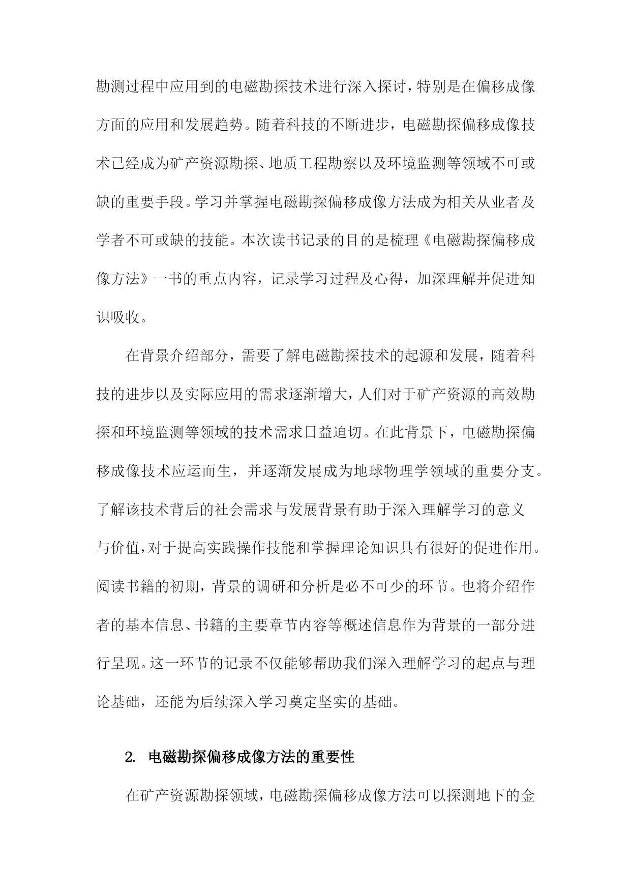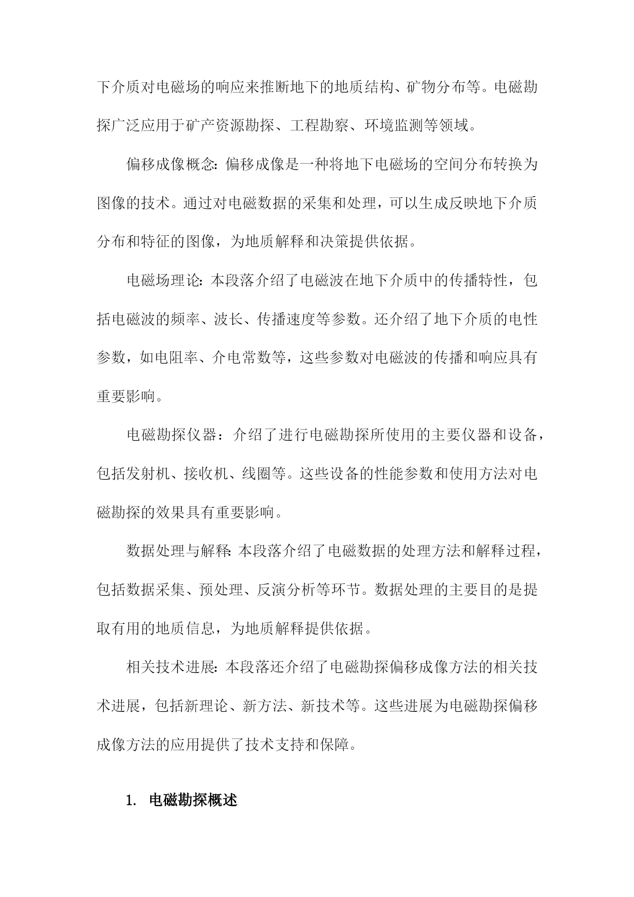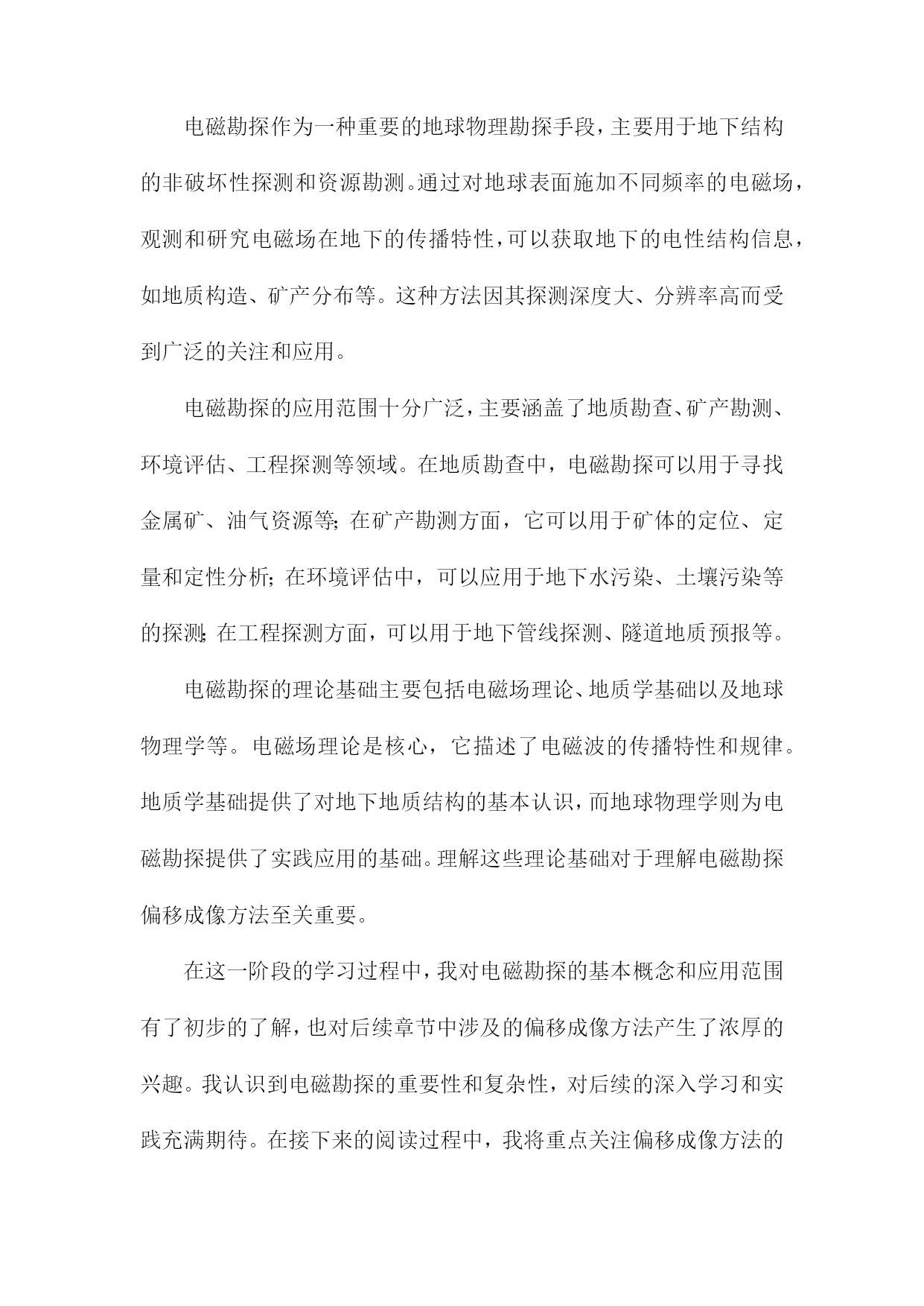 《电磁勘探偏移成像方法》读书记录一、内容概括《电磁勘探偏移成像方法》是一本关于电磁勘探技术及其在地质勘探领域应用的重要著作。本书首先介绍了电磁勘探的基本原理和基础知识,包括电磁场的产生、传播以及其与地下介质的相互作用等。详细阐述了偏移成像方法的基本原理和流程,包括数据采集、处理、分析和解释等环节。本书还重点介绍了不同类型的电磁勘探方法,如直流电阻率法、交流阻抗法、瞬变电磁法等,以及它们在地质勘探中的具体应用。还探讨了偏移成像技术的最新进展和未来发展趋势。通过阅读本书,我对电磁勘探偏移成像方法有了更深入的了解。该方法利用电磁场在地下介质中的响应特征,通过数据采集和处理,形成地下介质的图像,从而揭示地下的地质结构和特征。本书还介绍了偏移成像技术的优缺点以及在实际应用中的注意事项,为我今后学习和工作提供了宝贵的参考。《电磁勘探偏移成像方法》一书内容丰富,是一本值得一读的好书。1.背景介绍本次阅读的书籍《电磁勘探偏移成像方法》是一部涉及地球物理学和地球探测技术的专业领域的研究性著作。书中内容主要针对地质勘测过程中应用到的电磁勘探技术进行深入探讨,特别是在偏移成像方面的应用和发展趋势。随着科技的不断进步,电磁勘探偏移成像技术已经成为矿产资源勘探、地质工程勘察以及环境监测等领域不可或缺的重要手段。学习并掌握电磁勘探偏移成像方法成为相关从业者及学者不可或缺的技能。本次读书记录的目的是梳理《电磁勘探偏移成像方法》一书的重点内容,记录学习过程及心得,加深理解并促进知识吸收。在背景介绍部分,需要了解电磁勘探技术的起源和发展,随着科技的进步以及实际应用的需求逐渐增大,人们对于矿产资源的高效勘探和环境监测等领域的技术需求日益迫切。在此背景下,电磁勘探偏移成像技术应运而生,并逐渐发展成为地球物理学领域的重要分支。了解该技术背后的社会需求与发展背景有助于深入理解学习的意义与价值,对于提高实践操作技能和掌握理论知识具有很好的促进作用。阅读书籍的初期,背景的调研和分析是必不可少的环节。也将介绍作者的基本信息、书籍的主要章节内容等概述信息作为背景的一部分进行呈现。这一环节的记录不仅能够帮助我们深入理解学习的起点与理论基础,还能为后续深入学习奠定坚实的基础。2.电磁勘探偏移成像方法的重要性在矿产资源勘探领域,电磁勘探偏移成像方法可以探测地下的金属矿物分布,为矿产资源的定位、定量评估提供重要依据。随着全球矿产资源需求的不断增长,电磁勘探偏移成像方法成为了寻找矿产资源的重要手段之一。该方法还可以应用于油气资源勘探,通过探测地下油气藏的分布和特征,为油气资源的开发提供有力支持。在工程探测领域,电磁勘探偏移成像方法可以应用于地下管线探测、隧道地质勘察、地下室检测等方面。随着城市化进程的加快,地下管线和基础设施的建设日益增多,电磁勘探偏移成像方法在保障城市基础设施安全、防止工程事故发生方面发挥着重要作用。在环境监测领域,电磁勘探偏移成像方法可以应用于地下水污染、土壤污染等环境问题的监测。通过探测地下介质的电性特征变化,可以及时发现环境污染问题,为环境保护和污染治理提供科学依据。该方法还可以应用于地质灾害预警,通过监测地下介质的变化,预测可能发生的地质灾害,为防灾减灾提供有力支持。电磁勘探偏移成像方法以其独特的优势在资源勘探、工程探测、环境监测等领域发挥着重要作用。随着技术的不断发展,该方法将在未来地球物理探测领域发挥更加重要的作用,为人类的可持续发展做出更大的贡献。二、基础知识电磁勘探概述:电磁勘探是一种地球物理勘探方法,通过测量地下介质对电磁场的响应来推断地下的地质结构、矿物分布等。电磁勘探广泛应用于矿产资源勘探、工程勘察、环境监测等领域。偏移成像概念:偏移成像是一种将地下电磁场的空间分布转换为图像的技术。通过对电磁数据的采集和处理,可以生成反映地下介质分布和特征的图像,为地质解释和决策提供依据。电磁场理论:本段落介绍了电磁波在地下介质中的传播特性,包括电磁波的频率、波长、传播速度等参数。还介绍了地下介质的电性参数,如电阻率、介电常数等,这些参数对电磁波的传播和响应具有重要影响。电磁勘探仪器:介绍了进行电磁勘探所使用的主要仪器和设备,包括发射机、接收机、线圈等。这些设备的性能参数和使用方法对电磁勘探的效果具有重要影响。数据处理与解释:本段落介绍了电磁数据的处理方法和解释过程,包括数据采集、预处理、反演分析等环节。数据处理的主要目的是提取有用的地质信息,为地质解释提供依据。相关技术进展:本段落还介绍了电磁勘探偏移成像方法的相关技术进展,包括新理论、新方法、新技术等。这些进展为电磁勘探偏移成像方法的应用提供了技术支持和保障。1.电磁勘探概述电磁勘探作为一种重要的地球物理勘探手段,主要用于地下结构的非破坏性探测和资源勘测。通过对地球表面
