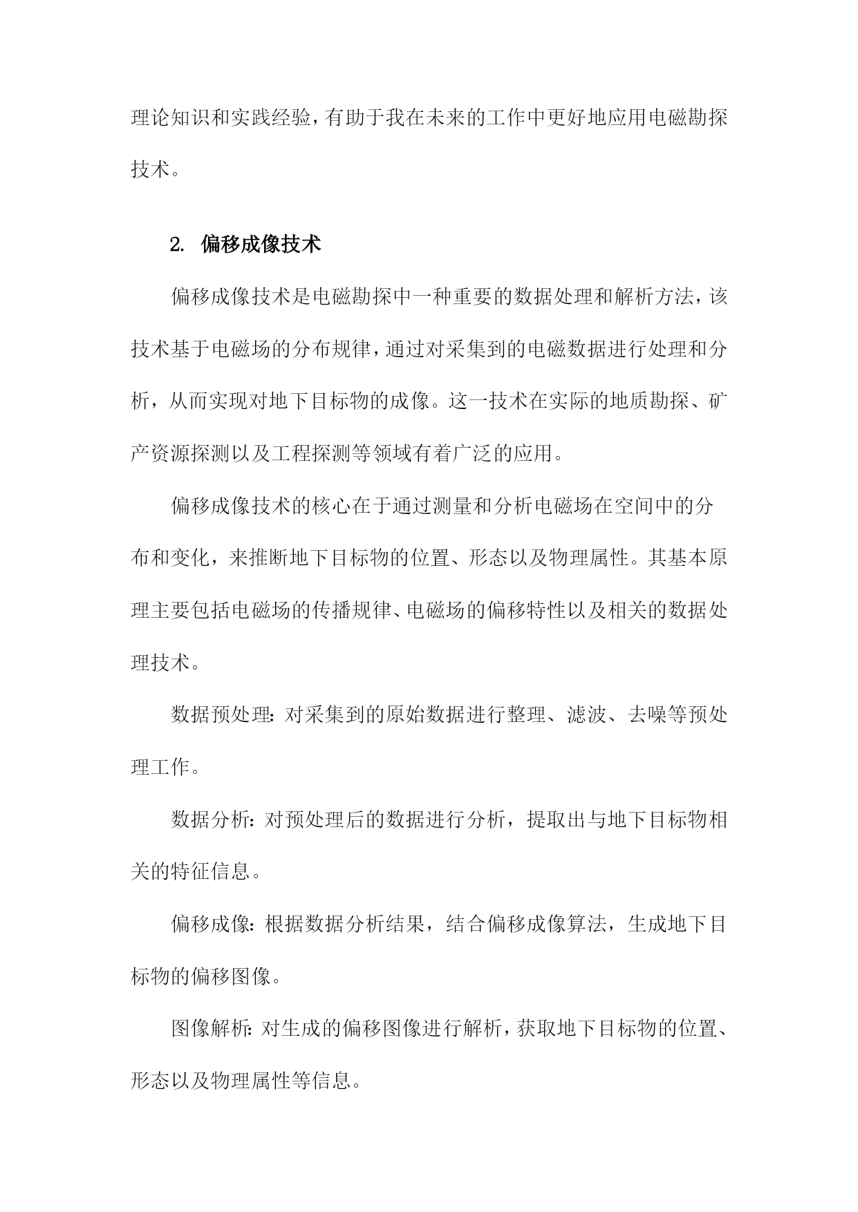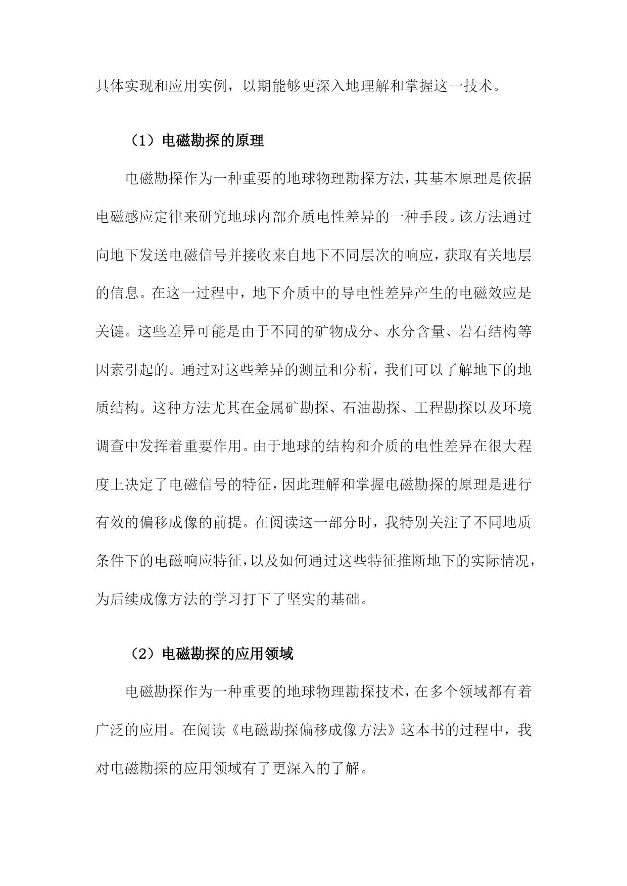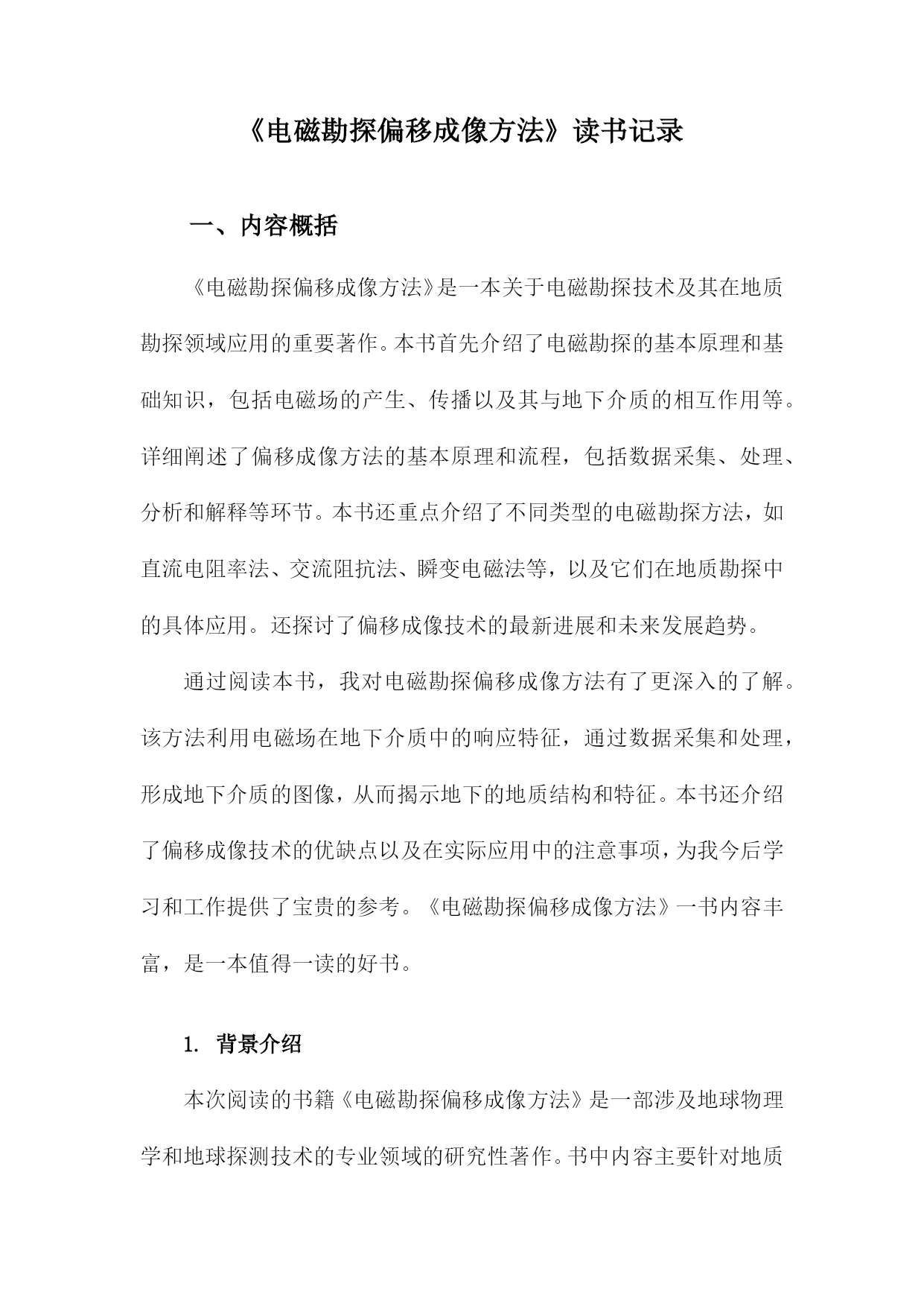 《电磁勘探偏移成像方法》读书记录一、内容概括《电磁勘探偏移成像方法》是一本关于电磁勘探技术及其在地质勘探领域应用的重要著作。本书首先介绍了电磁勘探的基本原理和基础知识,包括电磁场的产生、传播以及其与地下介质的相互作用等。详细阐述了偏移成像方法的基本原理和流程,包括数据采集、处理、分析和解释等环节。本书还重点介绍了不同类型的电磁勘探方法,如直流电阻率法、交流阻抗法、瞬变电磁法等,以及它们在地质勘探中的具体应用。还探讨了偏移成像技术的最新进展和未来发展趋势。通过阅读本书,我对电磁勘探偏移成像方法有了更深入的了解。该方法利用电磁场在地下介质中的响应特征,通过数据采集和处理,形成地下介质的图像,从而揭示地下的地质结构和特征。本书还介绍了偏移成像技术的优缺点以及在实际应用中的注意事项,为我今后学习和工作提供了宝贵的参考。《电磁勘探偏移成像方法》一书内容丰富,是一本值得一读的好书。1.背景介绍本次阅读的书籍《电磁勘探偏移成像方法》是一部涉及地球物理学和地球探测技术的专业领域的研究性著作。书中内容主要针对地质勘测过程中应用到的电磁勘探技术进行深入探讨,特别是在偏移成像方面的应用和发展趋势。随着科技的不断进步,电磁勘探偏移成像技术已经成为矿产资源勘探、地质工程勘察以及环境监测等领域不可或缺的重要手段。学习并掌握电磁勘探偏移成像方法成为相关从业者及学者不可或缺的技能。本次读书记录的目的是梳理《电磁勘探偏移成像方法》一书的重点内容,记录学习过程及心得,加深理解并促进知识吸收。在背景介绍部分,需要了解电磁勘探技术的起源和发展,随着科技的进步以及实际应用的需求逐渐增大,人们对于矿产资源的高效勘探和环境监测等领域的技术需求日益迫切。在此背景下,电磁勘探偏移成像技术应运而生,并逐渐发展成为地球物理学领域的重要分支。了解该技术背后的社会需求与发展背景有助于深入理解学习的意义与价值,对于提高实践操作技能和掌握理论知识具有很好的促进作用。阅读书籍的初期,背景的调研和分析是必不可少的环节。也将介绍作者的基本信息、书籍的主要章节内容等概述信息作为背景的一部分进行呈现。这一环节的记录不仅能够帮助我们深入理解学习的起点与理论基础,还能为后续深入学习奠定坚实的基础。2.电磁勘探偏移成像方法的重要性在矿产资源勘探领域,电磁勘探偏移成像方法可以探测地下的金属矿物分布,为矿产资源的定位、定量评估提供重要依据。随着全球矿产资源需求的不断增长,电磁勘探偏移成像方法成为了寻找矿产资源的重要手段之一。该方法还可以应用于油气资源勘探,通过探测地下油气藏的分布和特征,为油气资源的开发提供有力支持。在工程探测领域,电磁勘探偏移成像方法可以应用于地下管线探测、隧道地质勘察、地下室检测等方面。随着城市化进程的加快,地下管线和基础设施的建设日益增多,电磁勘探偏移成像方法在保障城市基础设施安全、防止工程事故发生方面发挥着重要作用。在环境监测领域,电磁勘探偏移成像方法可以应用于地下水污染、土壤污染等环境问题的监测。通过探测地下介质的电性特征变化,可以及时发现环境污染问题,为环境保护和污染治理提供科学依据。该方法还可以应用于地质灾害预警,通过监测地下介质的变化,预测可能发生的地质灾害,为防灾减灾提供有力支持。电磁勘探偏移成像方法以其独特的优势在资源勘探、工程探测、环境监测等领域发挥着重要作用。随着技术的不断发展,该方法将在未来地球物理探测领域发挥更加重要的作用,为人类的可持续发展做出更大的贡献。二、基础知识电磁勘探概述:电磁勘探是一种地球物理勘探方法,通过测量地下介质对电磁场的响应来推断地下的地质结构、矿物分布等。电磁勘探广泛应用于矿产资源勘探、工程勘察、环境监测等领域。偏移成像概念:偏移成像是一种将地下电磁场的空间分布转换为图像的技术。通过对电磁数据的采集和处理,可以生成反映地下介质分布和特征的图像,为地质解释和决策提供依据。电磁场理论:本段落介绍了电磁波在地下介质中的传播特性,包括电磁波的频率、波长、传播速度等参数。还介绍了地下介质的电性参数,如电阻率、介电常数等,这些参数对电磁波的传播和响应具有重要影响。电磁勘探仪器:介绍了进行电磁勘探所使用的主要仪器和设备,包括发射机、接收机、线圈等。这些设备的性能参数和使用方法对电磁勘探的效果具有重要影响。数据处理与解释:本段落介绍了电磁数据的处理方法和解释过程,包括数据采集、预处理、反演分析等环节。数据处理的主要目的是提取有用的地质信息,为地质解释提供依据。相关技术进展:本段落还介绍了电磁勘探偏移成像方法的相关技术进展,包括新理论、新方法、新技术等。这些进展为电磁勘探偏移成像方法的应用提供了技术支持和保障。1.电磁勘探概述电磁勘探作为一种重要的地球物理勘探手段,主要用于地下结构的非破坏性探测和资源勘测。通过对地球表面