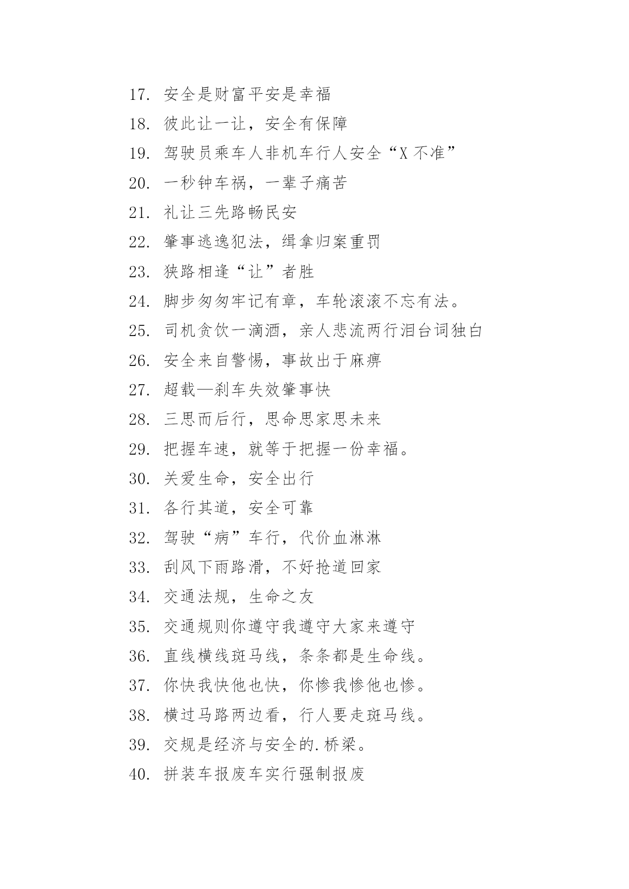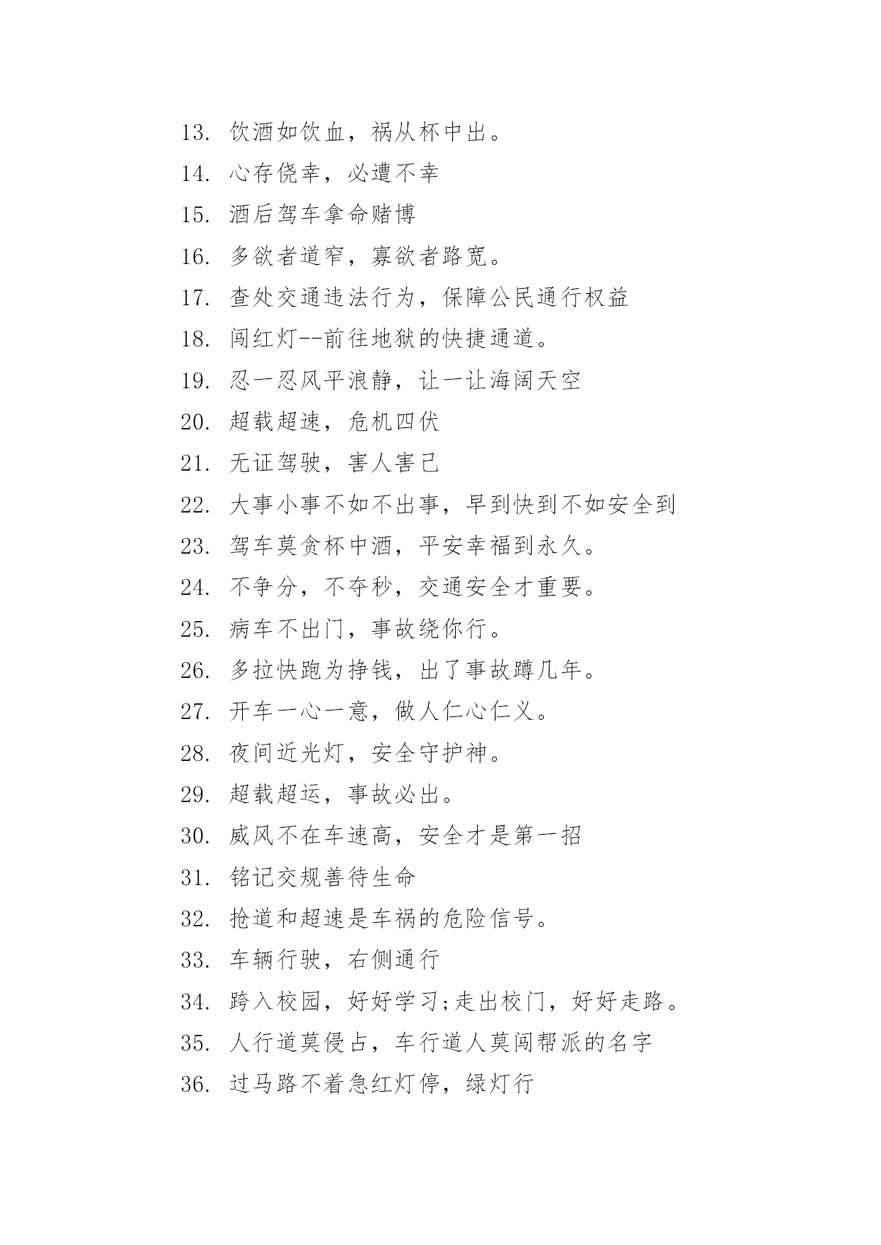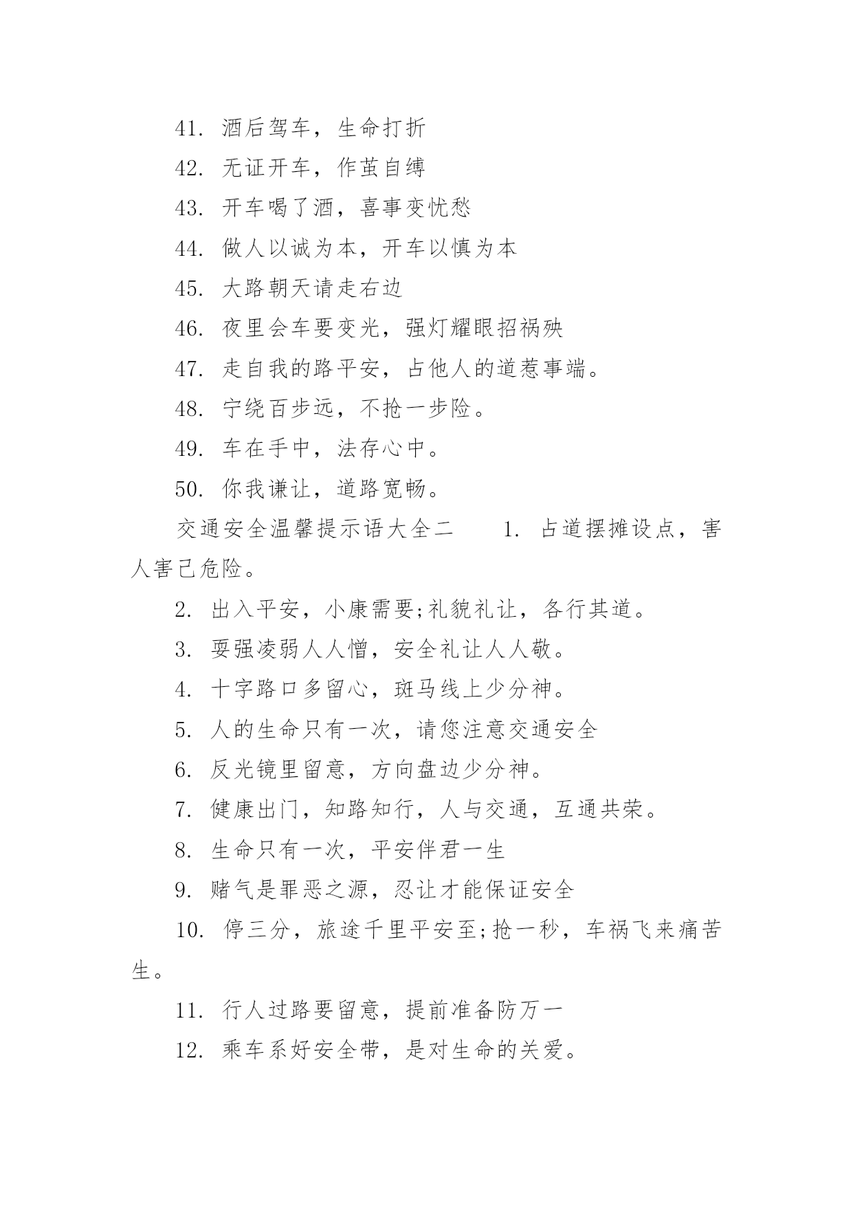 交通安全的温馨提示语交通安全的温馨提示语100句退一步都有路,让一秒事故少。宁走千步远,不冒一步险,小编为大家收集整理了交通安全温馨提示语大全,供大家学习借鉴参考,希望对你有帮助!交通安全温馨提示语大全一1.深入扎实地开展交通安全宣传“五进”活动2.遵守交法,远离车祸。3.喝酒过多伤肝,酒后驾车要命4.肇事逃逸将终生禁止驾车5.严是爱,松是害,发生事故祸三代6.人疲车自疲,车病人亦病;若要保平安,安全记心中。7.违章罚款是手段,安全教育是资料,交通安全是目的8.骑车请戴安全帽,流汗总比流血好9.交通法规血凝成,自觉遵守保平安10.处罚违章不留情看似无情最深情11.车让人,人让车,车让车12.手握方向盘,时刻想安全13.麻痹是事故的前奏,侥幸是灾难的根源。14.开违章车,闯弥天祸,伤亲友心,流悔恨泪。15.一停二看三透过,麻痹大意是灾祸。16.礼让三分平安在,抢行一秒后悔迟17.安全是财富平安是幸福18.彼此让一让,安全有保障19.驾驶员乘车人非机车行人安全“X不准”20.一秒钟车祸,一辈子痛苦21.礼让三先路畅民安22.肇事逃逸犯法,缉拿归案重罚23.狭路相逢“让”者胜24.脚步匆匆牢记有章,车轮滚滚不忘有法。25.司机贪饮一滴酒,亲人悲流两行泪台词独白26.安全来自警惕,事故出于麻痹27.超载—刹车失效肇事快28.三思而后行,思命思家思未来29.把握车速,就等于把握一份幸福。30.关爱生命,安全出行31.各行其道,安全可靠32.驾驶“病”车行,代价血淋淋33.刮风下雨路滑,不好抢道回家34.交通法规,生命之友35.交通规则你遵守我遵守大家来遵守36.直线横线斑马线,条条都是生命线。37.你快我快他也快,你惨我惨他也惨。38.横过马路两边看,行人要走斑马线。39.交规是经济与安全的.桥梁。40.拼装车报废车实行强制报废41.酒后驾车,生命打折42.无证开车,作茧自缚43.开车喝了酒,喜事变忧愁44.做人以诚为本,开车以慎为本45.大路朝天请走右边46.夜里会车要变光,强灯耀眼招祸殃47.走自我的路平安,占他人的道惹事端。48.宁绕百步远,不抢一步险。49.车在手中,法存心中。50.你我谦让,道路宽畅。交通安全温馨提示语大全二1.占道摆摊设点,害人害己危险。2.出入平安,小康需要;礼貌礼让,各行其道。3.耍强凌弱人人憎,安全礼让人人敬。4.十字路口多留心,斑马线上少分神。5.人的生命只有一次,请您注意交通安全6.反光镜里留意,方向盘边少分神。7.健康出门,知路知行,人与交通,互通共荣。8.生命只有一次,平安伴君一生9.赌气是罪恶之源,忍让才能保证安全10.停三分,旅途千里平安至;抢一秒,车祸飞来痛苦生。11.行人过路要留意,提前准备防万一12.乘车系好安全带,是对生命的关爱。13.饮酒如饮血,祸从杯中出。14.心存侥幸,必遭不幸15.酒后驾车拿命赌博16.多欲者道窄,寡欲者路宽。17.查处交通违法行为,保障公民通行权益18.闯红灯--前往地狱的快捷通道。19.忍一忍风平浪静,让一让海阔天空20.超载超速,危机四伏21.无证驾驶,害人害己22.大事小事不如不出事,早到快到不如安全到23.驾车莫贪杯中酒,平安幸福到永久。24.不争分,不夺秒,交通安全才重要。25.病车不出门,事故绕你行。26.多拉快跑为挣钱,出了事故蹲几年。27.开车一心一意,做人仁心仁义。28.夜间近光灯,安全守护神。29.超载超运,事故必出。30.威风不在车速高,安全才是第一招31.铭记交规善待生命32.抢道和超速是车祸的危险信号。33.车辆行驶,右侧通行34.跨入校园,好好学习;走出校门,好好走路。35.人行道莫侵占,车行道人莫闯帮派的名字36.过马路不着急红灯停,绿灯行37.司机一点酒,家人两行泪。38.下坡让上坡;礼让先自我。39.汽车开得快,阎王最喜爱。40.酒后驾车生命打折41.交通法规不一样情眼泪,生命不可能重来42.车轮滚滚,祸起无情。43.违法驾驶危害大,交通安全系万家44.你让我让,路路通畅45.朋友,为了您和他人的幸福,明白交警的严格吧!46.大马路上晒麦草,忙里忙外命难保。47.离交通安全法近,距交通事故远48.一人安危系全家,全家幸福系一人49.珍惜生命拒绝违章50.抢道和超速是车祸的危险信号。
