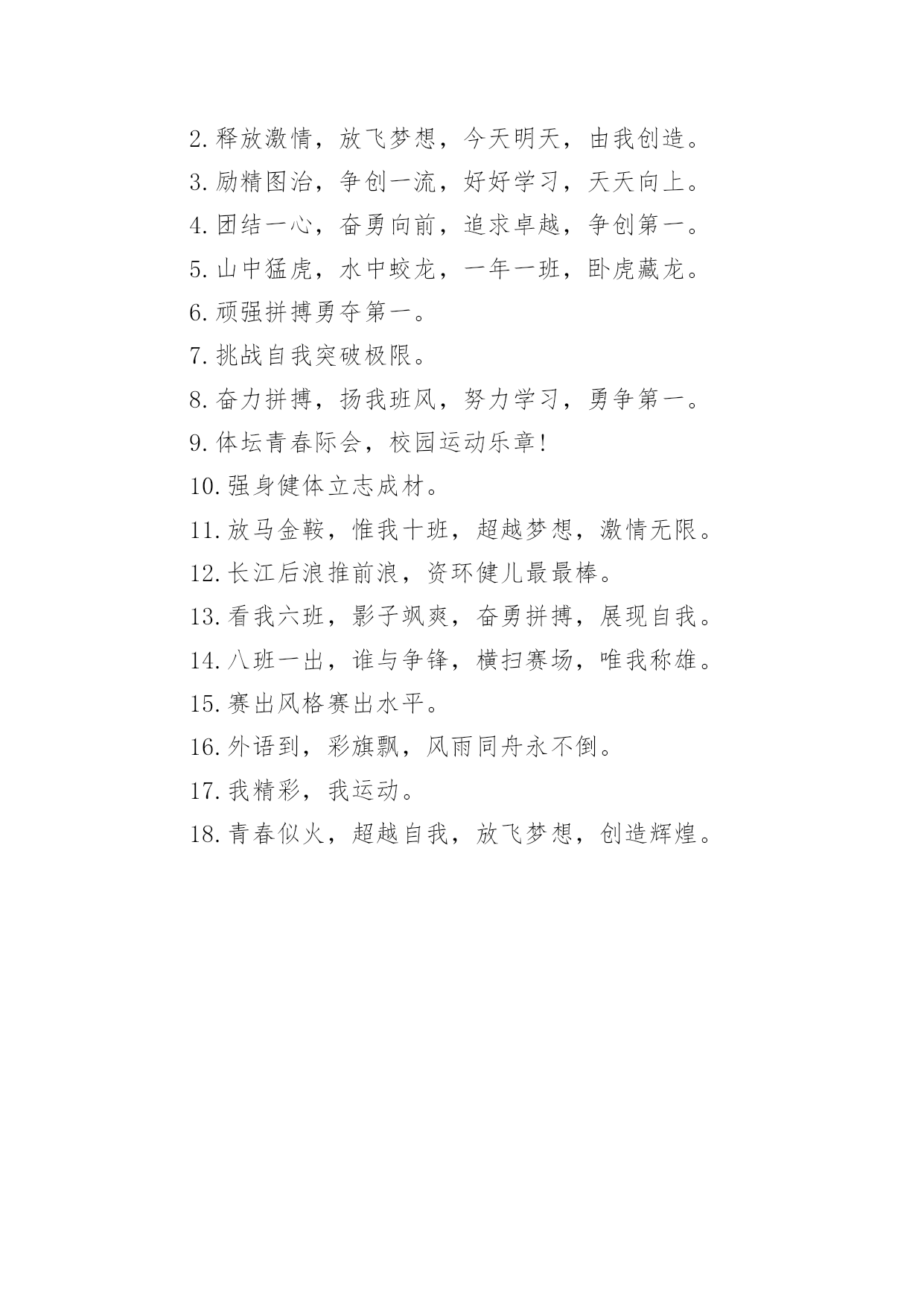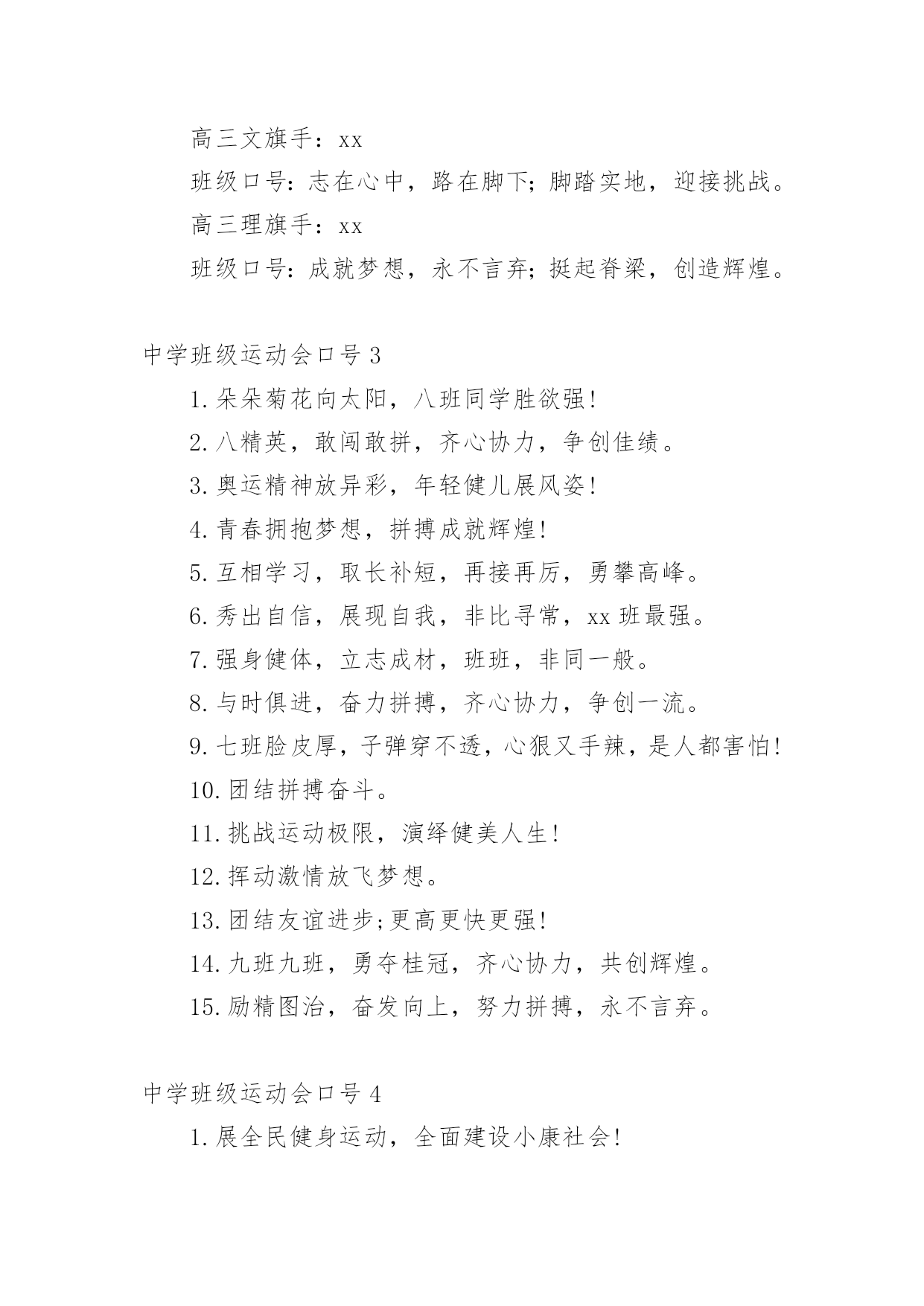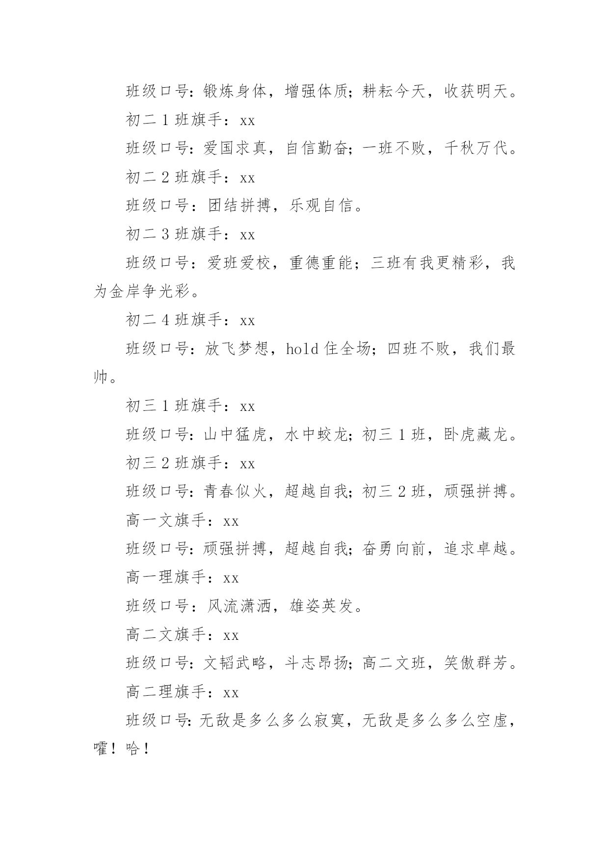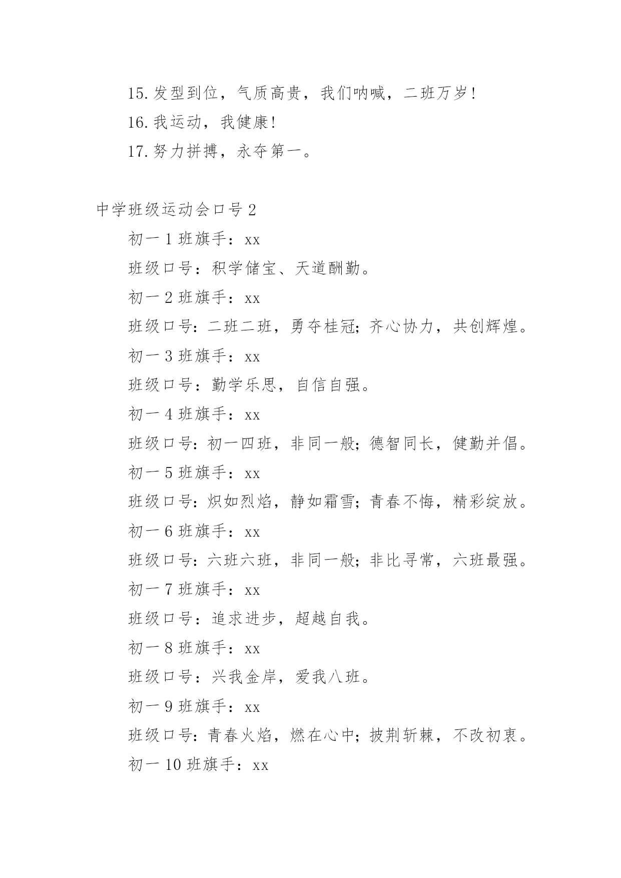 中学班级运动会口号在学习、工作或生活中,大家一定没少看到过口号吧,高效的`口号具有针对性,时效性,鼓动性和简洁性的特点。那些被广泛运用的口号都是什么样子的呢?下面是小编帮大家整理的中学班级运动会口号,欢迎阅读,希望大家能够喜欢。中学班级运动会口号11.挥动激情,挑战自我,突破极限,超越自我。2.五班五班,我是五班,再说一遍,我是五班!3.九班九班,法力无边,来我九班,早日成仙!4.我运动,我健康,我快乐。5.磨砺意志,奋发冲刺,团结拼搏,展现自我。6.全民健身,利国利民,功在当代,利在千秋!7.奋发拼搏勇于开拓。8.一班参加运动会,其他班级洗了睡,神马运动皆浮云,我信春哥我必行!9.扬帆把舵,奋勇拼搏,看我三班,锐不可当。10.鸣奏青春旋律,抒写运动乐意!11.年轻健儿显身手,时代骄子竞风流!12.顽强拼搏超越极限。13.团结进取,开拓创新,顽强拼搏,争创一流。14.拼搏奋进永远进步。15.发型到位,气质高贵,我们呐喊,二班万岁!16.我运动,我健康!17.努力拼搏,永夺第一。中学班级运动会口号2初一1班旗手:xx班级口号:积学储宝、天道酬勤。初一2班旗手:xx班级口号:二班二班,勇夺桂冠;齐心协力,共创辉煌。初一3班旗手:xx班级口号:勤学乐思,自信自强。初一4班旗手:xx班级口号:初一四班,非同一般;德智同长,健勤并倡。初一5班旗手:xx班级口号:炽如烈焰,静如霜雪;青春不悔,精彩绽放。初一6班旗手:xx班级口号:六班六班,非同一般;非比寻常,六班最强。初一7班旗手:xx班级口号:追求进步,超越自我。初一8班旗手:xx班级口号:兴我金岸,爱我八班。初一9班旗手:xx班级口号:青春火焰,燃在心中;披荆斩棘,不改初衷。初一10班旗手:xx班级口号:锻炼身体,增强体质;耕耘今天,收获明天。初二1班旗手:xx班级口号:爱国求真,自信勤奋;一班不败,千秋万代。初二2班旗手:xx班级口号:团结拼搏,乐观自信。初二3班旗手:xx班级口号:爱班爱校,重德重能;三班有我更精彩,我为金岸争光彩。初二4班旗手:xx班级口号:放飞梦想,hold住全场;四班不败,我们最帅。初三1班旗手:xx班级口号:山中猛虎,水中蛟龙;初三1班,卧虎藏龙。初三2班旗手:xx班级口号:青春似火,超越自我;初三2班,顽强拼搏。高一文旗手:xx班级口号:顽强拼搏,超越自我;奋勇向前,追求卓越。高一理旗手:xx班级口号:风流潇洒,雄姿英发。高二文旗手:xx班级口号:文韬武略,斗志昂扬;高二文班,笑傲群芳。高二理旗手:xx班级口号:无敌是多么多么寂寞,无敌是多么多么空虚,嚯!哈!高三文旗手:xx班级口号:志在心中,路在脚下;脚踏实地,迎接挑战。高三理旗手:xx班级口号:成就梦想,永不言弃;挺起脊梁,创造辉煌。中学班级运动会口号31.朵朵菊花向太阳,八班同学胜欲强!2.八精英,敢闯敢拼,齐心协力,争创佳绩。3.奥运精神放异彩,年轻健儿展风姿!4.青春拥抱梦想,拼搏成就辉煌!5.互相学习,取长补短,再接再厉,勇攀高峰。6.秀出自信,展现自我,非比寻常,xx班最强。7.强身健体,立志成材,班班,非同一般。8.与时俱进,奋力拼搏,齐心协力,争创一流。9.七班脸皮厚,子弹穿不透,心狠又手辣,是人都害怕!10.团结拼搏奋斗。11.挑战运动极限,演绎健美人生!12.挥动激情放飞梦想。13.团结友谊进步;更高更快更强!14.九班九班,勇夺桂冠,齐心协力,共创辉煌。15.励精图治,奋发向上,努力拼搏,永不言弃。中学班级运动会口号41.展全民健身运动,全面建设小康社会!2.释放激情,放飞梦想,今天明天,由我创造。3.励精图治,争创一流,好好学习,天天向上。4.团结一心,奋勇向前,追求卓越,争创第一。5.山中猛虎,水中蛟龙,一年一班,卧虎藏龙。6.顽强拼搏勇夺第一。7.挑战自我突破极限。8.奋力拼搏,扬我班风,努力学习,勇争第一。9.体坛青春际会,校园运动乐章!10.强身健体立志成材。11.放马金鞍,惟我十班,超越梦想,激情无限。12.长江后浪推前浪,资环健儿最最棒。13.看我六班,影子飒爽,奋勇拼搏,展现自我。14.八班一出,谁与争锋,横扫赛场,唯我称雄。15.赛出风格赛出水平。16.外语到,彩旗飘,风雨同舟永不倒。17.我精彩,我运动。18.青春似火,超越自我,放飞梦想,创造辉煌。