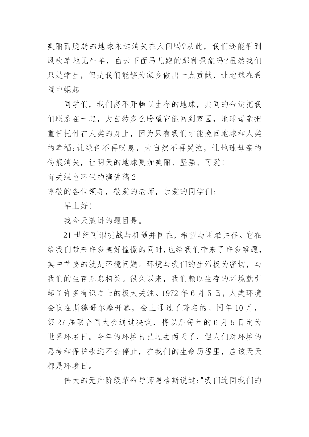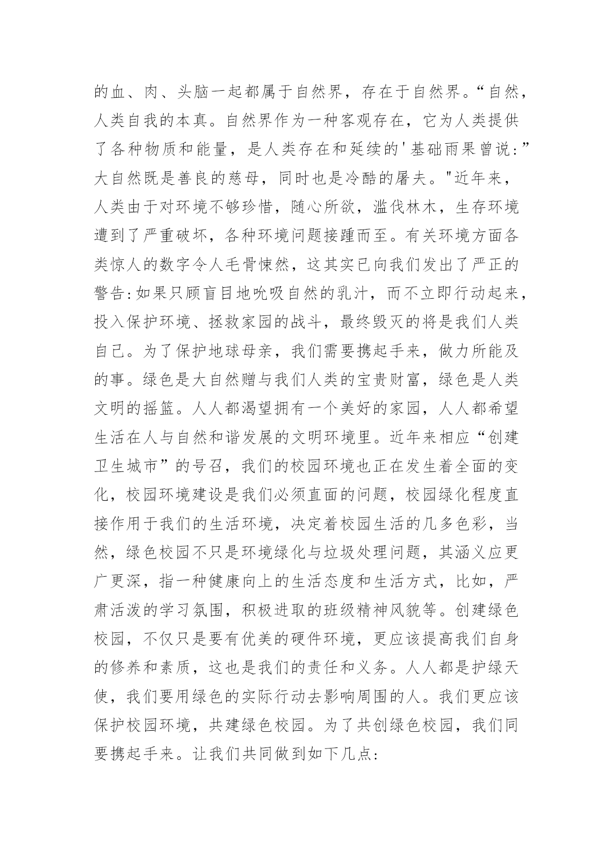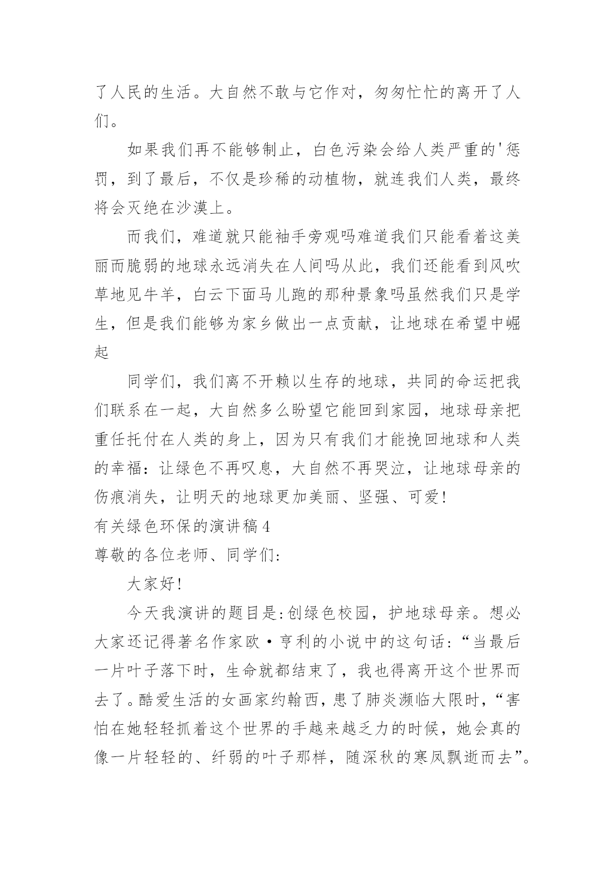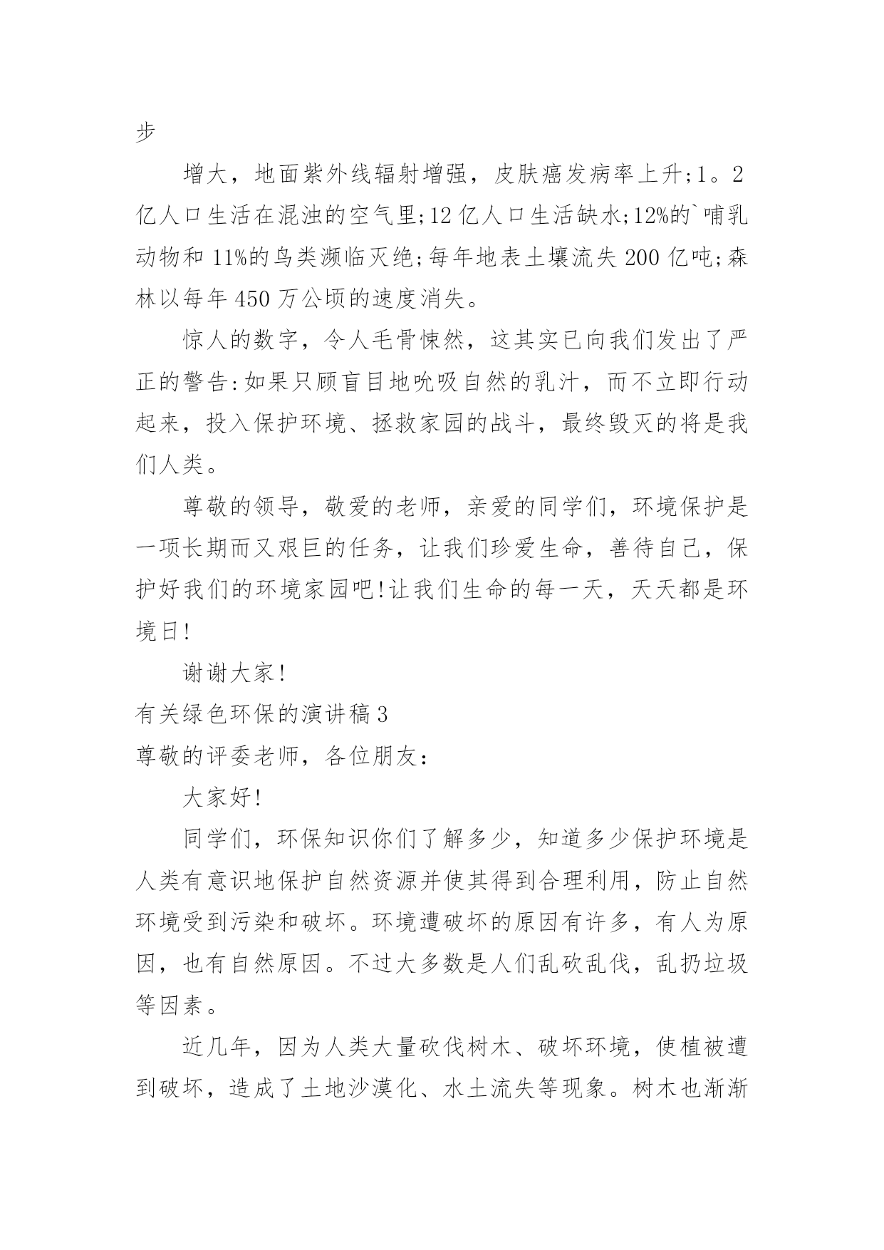 绿色环保的演讲稿有关绿色环保的演讲稿演讲稿可以帮助发言者更好的表达。在生活中,演讲稿使用的情况越来越多,你写演讲稿时总是没有新意?下面是小编整理的有关绿色环保的演讲稿,欢迎大家分享。有关绿色环保的演讲稿1老师们,同学们:大家好!我演讲的题目是:保护环境,从小做起。同学们,环保知识你们了解多少,知道多少?保护环境是人类有意识地保护自然资源并使其得到合理利用,防止自然环境受到污染和破坏。环境遭破坏的原因有许多,有人为原因,也有自然原因。不过大多数是人们乱砍乱伐,乱扔垃圾等因素。近几年,因为人类大量砍伐树木、破坏环境,使植被遭到破坏,造成了土地沙漠化、水土流失等现象。树木也渐渐减少,于是,二氧化碳无法吸收,大量的二氧化碳使空气变得温暖,就造成了世界上目前出现的状况:气温逐渐增高。然而,造成这个现象的原因是什么呢?我们人类为了自己的生存、为了自己生活的更好,不顾地球母亲的身体。工厂里乱排放污水,烟囱冒着浓浓黑烟,乱砍伐森林树木,浪费资源……使清澈的.河水变得浑浊,茂密的森林变得狼狈不堪,蔚蓝的天空变得灰暗,碧绿的青山变得光秃秃。所以,使江河附近的水土流失,造成了洪水这个现象。泥石流、森林火灾、动物绝迹、水源严重缺乏等一连串的灾害接二连三,使我们的地球母亲难以承受。这都是人们自作自受的后果,损失了这么多,我们能怪谁呢?还不是怪我们自己,我们每一个人都有一份责任,毕竟,地球是我们大家共同的。这些年来,我们国家也受到了严重的环境污染,特大沙尘暴在我国一次又一次发生,它将会掩埋草地、吞毁家园,严重地影响了人民的生活,使我们难以生存。绿色的草地将会变成沙漠,大树将会永远卧倒在地,而我们也不会快乐生活:幸福没有了,亲人没有了,连我们赖以生存的地球也会在茫茫宇宙中粉碎,就像玻璃摔在地上一样。然而这不仅是沙尘暴带来的灾难。每当4月22日,这是地球的节日,至今已经30年了,就因为“三废”污染(废水、废气、废渣)和“十大污染”,每年造成了全世界部分人患病、残废、甚至死亡。然而,白色污染已经有了自由,它在天空中胡作非为,把空气和臭氧层的衣服扎破,他让沙漠上的沙子飞得永远不得停息,搅乱了人民的生活。大自然不敢与它作对,匆匆忙忙的离开了人们。如果我们再不能够制止,白色污染会给人类严重的惩罚,到了最后,不仅是珍稀的动植物,就连我们人类,最终将会灭绝在沙漠上。而我们,难道就只能袖手旁观吗?难道我们只能看着这美丽而脆弱的地球永远消失在人间吗?从此,我们还能看到风吹草地见牛羊,白云下面马儿跑的那种景象吗?虽然我们只是学生,但是我们能够为家乡做出一点贡献,让地球在希望中崛起同学们,我们离不开赖以生存的地球,共同的命运把我们联系在一起,大自然多么盼望它能回到家园,地球母亲把重任托付在人类的身上,因为只有我们才能挽回地球和人类的幸福:让绿色不再叹息,大自然不再哭泣,让地球母亲的伤痕消失,让明天的地球更加美丽、坚强、可爱!有关绿色环保的演讲稿2尊敬的各位领导,敬爱的老师,亲爱的同学们:早上好!我今天演讲的题目是。21世纪可谓挑战与机遇并同在,希望与困难共存。它在给我们带来许多美好憧憬的同时,也给我们带来了许多难题,其中首要的就是环境问题。环境与我们的生活极为密切,与我们的生存息息相关。很久以来,我们赖以生存的环境就引起了许多有识之士的极大关注。1972年6月5日,人类环境会议在斯德哥尔摩开幕,会上通过了著名的。同年10月,第27届联合国大会通过决议,将以后每年的6月5日定为世界环境日。今年的环境日已过去两天了,但人们对环境的思考和保护永远不会停止,在我们的生命历程里,应该天天都是环境日。伟大的无产阶级革命导师恩格斯说过:"我们连同我们的血、肉、头脑一起都属于自然界,存在于自然界。"自然界作为一种客观存在,它为人类提供了各种物质和能量,是人类存在和延续的基础。优美和谐的自然环境,必然为我们带来身心的愉悦和无限的乐趣。"明月松间照,清泉石上流",让我们感受清幽;"大漠孤烟直,长河落日圆",让我们触摸壮丽;"流连戏蝶时时舞,自在娇莺恰恰啼",让我们聆听喧闹;"春水碧如天,画船听雨眠",让我们亲近悠闲;"棠梨叶落胭脂色,荠麦花开白雪香",让我们体味斑澜。碧海蓝天,看海鸥飞翔;冰封雪飘,听松涛轰鸣;莺飞草长,闻鸟语、嗅花香。清晨,观赏大海分娩太阳;夜晚,清数广宇闪烁星辰;雨天,让雨点亲吻面颊;雪天,让雪花栖挂眉梢;喂蚂蚁美餐,浇花草甘露;问候晨曦"你好",道别月色"晚安"。美丽的自然带来美丽的心境,美丽的心境带来了美丽的生活。千百年来,人类在不断地认识自然,利用自然,改造自然中造福着自己。世界文学大师雨果说:"大自然既是善良的慈母,同时也是冷酷的屠夫。"近年来,人类由于对环境不够珍惜,随心所欲,滥伐林木,滥建厂房,生存环境遭到了严重破坏,各种环境问题接踵而至:森林退化,沙尘暴扬,水
