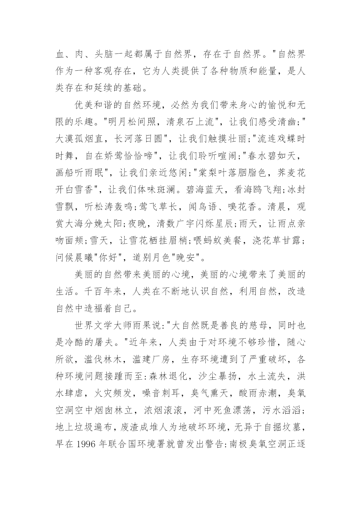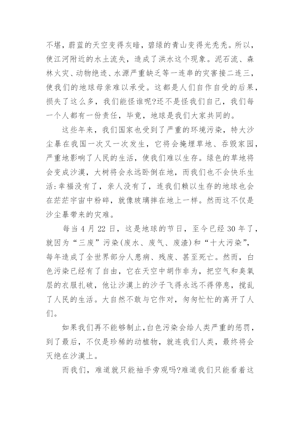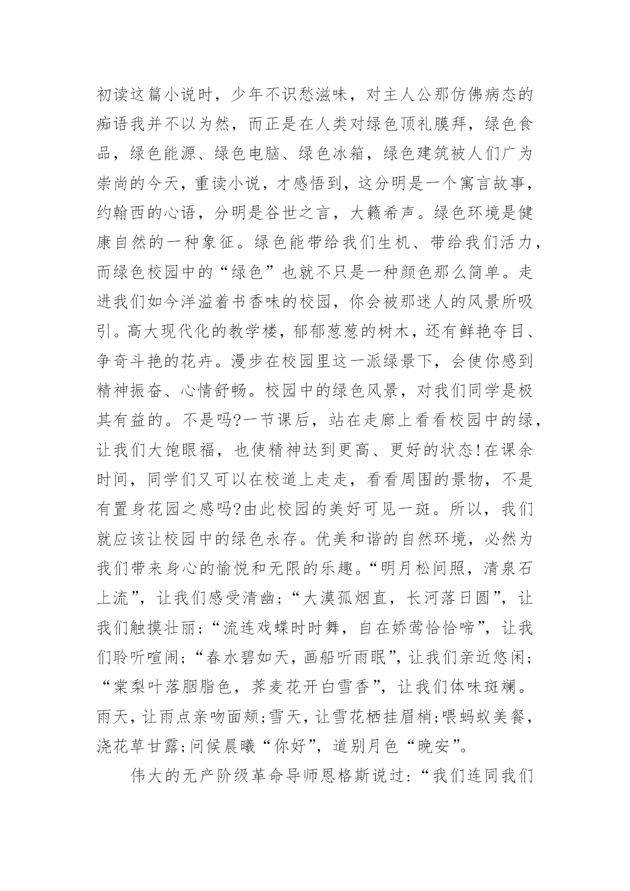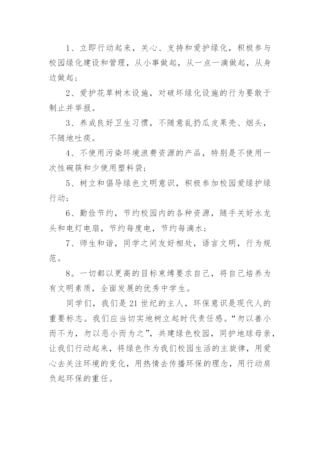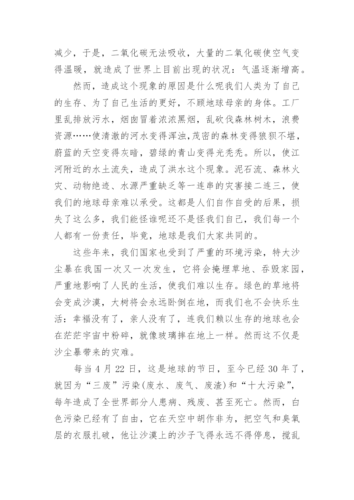 绿色环保的演讲稿有关绿色环保的演讲稿演讲稿可以帮助发言者更好的表达。在生活中,演讲稿使用的情况越来越多,你写演讲稿时总是没有新意?下面是小编整理的有关绿色环保的演讲稿,欢迎大家分享。有关绿色环保的演讲稿1老师们,同学们:大家好!我演讲的题目是:保护环境,从小做起。同学们,环保知识你们了解多少,知道多少?保护环境是人类有意识地保护自然资源并使其得到合理利用,防止自然环境受到污染和破坏。环境遭破坏的原因有许多,有人为原因,也有自然原因。不过大多数是人们乱砍乱伐,乱扔垃圾等因素。近几年,因为人类大量砍伐树木、破坏环境,使植被遭到破坏,造成了土地沙漠化、水土流失等现象。树木也渐渐减少,于是,二氧化碳无法吸收,大量的二氧化碳使空气变得温暖,就造成了世界上目前出现的状况:气温逐渐增高。然而,造成这个现象的原因是什么呢?我们人类为了自己的生存、为了自己生活的更好,不顾地球母亲的身体。工厂里乱排放污水,烟囱冒着浓浓黑烟,乱砍伐森林树木,浪费资源……使清澈的.河水变得浑浊,茂密的森林变得狼狈不堪,蔚蓝的天空变得灰暗,碧绿的青山变得光秃秃。所以,使江河附近的水土流失,造成了洪水这个现象。泥石流、森林火灾、动物绝迹、水源严重缺乏等一连串的灾害接二连三,使我们的地球母亲难以承受。这都是人们自作自受的后果,损失了这么多,我们能怪谁呢?还不是怪我们自己,我们每一个人都有一份责任,毕竟,地球是我们大家共同的。这些年来,我们国家也受到了严重的环境污染,特大沙尘暴在我国一次又一次发生,它将会掩埋草地、吞毁家园,严重地影响了人民的生活,使我们难以生存。绿色的草地将会变成沙漠,大树将会永远卧倒在地,而我们也不会快乐生活:幸福没有了,亲人没有了,连我们赖以生存的地球也会在茫茫宇宙中粉碎,就像玻璃摔在地上一样。然而这不仅是沙尘暴带来的灾难。每当4月22日,这是地球的节日,至今已经30年了,就因为“三废”污染(废水、废气、废渣)和“十大污染”,每年造成了全世界部分人患病、残废、甚至死亡。然而,白色污染已经有了自由,它在天空中胡作非为,把空气和臭氧层的衣服扎破,他让沙漠上的沙子飞得永远不得停息,搅乱了人民的生活。大自然不敢与它作对,匆匆忙忙的离开了人们。如果我们再不能够制止,白色污染会给人类严重的惩罚,到了最后,不仅是珍稀的动植物,就连我们人类,最终将会灭绝在沙漠上。而我们,难道就只能袖手旁观吗?难道我们只能看着这美丽而脆弱的地球永远消失在人间吗?从此,我们还能看到风吹草地见牛羊,白云下面马儿跑的那种景象吗?虽然我们只是学生,但是我们能够为家乡做出一点贡献,让地球在希望中崛起同学们,我们离不开赖以生存的地球,共同的命运把我们联系在一起,大自然多么盼望它能回到家园,地球母亲把重任托付在人类的身上,因为只有我们才能挽回地球和人类的幸福:让绿色不再叹息,大自然不再哭泣,让地球母亲的伤痕消失,让明天的地球更加美丽、坚强、可爱!有关绿色环保的演讲稿2尊敬的各位领导,敬爱的老师,亲爱的同学们:早上好!我今天演讲的题目是。21世纪可谓挑战与机遇并同在,希望与困难共存。它在给我们带来许多美好憧憬的同时,也给我们带来了许多难题,其中首要的就是环境问题。环境与我们的生活极为密切,与我们的生存息息相关。很久以来,我们赖以生存的环境就引起了许多有识之士的极大关注。1972年6月5日,人类环境会议在斯德哥尔摩开幕,会上通过了著名的。同年10月,第27届联合国大会通过决议,将以后每年的6月5日定为世界环境日。今年的环境日已过去两天了,但人们对环境的思考和保护永远不会停止,在我们的生命历程里,应该天天都是环境日。伟大的无产阶级革命导师恩格斯说过:"我们连同我们的血、肉、头脑一起都属于自然界,存在于自然界。"自然界作为一种客观存在,它为人类提供了各种物质和能量,是人类存在和延续的基础。优美和谐的自然环境,必然为我们带来身心的愉悦和无限的乐趣。"明月松间照,清泉石上流",让我们感受清幽;"大漠孤烟直,长河落日圆",让我们触摸壮丽;"流连戏蝶时时舞,自在娇莺恰恰啼",让我们聆听喧闹;"春水碧如天,画船听雨眠",让我们亲近悠闲;"棠梨叶落胭脂色,荠麦花开白雪香",让我们体味斑澜。碧海蓝天,看海鸥飞翔;冰封雪飘,听松涛轰鸣;莺飞草长,闻鸟语、嗅花香。清晨,观赏大海分娩太阳;夜晚,清数广宇闪烁星辰;雨天,让雨点亲吻面颊;雪天,让雪花栖挂眉梢;喂蚂蚁美餐,浇花草甘露;问候晨曦"你好",道别月色"晚安"。美丽的自然带来美丽的心境,美丽的心境带来了美丽的生活。千百年来,人类在不断地认识自然,利用自然,改造自然中造福着自己。世界文学大师雨果说:"大自然既是善良的慈母,同时也是冷酷的屠夫。"近年来,人类由于对环境不够珍惜,随心所欲,滥伐林木,滥建厂房,生存环境遭到了严重破坏,各种环境问题接踵而至:森林退化,沙尘暴扬,水