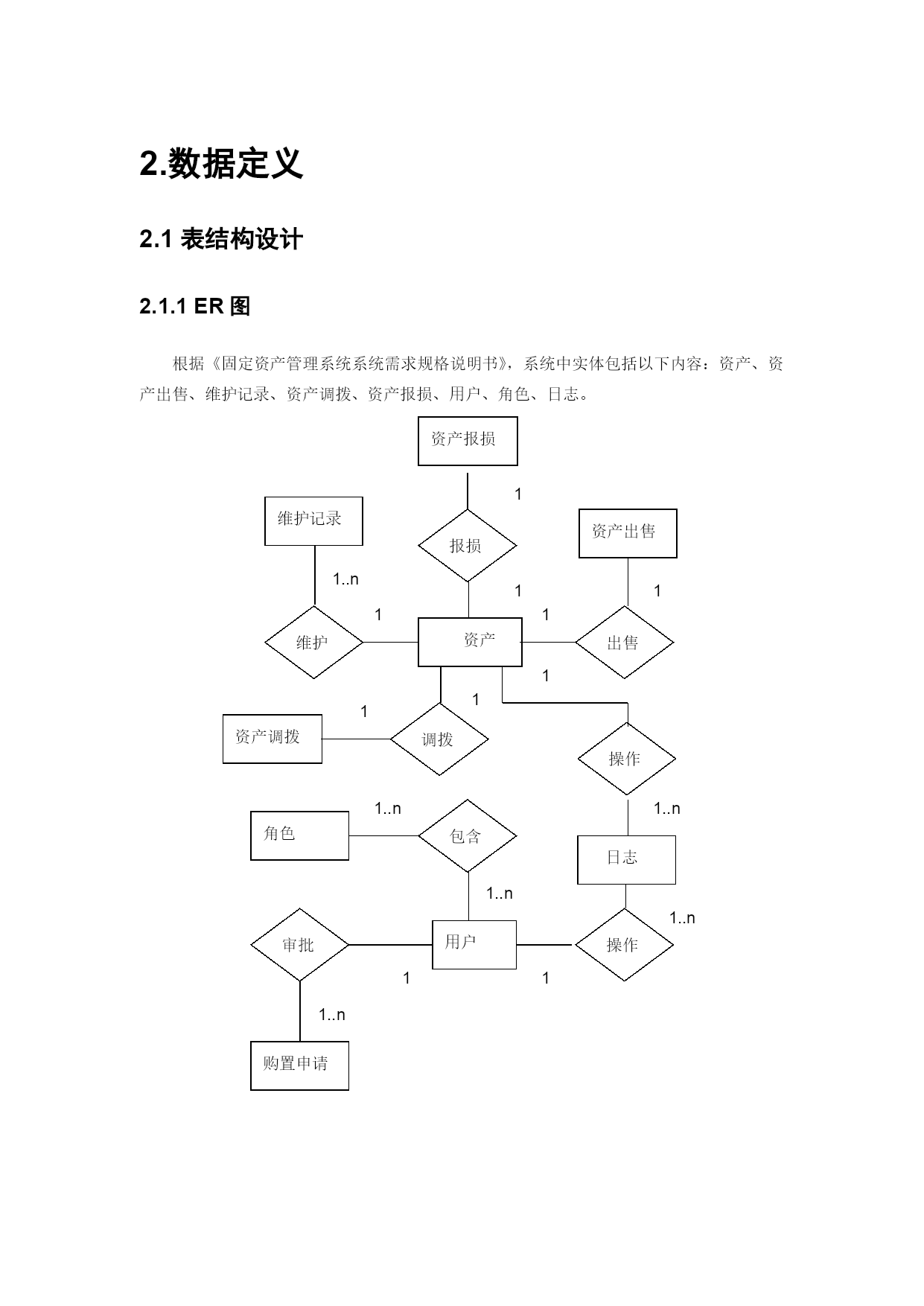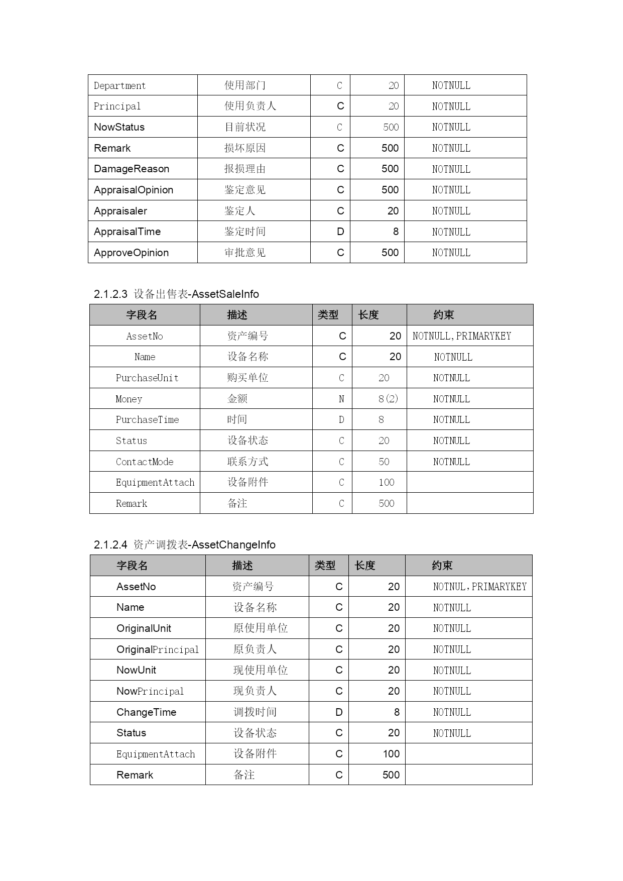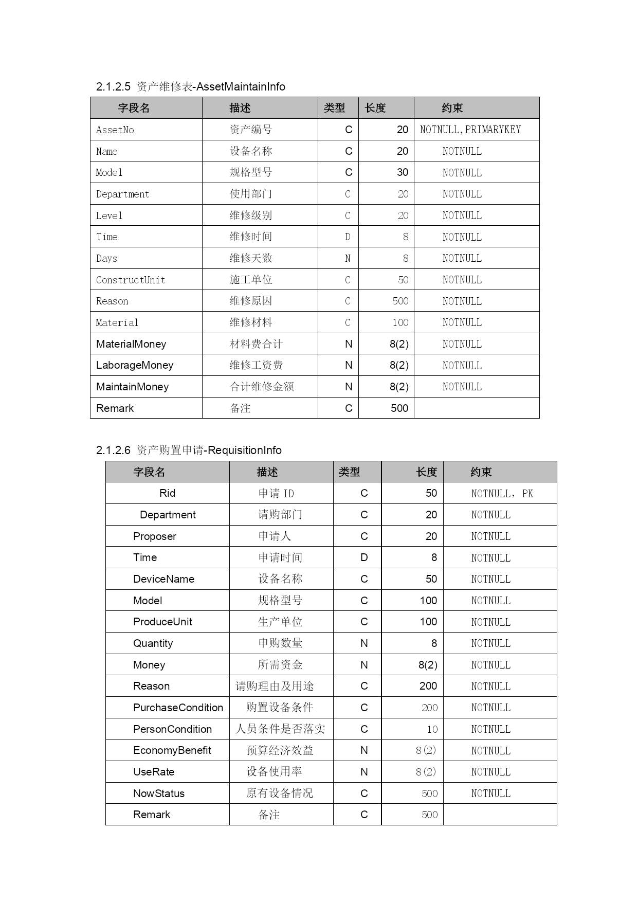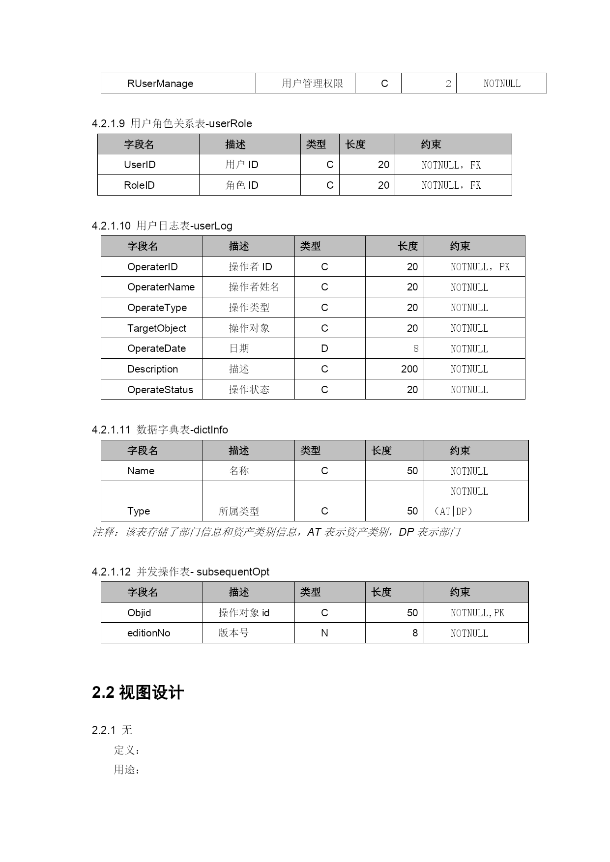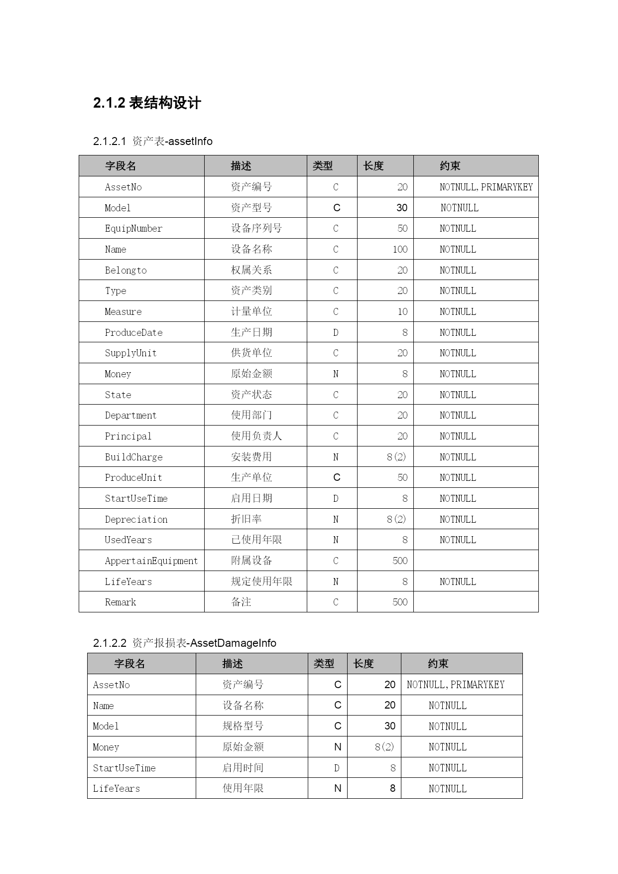 固定资产管理系统数据库设计文档版本:1.0作者:日期:审批:日期:变更记录日期版本变更说明作者1.0创建目录TOC\o"1-3"\h\z\u1.概述目的本文档基于《固定资产管理系统系统需求规格说明书》进行数据分析,定义了固定资产管理系统的数据库设计。数据库的分布特性固定资产管理系统数据库用来支持固定资产管理,包括资产管理、资产采购、报表管理、系统用户管理。数据库采用集中式数据库系统。数据库的备份要求固定资产管理系统所管理的数据变更不频繁,建议每周做一次完全备份。2.数据定义2.1表结构设计2.1.1ER图根据《固定资产管理系统系统需求规格说明书》,系统中实体包括以下内容:资产、资产出售、维护记录、资产调拨、资产报损、用户、角色、日志。资产报损维护记录1资产出售报损1..n111出售1维护资产11资产调拨1调拨操作1..n1..n包含角色日志1..n审批1..n操作用户111..n购置申请2.1.2表结构设计字段名描述类型长度约束AssetNo资产编号C20NOTNULL,PRIMARYKEYModel资产型号C30NOTNULLEquipNumber设备序列号C50NOTNULLName设备名称C100NOTNULLBelongto权属关系C20NOTNULLType资产类别C20NOTNULLMeasure计量单位C10NOTNULLProduceDate生产日期D8NOTNULLSupplyUnit供货单位C20NOTNULLMoney原始金额N8NOTNULLState资产状态C20NOTNULLDepartment使用部门C20NOTNULLPrincipal使用负责人C20NOTNULLBuildCharge安装费用N8(2)NOTNULLProduceUnit生产单位C50NOTNULLStartUseTime启用日期D8NOTNULLDepreciation折旧率N8(2)NOTNULLUsedYears已使用年限N8NOTNULLAppertainEquipment附属设备C500LifeYears规定使用年限N8NOTNULLRemark备注C5002.1.2.1资产表-assetInfo2.1.2.2资产报损表-AssetDamageInfo字段名描述类型长度约束AssetNo资产编号C20NOTNULL,PRIMARYKEYName设备名称C20NOTNULLModel规格型号C30NOTNULLMoney原始金额N8(2)NOTNULLStartUseTime启用时间D8NOTNULLLifeYears使用年限N8NOTNULLDepartment使用部门C20NOTNULLPrincipal使用负责人C20NOTNULLNowStatus目前状况C500NOTNULLRemark损坏原因C500NOTNULLDamageReason报损理由C500NOTNULLAppraisalOpinion鉴定意见C500NOTNULLAppraisaler鉴定人C20NOTNULLAppraisalTime鉴定时间D8NOTNULLApproveOpinion审批意见C500NOTNULL2.1.2.3设备出售表-AssetSaleInfo字段名描述类型长度约束AssetNo资产编号C20NOTNULL,PRIMARYKEYName设备名称C20NOTNULLPurchaseUnit购买单位C20NOTNULLMoney金额N8(2)NOTNULLPurchaseTime时间D8NOTNULLStatus设备状态C20NOTNULLContactMode联系方式C50NOTNULLEquipmentAttach设备附件C100Remark备注C5002.1.2.4资产调拨表-AssetChangeInfo字段名描述类型长度约束AssetNo资产编号C20NOTNUL,PRIMARYKEYName设备名称C20NOTNULLOriginalUnit原使用单位C20NOTNULLOriginalPrincipal原负责人C20NOTNULLNowUnit现使用单位C20NOTNULLNowPrincipal现负责人C20NOTNULLChangeTime调拨时间D8NOTNULLStatus设备状态C20NOTNULLEquipmentAttach设备附件C100Remark备注C50