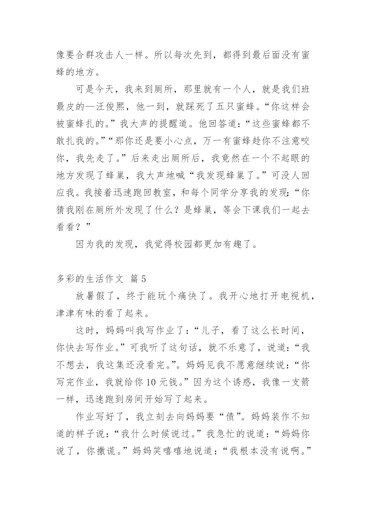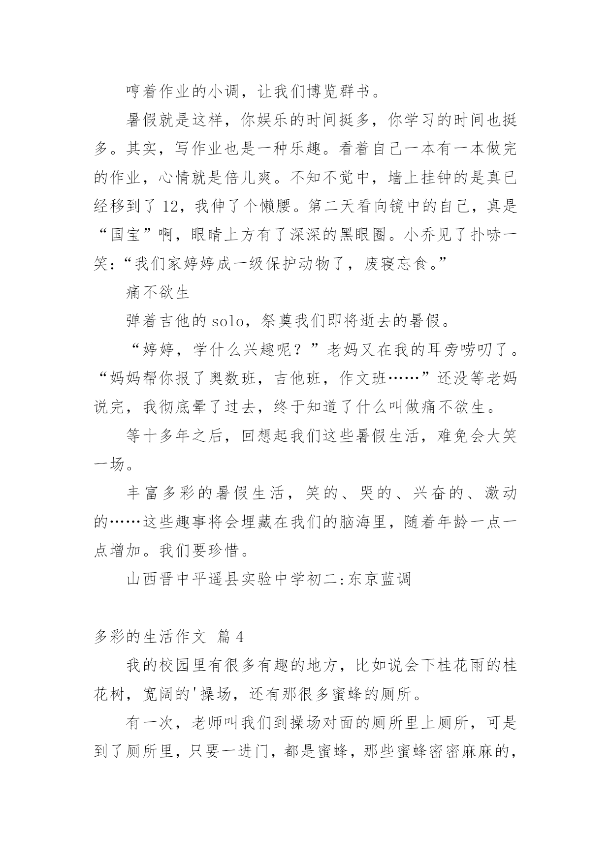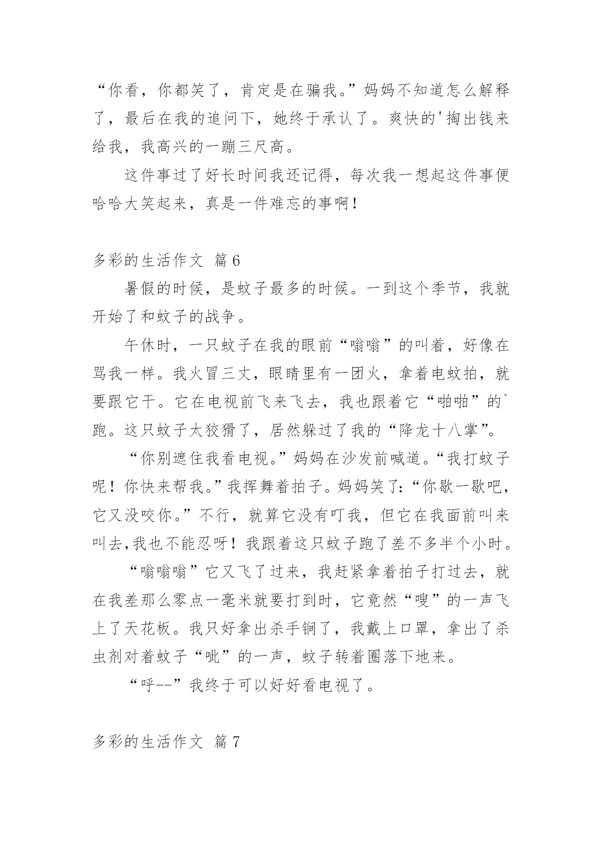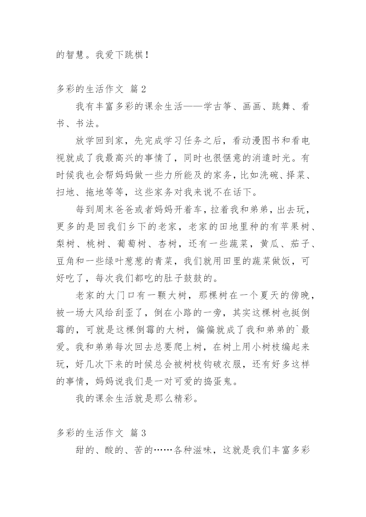 多彩的生活作文精选多彩的生活作文(通用26篇)在学习、工作、生活中,大家一定都接触过作文吧,作文是由文字组成,经过人的思想考虑,通过语言组织来表达一个主题意义的文体。相信写作文是一个让许多人都头痛的问题,下面是小编整理的多彩的生活作文,仅供参考,欢迎大家阅读。多彩的生活作文篇1我的课余生活是丰富多彩快乐无比的,比如:打乒乓球、打羽毛球、下跳棋?就来说说下跳棋吧!有一天晚上,我吃完饭,提出一个建议:“爸爸妈妈,我们来比赛下跳棋吧!""好!”爸爸妈妈异口同声地回答。我们先抽签决定,数字最大的先走,第二大的第二走,数字最小的最后走。接果出来了,我抽到“9”,爸爸抽到“3”,妈妈抽到“7”,当然是我先走了。我的棋子的颜色是红色,爸爸的棋子的颜色是黑色,妈妈棋子的颜色是黄色。游戏开始了,我先走,妈妈再走。经过一番苦斗后,爸爸的棋子挡住了我的棋子,我的`棋子无路可进,爸爸离目的地越来越近,妈妈的棋子被我的棋子挡住了去路。一段时间过后,爸爸居然赢了,妈妈输的落花流水。下跳棋,不仅是我课余生活的一部分,它还可以开发我的智慧。我爱下跳棋!多彩的生活作文篇2我有丰富多彩的课余生活——学古筝、画画、跳舞、看书、书法。放学回到家,先完成学习任务之后,看动漫图书和看电视就成了我最高兴的事情了,同时也很惬意的消遣时光。有时候我也会帮妈妈做一些力所能及的家务,比如洗碗、择菜、扫地、拖地等等,这些家务对我来说不在话下。每到周末爸爸或者妈妈开着车,拉着我和弟弟,出去玩,更多的是回我们乡下的老家,老家的田地里种的有苹果树、梨树、桃树、葡萄树、杏树,还有一些蔬菜,黄瓜、茄子、豆角和一些绿叶葱葱的青菜,我们就用田里的蔬菜做饭,可好吃了,每次我们都吃的肚子鼓鼓的。老家的大门口有一颗大树,那棵树在一个夏天的傍晚,被一场大风给刮歪了,倒在小路的一旁,其实这棵树也挺倒霉的,可就是这棵倒霉的大树,偏偏就成了我和弟弟的`最爱。我和弟弟每次回去总要爬上树,在树上用小树枝编起来玩,好几次下来的时候总会被树枝钩破衣服,还有好多这样的事情,妈妈说我们是一对可爱的捣蛋鬼。我的课余生活就是那么精彩。多彩的生活作文篇3甜的、酸的、苦的……各种滋味,这就是我们丰富多彩的暑假生活。——题记从刚上幼稚园到现在的中学,经历了十多个春秋,当然,伴我们的还有美好的寒假和暑假。各种各样的趣事将会在我们的生活里上演。无精打采踩着时间的鼓点,让我们一起飞翔。暑气逼人,蝉声阵阵。空中没有一片云,没有一点风,头顶上一轮烈日,所有的'树木都无精打采地、懒洋洋地站在那里。此时的我躺在空调下,吃着冰淇淋,享受着暑假的美味。“婷婷,别吃了,还不赶快看书。”老妈又使唤我看书了。我只好一口吃掉了美滋滋的冰淇淋,漫不经心的在书柜前找书。《汤姆索亚历险记》,我纯属因为封面好看才拿了这本小说,不到一个小时,便趴在了桌子上,梦里有甜甜的棒棒糖在向我招手,薯片长了脚……“啪!”我的头上突然一阵剧痛,是妈妈拿起书打我了,而我还模模糊糊的在睡梦中遨游,叫着“香肠”,狠狠的抱住了“它”,并且咬了一口……“啊,你这死丫头在干什么!”妈妈大叫,此时我才彻彻底底的醒了,看着妈妈“嘿嘿”的傻笑。“这本书看到哪儿啦?”妈妈此时的样子,我不禁想起了鲁迅笔下的“圆规”——杨二嫂。妈妈双手插着腰,瞪大了眼睛。“看到……”我还没说完,妈妈又给了我一个爆栗。“人不犯错误是不可爱的嘛。”手不释卷哼着作业的小调,让我们博览群书。暑假就是这样,你娱乐的时间挺多,你学习的时间也挺多。其实,写作业也是一种乐趣。看着自己一本有一本做完的作业,心情就是倍儿爽。不知不觉中,墙上挂钟的是真已经移到了12,我伸了个懒腰。第二天看向镜中的自己,真是“国宝”啊,眼睛上方有了深深的黑眼圈。小乔见了扑哧一笑:“我们家婷婷成一级保护动物了,废寝忘食。”痛不欲生弹着吉他的solo,祭奠我们即将逝去的暑假。“婷婷,学什么兴趣呢?”老妈又在我的耳旁唠叨了。“妈妈帮你报了奥数班,吉他班,作文班……”还没等老妈说完,我彻底晕了过去,终于知道了什么叫做痛不欲生。等十多年之后,回想起我们这些暑假生活,难免会大笑一场。丰富多彩的暑假生活,笑的、哭的、兴奋的、激动的……这些趣事将会埋藏在我们的脑海里,随着年龄一点一点增加。我们要珍惜。山西晋中平遥县实验中学初二:东京蓝调多彩的生活作文篇4我的校园里有很多有趣的地方,比如说会下桂花雨的桂花树,宽阔的'操场,还有那很多蜜蜂的厕所。有一次,老师叫我们到操场对面的厕所里上厕所,可是到了厕所里,只要一进门,都是蜜蜂,那些蜜蜂密密麻麻的,像要合群攻击人一样。所以每次先到,都得到最后面没有蜜蜂的地方。可是今天,我来到厕所,那里就有一个人,就是我们班最皮的—汪俊熙,他一到,就踩死了五只蜜蜂。“你这样会被蜜蜂扎的。”我大声的提醒道。他回答道:“这些蜜蜂都不敢扎我的。”“那