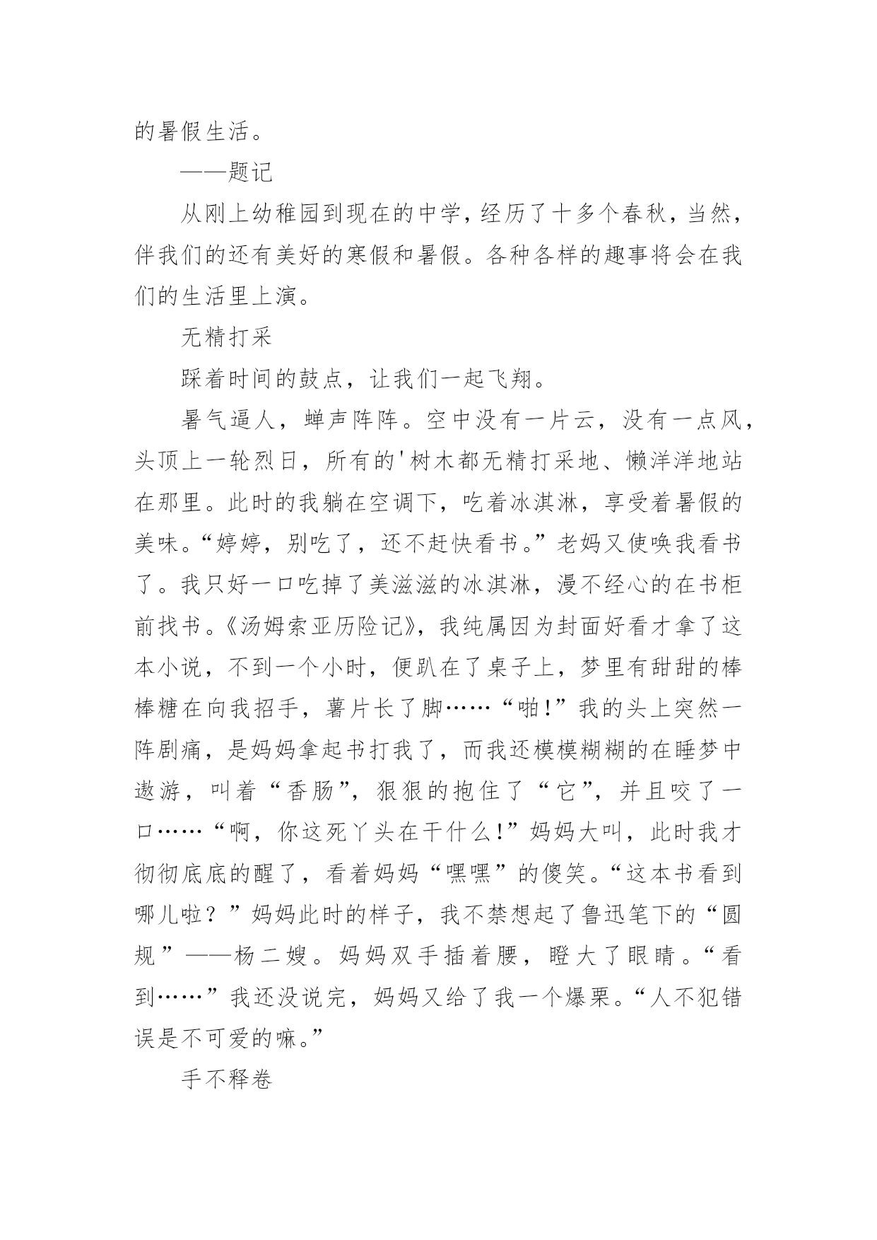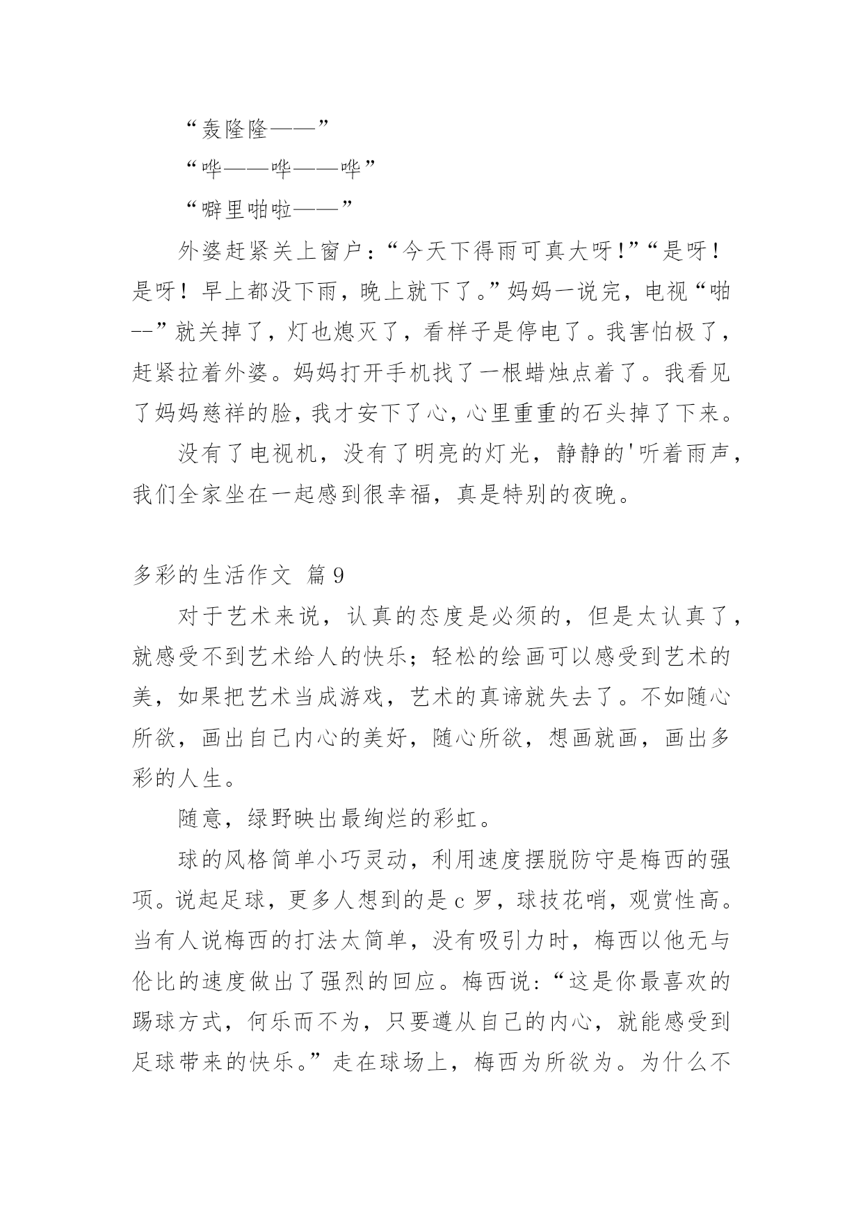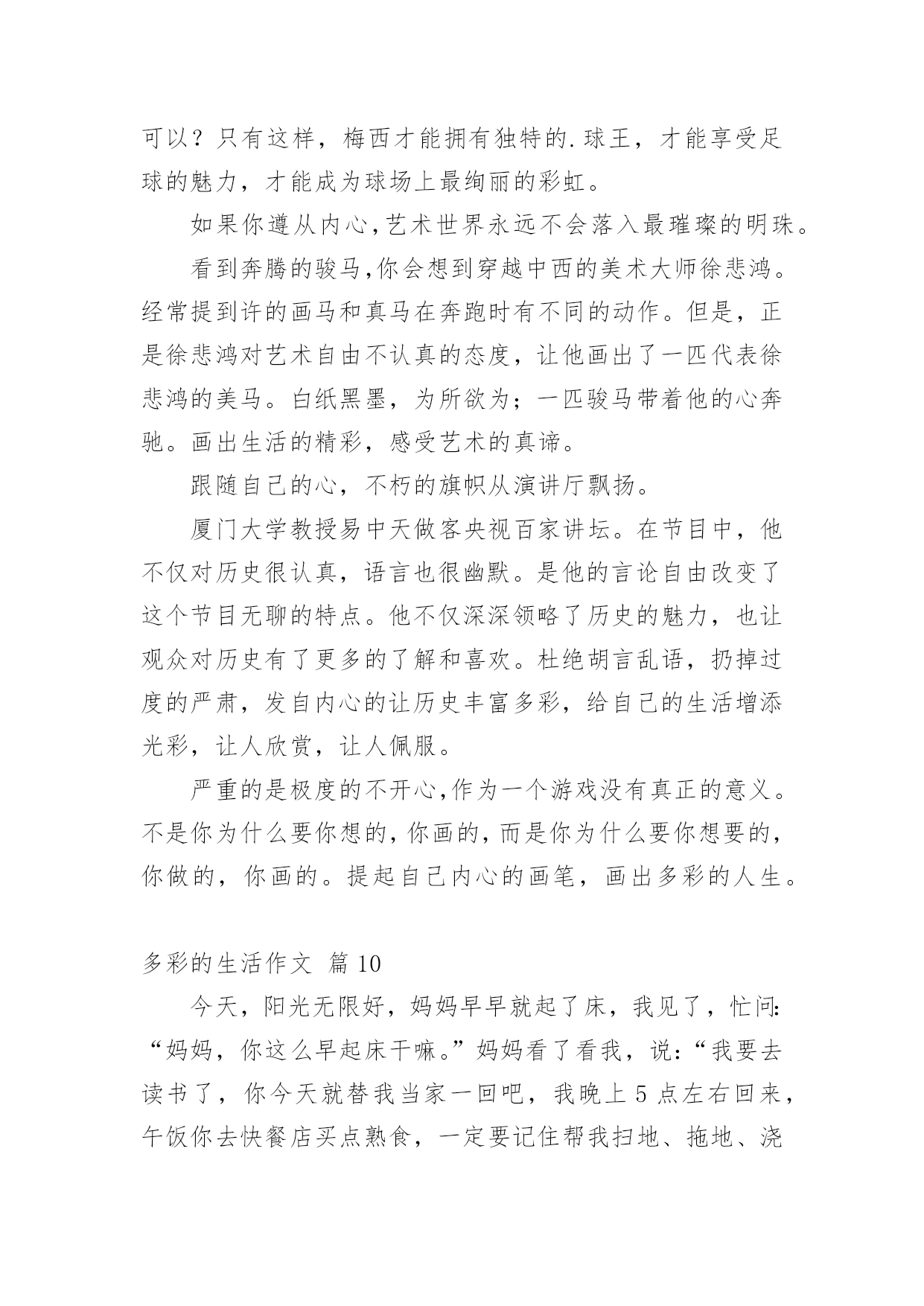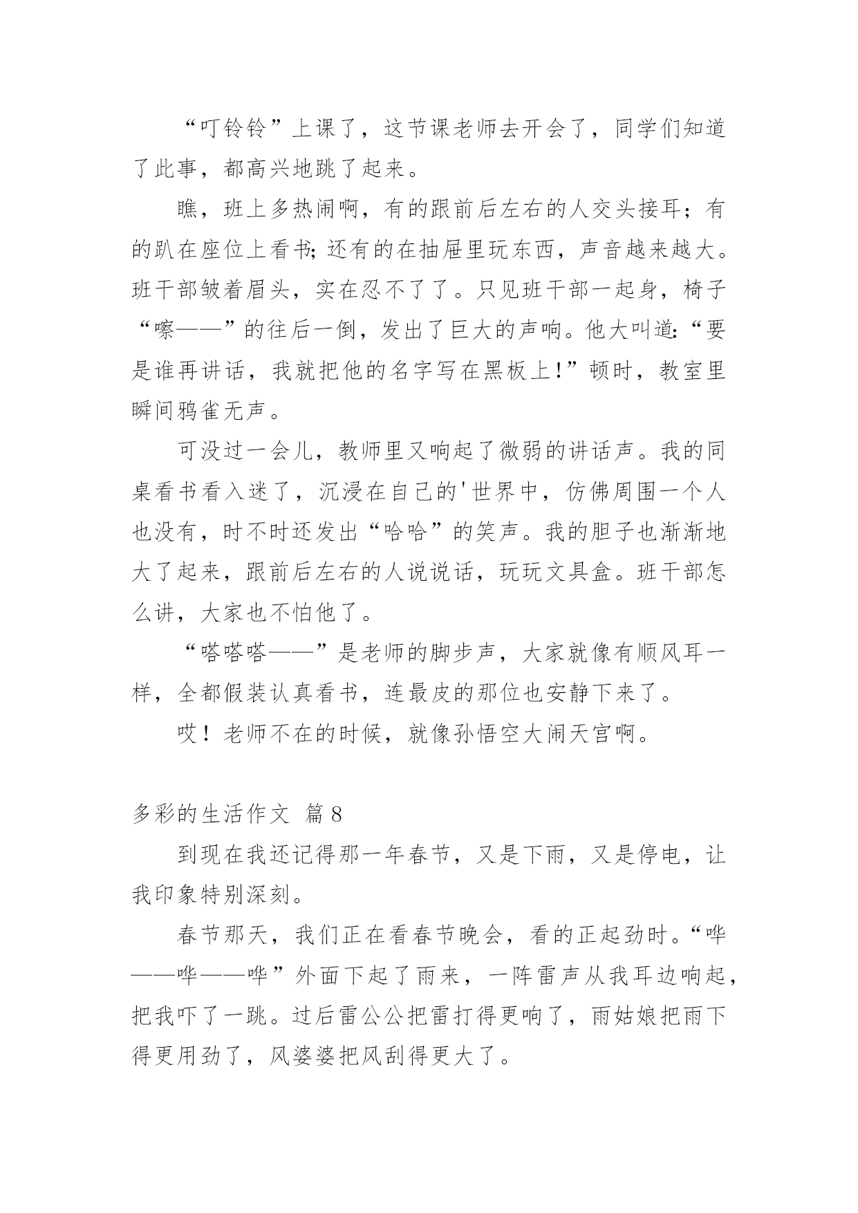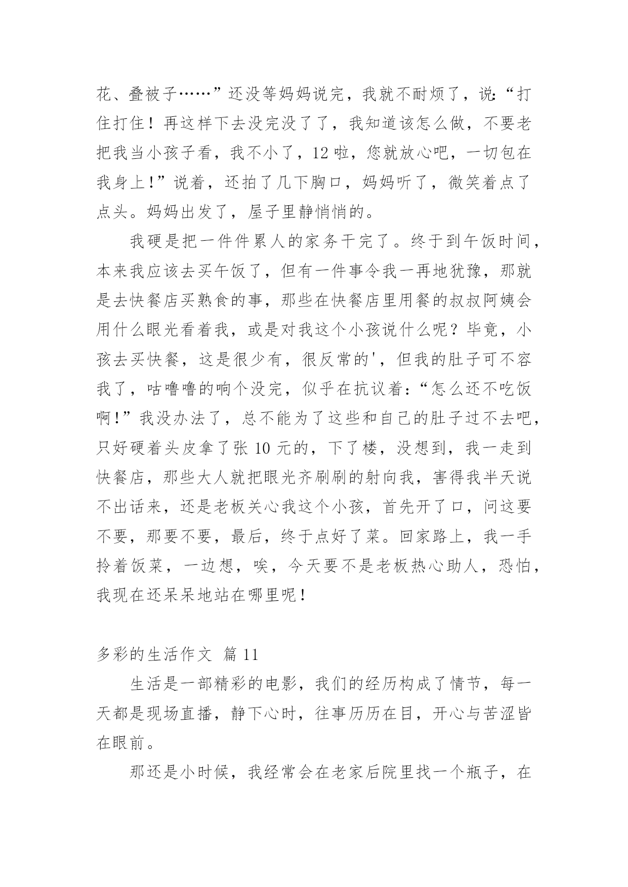 多彩的生活作文精选多彩的生活作文(通用26篇)在学习、工作、生活中,大家一定都接触过作文吧,作文是由文字组成,经过人的思想考虑,通过语言组织来表达一个主题意义的文体。相信写作文是一个让许多人都头痛的问题,下面是小编整理的多彩的生活作文,仅供参考,欢迎大家阅读。多彩的生活作文篇1我的课余生活是丰富多彩快乐无比的,比如:打乒乓球、打羽毛球、下跳棋?就来说说下跳棋吧!有一天晚上,我吃完饭,提出一个建议:“爸爸妈妈,我们来比赛下跳棋吧!""好!”爸爸妈妈异口同声地回答。我们先抽签决定,数字最大的先走,第二大的第二走,数字最小的最后走。接果出来了,我抽到“9”,爸爸抽到“3”,妈妈抽到“7”,当然是我先走了。我的棋子的颜色是红色,爸爸的棋子的颜色是黑色,妈妈棋子的颜色是黄色。游戏开始了,我先走,妈妈再走。经过一番苦斗后,爸爸的棋子挡住了我的棋子,我的`棋子无路可进,爸爸离目的地越来越近,妈妈的棋子被我的棋子挡住了去路。一段时间过后,爸爸居然赢了,妈妈输的落花流水。下跳棋,不仅是我课余生活的一部分,它还可以开发我的智慧。我爱下跳棋!多彩的生活作文篇2我有丰富多彩的课余生活——学古筝、画画、跳舞、看书、书法。放学回到家,先完成学习任务之后,看动漫图书和看电视就成了我最高兴的事情了,同时也很惬意的消遣时光。有时候我也会帮妈妈做一些力所能及的家务,比如洗碗、择菜、扫地、拖地等等,这些家务对我来说不在话下。每到周末爸爸或者妈妈开着车,拉着我和弟弟,出去玩,更多的是回我们乡下的老家,老家的田地里种的有苹果树、梨树、桃树、葡萄树、杏树,还有一些蔬菜,黄瓜、茄子、豆角和一些绿叶葱葱的青菜,我们就用田里的蔬菜做饭,可好吃了,每次我们都吃的肚子鼓鼓的。老家的大门口有一颗大树,那棵树在一个夏天的傍晚,被一场大风给刮歪了,倒在小路的一旁,其实这棵树也挺倒霉的,可就是这棵倒霉的大树,偏偏就成了我和弟弟的`最爱。我和弟弟每次回去总要爬上树,在树上用小树枝编起来玩,好几次下来的时候总会被树枝钩破衣服,还有好多这样的事情,妈妈说我们是一对可爱的捣蛋鬼。我的课余生活就是那么精彩。多彩的生活作文篇3甜的、酸的、苦的……各种滋味,这就是我们丰富多彩的暑假生活。——题记从刚上幼稚园到现在的中学,经历了十多个春秋,当然,伴我们的还有美好的寒假和暑假。各种各样的趣事将会在我们的生活里上演。无精打采踩着时间的鼓点,让我们一起飞翔。暑气逼人,蝉声阵阵。空中没有一片云,没有一点风,头顶上一轮烈日,所有的'树木都无精打采地、懒洋洋地站在那里。此时的我躺在空调下,吃着冰淇淋,享受着暑假的美味。“婷婷,别吃了,还不赶快看书。”老妈又使唤我看书了。我只好一口吃掉了美滋滋的冰淇淋,漫不经心的在书柜前找书。《汤姆索亚历险记》,我纯属因为封面好看才拿了这本小说,不到一个小时,便趴在了桌子上,梦里有甜甜的棒棒糖在向我招手,薯片长了脚……“啪!”我的头上突然一阵剧痛,是妈妈拿起书打我了,而我还模模糊糊的在睡梦中遨游,叫着“香肠”,狠狠的抱住了“它”,并且咬了一口……“啊,你这死丫头在干什么!”妈妈大叫,此时我才彻彻底底的醒了,看着妈妈“嘿嘿”的傻笑。“这本书看到哪儿啦?”妈妈此时的样子,我不禁想起了鲁迅笔下的“圆规”——杨二嫂。妈妈双手插着腰,瞪大了眼睛。“看到……”我还没说完,妈妈又给了我一个爆栗。“人不犯错误是不可爱的嘛。”手不释卷哼着作业的小调,让我们博览群书。暑假就是这样,你娱乐的时间挺多,你学习的时间也挺多。其实,写作业也是一种乐趣。看着自己一本有一本做完的作业,心情就是倍儿爽。不知不觉中,墙上挂钟的是真已经移到了12,我伸了个懒腰。第二天看向镜中的自己,真是“国宝”啊,眼睛上方有了深深的黑眼圈。小乔见了扑哧一笑:“我们家婷婷成一级保护动物了,废寝忘食。”痛不欲生弹着吉他的solo,祭奠我们即将逝去的暑假。“婷婷,学什么兴趣呢?”老妈又在我的耳旁唠叨了。“妈妈帮你报了奥数班,吉他班,作文班……”还没等老妈说完,我彻底晕了过去,终于知道了什么叫做痛不欲生。等十多年之后,回想起我们这些暑假生活,难免会大笑一场。丰富多彩的暑假生活,笑的、哭的、兴奋的、激动的……这些趣事将会埋藏在我们的脑海里,随着年龄一点一点增加。我们要珍惜。山西晋中平遥县实验中学初二:东京蓝调多彩的生活作文篇4我的校园里有很多有趣的地方,比如说会下桂花雨的桂花树,宽阔的'操场,还有那很多蜜蜂的厕所。有一次,老师叫我们到操场对面的厕所里上厕所,可是到了厕所里,只要一进门,都是蜜蜂,那些蜜蜂密密麻麻的,像要合群攻击人一样。所以每次先到,都得到最后面没有蜜蜂的地方。可是今天,我来到厕所,那里就有一个人,就是我们班最皮的—汪俊熙,他一到,就踩死了五只蜜蜂。“你这样会被蜜蜂扎的。”我大声的提醒道。他回答道:“这些蜜蜂都不敢扎我的。”“那