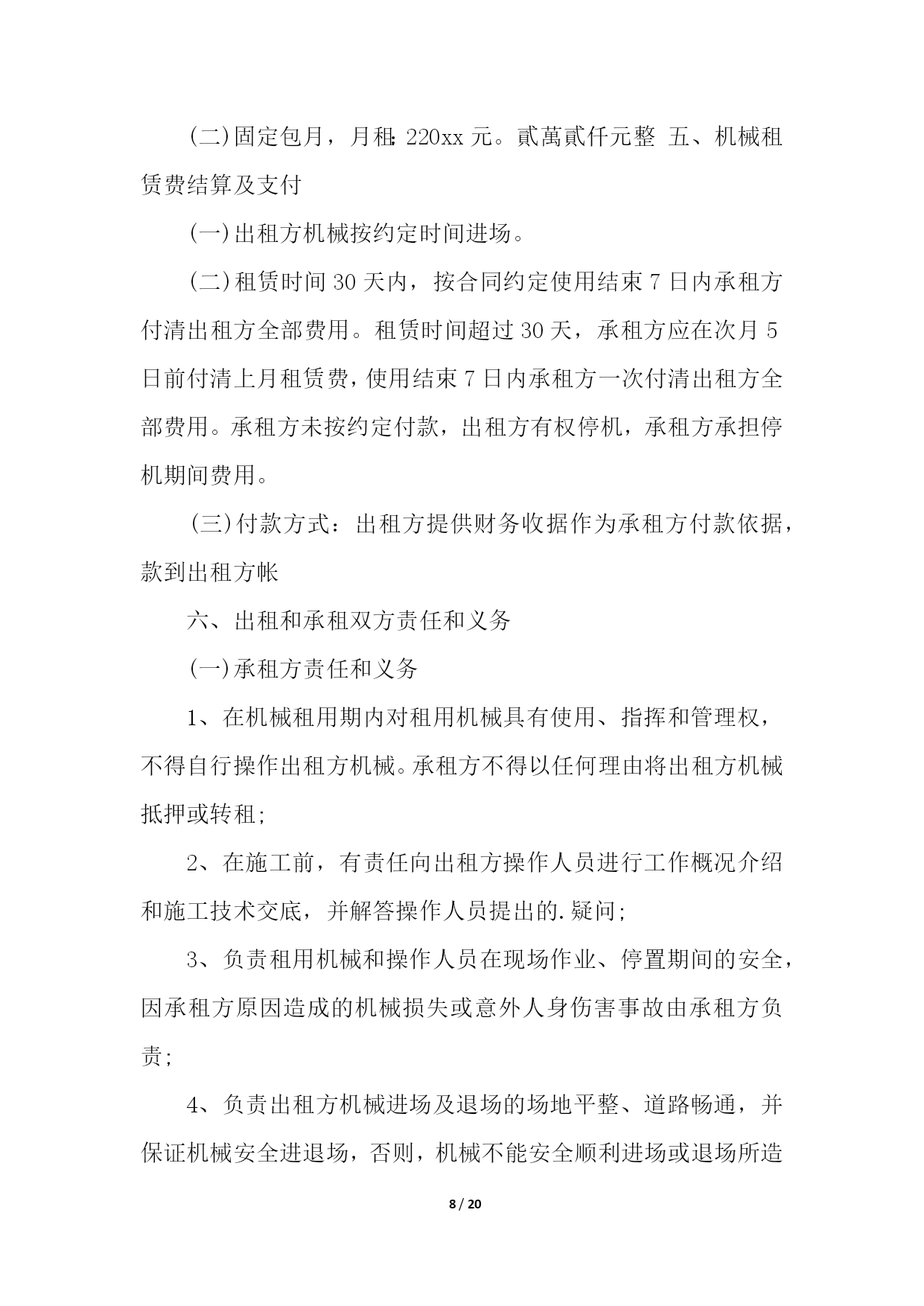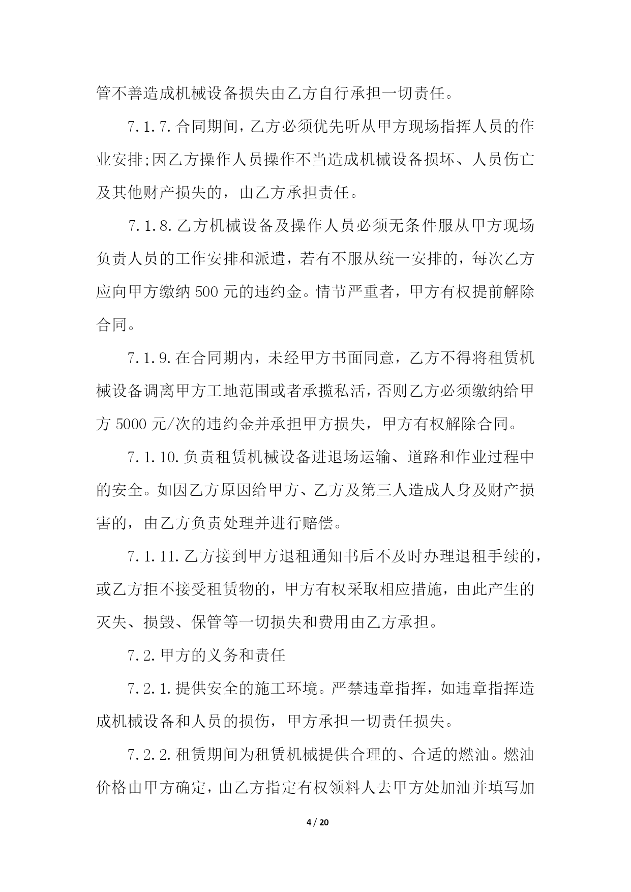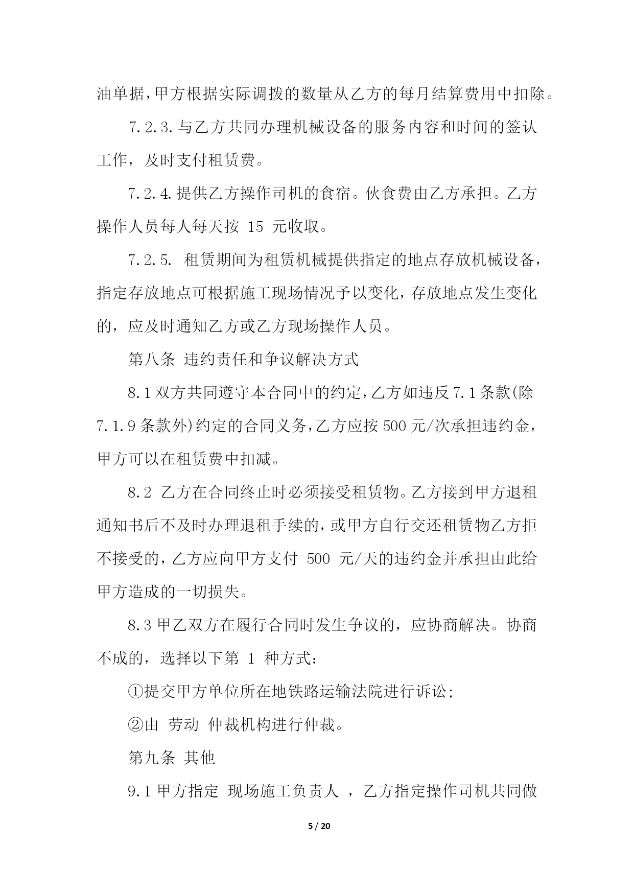 PAGE20/NUMPAGES20机械出租合同机械出租合同1承租人:(以下简称甲方)出租人:身份证号:(以下简称乙方)甲方因工程施工需要租赁乙方的混凝土搅拌车,根据《中华人民第一条第二条租赁期间2.1租赁期限以机械设备进场双方验收完成后正式干活开始计算时间,2.2甲方在验收时发现租赁设备的型号、规格、能力、数量和技术性能等不符合合同规定时,乙方必须按甲方要求及时更换或处理。否则甲方有权解除合同,乙方承担甲方由此造成的损失。第三条租赁内容和地点3.1.租赁内容:配合甲方施工现场施工等服务内容。3.2.使用地点:白阿铁路葛乌段DK48+000DK61+000。第四条租赁方式及所有权4.1.租赁方式:乙方提供机械设备和操作人员,根据甲方的要求提供4.2.乙方为每台机械设备配备1名操作人员,负责机械设备的操作、维护保养等工作。操作人员必须依法持有特种设备操作证等完成本合同所必须的资质证照。乙方提供的机械设备必须经过地方技术监督部门检验合格,并将检验资料报告和操作人员证件一份到甲方存档。第五条租赁费用和结算、付款方式5.1.租赁费用:租赁机械设备租赁费用每月人民币24000元/月/台5.2.租赁费起止时间5.2.1.计费时间以在甲方对设备验证合格后开始。5.2.2.在合同期间,因甲方原因造成的机械停工,按日历天数照常计5.2.3.合同期满时,甲方必须提前3天向乙方发出通知,乙方接到通5.3.租赁时间签认双方授权的委托人每天对服务的时间、内容进行签认,以便计算租赁费5.4.机械设备的进退场及费用承担机械设备进场时甲、乙双方需确认:乙方提供的租赁设备出厂时间20xx年、已投入使用年限1年、设备入场时的暂估价15万。第六条付款方式按当月日历天数计算1个月租赁费,每月支付一次租赁费(以现金或电汇方式),每月25日结算一次,由乙方凭甲方负责人签认的租赁费凭证以及正规机械设备租赁增值税专用发票到甲方财务领取。第七条双方义务和责任7.1.乙方的义务和责任7.1.1.租赁机械设备由乙方控制使用,乙方应提供状况良好的机械设备和证件齐全的操作人员,机械设备必须经甲方验证合格,并应遵守甲方的有关规定。乙方必须提供营业执照、机械设备制造许可证、产品合格证、维修和保养记录、作业人员操作证及《特种作业设备人员证》原件给甲方核实,并提供一套复印件给甲方。7.1.2.乙方密切配合甲方的施工生产,满足甲方施工要求。必须无条件服从甲方施工人员的安排,配合甲方施工,保证24小时随叫随到,但有权拒绝甲方的违章指挥作业。7.1.3.负责配备操作,维护人员,负责机械设备的操作,日常维护保养和故障的处理,确保机械设备技术状态完好并承担相关费用。如每月因维修造成累计停机超过两天以上,则按当月实际出勤天数计列租赁费。7.1.4.负责提供润滑油、机油、滤清器及配件。7.1.5.与甲方共同办理机械设备的租赁内容和时间的签认工作。7.1.6.按甲方指定的地点存放机械设备,并妥善保管,因保管不善造成机械设备损失由乙方自行承担一切责任。7.1.7.合同期间,乙方必须优先听从甲方现场指挥人员的作业安排;因乙方操作人员操作不当造成机械设备损坏、人员伤亡及其他财产损失的,由乙方承担责任。7.1.8.乙方机械设备及操作人员必须无条件服从甲方现场负责人员的工作安排和派遣,若有不服从统一安排的,每次乙方应向甲方缴纳500元的违约金。情节严重者,甲方有权提前解除合同。7.1.9.在合同期内,未经甲方书面同意,乙方不得将租赁机械设备调离甲方工地范围或者承揽私活,否则乙方必须缴纳给甲方5000元/次的违约金并承担甲方损失,甲方有权解除合同。7.1.10.负责租赁机械设备进退场运输、道路和作业过程中的安全。如因乙方原因给甲方、乙方及第三人造成人身及财产损害的,由乙方负责处理并进行赔偿。7.1.11.乙方接到甲方退租通知书后不及时办理退租手续的,或乙方拒不接受租赁物的,甲方有权采取相应措施,由此产生的灭失、损毁、保管等一切损失和费用由乙方承担。7.2.甲方的义务和责任7.2.1.提供安全的施工环境。严禁违章指挥,如违章指挥造成机械设备和人员的损伤,甲方承担一切责任损失。7.2.2.租赁期间为租赁机械提供合理的、合适的燃油。燃油价格由甲方确定,由乙方指定有权领料人去甲方处加油并填写加油单据,甲方根据实际调拨的数量从乙方的每月结算费用中扣除。7.2.3.与乙方共同办理机械设备的服务内容和时间的签认工作,及时支付租赁费。7.2.4.提供乙方操作司机的食宿。伙食费由乙方承担。乙方操作人员每人每天按15元收取。7.2.5.租赁期间为租赁机械提供指定的地点存放机械设备,指定存放地点可根据施工现场情况予以变化,存放地点发生变化的,应及时通知乙方或乙方现场操作人员。第八条违约责任和争议解决方式8.1双方共同遵守本