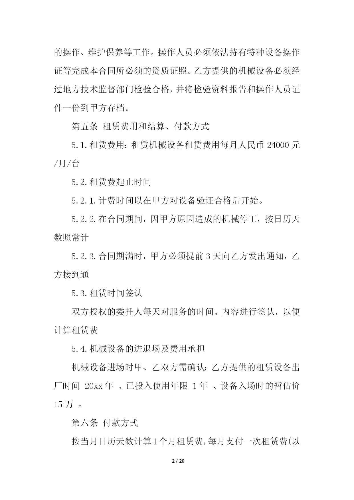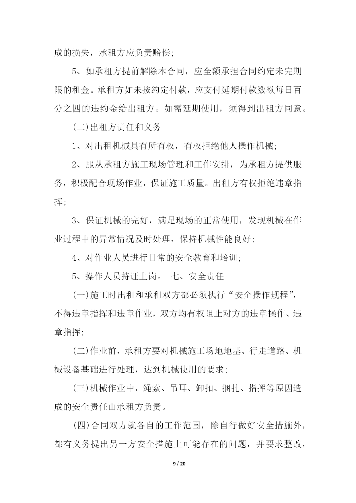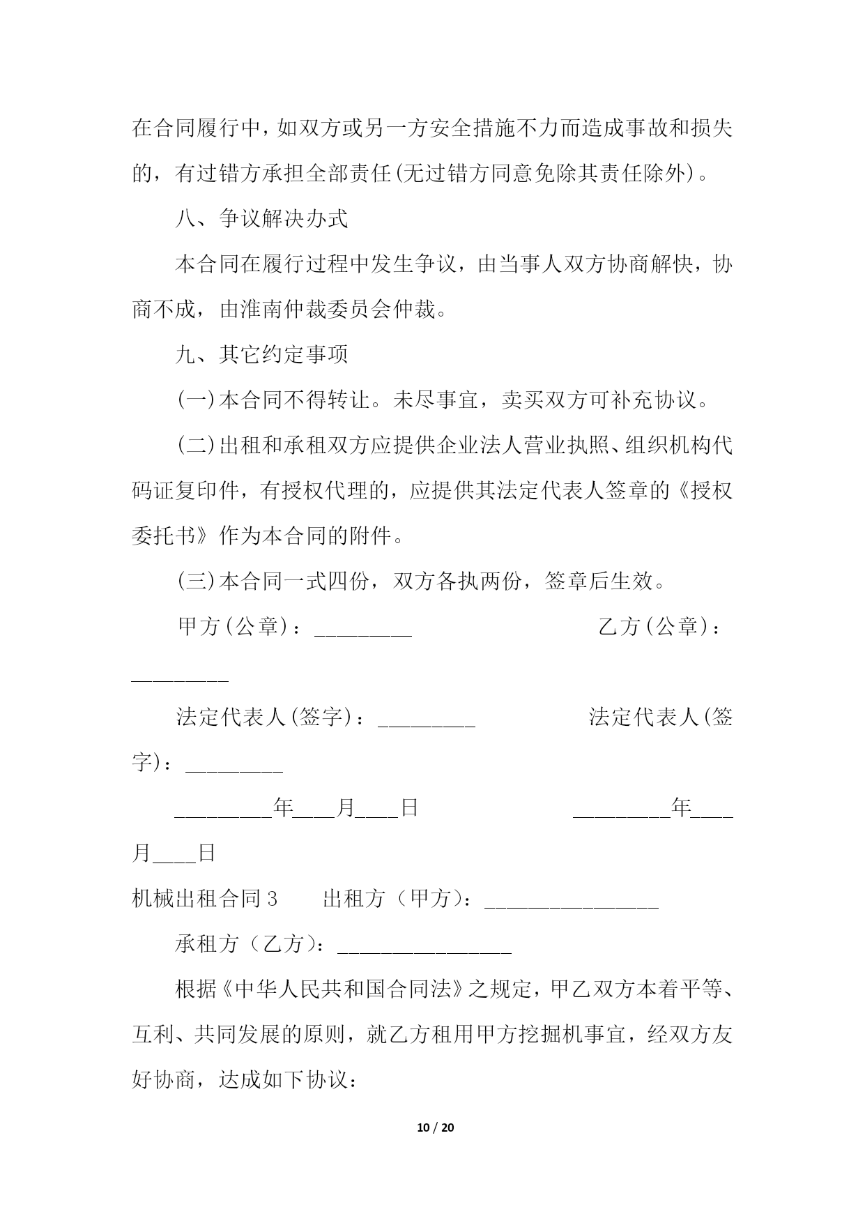 PAGE20/NUMPAGES20机械出租合同机械出租合同1承租人:(以下简称甲方)出租人:身份证号:(以下简称乙方)甲方因工程施工需要租赁乙方的混凝土搅拌车,根据《中华人民第一条第二条租赁期间2.1租赁期限以机械设备进场双方验收完成后正式干活开始计算时间,2.2甲方在验收时发现租赁设备的型号、规格、能力、数量和技术性能等不符合合同规定时,乙方必须按甲方要求及时更换或处理。否则甲方有权解除合同,乙方承担甲方由此造成的损失。第三条租赁内容和地点3.1.租赁内容:配合甲方施工现场施工等服务内容。3.2.使用地点:白阿铁路葛乌段DK48+000DK61+000。第四条租赁方式及所有权4.1.租赁方式:乙方提供机械设备和操作人员,根据甲方的要求提供4.2.乙方为每台机械设备配备1名操作人员,负责机械设备的操作、维护保养等工作。操作人员必须依法持有特种设备操作证等完成本合同所必须的资质证照。乙方提供的机械设备必须经过地方技术监督部门检验合格,并将检验资料报告和操作人员证件一份到甲方存档。第五条租赁费用和结算、付款方式5.1.租赁费用:租赁机械设备租赁费用每月人民币24000元/月/台5.2.租赁费起止时间5.2.1.计费时间以在甲方对设备验证合格后开始。5.2.2.在合同期间,因甲方原因造成的机械停工,按日历天数照常计5.2.3.合同期满时,甲方必须提前3天向乙方发出通知,乙方接到通5.3.租赁时间签认双方授权的委托人每天对服务的时间、内容进行签认,以便计算租赁费5.4.机械设备的进退场及费用承担机械设备进场时甲、乙双方需确认:乙方提供的租赁设备出厂时间20xx年、已投入使用年限1年、设备入场时的暂估价15万。第六条付款方式按当月日历天数计算1个月租赁费,每月支付一次租赁费(以现金或电汇方式),每月25日结算一次,由乙方凭甲方负责人签认的租赁费凭证以及正规机械设备租赁增值税专用发票到甲方财务领取。第七条双方义务和责任7.1.乙方的义务和责任7.1.1.租赁机械设备由乙方控制使用,乙方应提供状况良好的机械设备和证件齐全的操作人员,机械设备必须经甲方验证合格,并应遵守甲方的有关规定。乙方必须提供营业执照、机械设备制造许可证、产品合格证、维修和保养记录、作业人员操作证及《特种作业设备人员证》原件给甲方核实,并提供一套复印件给甲方。7.1.2.乙方密切配合甲方的施工生产,满足甲方施工要求。必须无条件服从甲方施工人员的安排,配合甲方施工,保证24小时随叫随到,但有权拒绝甲方的违章指挥作业。7.1.3.负责配备操作,维护人员,负责机械设备的操作,日常维护保养和故障的处理,确保机械设备技术状态完好并承担相关费用。如每月因维修造成累计停机超过两天以上,则按当月实际出勤天数计列租赁费。7.1.4.负责提供润滑油、机油、滤清器及配件。7.1.5.与甲方共同办理机械设备的租赁内容和时间的签认工作。7.1.6.按甲方指定的地点存放机械设备,并妥善保管,因保管不善造成机械设备损失由乙方自行承担一切责任。7.1.7.合同期间,乙方必须优先听从甲方现场指挥人员的作业安排;因乙方操作人员操作不当造成机械设备损坏、人员伤亡及其他财产损失的,由乙方承担责任。7.1.8.乙方机械设备及操作人员必须无条件服从甲方现场负责人员的工作安排和派遣,若有不服从统一安排的,每次乙方应向甲方缴纳500元的违约金。情节严重者,甲方有权提前解除合同。7.1.9.在合同期内,未经甲方书面同意,乙方不得将租赁机械设备调离甲方工地范围或者承揽私活,否则乙方必须缴纳给甲方5000元/次的违约金并承担甲方损失,甲方有权解除合同。7.1.10.负责租赁机械设备进退场运输、道路和作业过程中的安全。如因乙方原因给甲方、乙方及第三人造成人身及财产损害的,由乙方负责处理并进行赔偿。7.1.11.乙方接到甲方退租通知书后不及时办理退租手续的,或乙方拒不接受租赁物的,甲方有权采取相应措施,由此产生的灭失、损毁、保管等一切损失和费用由乙方承担。7.2.甲方的义务和责任7.2.1.提供安全的施工环境。严禁违章指挥,如违章指挥造成机械设备和人员的损伤,甲方承担一切责任损失。7.2.2.租赁期间为租赁机械提供合理的、合适的燃油。燃油价格由甲方确定,由乙方指定有权领料人去甲方处加油并填写加油单据,甲方根据实际调拨的数量从乙方的每月结算费用中扣除。7.2.3.与乙方共同办理机械设备的服务内容和时间的签认工作,及时支付租赁费。7.2.4.提供乙方操作司机的食宿。伙食费由乙方承担。乙方操作人员每人每天按15元收取。7.2.5.租赁期间为租赁机械提供指定的地点存放机械设备,指定存放地点可根据施工现场情况予以变化,存放地点发生变化的,应及时通知乙方或乙方现场操作人员。第八条违约责任和争议解决方式8.1双方共同遵守本