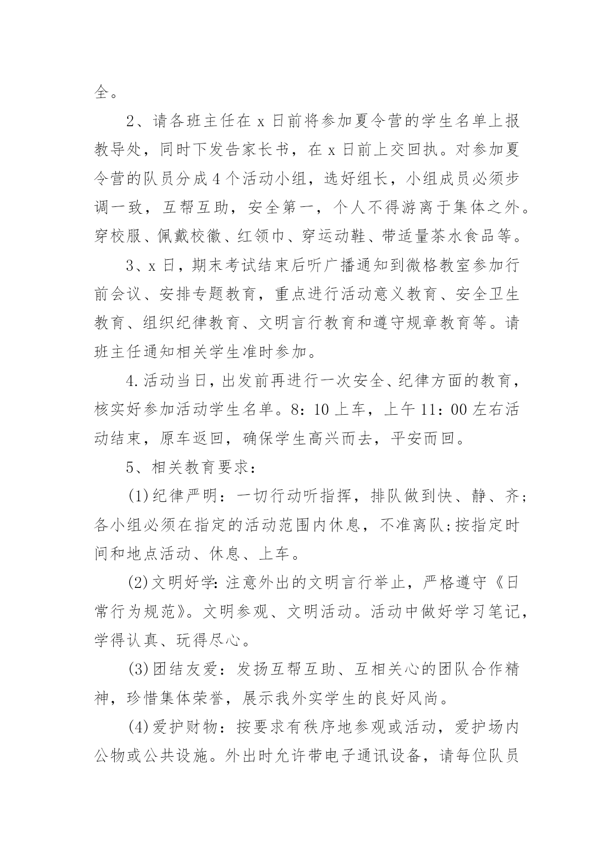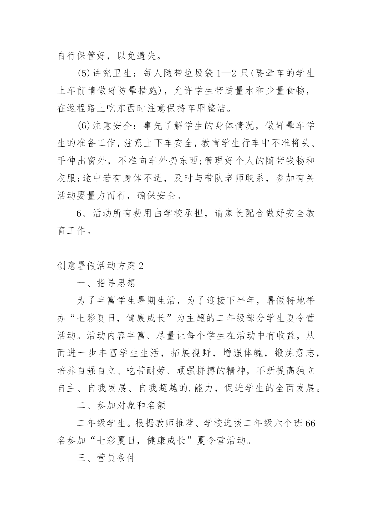 创意暑假活动方案为了确保事情或工作有序有效开展,通常需要提前准备好一份方案,方案是在案前得出的方法计划。那么大家知道方案怎么写才规范吗?以下是小编精心整理的创意暑假活动方案,欢迎大家分享。创意暑假活动方案1为了丰富我校学生的假期生活,进一步感受xx“港通天下”的魅力,寻找我校“xx文化”的根基所在,同时也是为了拓宽学生的视野,培养他们的合作意识、实践能力,学校大队部将组织学生前往xx国家港口博物馆进行为期x天的夏令营,并以此表彰一批优秀的少先队员,激励更多的队员奋发进取。一、活动时间x月x日至x日二、交通工具xx省中国旅行社客运大巴(签订安全运行协议、购买好学生责任保险)三、安全措施及活动要求1、活动前,做好目的'地踩点,拟定好具体的活动方案和应急预案。总务处与xx省中国旅行社联系,做好学生、教师外出活动的保险工作,事先掌握车型、车况和校外停车秩序,及时与交管部门取得联系,确保学生上下车有序、安全。2、请各班主任在x日前将参加夏令营的学生名单上报教导处,同时下发告家长书,在x日前上交回执。对参加夏令营的队员分成4个活动小组,选好组长,小组成员必须步调一致,互帮互助,安全第一,个人不得游离于集体之外。穿校服、佩戴校徽、红领巾、穿运动鞋、带适量茶水食品等。3、x日,期末考试结束后听广播通知到微格教室参加行前会议、安排专题教育,重点进行活动意义教育、安全卫生教育、组织纪律教育、文明言行教育和遵守规章教育等。请班主任通知相关学生准时参加。4.活动当日,出发前再进行一次安全、纪律方面的教育,核实好参加活动学生名单。8:10上车,上午11:00左右活动结束,原车返回,确保学生高兴而去,平安而回。5、相关教育要求:(1)纪律严明:一切行动听指挥,排队做到快、静、齐;各小组必须在指定的活动范围内休息,不准离队;按指定时间和地点活动、休息、上车。(2)文明好学:注意外出的文明言行举止,严格遵守《日常行为规范》。文明参观、文明活动。活动中做好学习笔记,学得认真、玩得尽心。(3)团结友爱:发扬互帮互助、互相关心的团队合作精神,珍惜集体荣誉,展示我外实学生的良好风尚。(4)爱护财物:按要求有秩序地参观或活动,爱护场内公物或公共设施。外出时允许带电子通讯设备,请每位队员自行保管好,以免遗失。(5)讲究卫生:每人随带垃圾袋1—2只(要晕车的学生上车前请做好防晕措施),允许学生带适量水和少量食物,在返程路上吃东西时注意保持车厢整洁。(6)注意安全:事先了解学生的身体情况,做好晕车学生的准备工作,注意上下车安全,教育学生行车中不准将头、手伸出窗外,不准向车外扔东西;管理好个人的随带钱物和衣服;途中若有身体不适,及时与带队老师联系,参加有关活动要量力而行,确保安全。6、活动所有费用由学校承担,请家长配合做好安全教育工作。创意暑假活动方案2一、指导思想为了丰富学生暑期生活,为了迎接下半年,暑假特地举办“七彩夏日,健康成长”为主题的二年级部分学生夏令营活动。活动内容丰富、尽量让每个学生在活动中有收益,从而进一步丰富学生生活,拓展视野,增强体魄,锻炼意志,培养自强自立、吃苦耐劳、顽强拼搏的精神,不断提高独立自主、自我发展、自我超越的.能力,促进学生的全面发展。二、参加对象和名额二年级学生。根据教师推荐、学校选拔二年级六个班66名参加“七彩夏日,健康成长”夏令营活动。三、营员条件1.对夏令营活动感兴趣的、有一定身体素质的二年级优秀学生参加;2.组织纪律性强,家长支持;四、时间:20xx年8月20日——29日五、收费:仅收伙食费300元,教师辅导费全部由学校负担。六、活动组织原则:以校为主、特色引领、多元选择。七、活动内容暑期,学校组织学生参加武术、游泳训练、经典诗文诵读、作文起步、优秀影视、硬笔书法、英语口语、暑假作业辅导等主题活动。八、活动组织要求1.高度重视,加强领导。学校建立暑期学生活动工作领导小组,加强对暑期学生活动的研究、设计和管理。2.突出主题,讲求实效。围绕“七彩夏日,健康成长”主题,立足学校和学生实际,在学生自愿、家长同意、保证暑期休息为主的基础上,充分整合资源,精心设计方案,创新活动内容和形式,不断增强活动的趣味性和吸引力。3.严密组织,确保安全。学校把活动安全问题放在首位,制定详细、周密、安全的保障措施,严密组织,明确责任,确保万无一失。