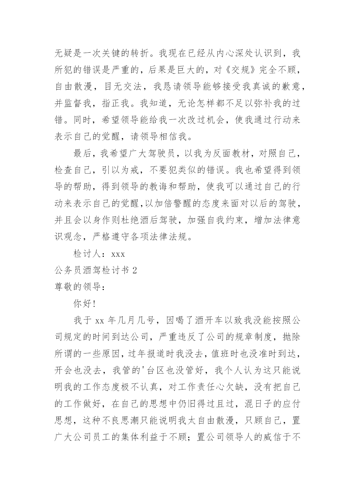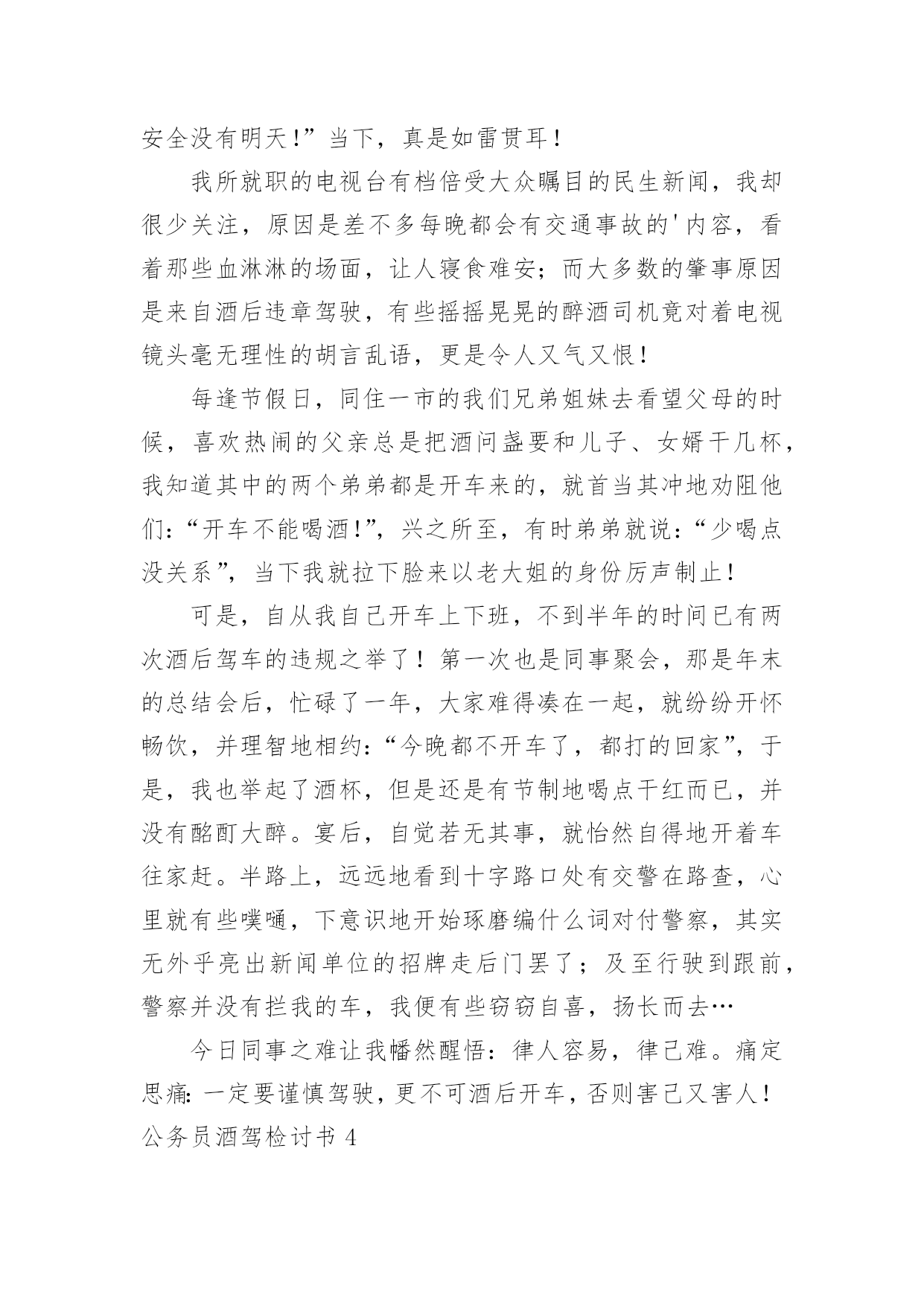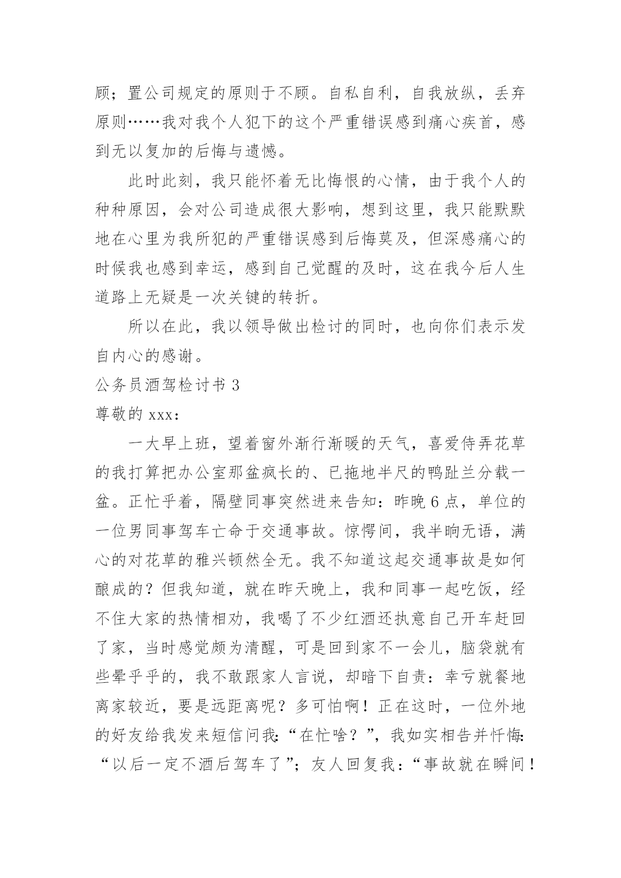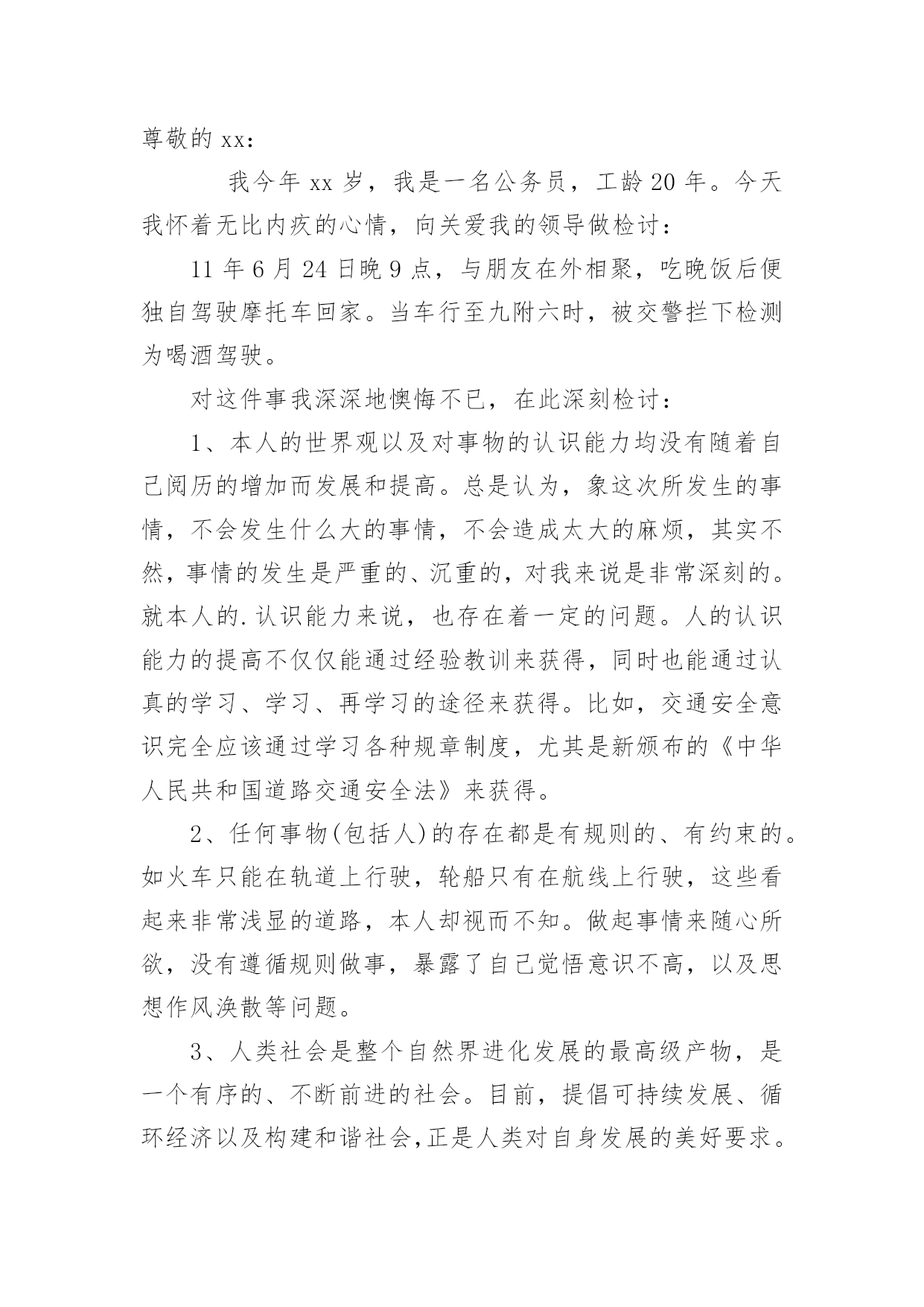 公务员酒驾检讨书公务员酒驾检讨书4篇在学习、工作、生活中犯错误以后,往往被要求写检讨书来自我悔过,写检讨书是为了能够不断提醒自己。你还在对写检讨书感到一筹莫展吗?以下是小编为大家收集的公务员酒驾检讨书,欢迎阅读与收藏。公务员酒驾检讨书1尊敬的领导:你好!关于我酒后驾驶的行为,我认真反思,深刻自剖,为自己的行为感到了深深地愧疚和不安,在此做出深刻的检讨,并将我几天来的思想反思结果向领导汇报:通过这件事,我感到这虽然是件偶然发生的事件,但同时也是长期以来对自己放松要求,麻痹大意的必然结果。经过几天的反思,我对自己这次酒后驾驶经历进行了详细回忆和分析,我对个人犯下的`错误感到痛心疾首,感到无以复加的后悔与遗憾。所以,在此向各位做出深刻的检讨。此时此刻,我只能怀着无比悔恨的心情,由于我跟人的种种原因,造成了恶劣的影响。想到这里,我只能默默地在心里为我所犯的严重错误感到后悔莫及,但深感痛心的时候也感到幸运,感到自己觉醒的及时,这在我今后人生道路上无疑是一次关键的转折。我现在已经从内心深处认识到,我所犯的错误是严重的,后果是巨大的,对《交规》完全不顾,自由散漫,目无交法,我恳请领导能够接受我真诚的歉意,并监督我,指正我。我知道,无论怎样都不足以弥补我的过错。同时,希望领导能给我一次改过机会,使我通过行动来表示自己的觉醒,请领导相信我。最后,我希望广大驾驶员,以我为反面教材,对照自己,检查自己,引以为戒,不要犯类似的错误。我也希望得到领导的帮助,得到领导的教诲和帮助,使我可以通过自己的行动来表示自己的觉醒,以加倍警醒的态度来面对以后的驾驶,并且会以身作则杜绝酒后驾驶,加强自我约束,增加法律意识观念,严格遵守各项法律法规。检讨人:xxx公务员酒驾检讨书2尊敬的领导:你好!我于xx年几月几号,因喝了酒开车以致我没能按照公司规定的时间到达公司,严重违反了公司的规章制度,抛除所谓的一些原因,过年报道时我没去,值班时也没准时到达,开会也没去,我管的'台区也没管好,我个人认为这只能说明我的工作态度极不认真,对工作责任心欠缺,没有把自己的工作做好,在自己的思想中仍旧得过且过,混日子的应付思想,这种不良思潮只能说明我太自由散漫,只顾自己,置广大公司员工的集体利益于不顾;置公司领导人的威信于不顾;置公司规定的原则于不顾。自私自利,自我放纵,丢弃原则……我对我个人犯下的这个严重错误感到痛心疾首,感到无以复加的后悔与遗憾。此时此刻,我只能怀着无比悔恨的心情,由于我个人的种种原因,会对公司造成很大影响,想到这里,我只能默默地在心里为我所犯的严重错误感到后悔莫及,但深感痛心的时候我也感到幸运,感到自己觉醒的及时,这在我今后人生道路上无疑是一次关键的转折。所以在此,我以领导做出检讨的同时,也向你们表示发自内心的感谢。公务员酒驾检讨书3尊敬的xxx:一大早上班,望着窗外渐行渐暖的天气,喜爱侍弄花草的我打算把办公室那盆疯长的、已拖地半尺的鸭趾兰分载一盆。正忙乎着,隔壁同事突然进来告知:昨晚6点,单位的一位男同事驾车亡命于交通事故。惊愕间,我半晌无语,满心的对花草的雅兴顿然全无。我不知道这起交通事故是如何酿成的?但我知道,就在昨天晚上,我和同事一起吃饭,经不住大家的热情相劝,我喝了不少红酒还执意自己开车赶回了家,当时感觉颇为清醒,可是回到家不一会儿,脑袋就有些晕乎乎的,我不敢跟家人言说,却暗下自责:幸亏就餐地离家较近,要是远距离呢?多可怕啊!正在这时,一位外地的好友给我发来短信问我:“在忙啥?”,我如实相告并忏悔:“以后一定不酒后驾车了”;友人回复我:“事故就在瞬间!安全没有明天!”当下,真是如雷贯耳!我所就职的电视台有档倍受大众瞩目的民生新闻,我却很少关注,原因是差不多每晚都会有交通事故的'内容,看着那些血淋淋的场面,让人寝食难安;而大多数的肇事原因是来自酒后违章驾驶,有些摇摇晃晃的醉酒司机竟对着电视镜头毫无理性的胡言乱语,更是令人又气又恨!每逢节假日,同住一市的我们兄弟姐妹去看望父母的时候,喜欢热闹的父亲总是把酒问盏要和儿子、女婿干几杯,我知道其中的两个弟弟都是开车来的,就首当其冲地劝阻他们:“开车不能喝酒!”,兴之所至,有时弟弟就说:“少喝点没关系”,当下我就拉下脸来以老大姐的身份厉声制止!可是,自从我自己开车上下班,不到半年的时间已有两次酒后驾车的违规之举了!第一次也是同事聚会,那是年末的总结会后,忙碌了一年,大家难得凑在一起,就纷纷开怀畅饮,并理智地相约:“今晚都不开车了,都打的回家”,于是,我也举起了酒杯,但是还是有节制地喝点干红而已,并没有酩酊大醉。宴后,自觉若无其事,就怡然自得地开着车往家赶。半路上,远远地看到十字路口处有交警在路查,心里就有些噗嗵,下意识地开始琢磨编什么词对付警察,其实无外乎亮出新闻单位的招牌走后门罢了;及至行驶到跟前,警察并没有拦我的