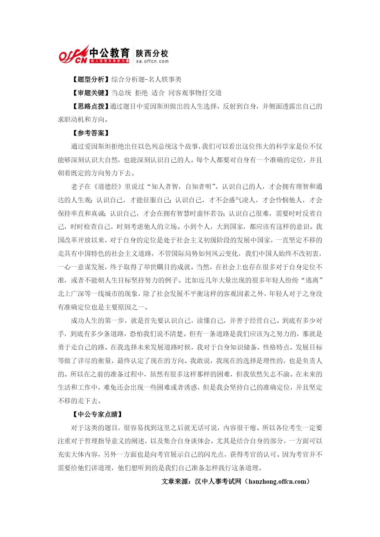 2013年云南公务员面试高分技巧:编个好故事HYPERLINK"http://www.offcn.com"公务员考试的面试之战,比之笔试更加残酷,考量的内容更加全面更加立体,可以说成败在此一举,中公教育专家建议考生一定要尽早进行备考,做到心中有数。面试是心智的较量,需要知识需要速度更需要智慧,编故事题更是如此。一、题型概述无论HYPERLINK"http://www.offcn.com/gjgwy/"国家公务员面试还是省(市)公务员面试,综合分析题是每年各省市必考题目之一,且多在试题靠前的位置出现。综合分析题是考生展现自我,拉开差距的大好机会,但同时又是最有难度的题型。该种题型是否能够答好,不但给考官留下或好或坏的第一印象,也会考生自身影响后面考题的发挥。通俗来说,综合分析题是公职类面试各种题型中当之无愧的“一哥”,此种题型的发挥程度,直接影响考生的最后成绩。所以各位考生一定要充分重视这种题型。中公教育专家研究发现,近几年来,几乎每个省份的试卷当中都出现了小故事类试题,而考生也普遍反映一遇见这类试题就束手无策,因此,现就故事类试题进行重点讲解,以帮助考生提高应对此类题目的能力。故事类试题顾名思义,题目形式主要是讲述一个小故事,其中包括神话故事、民间故事、寓言故事、名人轶事等等。此类题型主要考查考生对小故事的理解分析能力,能够透过小故事看出大道理。二、解题技巧应该清楚认识到,这类型的题目不会有标准的对错。只要考生能够在理解题干含义的基础上自圆其说,并能结合自身的情况或者人生经验进行作答即可。回答此类题目采用思辨性思维,举出高水平并且贴切的事例,有真情实感往往能获得高分,可以采用以下思路进行作答:1.通过故事本身引出故事所蕴含哲理2.该哲理对于现实具有哪些指导性意义(可以通过正方对比论证或者举例论证)3.如何在现实中践行该哲理三、真题回顾爱因斯坦是犹太人,20世纪30年代,他收到以色列当局的一封信,内容为请他当以色列总统,但爱因斯坦拒绝了。他说:“我一生只适合同客观物质打交道,不适合担任如此重任。”你如何看待爱因斯坦拒绝当以色列总统这件事,对你有哪些启示?(2011年山东省考真题)【题型分析】综合分析题-名人轶事类【审题关键】当总统拒绝适合同客观事物打交道【思路点拨】通过题目中爱因斯坦做出的人生选择,反射到自身,并侧面透露出自己的求职动机和方向。【参考答案】通过爱因斯坦拒绝出任以色列总统这个故事,我们可以看出这位伟大的科学家是位不仅能够深刻认识大自然,也能深刻认识自己的人。每个人都要对自身有一个准确的定位,并且朝着既定的方向努力下去。老子在《道德经》里说过“知人者智,自知者明”。认识自己的人,才会拥有理智和通达的人生观;认识自己,才能征服自己;认识自己,才不会盛气凌人,才会怜悯他人,才会保持率直和真诚;认识自己,才会在拥有智慧时虚怀若谷;认识自己很难,需要时时反省自己,时时检查自己,时刻考虑他人的立场。小到个人,大到国家,都应该有这样的意识。我国改革开放以来,对于自身的定位是处于社会主义初级阶段的发展中国家,一直坚定不移的走具有中国特色的社会主义道路,不管国际局势如何风云变化,我们中国人始终不改初衷,一心一意谋发展,终于取得了举世瞩目的成就。当然,在社会上也存在很多对于自身定位不准,或者不能朝人生目标坚持努力的例子。比如近几年大量出现的很多年轻人纷纷“逃离”北上广深等一线城市的现象,除了社会发展不平衡这样的客观因素之外,年轻人对于之身没有准确定位也是主要原因之一。成功人生的第一步,就是首先要认识自己,读懂自己,并善于经营自己。到底有多少对手,到底有多少条道路,恐怕我们说不清楚。但有一条道路是我们应该为之努力的,那就是勇于走自己的路。在我选择未来发展道路时候,我对于自身知识储备、性格特点、发展目标等做了详尽的衡量,最终认定了现在的方向。我敢说,我现在的选择是理性的,也是负责人的。所以在之前的准备过程中,虽然有很多这样那样的困难,但我依然矢志不渝。在未来的生活和工作中,难免还会出现一些困难或者诱惑,但是我会坚持自己的准确定位,并且坚定不移的走下去。【中公专家点睛】对于这类的题目,很容易找到这里之后就无话可说,内容很干瘪。所以各位考生一定要注重对于哲理指导意义的阐述,以及集合自身谈体会。尤其是结合自身的部分,一方面可以充实大体内容,另外一方面也是向考官展示自己的闪光点,获得考官的认可。因为考官并不需要给他们讲道理,他们想听到的是我们自己准备怎样践行这条道理。文章来源:汉中人事考试网(hanzhong.offcn.com)
