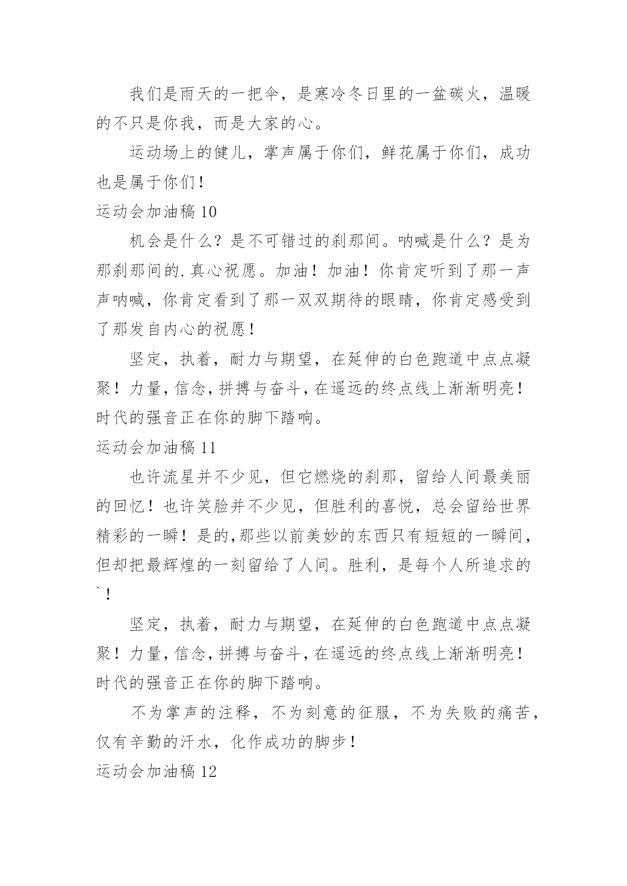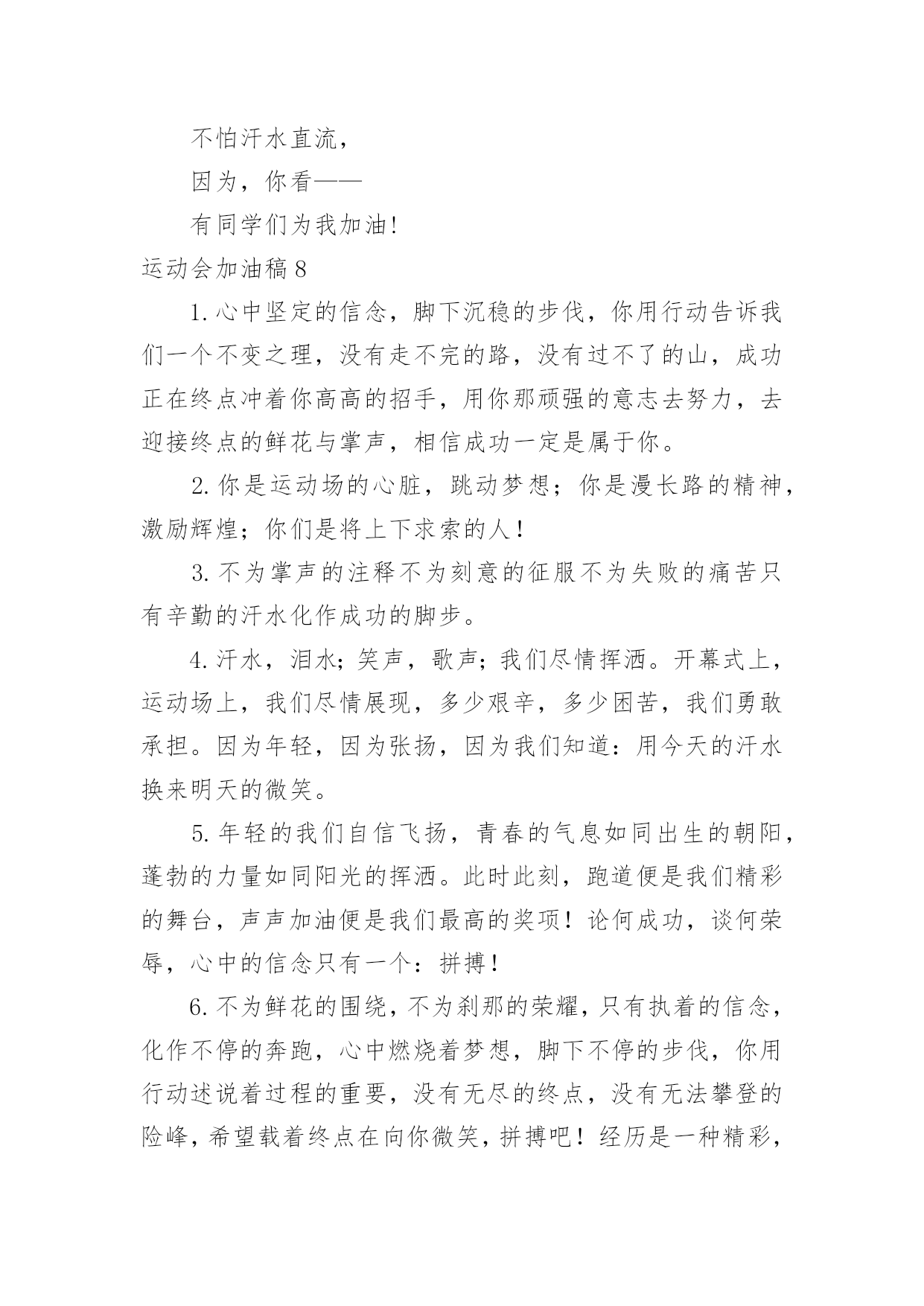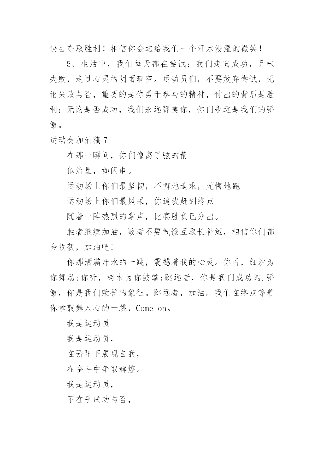 运动会加油稿运动会加油稿优选(15篇)现如今,我们越来越需要加油稿,加油稿可以给予对方克服困难的勇气和信心。你知道加油稿怎样才能写的好吗?下面是小编收集整理的运动会加油稿,希望对大家有所帮助。运动会加油稿1相信自己做的,无所谓成功与失败,只在乎那过程的'挥汗如雨,每一次都是新的起点,每一次都是努力的体验。耳边想起震天的呐喊助威声,那是对你拼搏的肯定,每一声都充满热情,每一声都充满激情。任何时刻都不会放弃,那属于自己的每一次机会,因为你相信自己的实力,相信自己做的。运动会加油稿21、年轻的我们自信飞扬,青春的气息如同出生的朝阳,蓬勃的力量如同阳光的挥洒。此时此刻,跑道便是我们精彩的`舞台,声声加油便是我们的奖项!论何成功,谈何荣辱,心中的信念只有一个:拼搏!2、在枪声响起的一刹那你如箭在弦飞刺而出,在跑道的尽头你奋力的一掷中你让铅球落在最远点是你们--让我们知道了什么是拼搏,你们是激情你们是荣耀加油吧,让所有的人目击你们胜出的那刹那瞬间,让所有的人为你们而骄傲!3、运动健将们,用你的实力,用你的精神,去开拓出,一片属于你的长跑天地!4、运动场上有你们的飒爽英姿,运动场上有你们拼搏的身影,面对漫漫的征程,你没有畏惧和退缩,任汗水打湿脊背,任疲惫爬满全身,依然分离追赶,只有一个目标,只有一个信念,为班级赢得荣誉,拼搏吧,我为你们呐喊,加油!5、有多少次挥汗如雨,伤痛曾添满记忆,只因为始终相信,去拼搏才能胜利。总在鼓舞自己,要成功就得努力。热血在赛场沸腾,巨人在赛场升起。相信自己,你将赢得胜利,创造奇迹;相信自己,梦想在你手中,这是你的天地。当一切过去,你们将是第一。相信自己,你们将超越极限,超越自己!相信自己,加油吧,健儿们,相信你自己。运动会加油稿3带着青春的朝气,散发着年轻的激情,搏击生命的长空,高吼一声:“我们来啦。”我们走进了杭电大学生冬季运动会。来自五湖四海的莘莘学子共聚杭电一方,学习上你追我赶,运动场上随处可见他们矫健的身影,在杭电大学生运动会上他们踊跃报名,以期一展当代大学生的风采。在运动会的几天里,他们始终坚持发扬友谊第一,重在参与的优良风格,赛出成绩赛出风格将会伴随运动会顺利结束,拭目以待吧,亲爱的师生。运动会加油稿200字4开朗和阴郁都曾写在前额,昨天和明天都没有放弃执著。狂风的日子里我是卷起的浪,晴朗的日子里我是闪亮的`玻,不改的是奔流的本色。成功和失败都镌刻进生活,春履和秋痕都不失为景色。你如同插上了飞跃地平线的翅膀,追踪流星、闪逝无迹,或撞成碎片,或射向天际。为什么你能冲开一切?为什么你能义无反顾?是因为你世袭的血液涌动的天性,还是你已将勇气放上天平,另一边托起整个天地。运动会加油稿4迎接你的,是800米跑道等待你的',是漫漫征途勇敢的冲吧,勇士们不要畏惧对手的强大你的对手只有自己勇敢的冲吧800米算不得什么付出的汗水就要得到回报胜利的泪水就要顺颊而下秋风会为你喝彩阳光会为你庆功掌声就要为你响起运动会加油稿5350米的跑道上,你正在飞驰,头一百米:你可能心急如焚,可心知落后就要挨打。次一百米:你也许有点心神不定,我是不是该安静的退开?再一百米:你正在进行着心理斗争,“生存”还“死亡”?末一百米:你仿佛心有余而力不足,其实“冲刺”不容易。但面对如此遥远的路途,如此激烈的'竞争,你也许腿脚发麻,你也许有些茫然。但你可知道,在你身后,有同学们一双双期待的眼睛;在你身后,是你日日辛勤苦练流下的汗水。鼓起勇气,奋勇向前吧!为了集体的荣誉,为了祖国的明天!运动会加油稿61、有多少次挥汗如雨,伤痛曾添满记忆,只因为始终相信,去拼搏才能胜利。总在鼓舞自己,要成功就得努力。热血在赛场沸腾,巨人在赛场升起。相信自己,你将赢得胜利,创造奇迹;相信自己,梦想在你手中,这是你的天地。当一切过去,你们将是第一。相信自己,你们将超越极限,超越自己!相信自己,加油吧,健儿们,相信你自己。2、让你们的身影在运动场上留下优美的风景线,让你们的雄心壮志在运动场上发挥的淋漓尽致。3、一根小小的`木棒,连接的是团结和友爱;一根小小的木棒,传递的是勇气和力量;一根小小的木棒,演绎的是奋斗和拼搏;加油吧!让这激动人心的时刻,一直回荡在我们心中!4、深深的呼吸,等待你的是艰难的1500米。相信胜利会属于你们。但在这征途上,需要你勇敢的心去面对。我们在为你加油,你是否听到了我们发自心中的呐喊?困难和胜利都在向你招手,去呀,快去呀,不要犹豫。快去击败困难、快去夺取胜利!相信你会送给我们一个汗水浸湿的微笑!5、生活中,我们每天都在尝试;我们走向成功,品味失败,走过心灵的阴雨晴空。运动员们,不要放弃尝试,无论失败与否,重要的是你勇于参与的精神,付出的背后是胜利;无论是否成功,我们永远赞美你,你们永远是我们的骄傲。运动会加油稿7在那一瞬间,你们像离了弦的箭似流