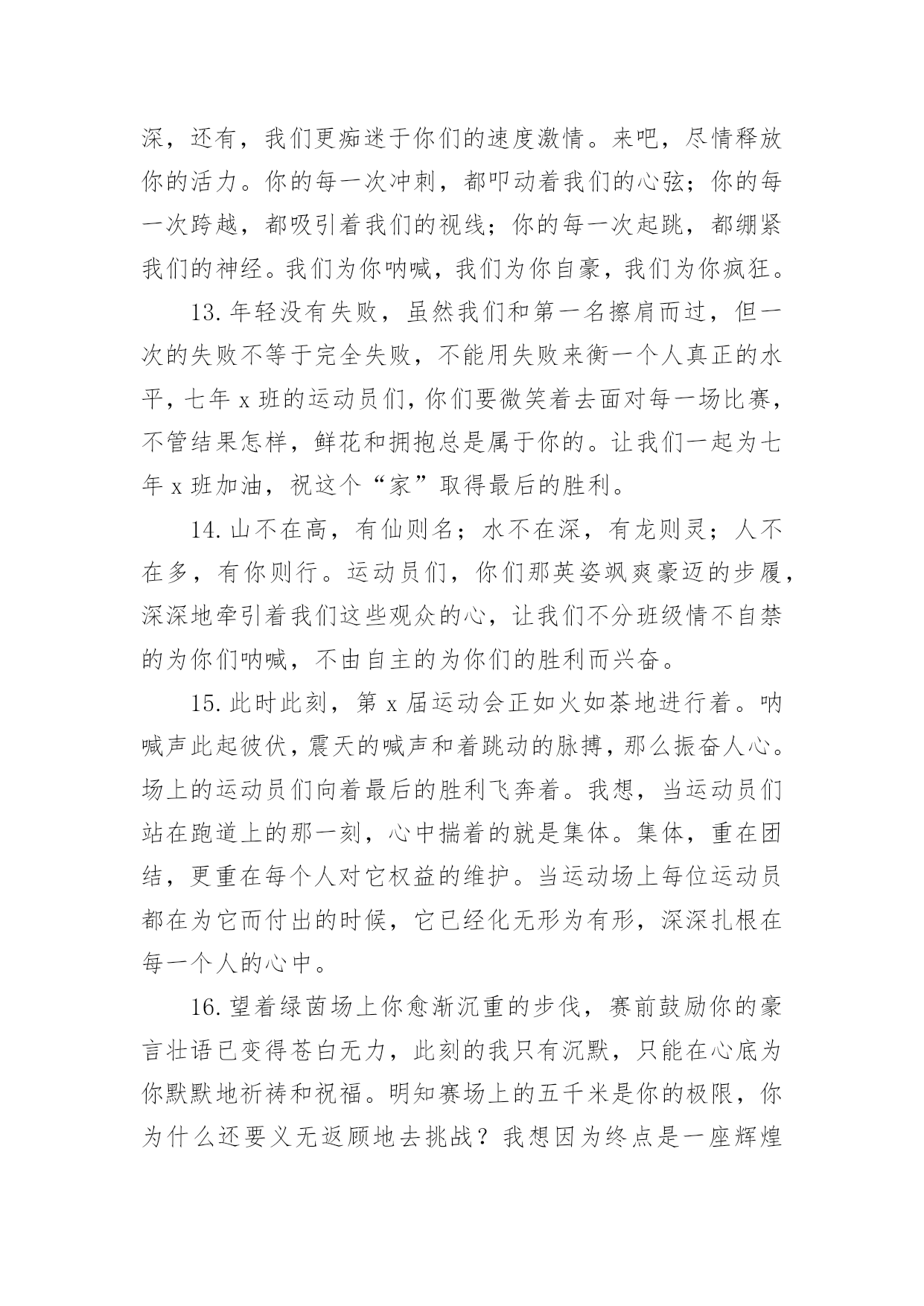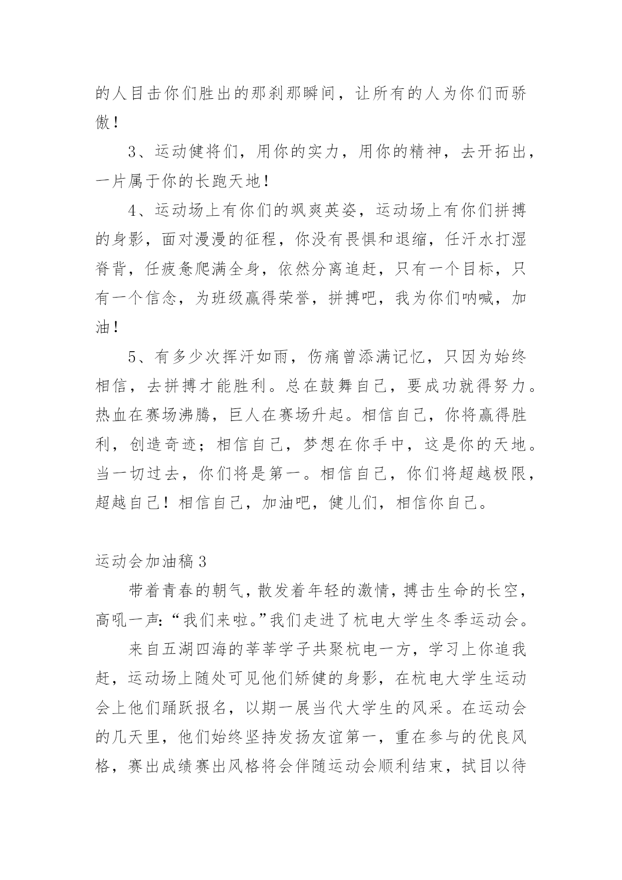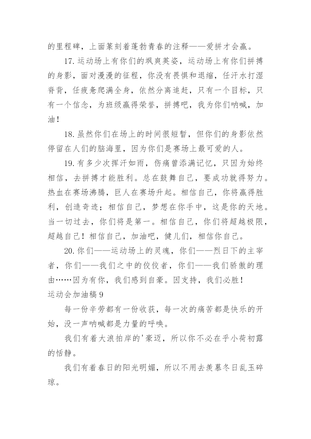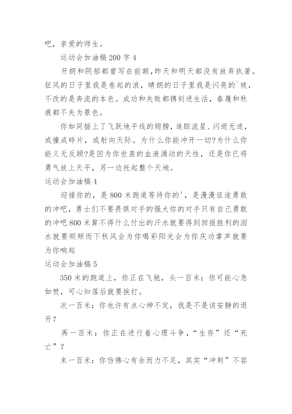 运动会加油稿运动会加油稿优选(15篇)现如今,我们越来越需要加油稿,加油稿可以给予对方克服困难的勇气和信心。你知道加油稿怎样才能写的好吗?下面是小编收集整理的运动会加油稿,希望对大家有所帮助。运动会加油稿1相信自己做的,无所谓成功与失败,只在乎那过程的'挥汗如雨,每一次都是新的起点,每一次都是努力的体验。耳边想起震天的呐喊助威声,那是对你拼搏的肯定,每一声都充满热情,每一声都充满激情。任何时刻都不会放弃,那属于自己的每一次机会,因为你相信自己的实力,相信自己做的。运动会加油稿21、年轻的我们自信飞扬,青春的气息如同出生的朝阳,蓬勃的力量如同阳光的挥洒。此时此刻,跑道便是我们精彩的`舞台,声声加油便是我们的奖项!论何成功,谈何荣辱,心中的信念只有一个:拼搏!2、在枪声响起的一刹那你如箭在弦飞刺而出,在跑道的尽头你奋力的一掷中你让铅球落在最远点是你们--让我们知道了什么是拼搏,你们是激情你们是荣耀加油吧,让所有的人目击你们胜出的那刹那瞬间,让所有的人为你们而骄傲!3、运动健将们,用你的实力,用你的精神,去开拓出,一片属于你的长跑天地!4、运动场上有你们的飒爽英姿,运动场上有你们拼搏的身影,面对漫漫的征程,你没有畏惧和退缩,任汗水打湿脊背,任疲惫爬满全身,依然分离追赶,只有一个目标,只有一个信念,为班级赢得荣誉,拼搏吧,我为你们呐喊,加油!5、有多少次挥汗如雨,伤痛曾添满记忆,只因为始终相信,去拼搏才能胜利。总在鼓舞自己,要成功就得努力。热血在赛场沸腾,巨人在赛场升起。相信自己,你将赢得胜利,创造奇迹;相信自己,梦想在你手中,这是你的天地。当一切过去,你们将是第一。相信自己,你们将超越极限,超越自己!相信自己,加油吧,健儿们,相信你自己。运动会加油稿3带着青春的朝气,散发着年轻的激情,搏击生命的长空,高吼一声:“我们来啦。”我们走进了杭电大学生冬季运动会。来自五湖四海的莘莘学子共聚杭电一方,学习上你追我赶,运动场上随处可见他们矫健的身影,在杭电大学生运动会上他们踊跃报名,以期一展当代大学生的风采。在运动会的几天里,他们始终坚持发扬友谊第一,重在参与的优良风格,赛出成绩赛出风格将会伴随运动会顺利结束,拭目以待吧,亲爱的师生。运动会加油稿200字4开朗和阴郁都曾写在前额,昨天和明天都没有放弃执著。狂风的日子里我是卷起的浪,晴朗的日子里我是闪亮的`玻,不改的是奔流的本色。成功和失败都镌刻进生活,春履和秋痕都不失为景色。你如同插上了飞跃地平线的翅膀,追踪流星、闪逝无迹,或撞成碎片,或射向天际。为什么你能冲开一切?为什么你能义无反顾?是因为你世袭的血液涌动的天性,还是你已将勇气放上天平,另一边托起整个天地。运动会加油稿4迎接你的,是800米跑道等待你的',是漫漫征途勇敢的冲吧,勇士们不要畏惧对手的强大你的对手只有自己勇敢的冲吧800米算不得什么付出的汗水就要得到回报胜利的泪水就要顺颊而下秋风会为你喝彩阳光会为你庆功掌声就要为你响起运动会加油稿5350米的跑道上,你正在飞驰,头一百米:你可能心急如焚,可心知落后就要挨打。次一百米:你也许有点心神不定,我是不是该安静的退开?再一百米:你正在进行着心理斗争,“生存”还“死亡”?末一百米:你仿佛心有余而力不足,其实“冲刺”不容易。但面对如此遥远的路途,如此激烈的'竞争,你也许腿脚发麻,你也许有些茫然。但你可知道,在你身后,有同学们一双双期待的眼睛;在你身后,是你日日辛勤苦练流下的汗水。鼓起勇气,奋勇向前吧!为了集体的荣誉,为了祖国的明天!运动会加油稿61、有多少次挥汗如雨,伤痛曾添满记忆,只因为始终相信,去拼搏才能胜利。总在鼓舞自己,要成功就得努力。热血在赛场沸腾,巨人在赛场升起。相信自己,你将赢得胜利,创造奇迹;相信自己,梦想在你手中,这是你的天地。当一切过去,你们将是第一。相信自己,你们将超越极限,超越自己!相信自己,加油吧,健儿们,相信你自己。2、让你们的身影在运动场上留下优美的风景线,让你们的雄心壮志在运动场上发挥的淋漓尽致。3、一根小小的`木棒,连接的是团结和友爱;一根小小的木棒,传递的是勇气和力量;一根小小的木棒,演绎的是奋斗和拼搏;加油吧!让这激动人心的时刻,一直回荡在我们心中!4、深深的呼吸,等待你的是艰难的1500米。相信胜利会属于你们。但在这征途上,需要你勇敢的心去面对。我们在为你加油,你是否听到了我们发自心中的呐喊?困难和胜利都在向你招手,去呀,快去呀,不要犹豫。快去击败困难、快去夺取胜利!相信你会送给我们一个汗水浸湿的微笑!5、生活中,我们每天都在尝试;我们走向成功,品味失败,走过心灵的阴雨晴空。运动员们,不要放弃尝试,无论失败与否,重要的是你勇于参与的精神,付出的背后是胜利;无论是否成功,我们永远赞美你,你们永远是我们的骄傲。运动会加油稿7在那一瞬间,你们像离了弦的箭似流