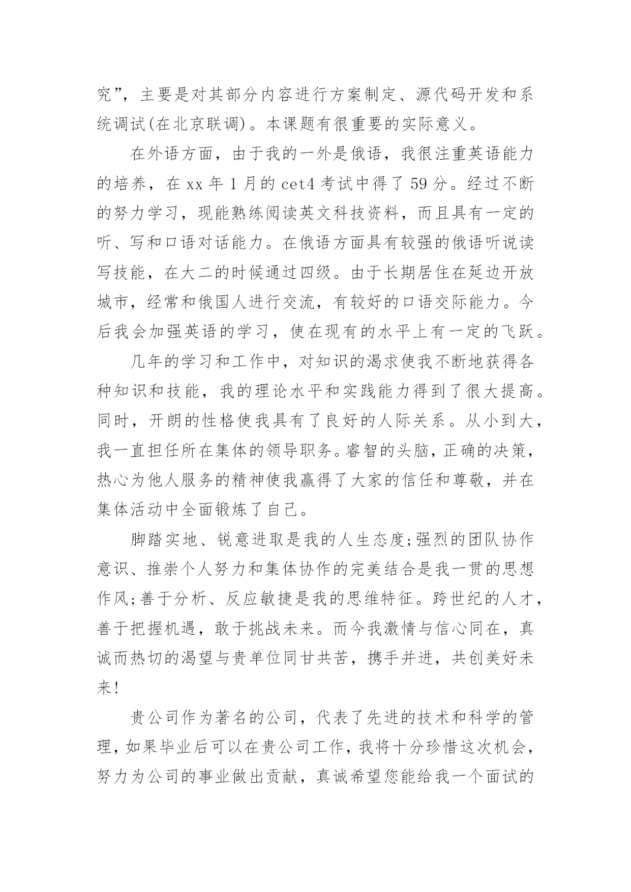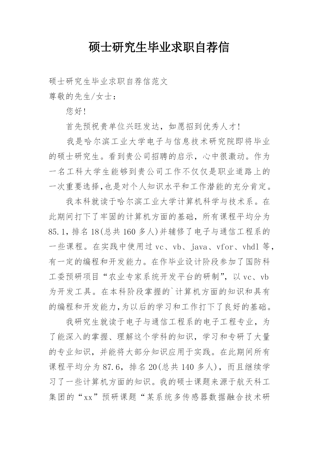 硕士研究生毕业求职自荐信硕士研究生毕业求职自荐信范文尊敬的先生/女士:您好!首先预祝贵单位兴旺发达,如愿招到优秀人才!我是哈尔滨工业大学电子与信息技术研究院即将毕业的硕士研究生。看到贵公司招聘的启示,心中很激动。作为一名工科大学生能够到贵公司工作不仅仅是职业道路上的一次重要选择,也是对个人知识水平和工作潜能的充分肯定。我本科就读于哈尔滨工业大学计算机科学与技术系。在此期间打下了牢固的计算机方面的基础,所有课程平均分为85.1,排名18(总共160多人)并辅修了电子与通信工程系的一些课程。在实践中使用过vc、vb、java、vfor、vhdl等,有一定的编程和开发能力。在作毕业设计阶段参加了国防科工委预研项目“农业专家系统开发平台的研制”,以vc、vb为开发工具。在本科阶段掌握的`计算机方面的知识和具有的编程和开发能力,为以后的学习和工作打下了良好的基础。我研究生就读于电子与通信工程系的电子工程专业,为了能深入的掌握、理解这个学科的知识,学习和专研了大量的专业知识,并能将大部分知识应用于实践。在此期间所有课程平均分为87.6,排名20(总共140多人),而且继续学习了一些计算机方面的知识。我的硕士课题来源于航天科工集团的“xx”预研课题“某系统多传感器数据融合技术研究”,主要是对其部分内容进行方案制定、源代码开发和系统调试(在北京联调)。本课题有很重要的实际意义。在外语方面,由于我的一外是俄语,我很注重英语能力的培养,在xx年1月的cet4考试中得了59分。经过不断的努力学习,现能熟练阅读英文科技资料,而且具有一定的听、写和口语对话能力。在俄语方面具有较强的俄语听说读写技能,在大二的时候通过四级。由于长期居住在延边开放城市,经常和俄国人进行交流,有较好的口语交际能力。今后我会加强英语的学习,使在现有的水平上有一定的飞跃。几年的学习和工作中,对知识的渴求使我不断地获得各种知识和技能,我的理论水平和实践能力得到了很大提高。同时,开朗的性格使我具有了良好的人际关系。从小到大,我一直担任所在集体的领导职务。睿智的头脑,正确的决策,热心为他人服务的精神使我赢得了大家的信任和尊敬,并在集体活动中全面锻炼了自己。脚踏实地、锐意进取是我的人生态度;强烈的团队协作意识、推崇个人努力和集体协作的完美结合是我一贯的思想作风;善于分析、反应敏捷是我的思维特征。跨世纪的人才,善于把握机遇,敢于挑战未来。而今我激情与信心同在,真诚而热切的渴望与贵单位同甘共苦,携手并进,共创美好未来!贵公司作为著名的公司,代表了先进的技术和科学的管理,如果毕业后可以在贵公司工作,我将十分珍惜这次机会,努力为公司的事业做出贡献,真诚希望您能给我一个面试的机会。此致敬礼